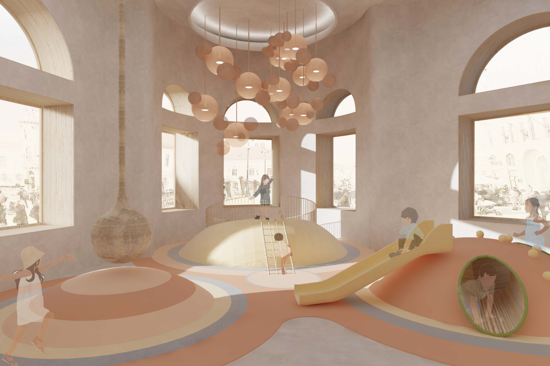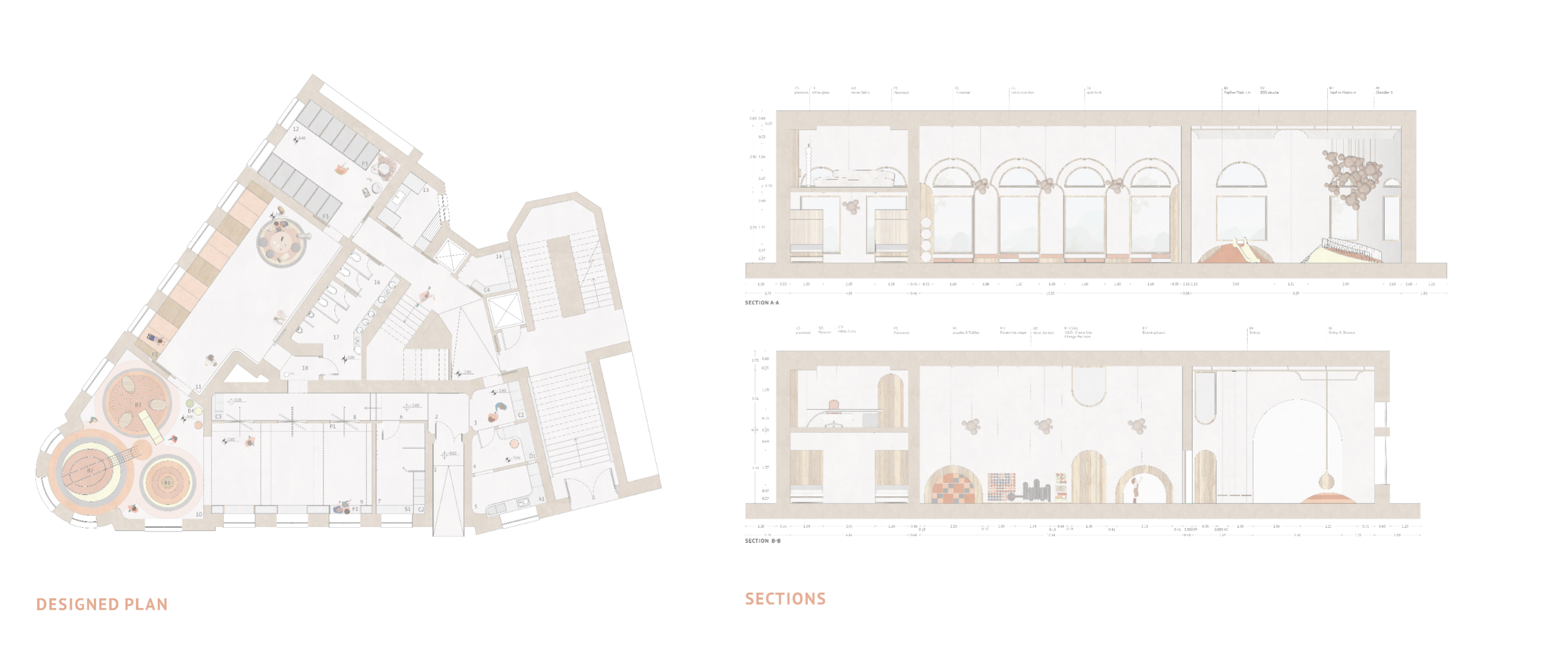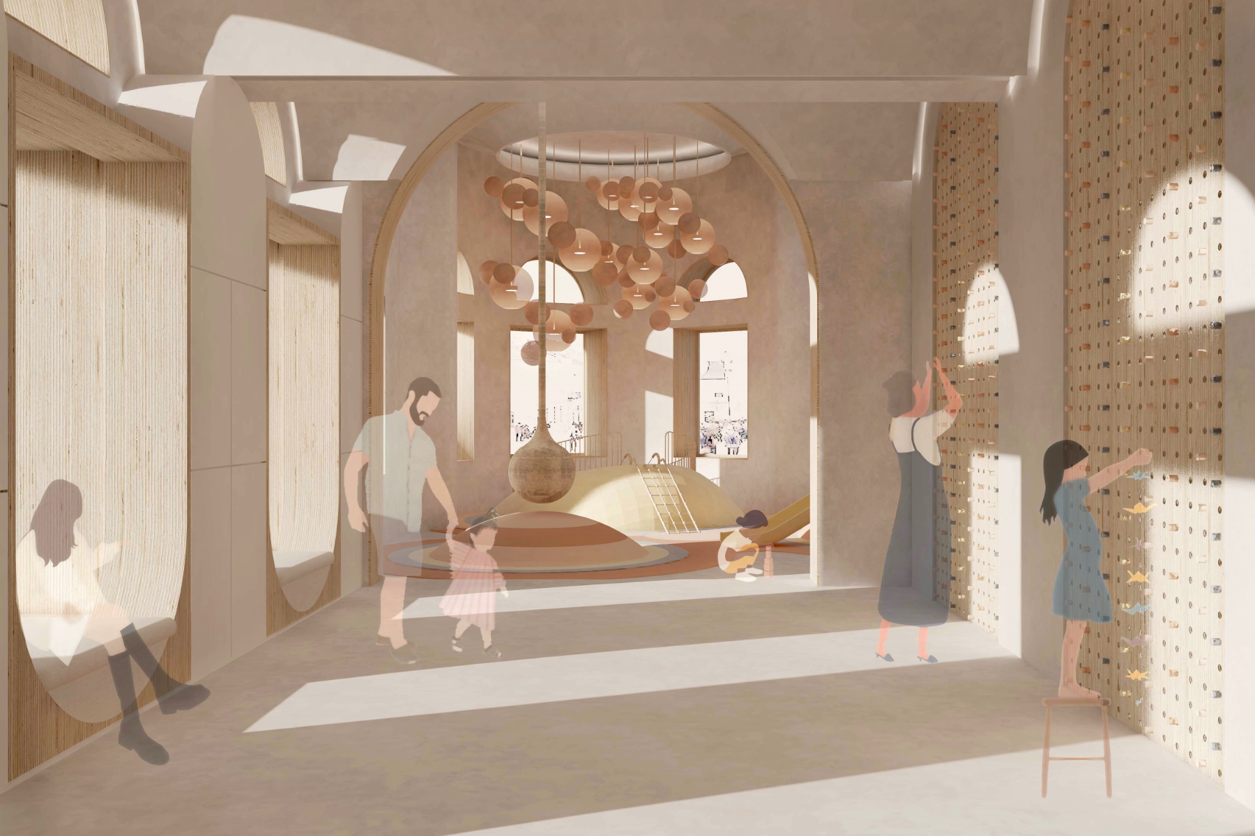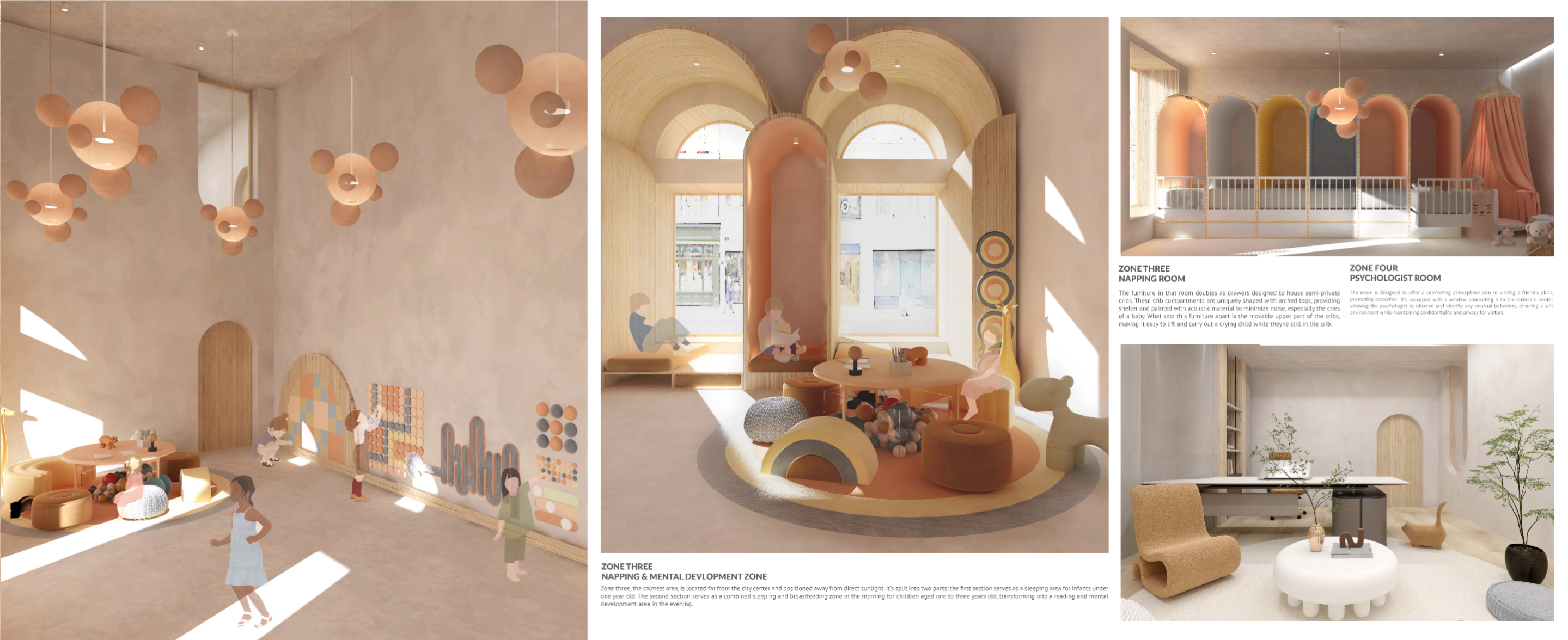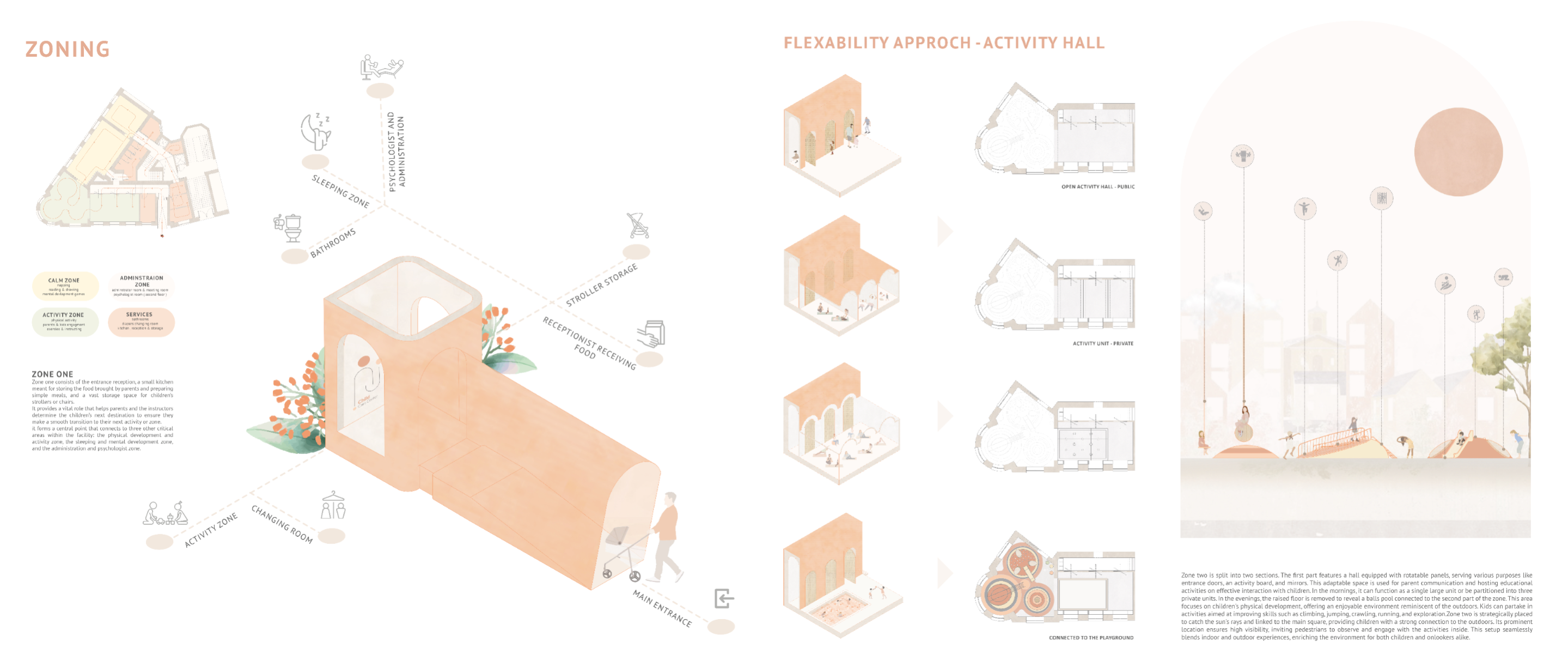 In an era marked by the relentless pace of modern life, parents often find themselves navigating a delicate balance between professional and family responsibilities. As work and daily demands intensify, the need for reliable childcare solutions has become increasingly paramount. Childcare centers have emerged as indispensable pillars of support, offering a haven where children can thrive under attentive care while parents attend to their diverse commitments. This project is designed to strengthen the parent-child bond, assist working parents, support postpartum and new parents, and promote the mental, physical, and emotional development of children, alongside their social interactions. To meet the diverse needs of families in the community, the childcare center operates on a dual-shift system. The morning shift serves children aged three months to 3 years, providing a nurturing environment akin to babysitting, while also offering classes for parents to enhance their communication skills and self-care. This approach empowers parents, strengthens family bonds, and supports daily life. In the evening shift, the focus shifts to delivering enriching experiences for children across various age groups. Through play-based learning, creative exploration, and social, emotional, and physical development, the center ensures that every child’s growth is nurtured. The project emphasizes flexibility and modularity, allowing for smooth transitions between shifts and adaptable programming to cater to the dynamic needs of families. The center is thoughtfully segmented into four distinct zones: Calm Zone: A tranquil space for naps, later transitioning into a cognitive activity area. Activity Zone: An energetic space for creative activities, parental engagement, and a ball pool connected to the playground. Service Zone: Houses essential facilities like bathrooms, a kitchen, reception, and storage. Administration Zone: Located on the second floor, it includes administrative offices, a meeting room, and a psychologist's office. This well-organized layout ensures that each area of the childcare center is purposefully designed to meet the needs of children, staff, and parents, fostering a balanced and nurturing environment. By seamlessly integrating care, education, and recreation, the center creates a supportive space that nurtures children's growth while empowering parents with the skills and resources necessary for their children’s holistic development.