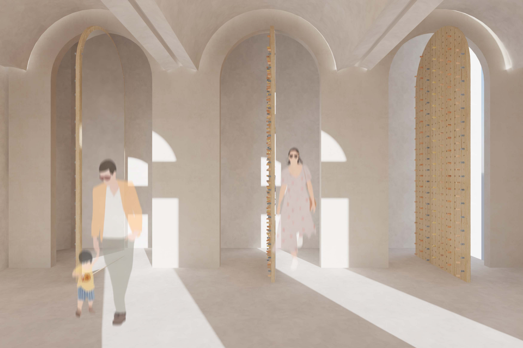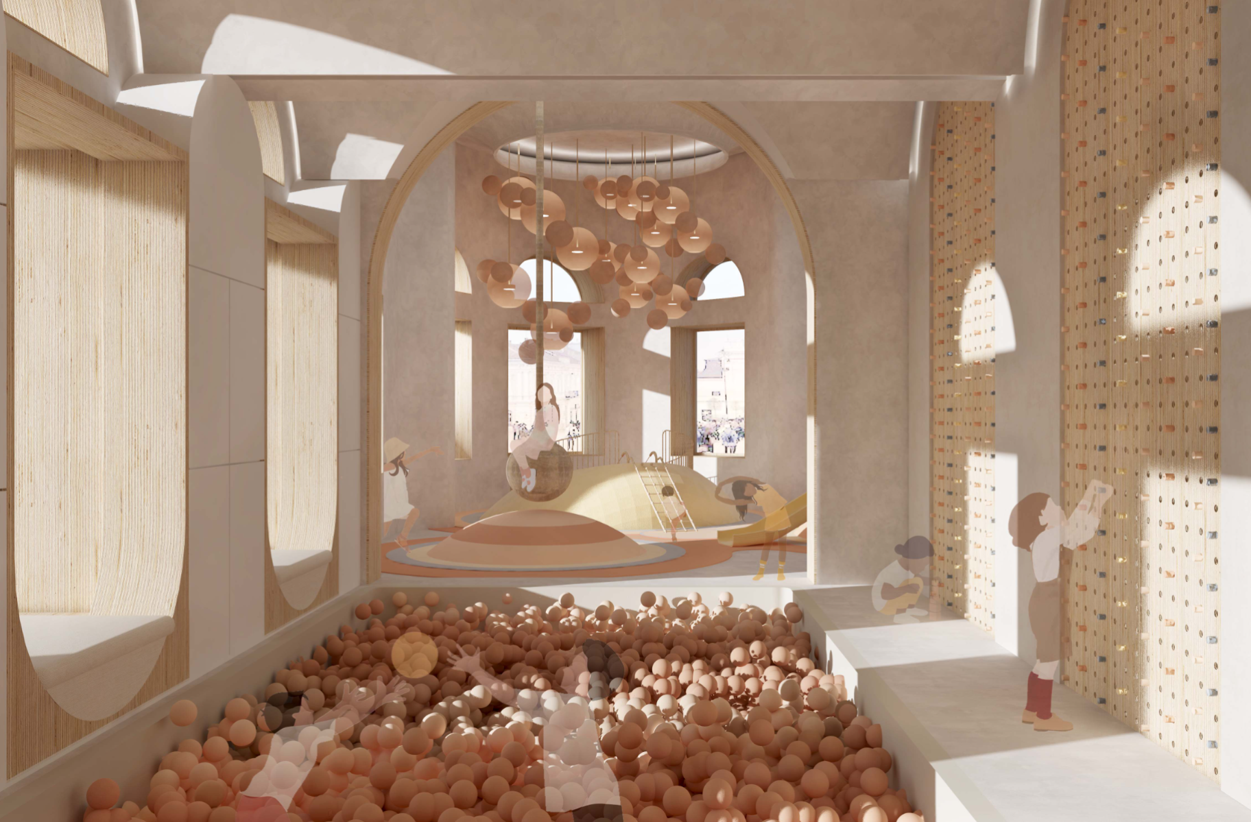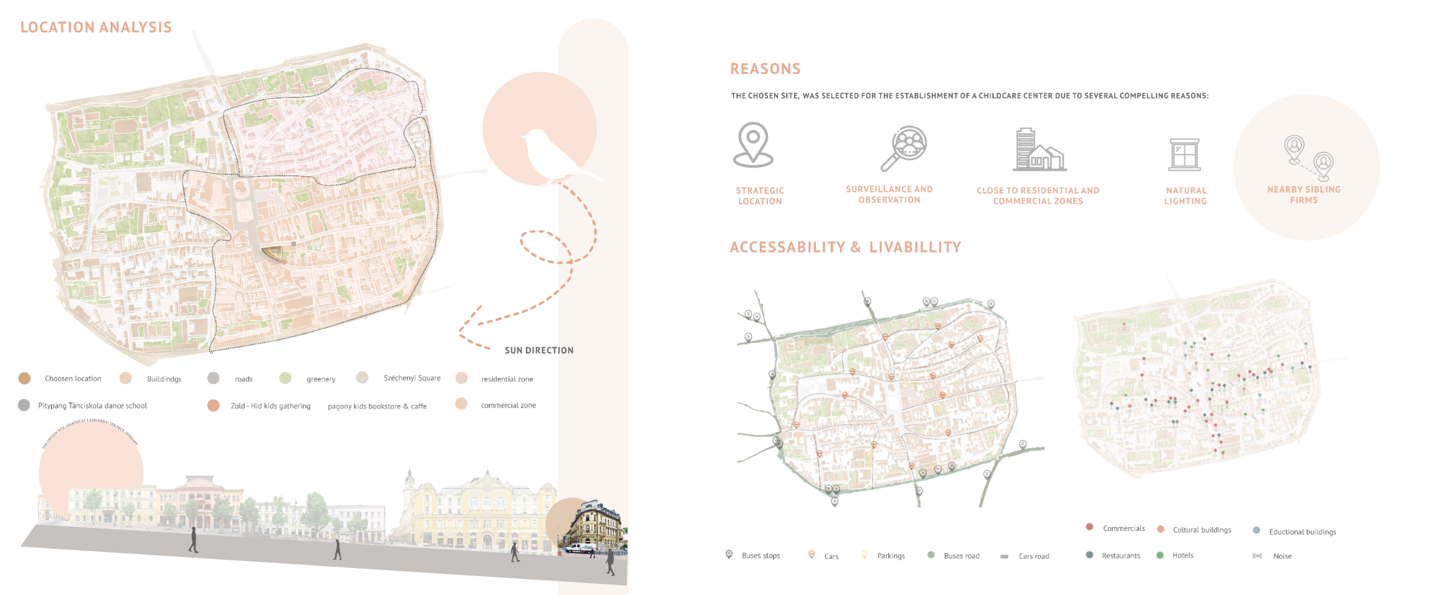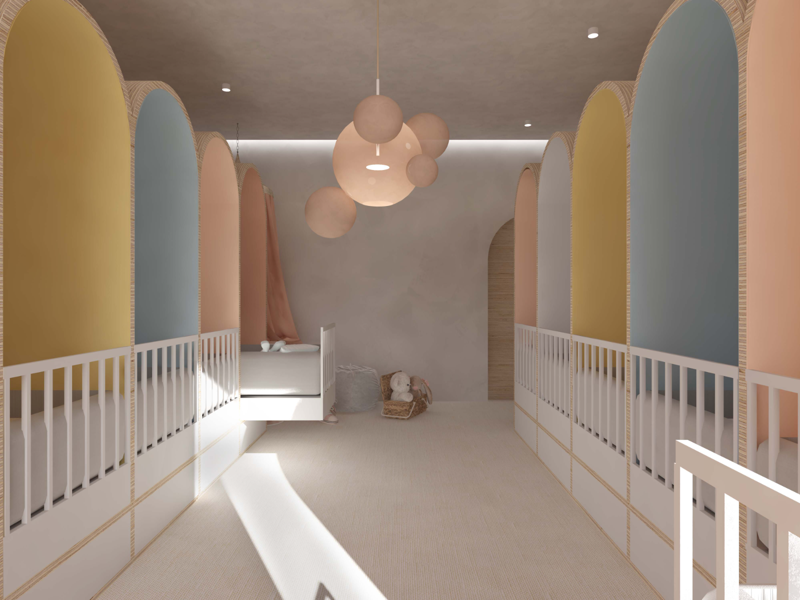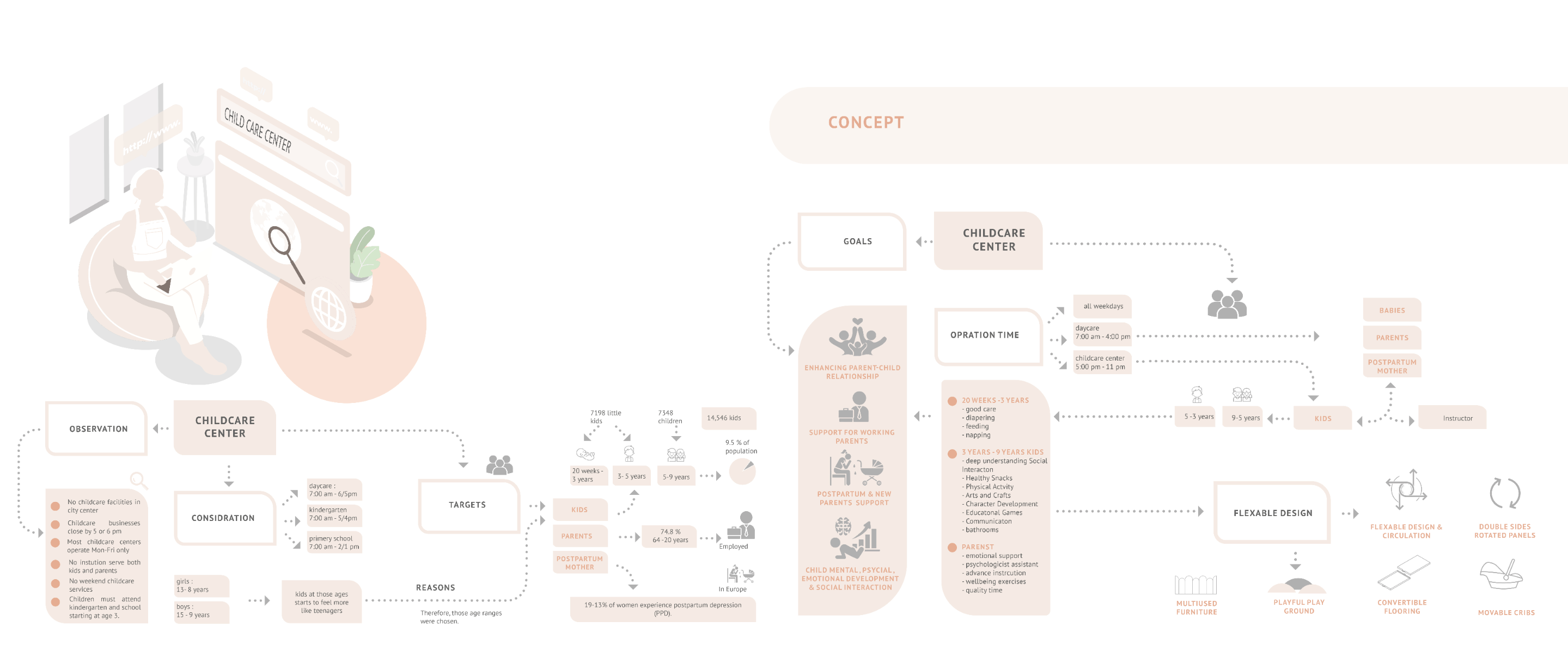 In an era marked by the relentless pace of modern life, parents often find themselves navigating a delicate balance between professional and family responsibilities. As work and daily demands intensify, the need for reliable childcare solutions has become increasingly paramount. Childcare centers have emerged as indispensable pillars of support, offering a haven where children can thrive under attentive care while parents attend to their diverse commitments. This project is designed to strengthen the parent-child bond, assist working parents, support postpartum and new parents, and promote the mental, physical, and emotional development of children, alongside their social interactions. To meet the diverse needs of families in the community, the childcare center operates on a dual-shift system. The morning shift serves children aged three months to 3 years, providing a nurturing environment akin to babysitting, while also offering classes for parents to enhance their communication skills and self-care. This approach empowers parents, strengthens family bonds, and supports daily life. In the evening shift, the focus shifts to delivering enriching experiences for children across various age groups. Through play-based learning, creative exploration, and social, emotional, and physical development, the center ensures that every child’s growth is nurtured. The project emphasizes flexibility and modularity, allowing for smooth transitions between shifts and adaptable programming to cater to the dynamic needs of families. The center is thoughtfully segmented into four distinct zones: Calm Zone: A tranquil space for naps, later transitioning into a cognitive activity area. Activity Zone: An energetic space for creative activities, parental engagement, and a ball pool connected to the playground. Service Zone: Houses essential facilities like bathrooms, a kitchen, reception, and storage. Administration Zone: Located on the second floor, it includes administrative offices, a meeting room, and a psychologist's office. This well-organized layout ensures that each area of the childcare center is purposefully designed to meet the needs of children, staff, and parents, fostering a balanced and nurturing environment. By seamlessly integrating care, education, and recreation, the center creates a supportive space that nurtures children's growth while empowering parents with the skills and resources necessary for their children’s holistic development.