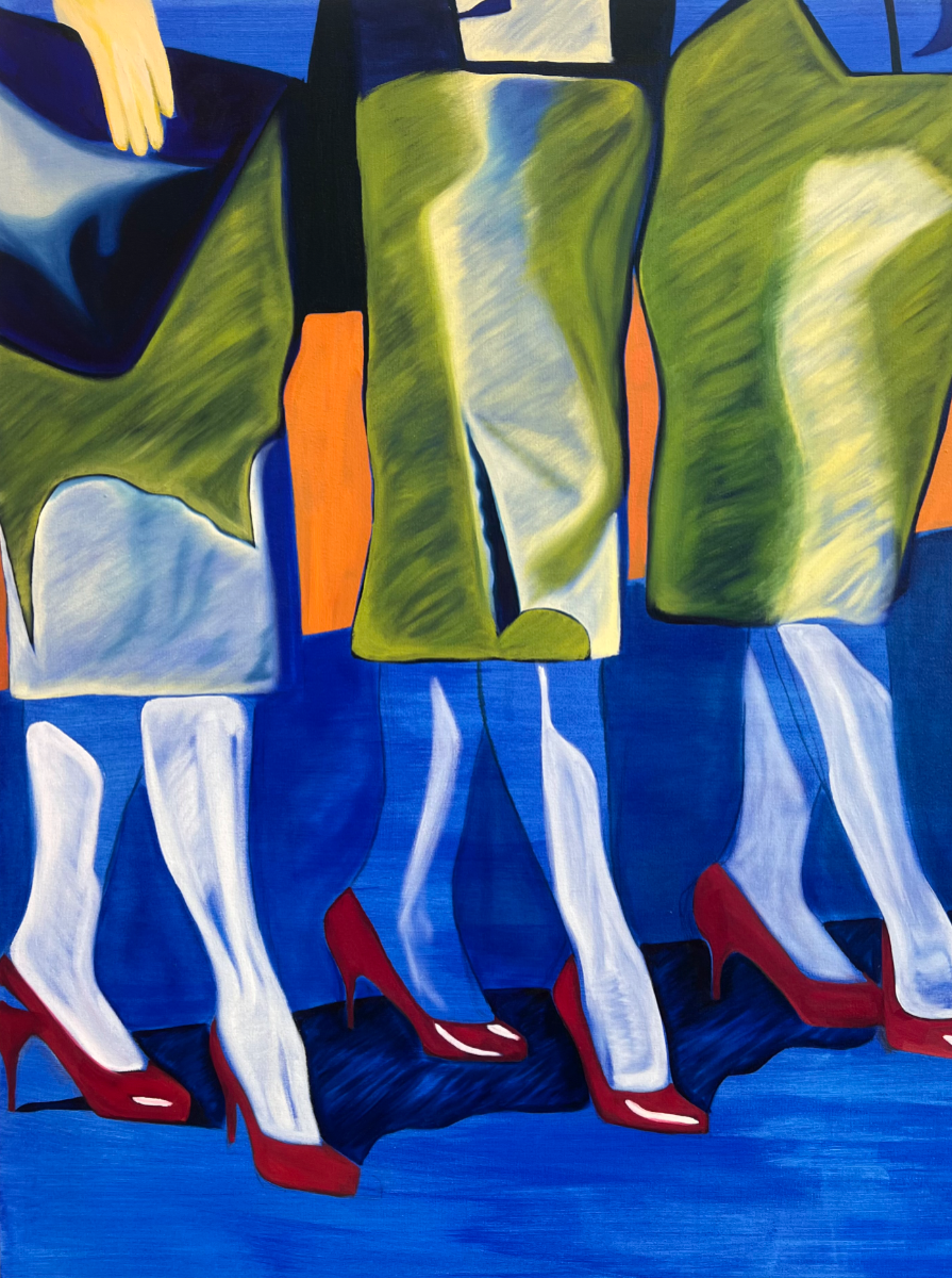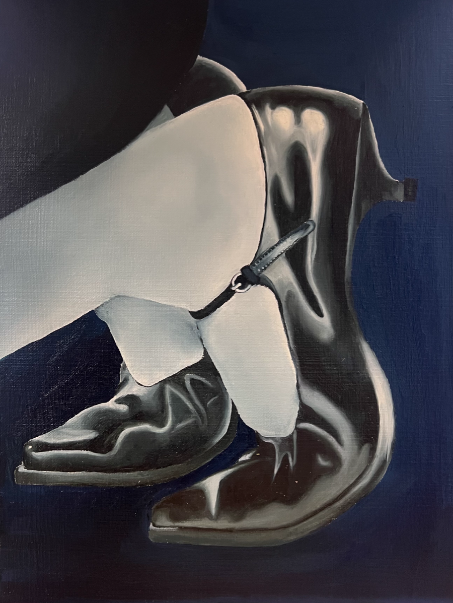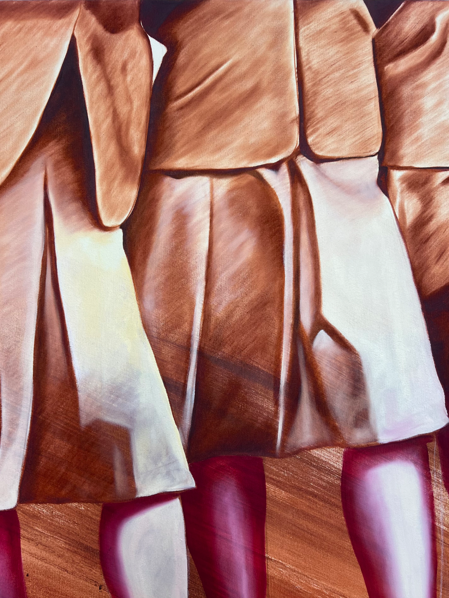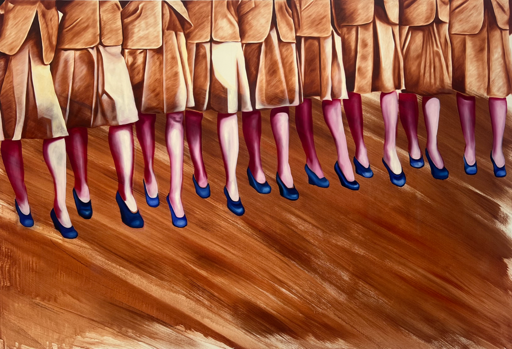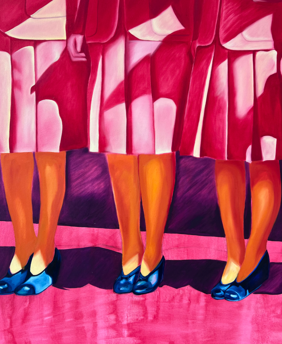 Throughout my time at university, creation has been a constant tool for processing thoughts, understanding emotions, and reflecting on personal experiences. Each project begins with a question: What do I want to make? Over time, this shifts to deeper inquiries such as Why am I making this? What draws me to this subject? How can I shape it into a more focused expression of my interest? I feel a strong connection to the work of Marlene Dumas, Luc Tuymans, and Gerhard Richter. Their paintings carry a quiet curiosity. Each piece invites the viewer to consider the subject and the reasons behind its selection. This sense of questioning is something I try to bring into my own work. In my images, bold compositions and vivid colours draw attention to specific elements found within existing photographs. These choices help isolate moments that feel important, offering a clearer view of what has captured my interest. These slides present a reverse chronological journey through the work I created over the academic year, including completed paintings, works-in-progress, and studies. Together, they reflect how my method of enquiry shaped the development and understanding of my final graduate show, In Line. An articulation of my conceptual thinking can be found in my artist bio.