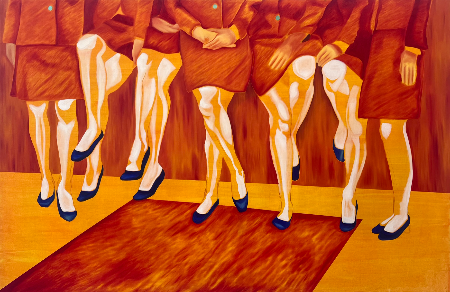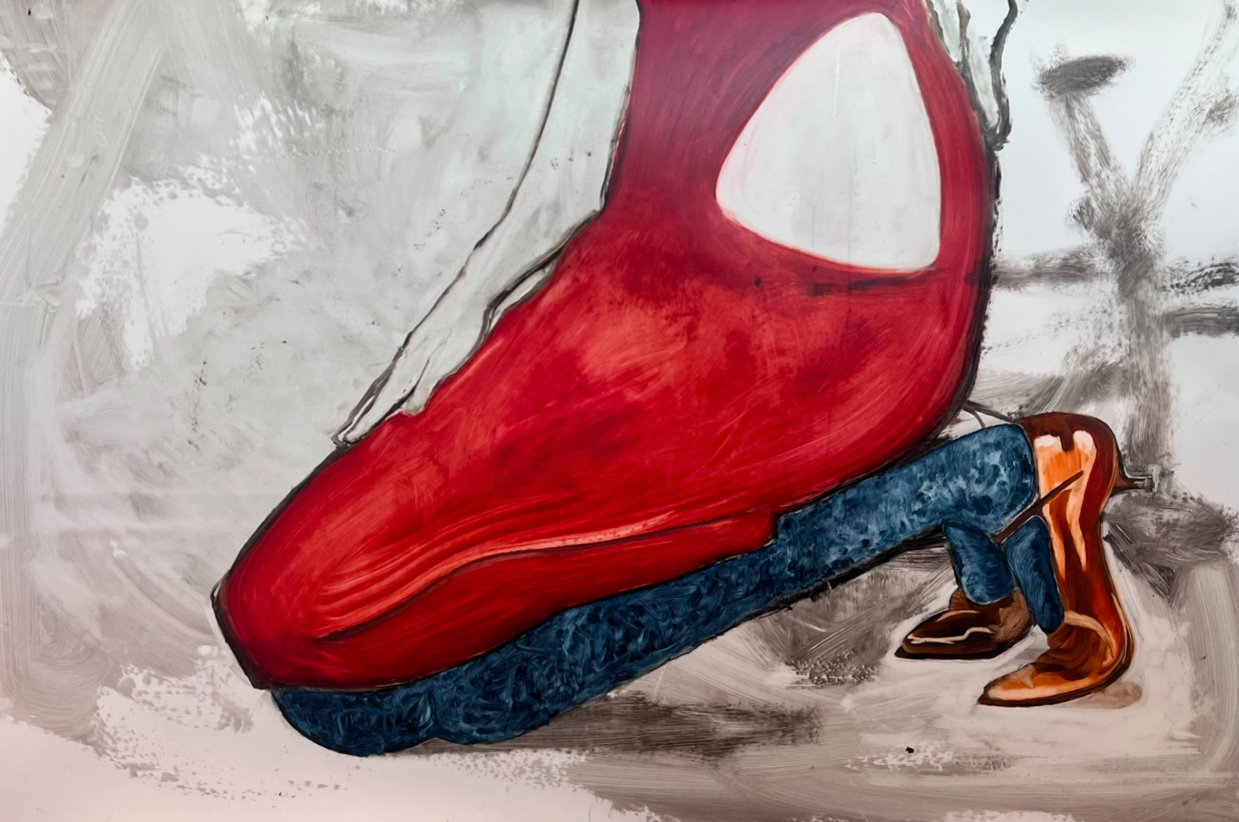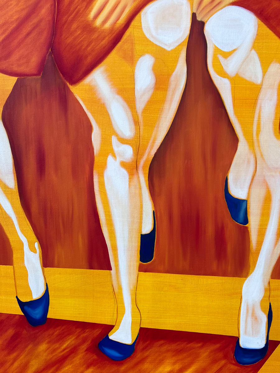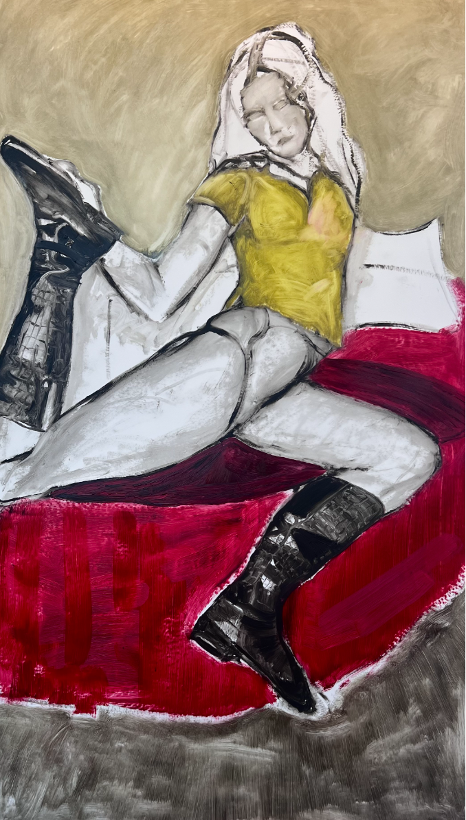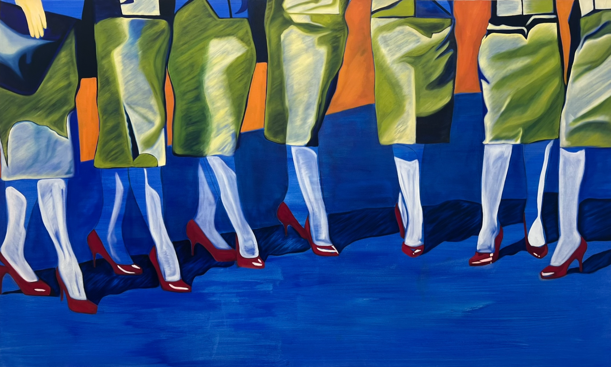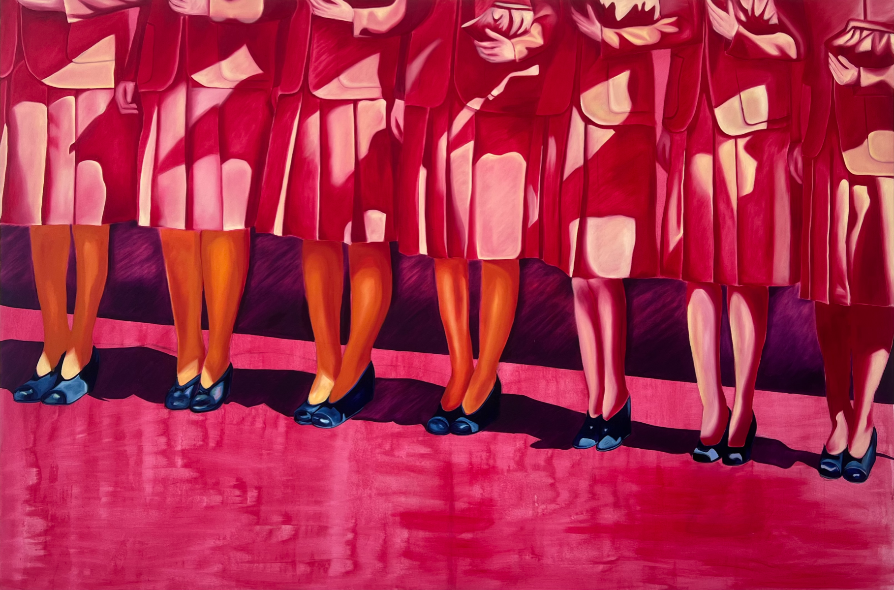 Throughout my time at university, creation has been a constant tool for processing thoughts, understanding emotions, and reflecting on personal experiences. Each project begins with a question: What do I want to make? Over time, this shifts to deeper inquiries such as Why am I making this? What draws me to this subject? How can I shape it into a more focused expression of my interest? I feel a strong connection to the work of Marlene Dumas, Luc Tuymans, and Gerhard Richter. Their paintings carry a quiet curiosity. Each piece invites the viewer to consider the subject and the reasons behind its selection. This sense of questioning is something I try to bring into my own work. In my images, bold compositions and vivid colours draw attention to specific elements found within existing photographs. These choices help isolate moments that feel important, offering a clearer view of what has captured my interest. These slides present a reverse chronological journey through the work I created over the academic year, including completed paintings, works-in-progress, and studies. Together, they reflect how my method of enquiry shaped the development and understanding of my final graduate show, In Line. An articulation of my conceptual thinking can be found in my artist bio.