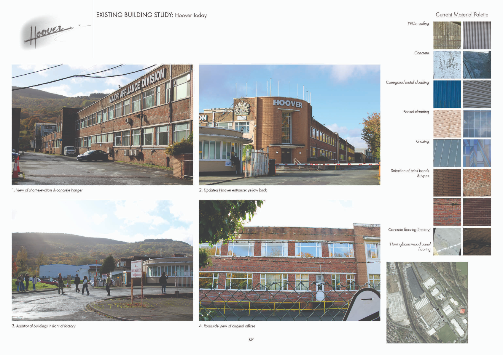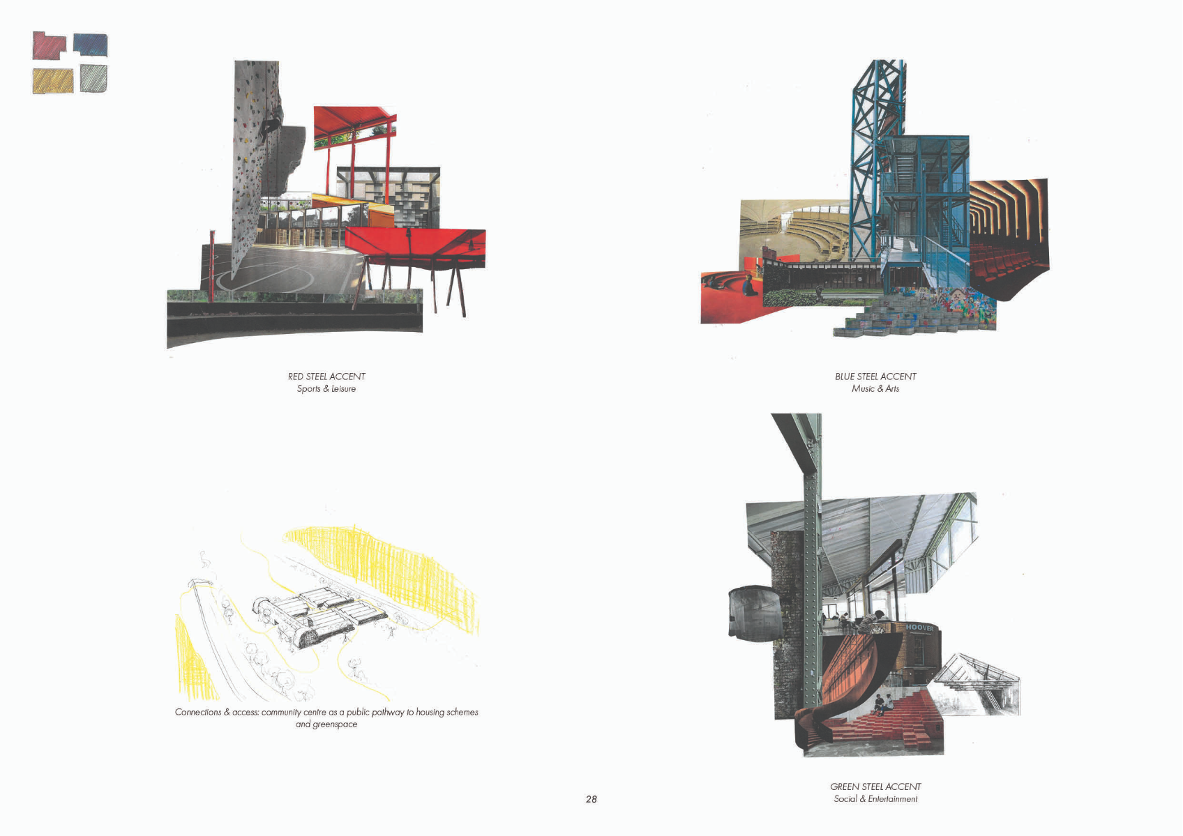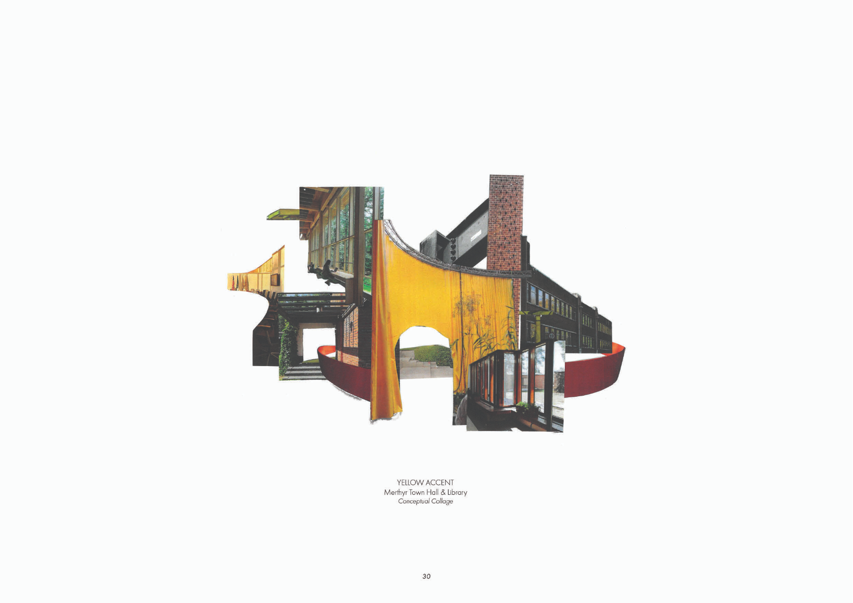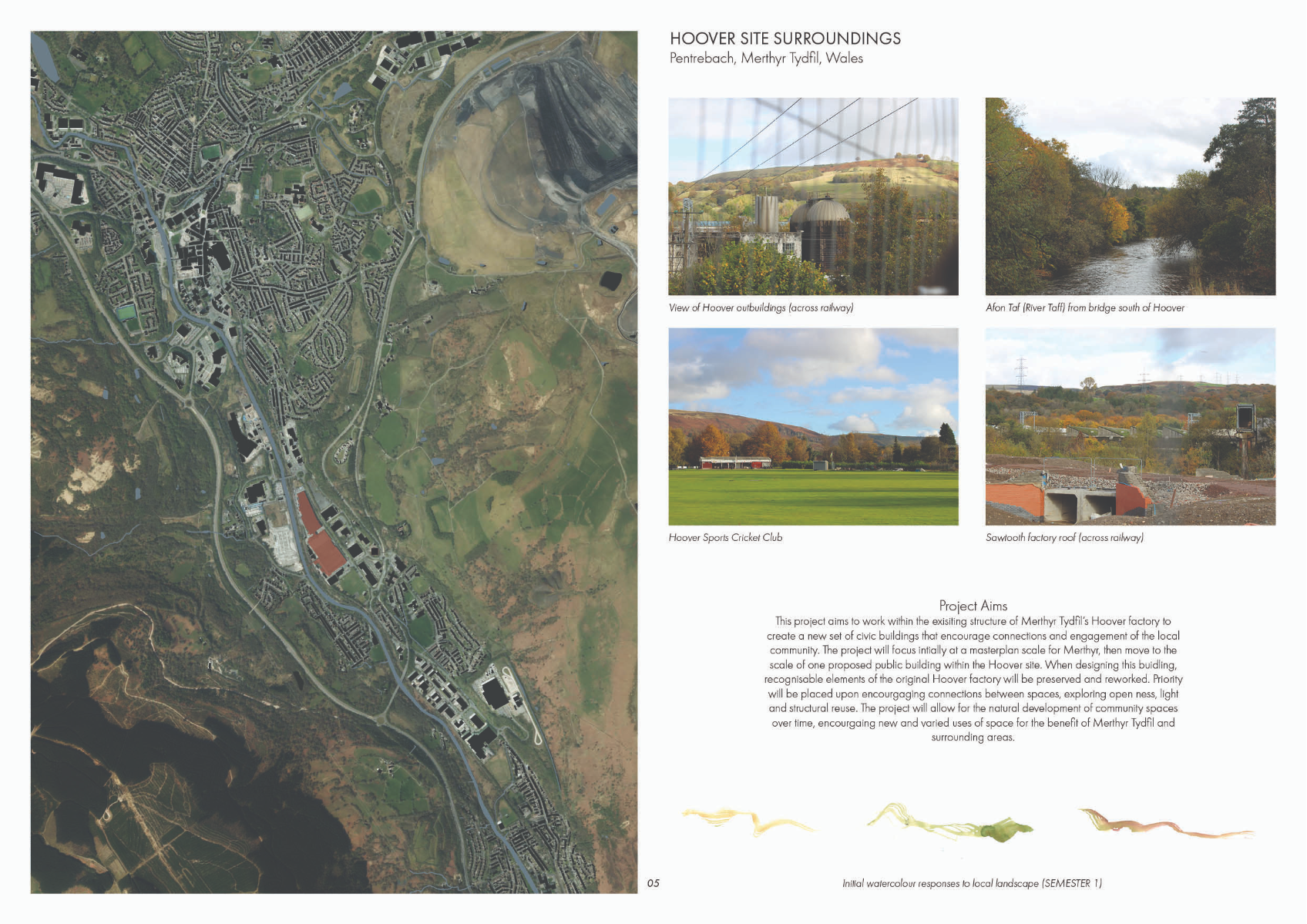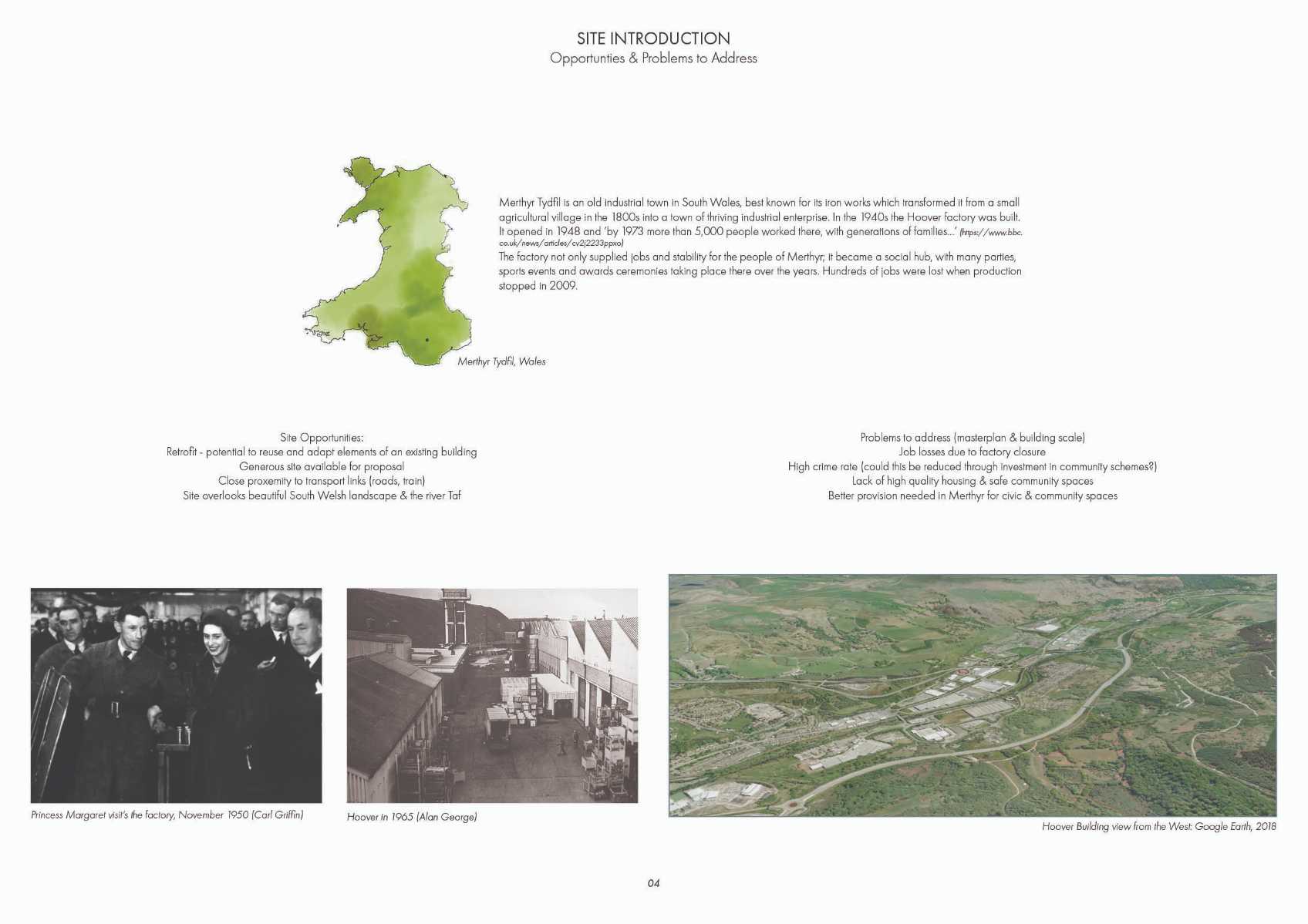 This retrofit proposal for a set of civic buildings brings light, spatial connections and openness into the existing Hoover factory to preserve memories of place and simultaneously create new ones. The quality of space is intended to unfold and rework itself, shaped by communal use over time. Much of Hoover’s steel structure is retained and celebrated, while other elements of the original building are dismantled and playfully reused throughout the scheme. At masterplan scale, the proposed buildings act as a passageway between housing sites, providing access to an extensive programme of community spaces. The detailed focus of this project is on one of the four buildings: Merthyr Town Hall and Library.
