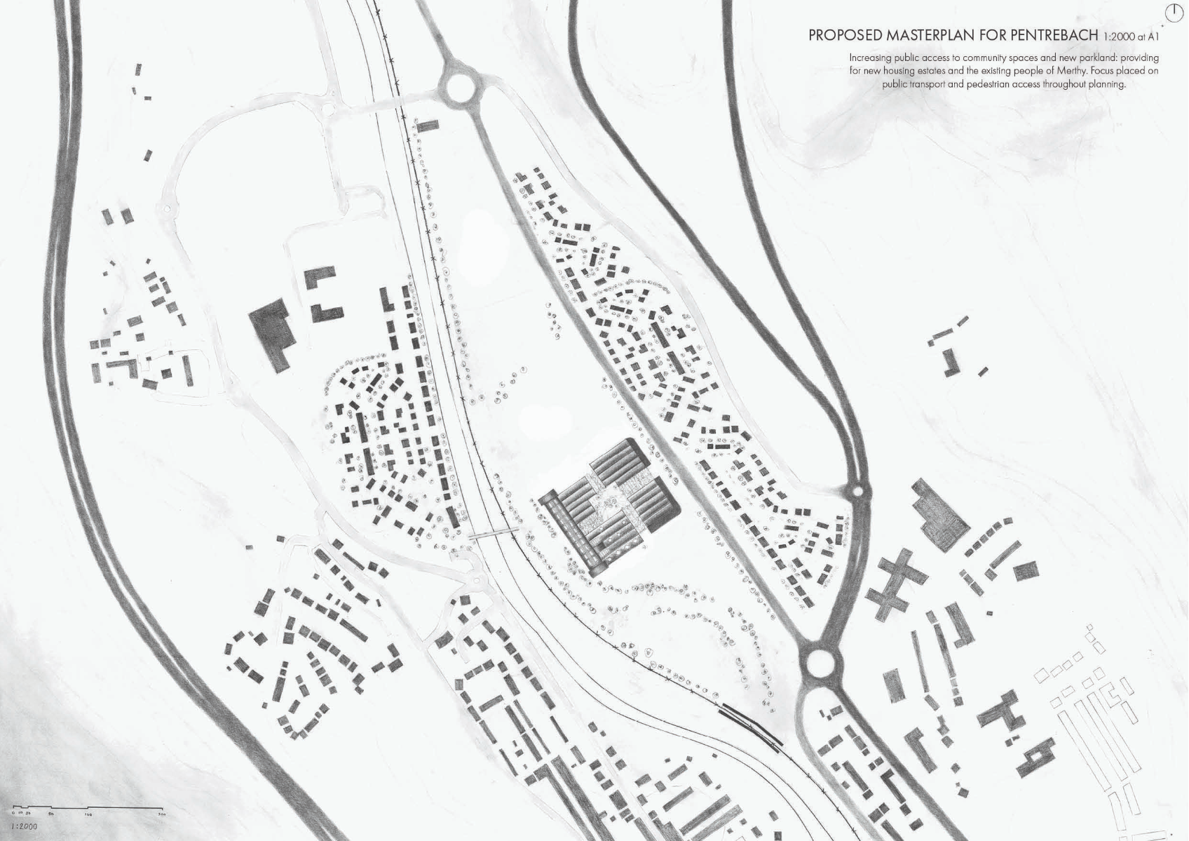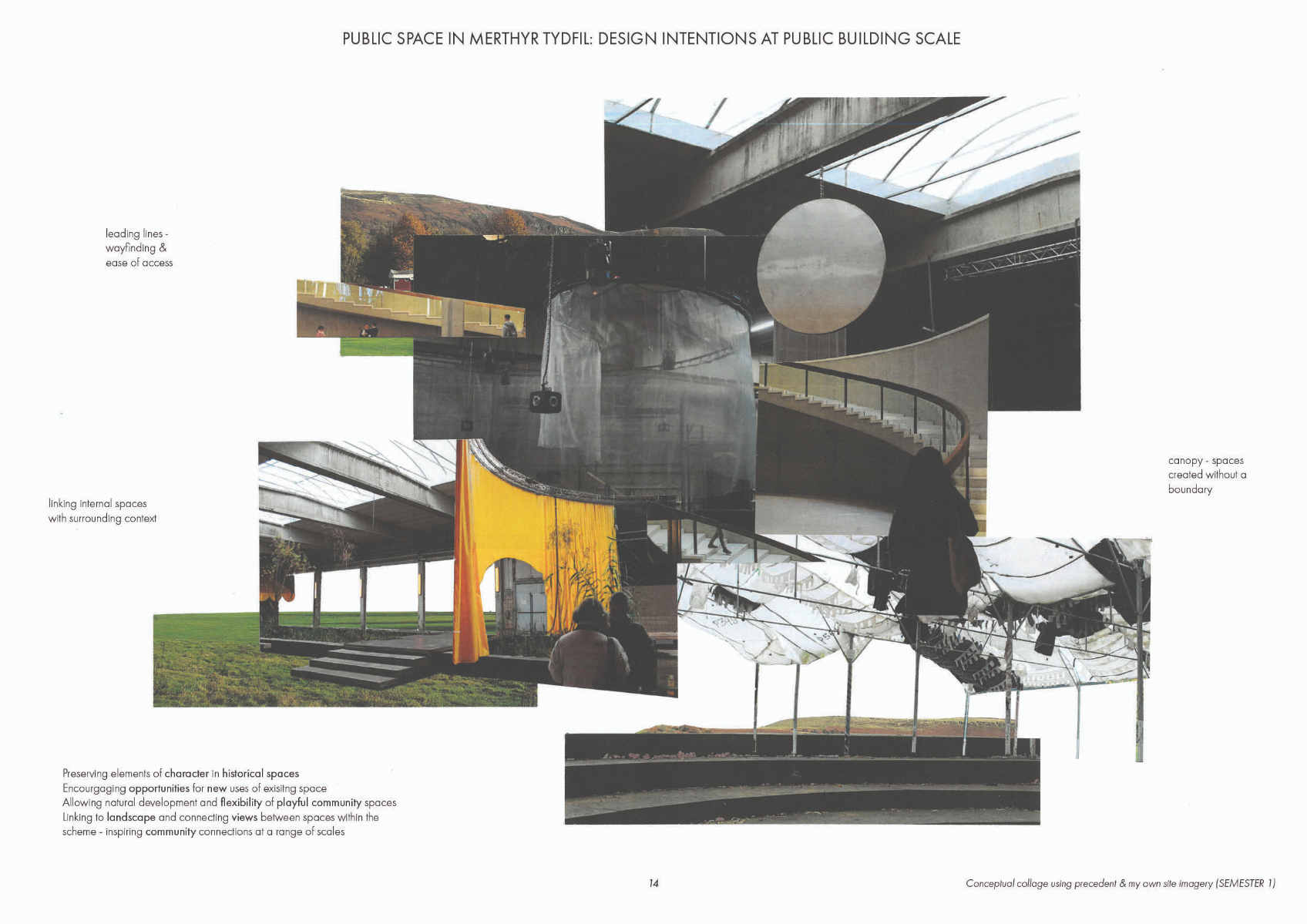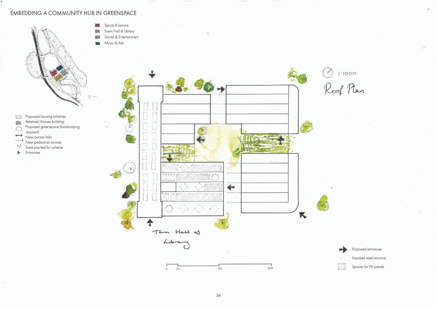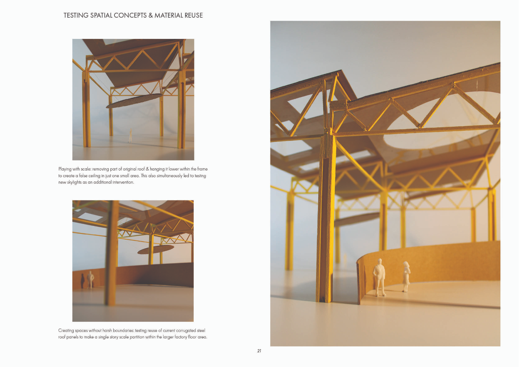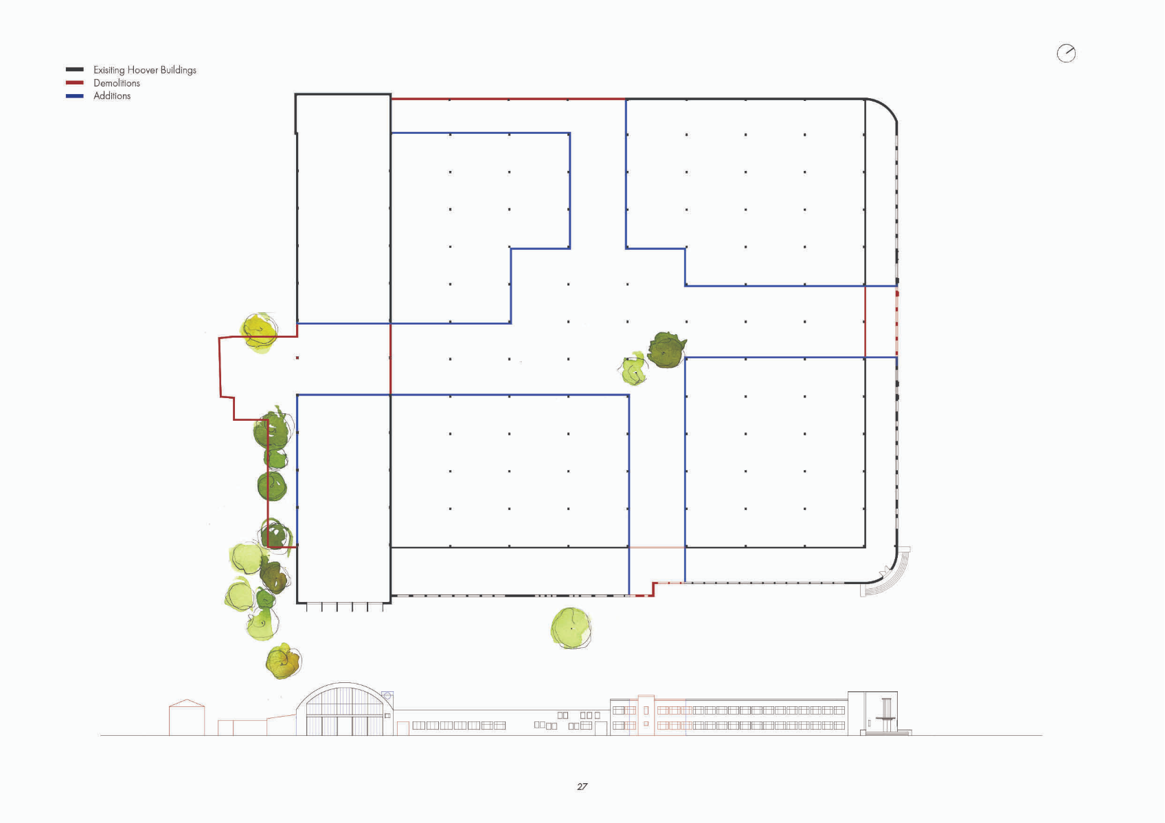 This retrofit proposal for a set of civic buildings brings light, spatial connections and openness into the existing Hoover factory to preserve memories of place and simultaneously create new ones. The quality of space is intended to unfold and rework itself, shaped by communal use over time. Much of Hoover’s steel structure is retained and celebrated, while other elements of the original building are dismantled and playfully reused throughout the scheme. At masterplan scale, the proposed buildings act as a passageway between housing sites, providing access to an extensive programme of community spaces. The detailed focus of this project is on one of the four buildings: Merthyr Town Hall and Library.