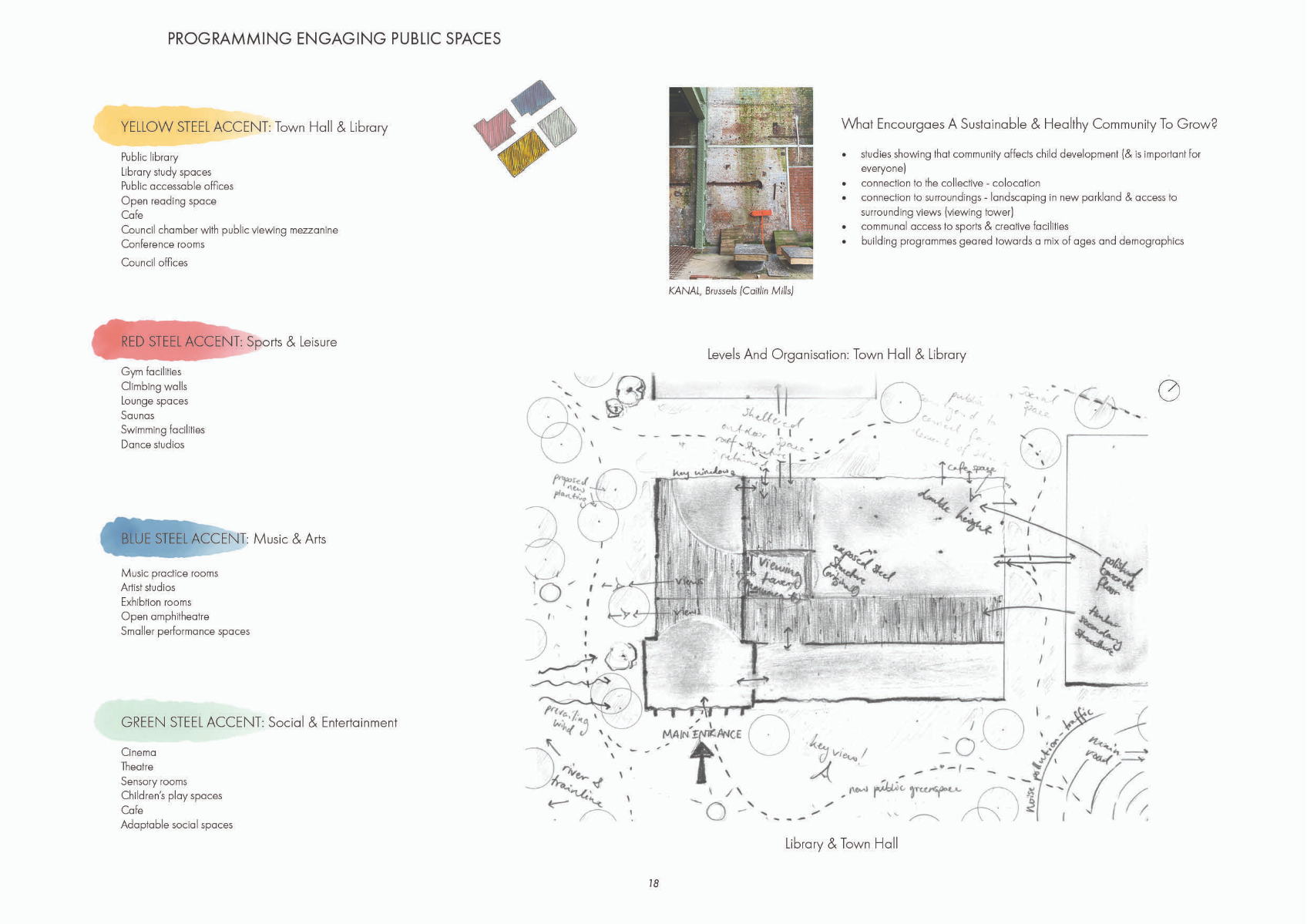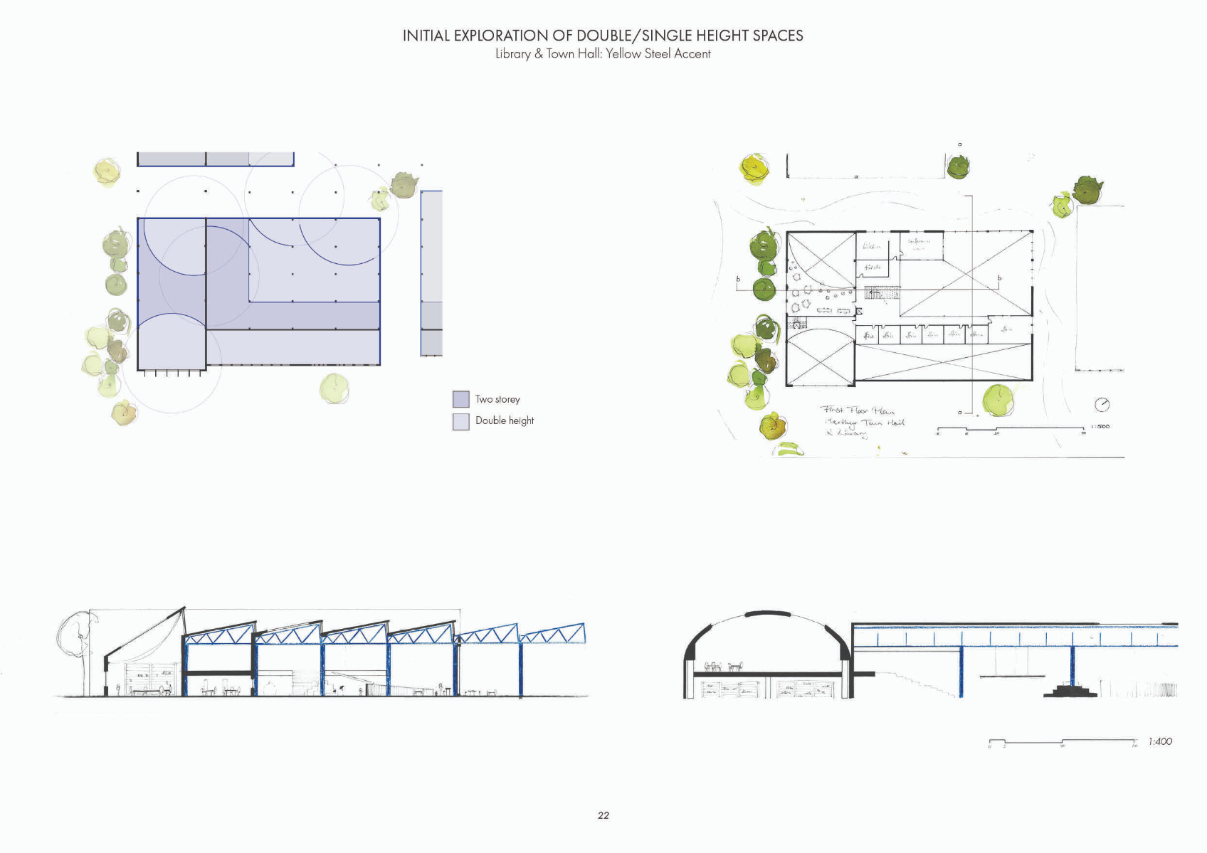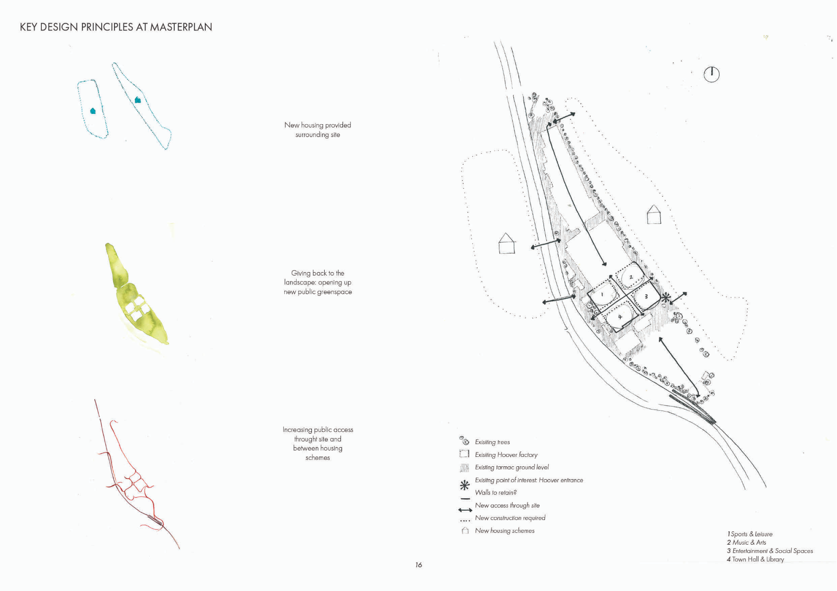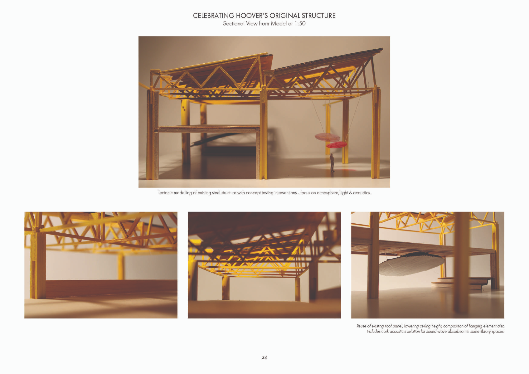 This retrofit proposal for a set of civic buildings brings light, spatial connections and openness into the existing Hoover factory to preserve memories of place and simultaneously create new ones. The quality of space is intended to unfold and rework itself, shaped by communal use over time. Much of Hoover’s steel structure is retained and celebrated, while other elements of the original building are dismantled and playfully reused throughout the scheme. At masterplan scale, the proposed buildings act as a passageway between housing sites, providing access to an extensive programme of community spaces. The detailed focus of this project is on one of the four buildings: Merthyr Town Hall and Library.