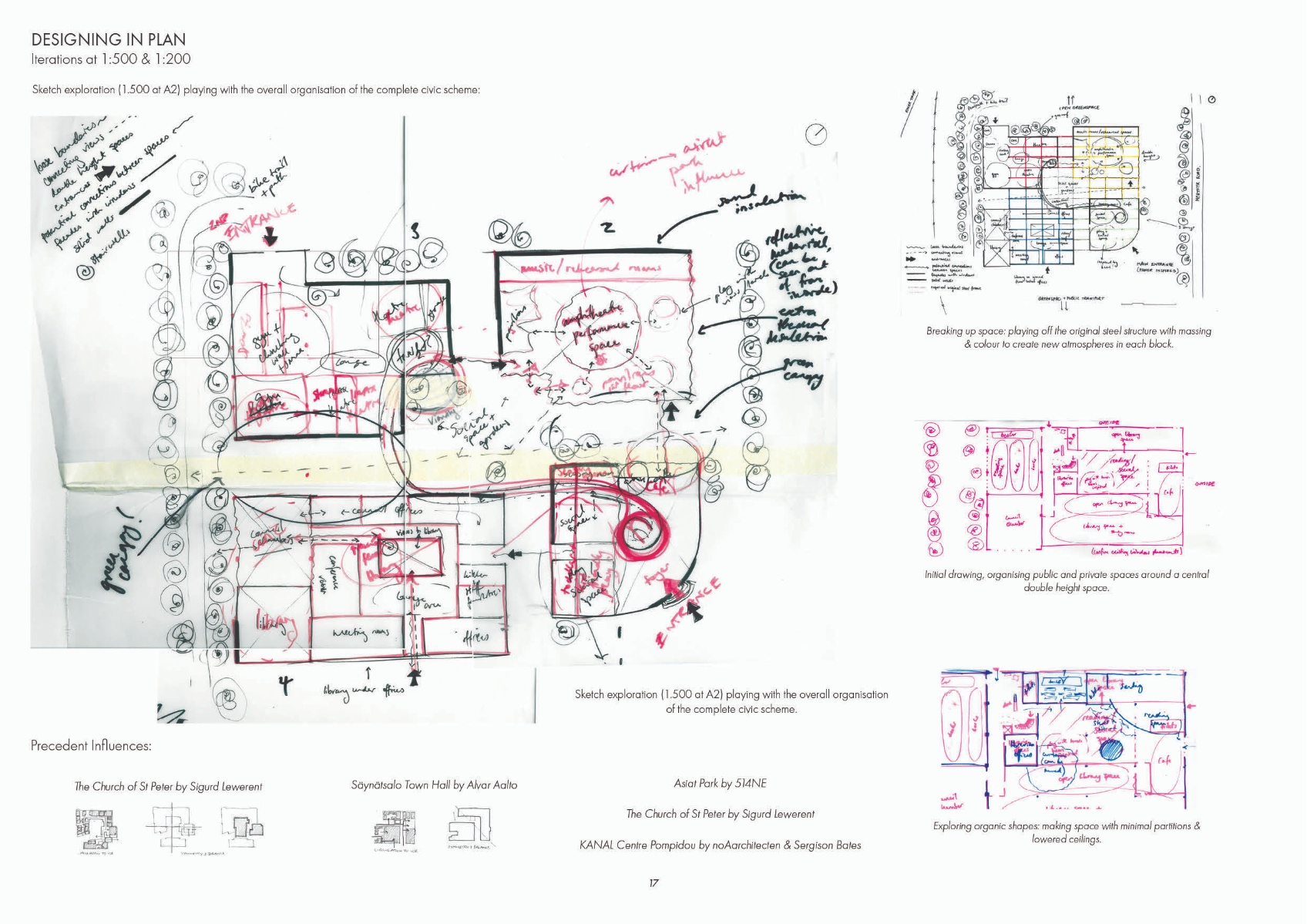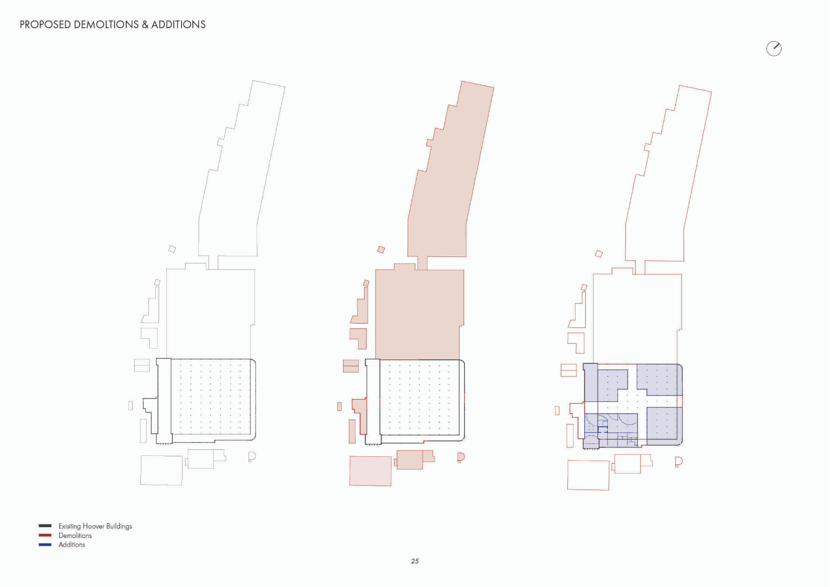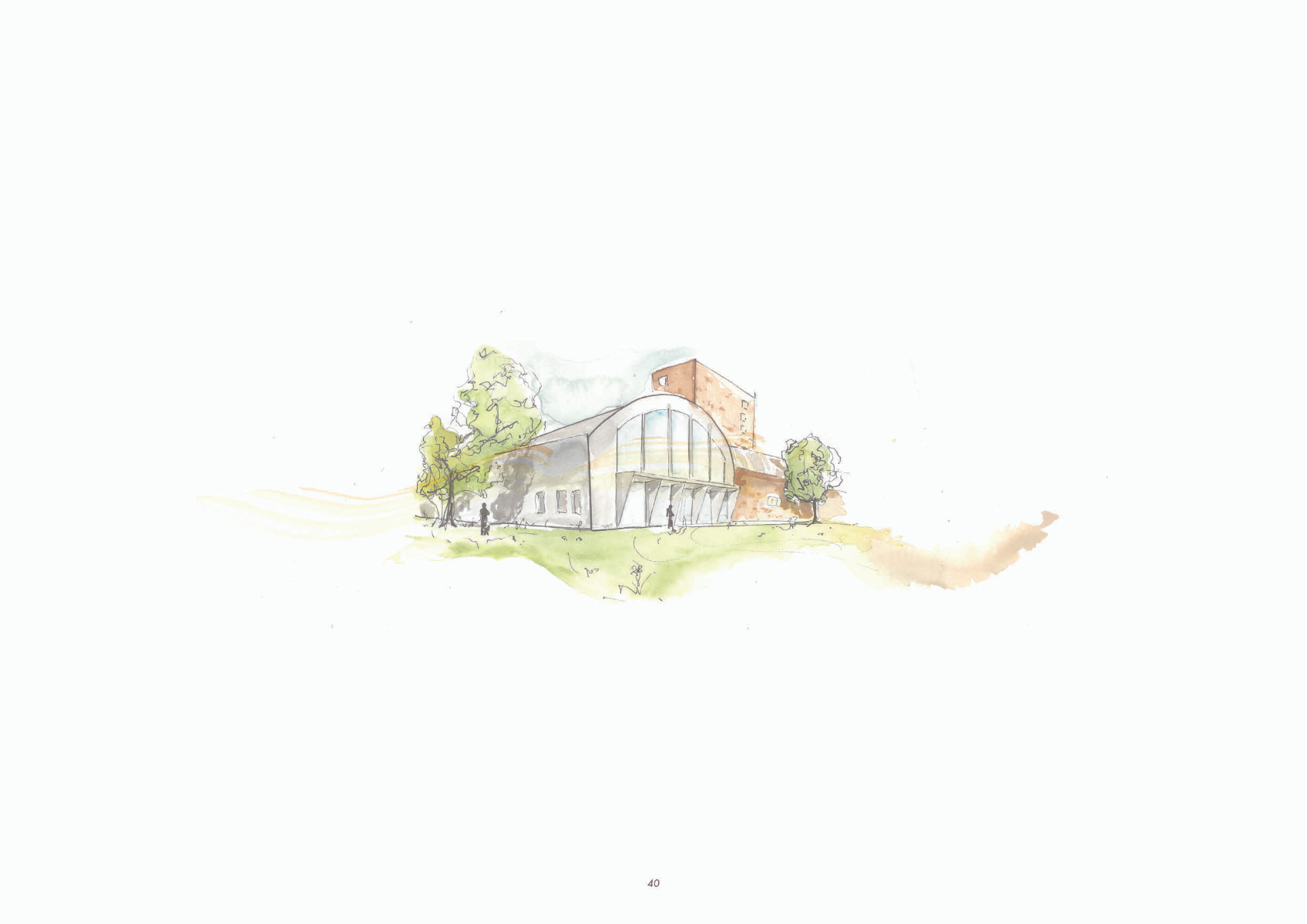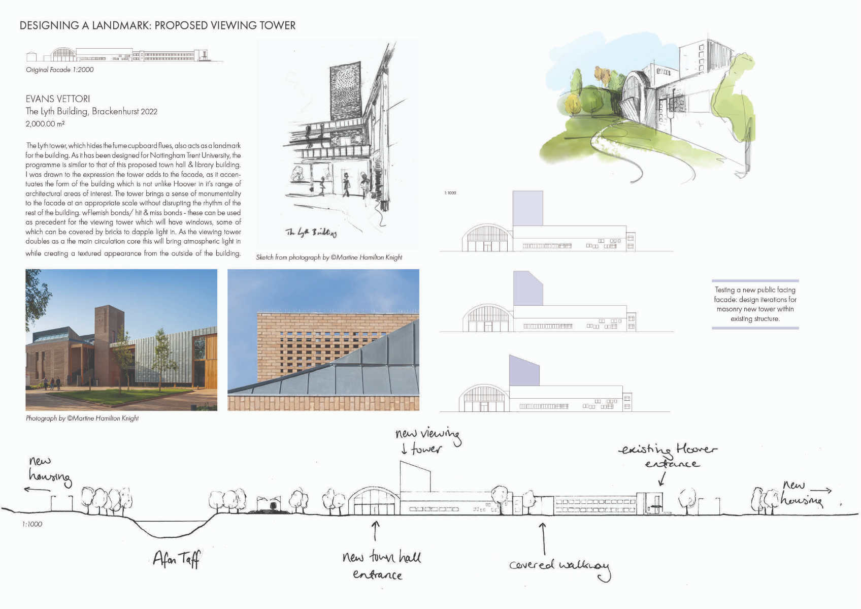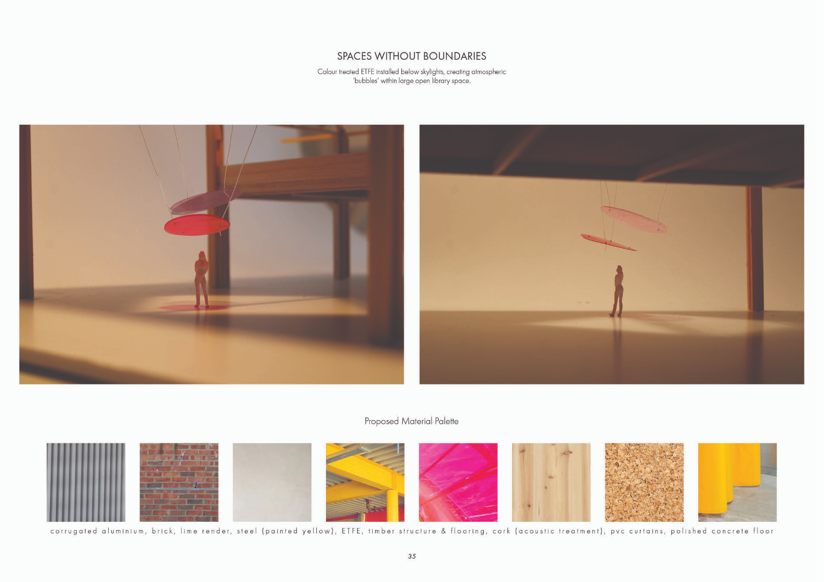 This retrofit proposal for a set of civic buildings brings light, spatial connections and openness into the existing Hoover factory to preserve memories of place and simultaneously create new ones. The quality of space is intended to unfold and rework itself, shaped by communal use over time. Much of Hoover’s steel structure is retained and celebrated, while other elements of the original building are dismantled and playfully reused throughout the scheme. At masterplan scale, the proposed buildings act as a passageway between housing sites, providing access to an extensive programme of community spaces. The detailed focus of this project is on one of the four buildings: Merthyr Town Hall and Library.