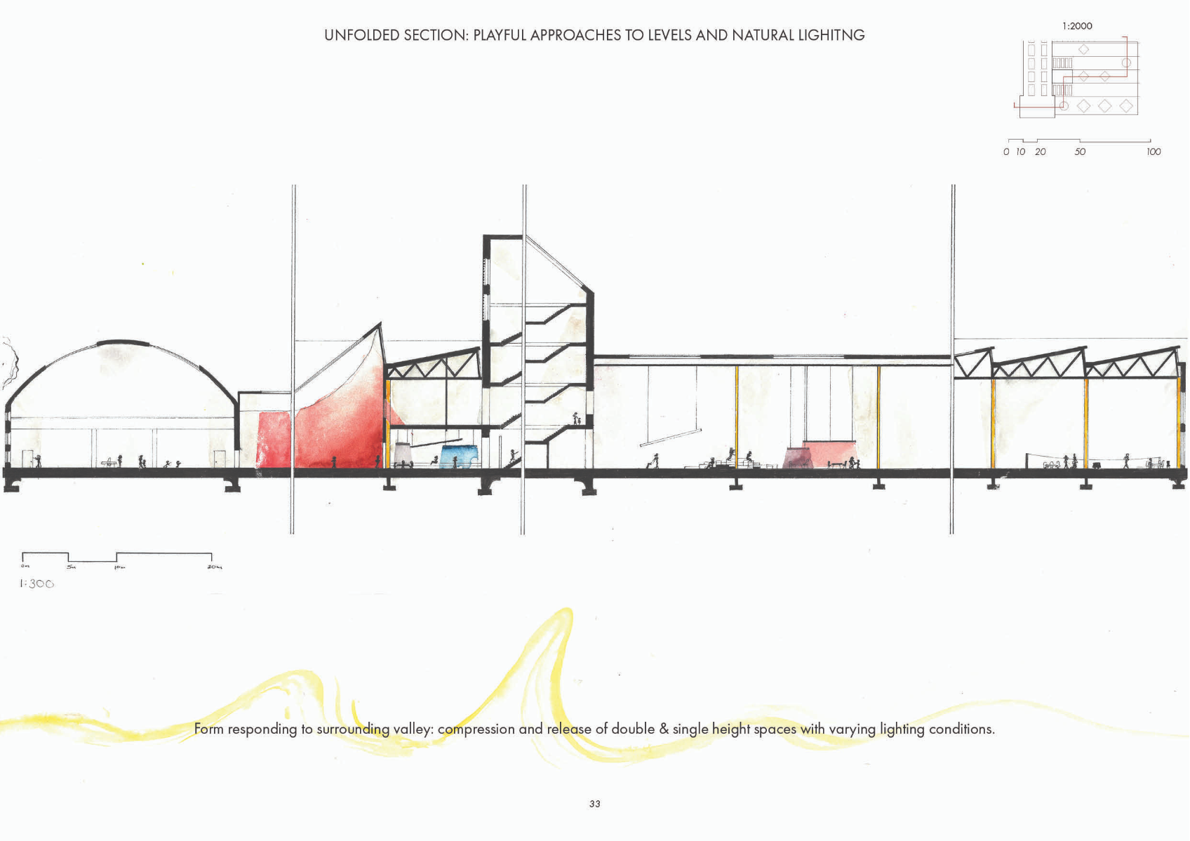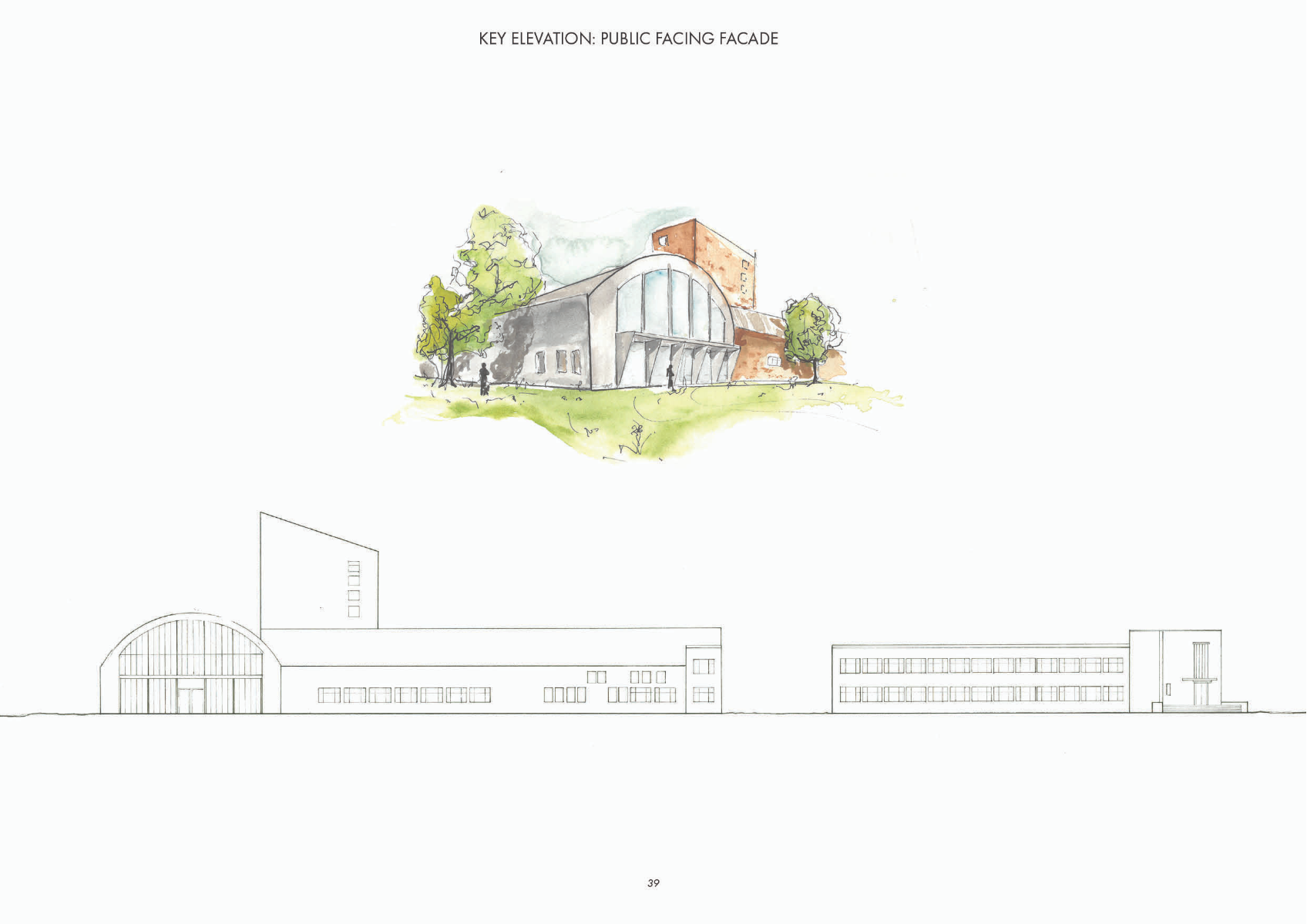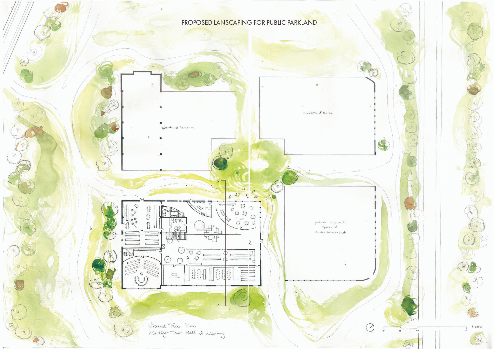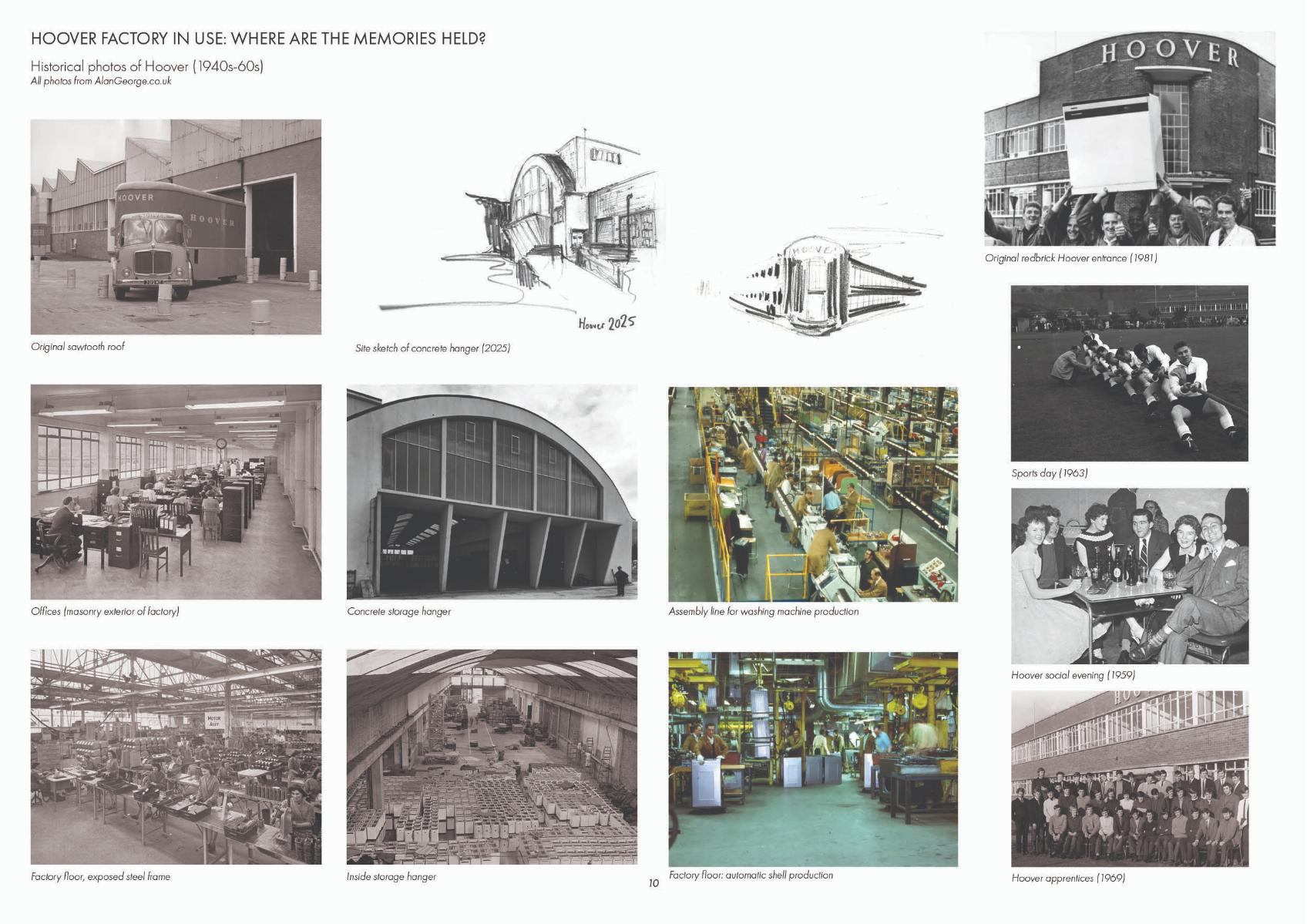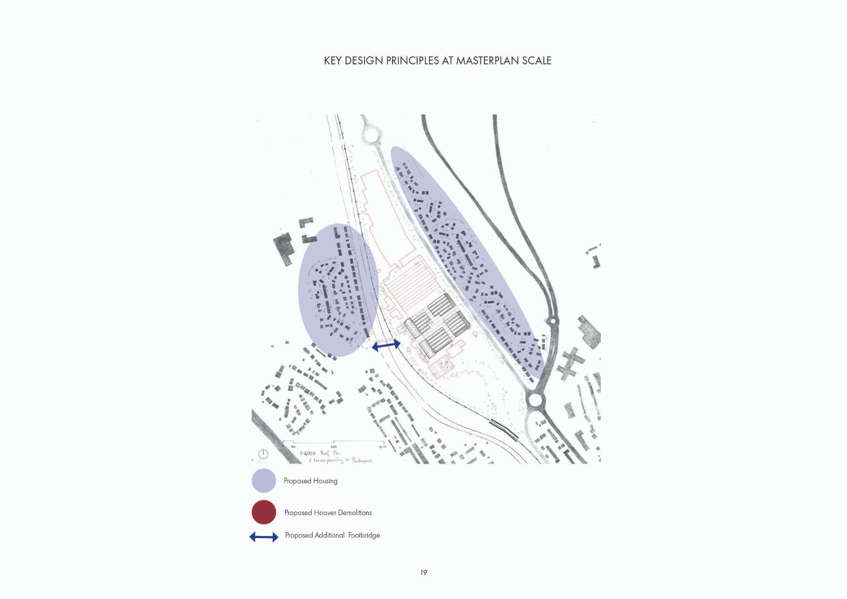 This retrofit proposal for a set of civic buildings brings light, spatial connections and openness into the existing Hoover factory to preserve memories of place and simultaneously create new ones. The quality of space is intended to unfold and rework itself, shaped by communal use over time. Much of Hoover’s steel structure is retained and celebrated, while other elements of the original building are dismantled and playfully reused throughout the scheme. At masterplan scale, the proposed buildings act as a passageway between housing sites, providing access to an extensive programme of community spaces. The detailed focus of this project is on one of the four buildings: Merthyr Town Hall and Library.