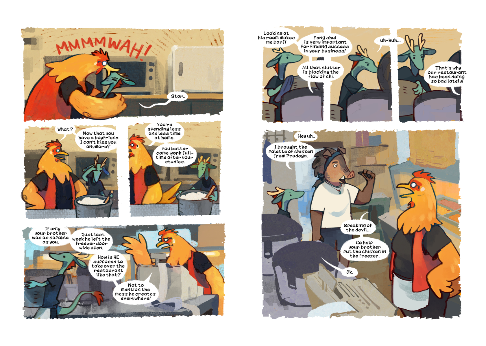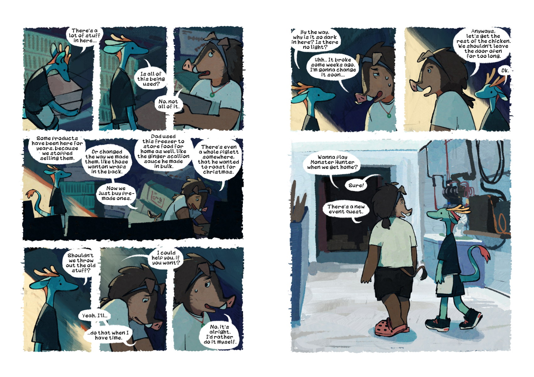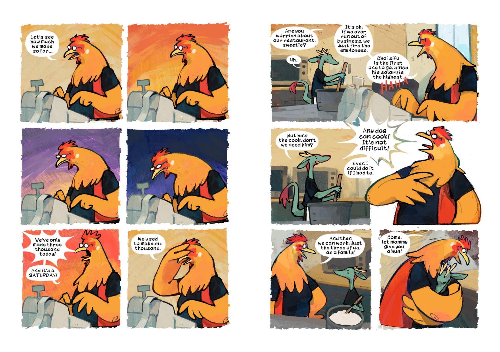 Oxtail is a comic that takes readers behind the scenes of a Chinese family restaurant. Inspired by personal experiences and stories from my own family's business, it blends everyday scenes with sharp exaggeration to explore workplace tensions, complex family dynamics, and the quiet grief of losing a father and former owner.