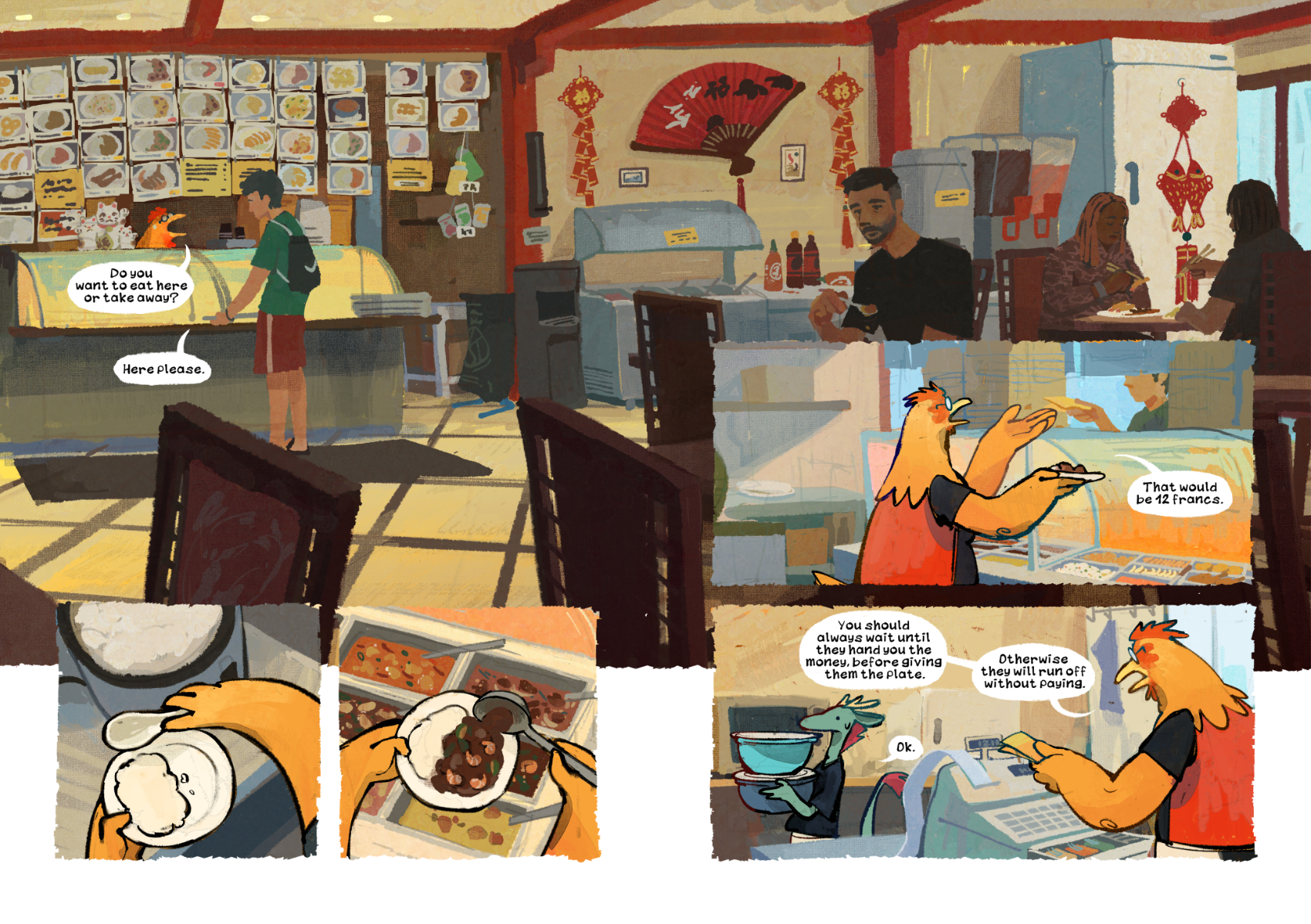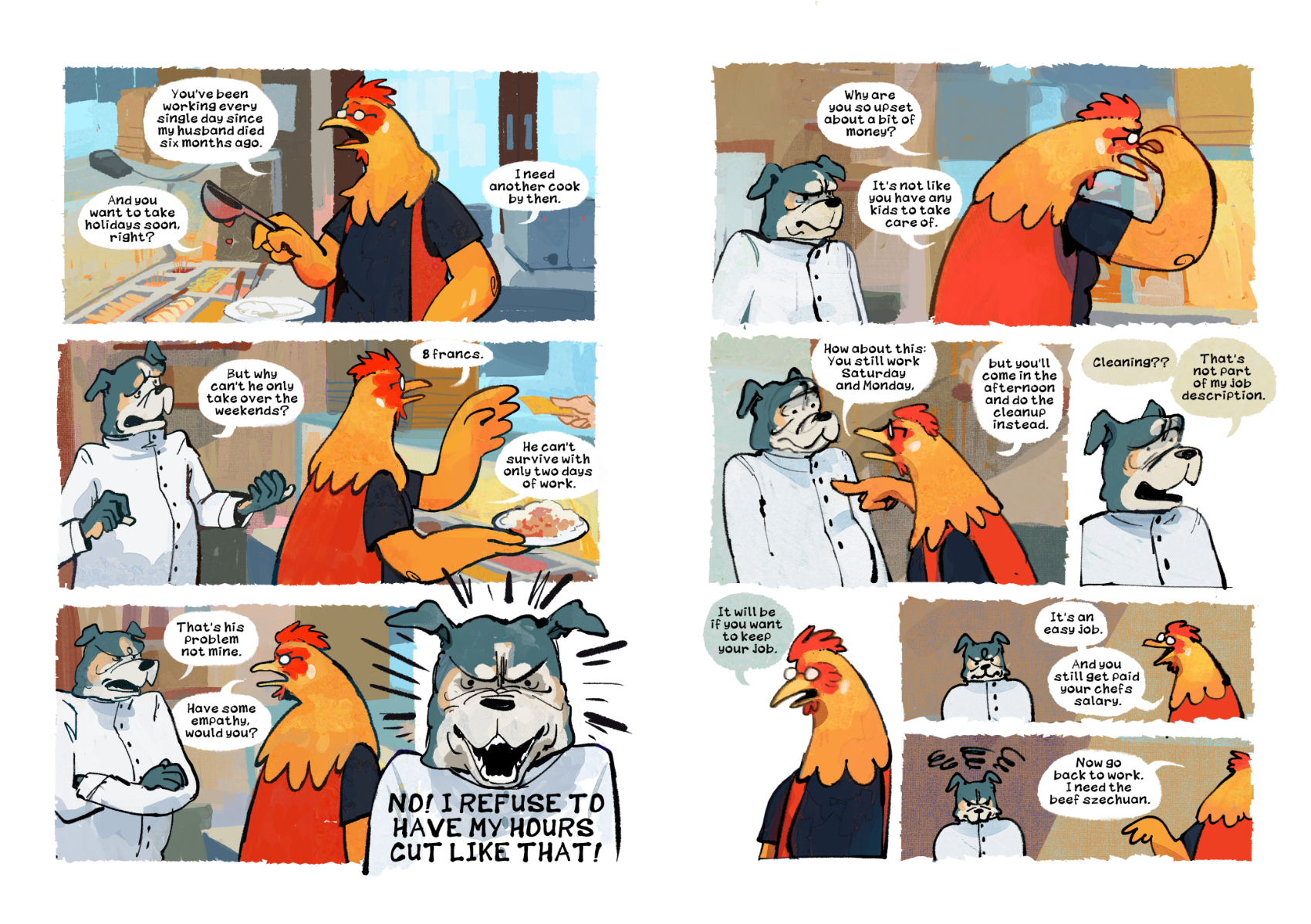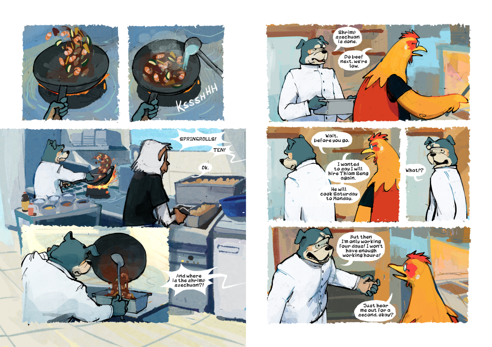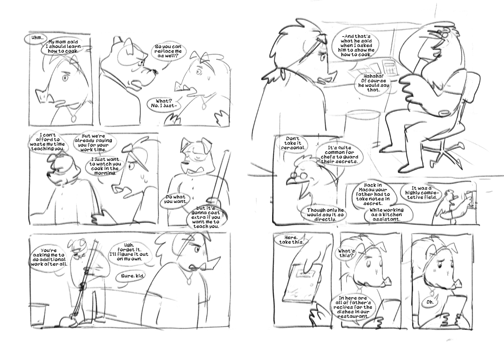 Oxtail is a comic that takes readers behind the scenes of a Chinese family restaurant. Inspired by personal experiences and stories from my own family's business, it blends everyday scenes with sharp exaggeration to explore workplace tensions, complex family dynamics, and the quiet grief of losing a father and former owner.