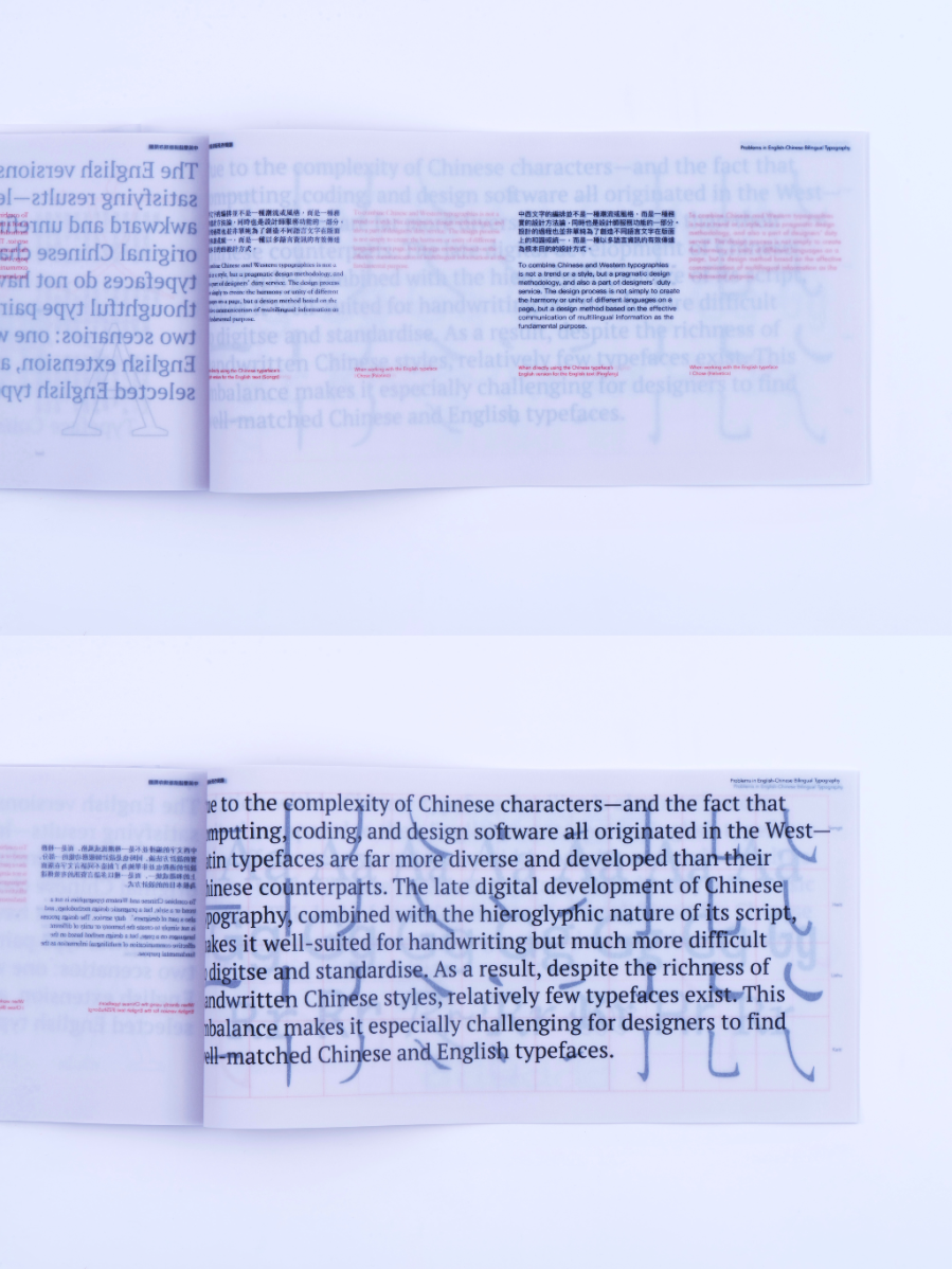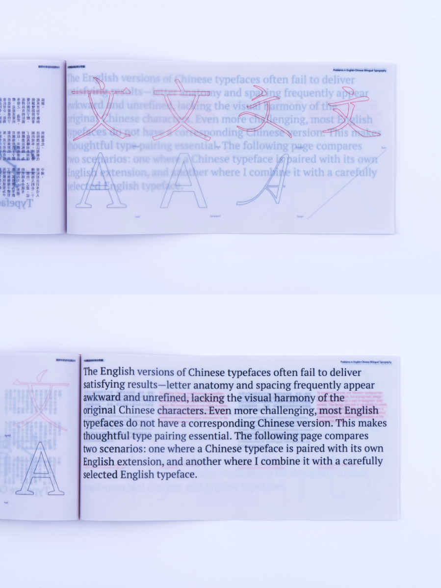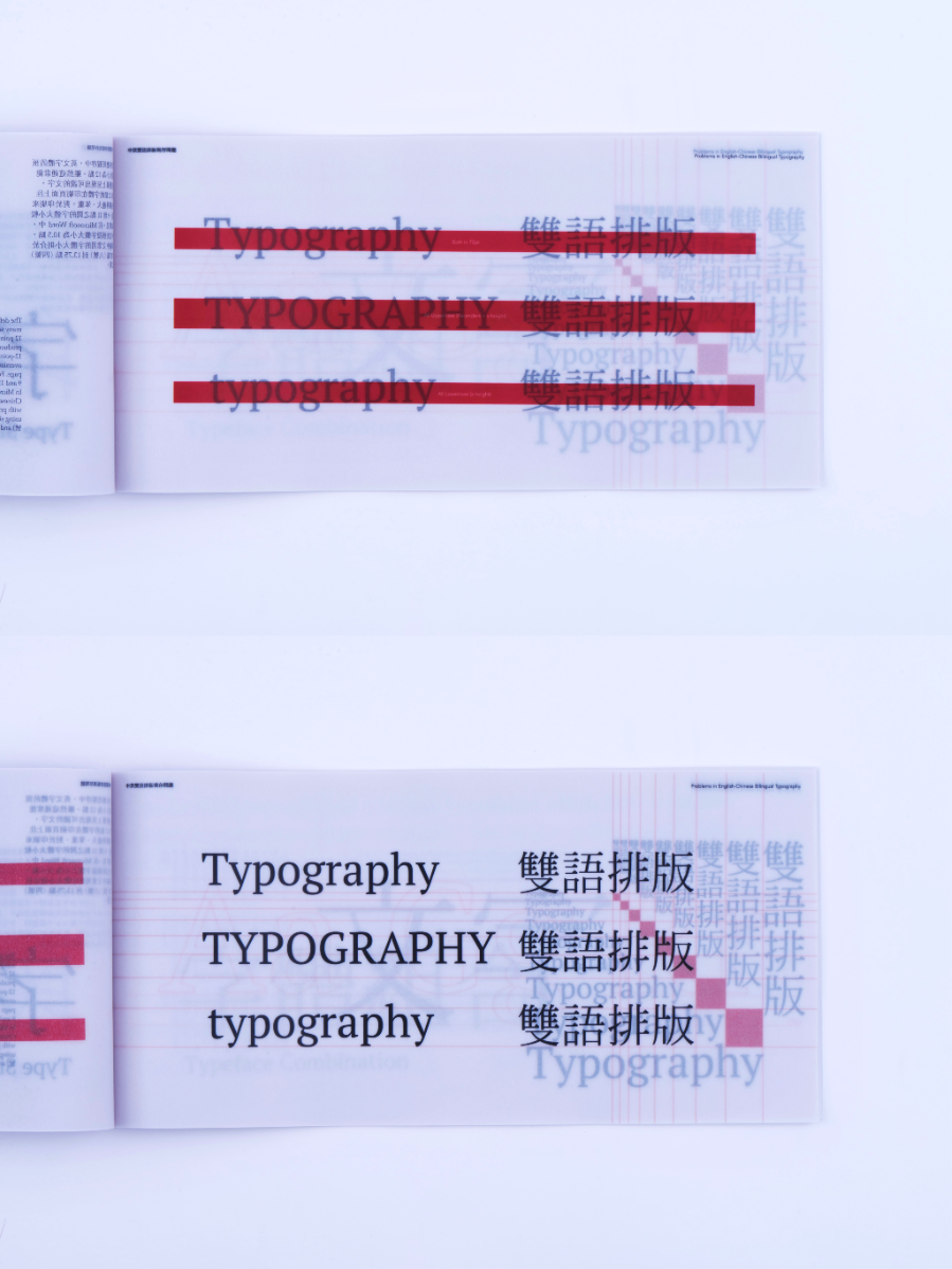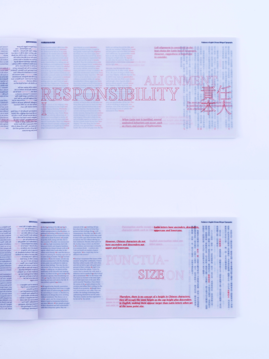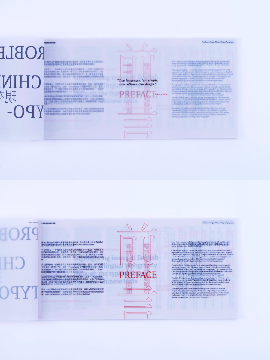 As a Chinese graphic designer and typographer, I often work on bilingual designs involving Chinese and English. The structural differences between the two—English being alphabetic and phonetic, and Chinese being logographic and rooted in hieroglyphs—make typographic harmony challenging. While English typography benefits from well-developed theories and tools, many of these do not translate effectively to Chinese. This publication highlights key structural and aesthetic differences, explores why bilingual typography often falls short, and raises awareness of the challenges designers face in achieving visual balance and coherence across both languages.