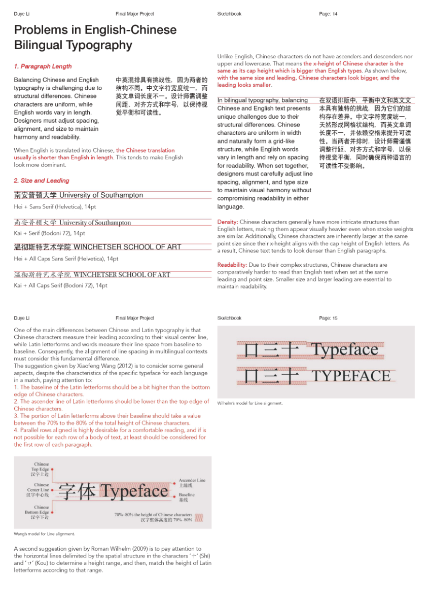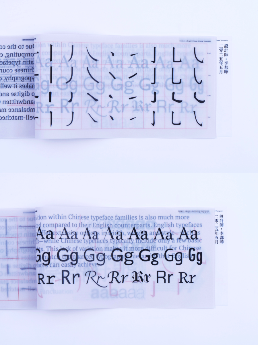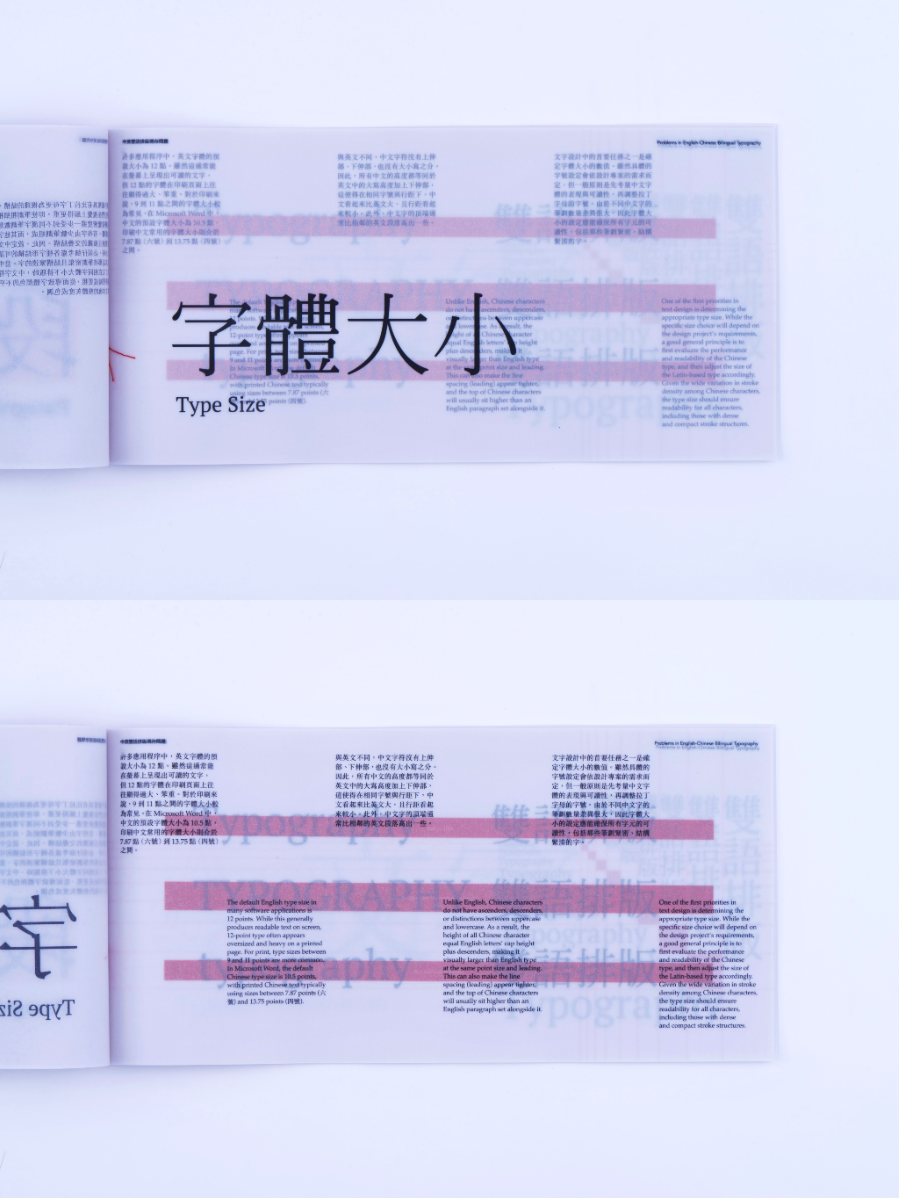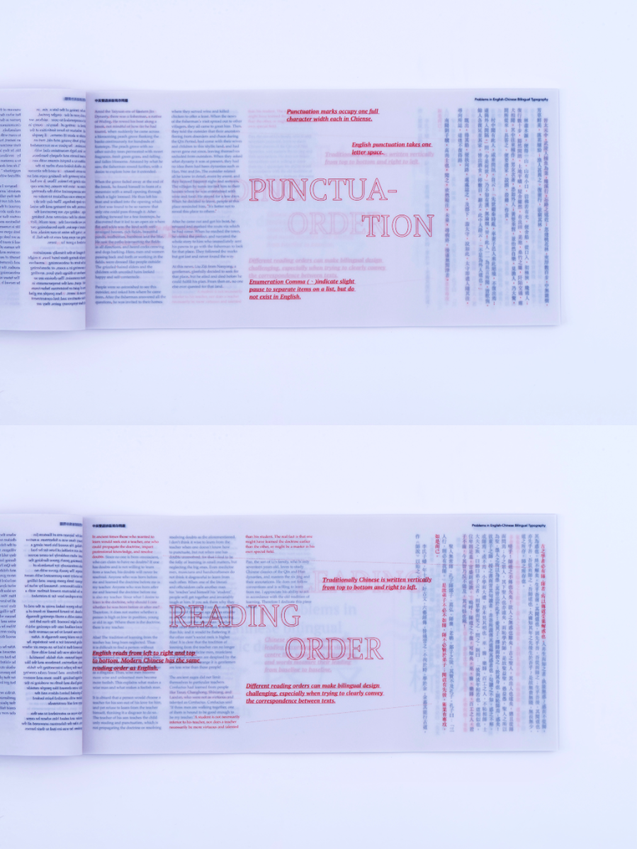 As a Chinese graphic designer and typographer, I often work on bilingual designs involving Chinese and English. The structural differences between the two—English being alphabetic and phonetic, and Chinese being logographic and rooted in hieroglyphs—make typographic harmony challenging. While English typography benefits from well-developed theories and tools, many of these do not translate effectively to Chinese. This publication highlights key structural and aesthetic differences, explores why bilingual typography often falls short, and raises awareness of the challenges designers face in achieving visual balance and coherence across both languages.