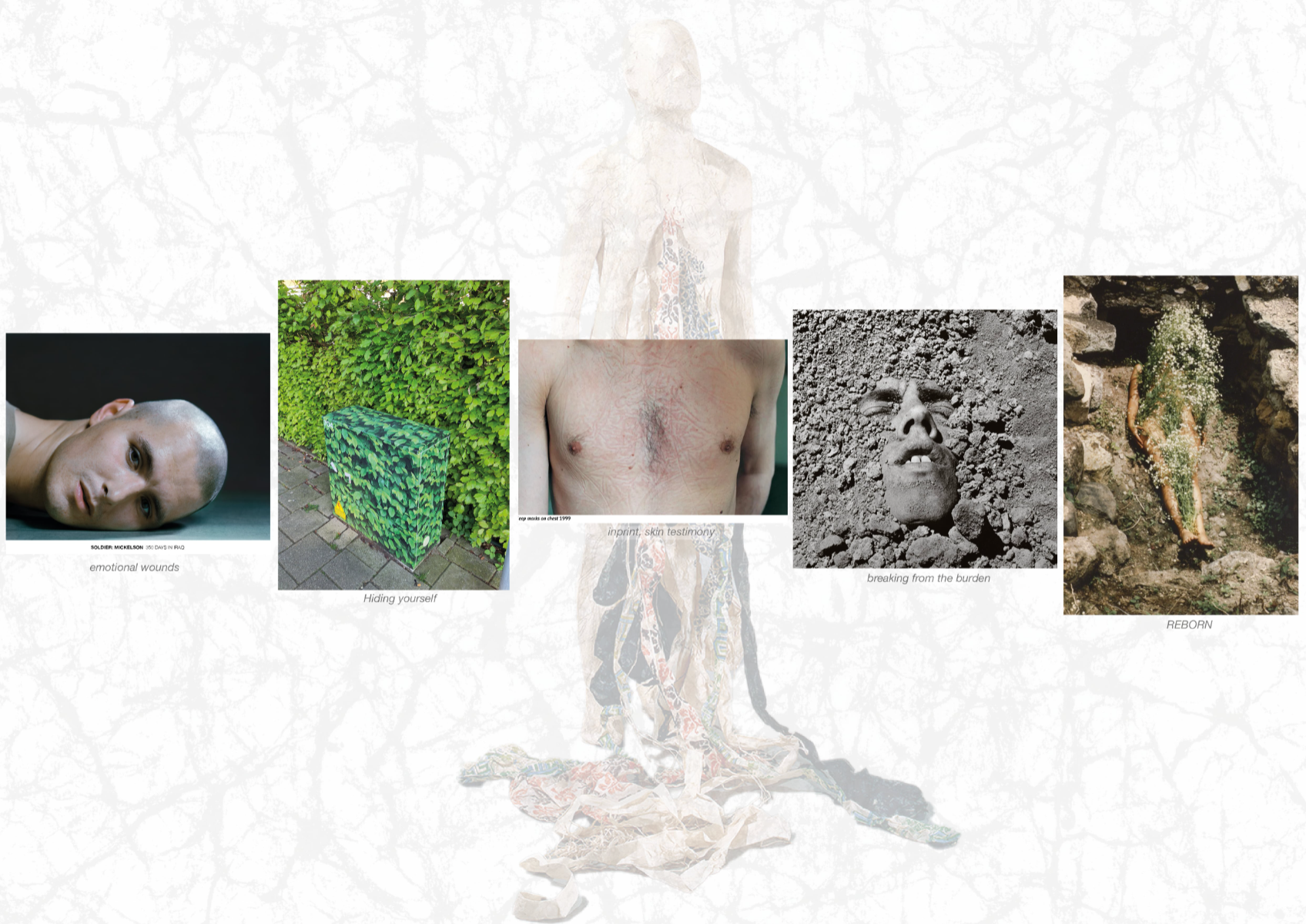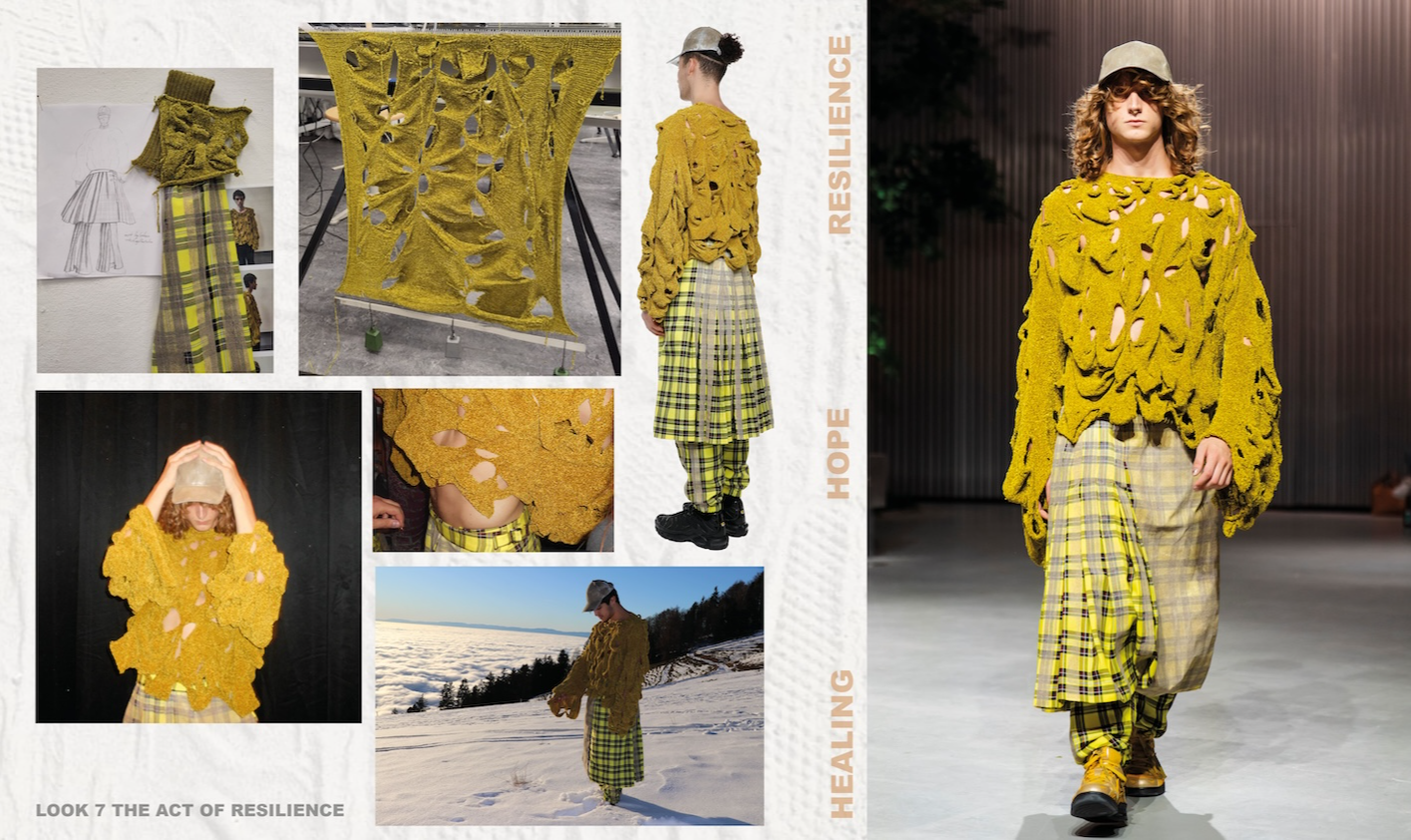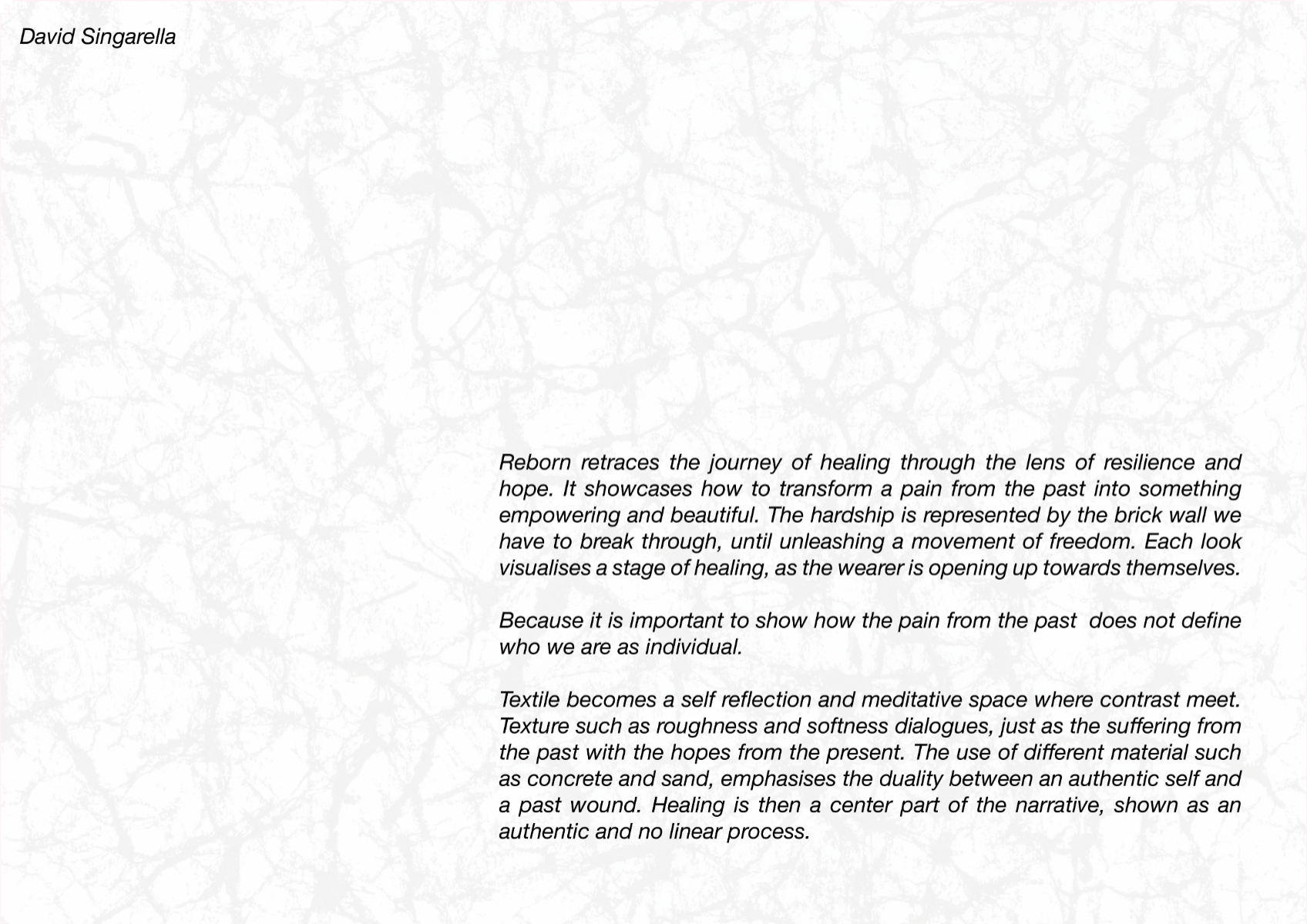 Reborn retraces the journey of healing through the lens of resilience and hope. It showcases how to transform a pain from the past into something empowering and beautiful. It brings a light on emotional scars as something that should not feel like a burden anymore. Because it is important to show how the pain from the past does not define who we are as individual. Textile becomes a self reflection and meditative space where contrast meet. Texture such as roughness and softness dialogues, just as the suffering from the past with the hopes from the present. Healing is then a center part of the narrative, shown as an authentic and no linear process.