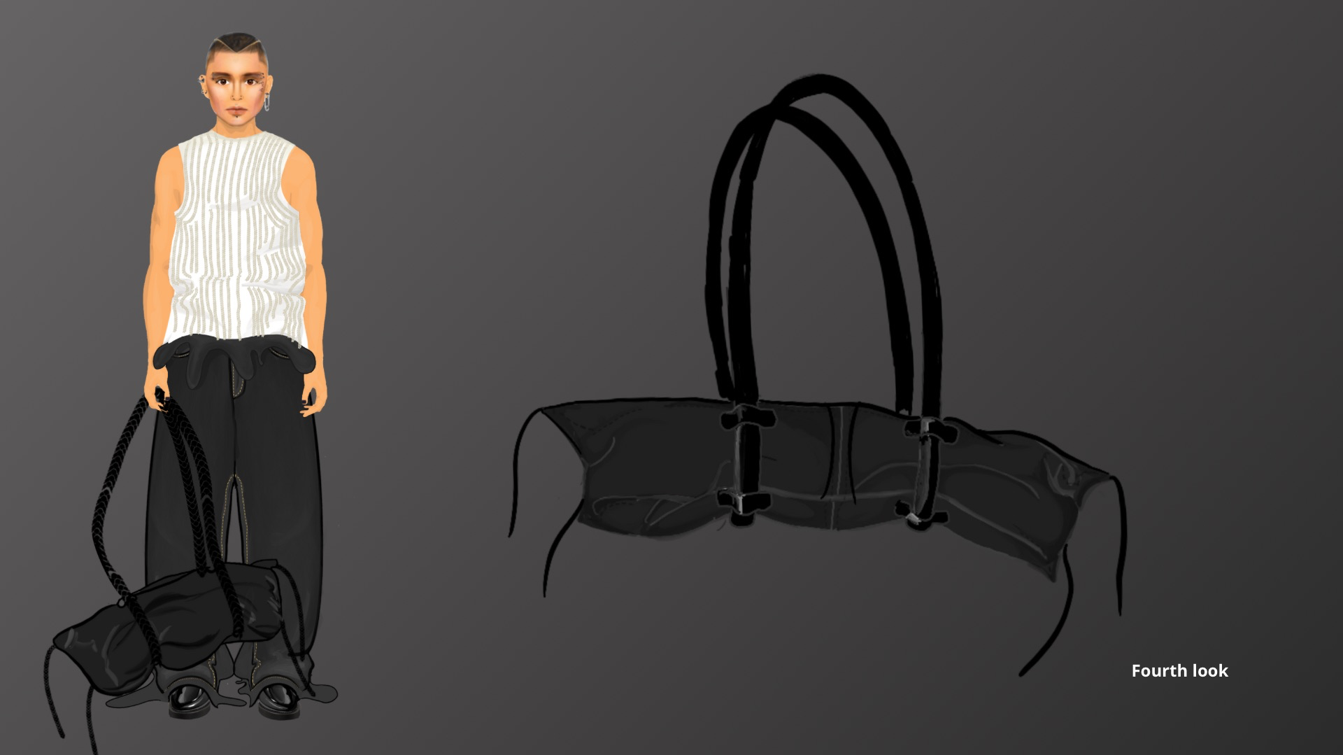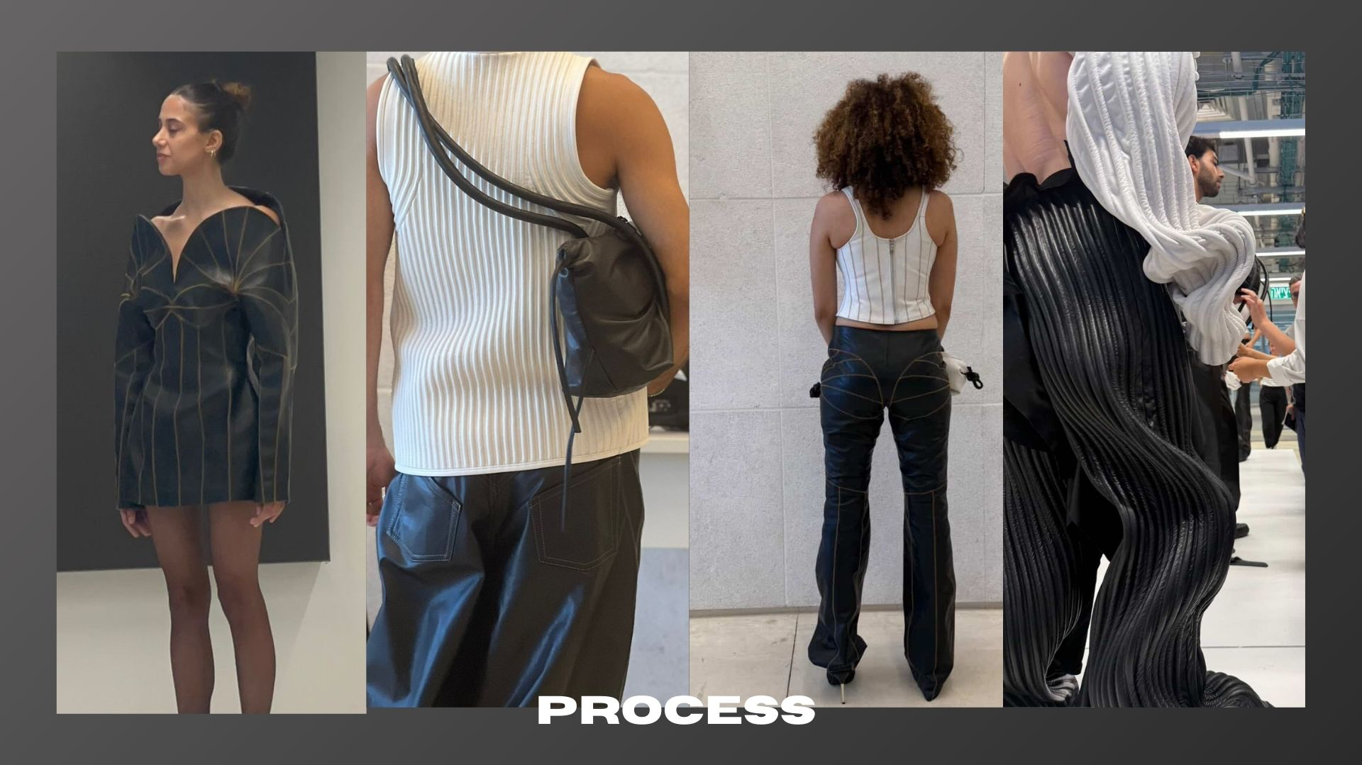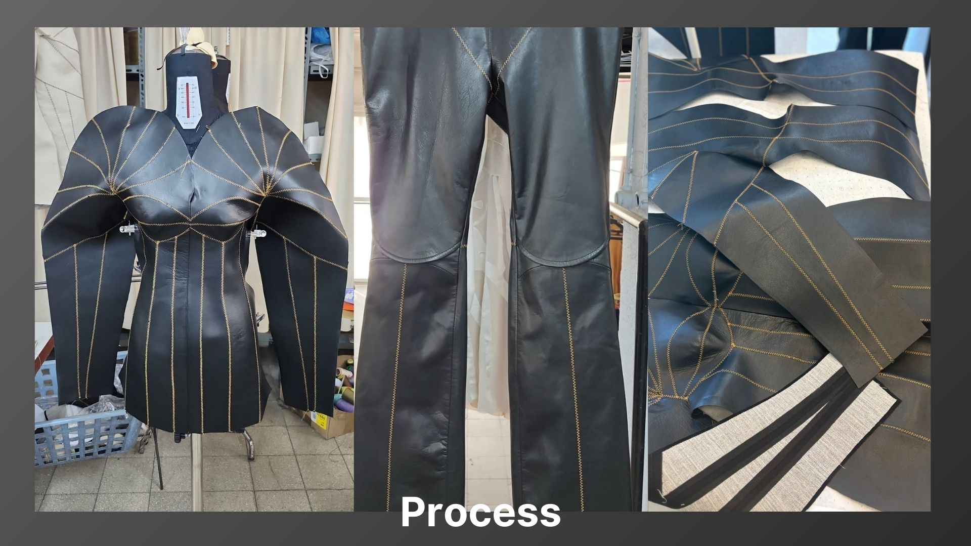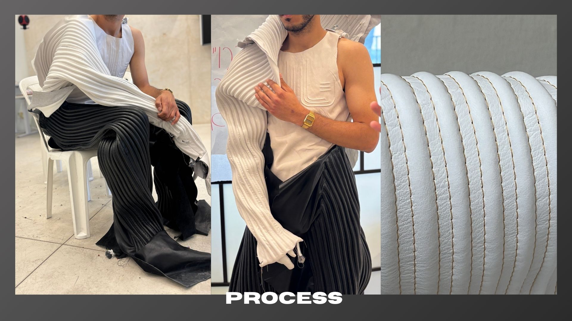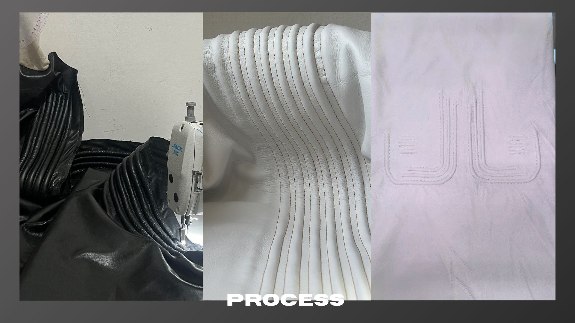 This collection explores the tension between the ego’s desire to protect, control, and impress, and the contrasting emotions of vulnerability, tenderness, and a deep yearning for love — all while seeking a renewed sense of inner harmony. The garments are designed with elements that resemble armor, evoking a modern-day warrior aesthetic. Leather was chosen as the primary material for its strength and adaptability, serving both as a durable fabric and a symbolic shield — much like skin, which safeguards the body’s fragility. The designs range from structured, tailored silhouettes that emphasize the body’s shape to looser, more fluid forms that incorporate supportive elements. A zigzag stitch is used as a functional technique for connecting multiple seams. The black-and-white palette reflects the interplay of opposing emotional forces. Ultimately, the look aims to project confidence — even in moments of inner doubt.