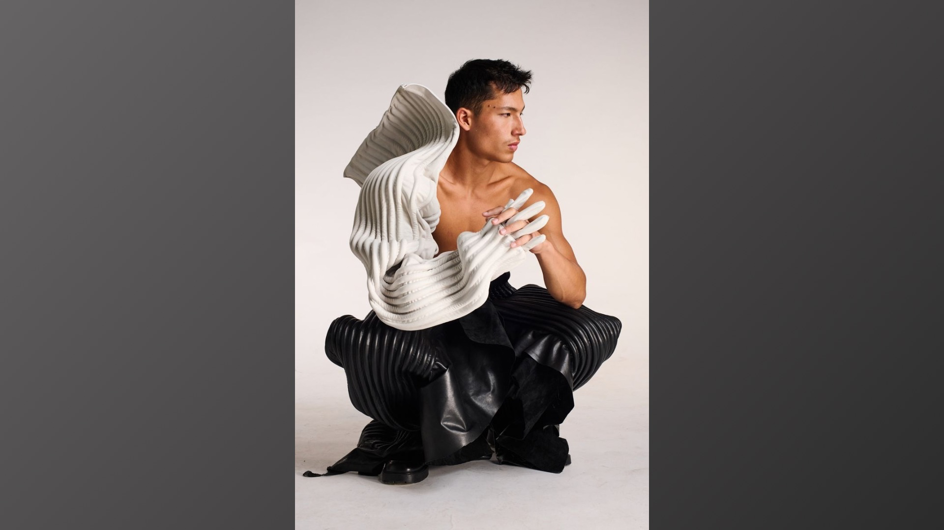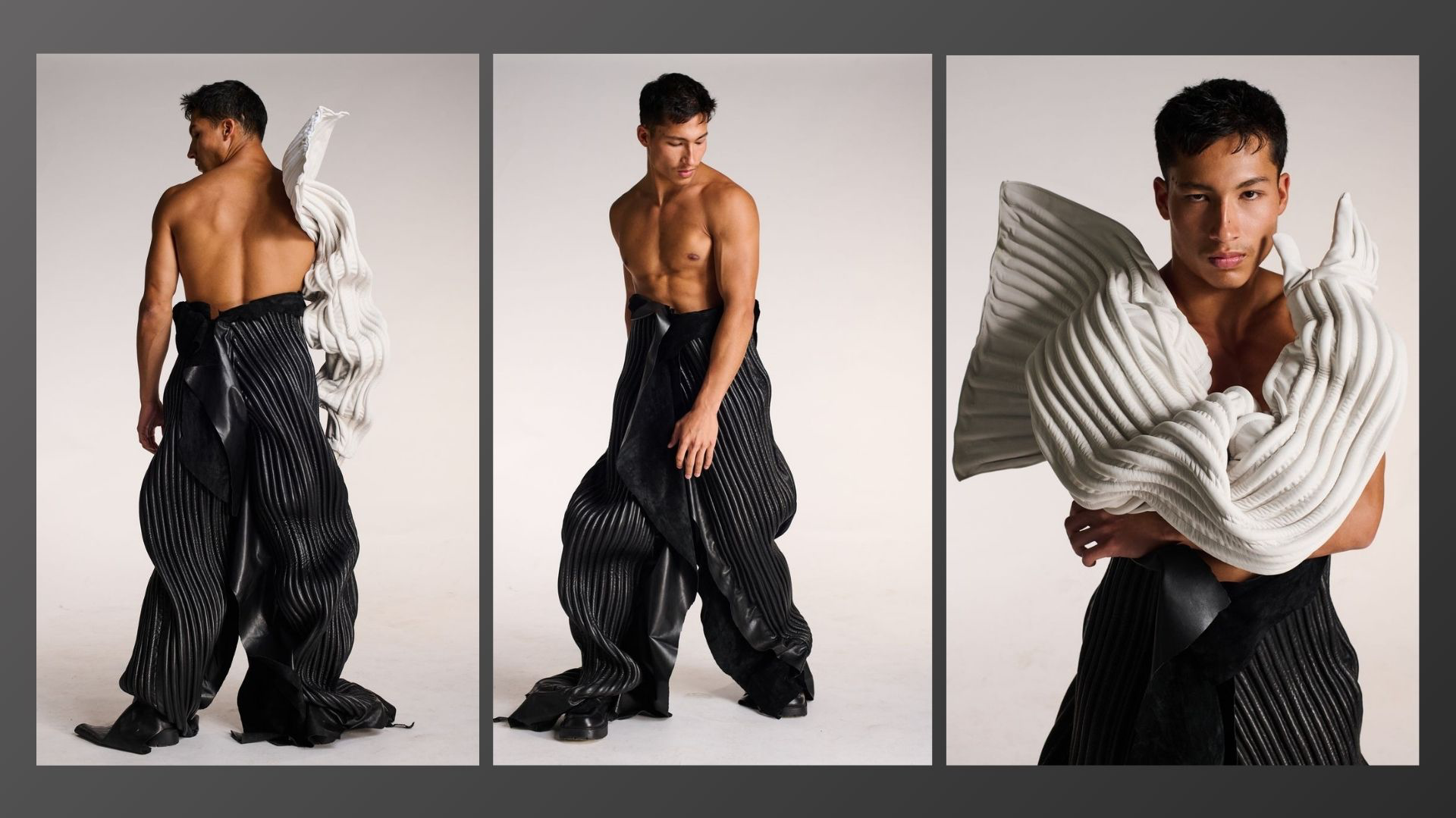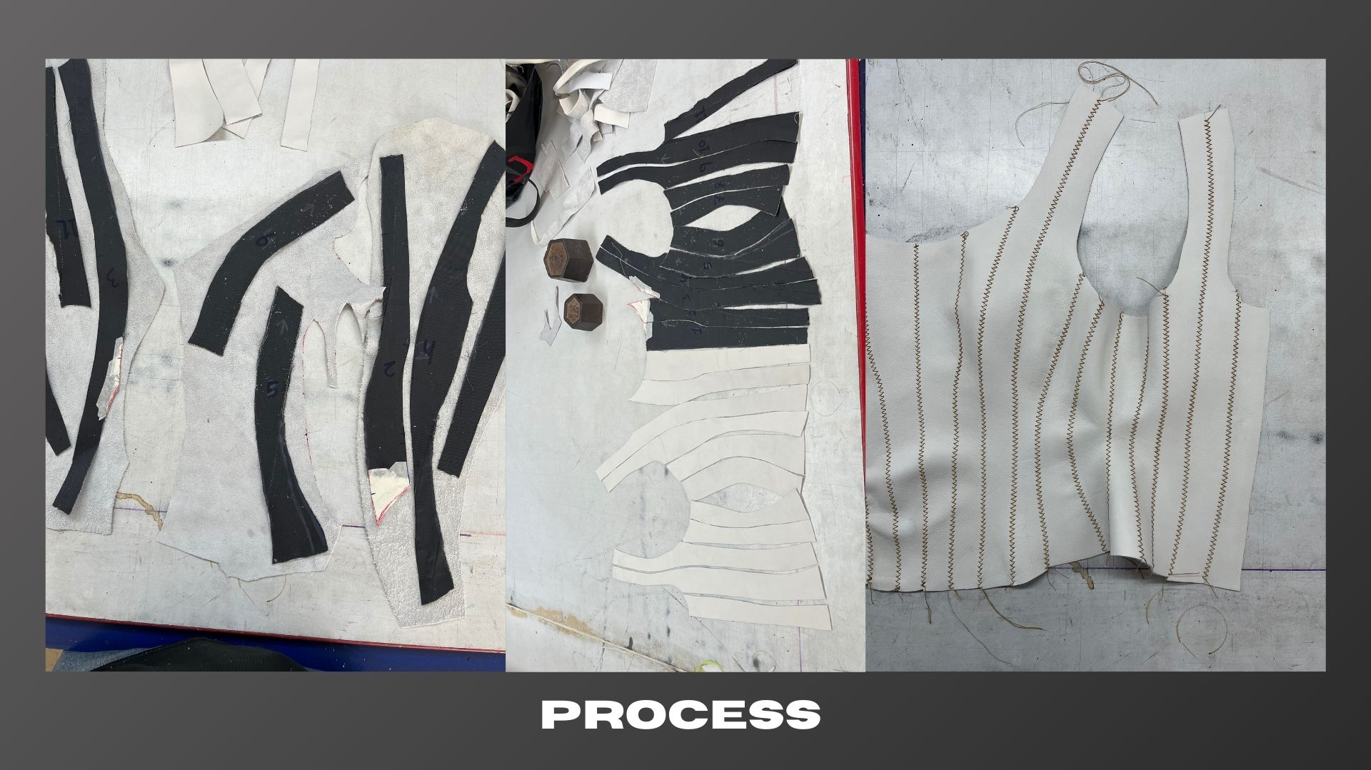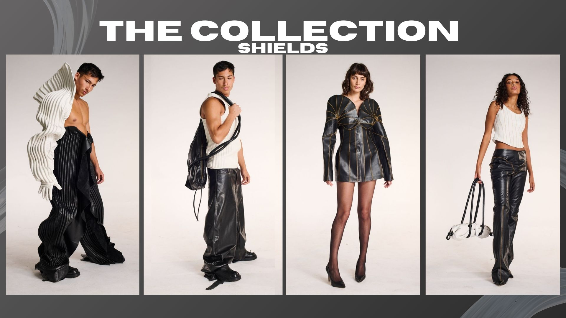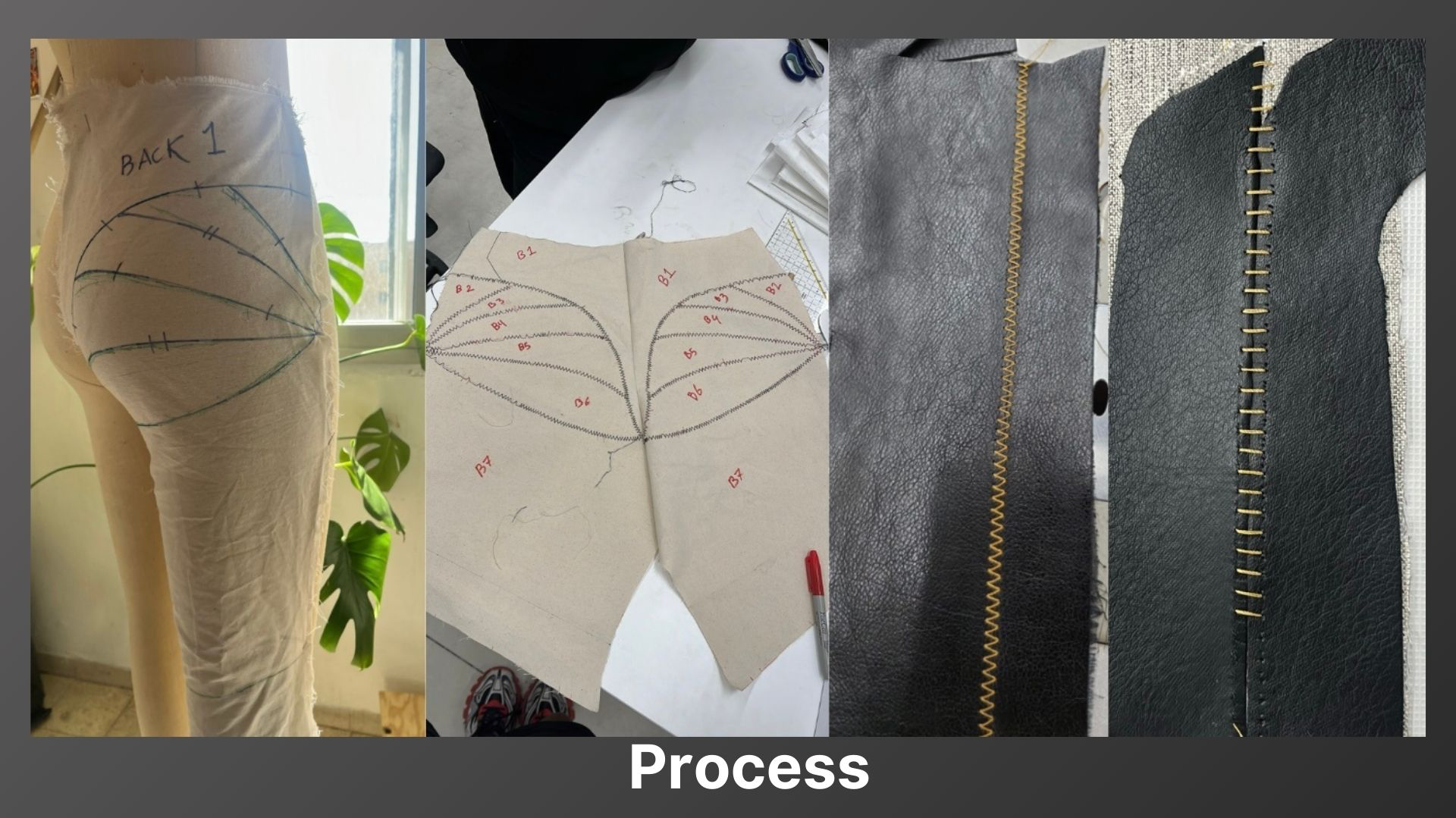 This collection explores the tension between the ego’s desire to protect, control, and impress, and the contrasting emotions of vulnerability, tenderness, and a deep yearning for love — all while seeking a renewed sense of inner harmony. The garments are designed with elements that resemble armor, evoking a modern-day warrior aesthetic. Leather was chosen as the primary material for its strength and adaptability, serving both as a durable fabric and a symbolic shield — much like skin, which safeguards the body’s fragility. The designs range from structured, tailored silhouettes that emphasize the body’s shape to looser, more fluid forms that incorporate supportive elements. A zigzag stitch is used as a functional technique for connecting multiple seams. The black-and-white palette reflects the interplay of opposing emotional forces. Ultimately, the look aims to project confidence — even in moments of inner doubt.