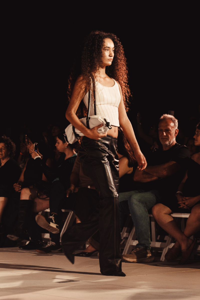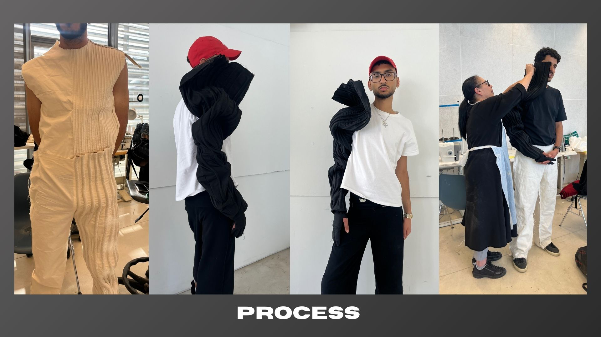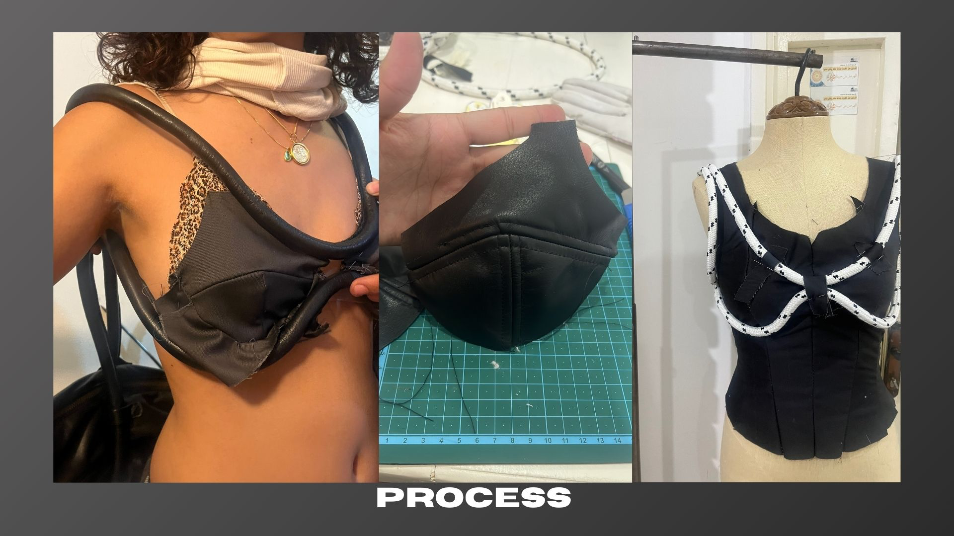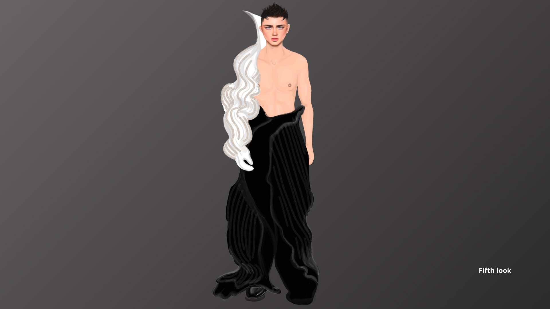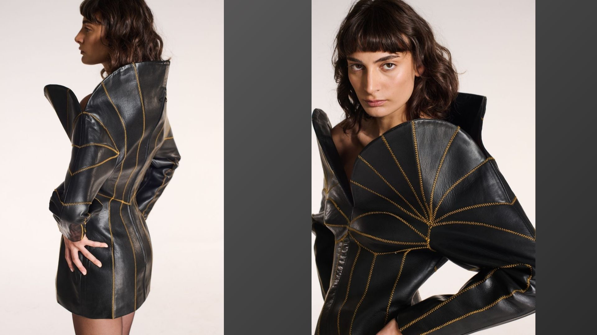 This collection explores the tension between the ego’s desire to protect, control, and impress, and the contrasting emotions of vulnerability, tenderness, and a deep yearning for love — all while seeking a renewed sense of inner harmony. The garments are designed with elements that resemble armor, evoking a modern-day warrior aesthetic. Leather was chosen as the primary material for its strength and adaptability, serving both as a durable fabric and a symbolic shield — much like skin, which safeguards the body’s fragility. The designs range from structured, tailored silhouettes that emphasize the body’s shape to looser, more fluid forms that incorporate supportive elements. A zigzag stitch is used as a functional technique for connecting multiple seams. The black-and-white palette reflects the interplay of opposing emotional forces. Ultimately, the look aims to project confidence — even in moments of inner doubt.