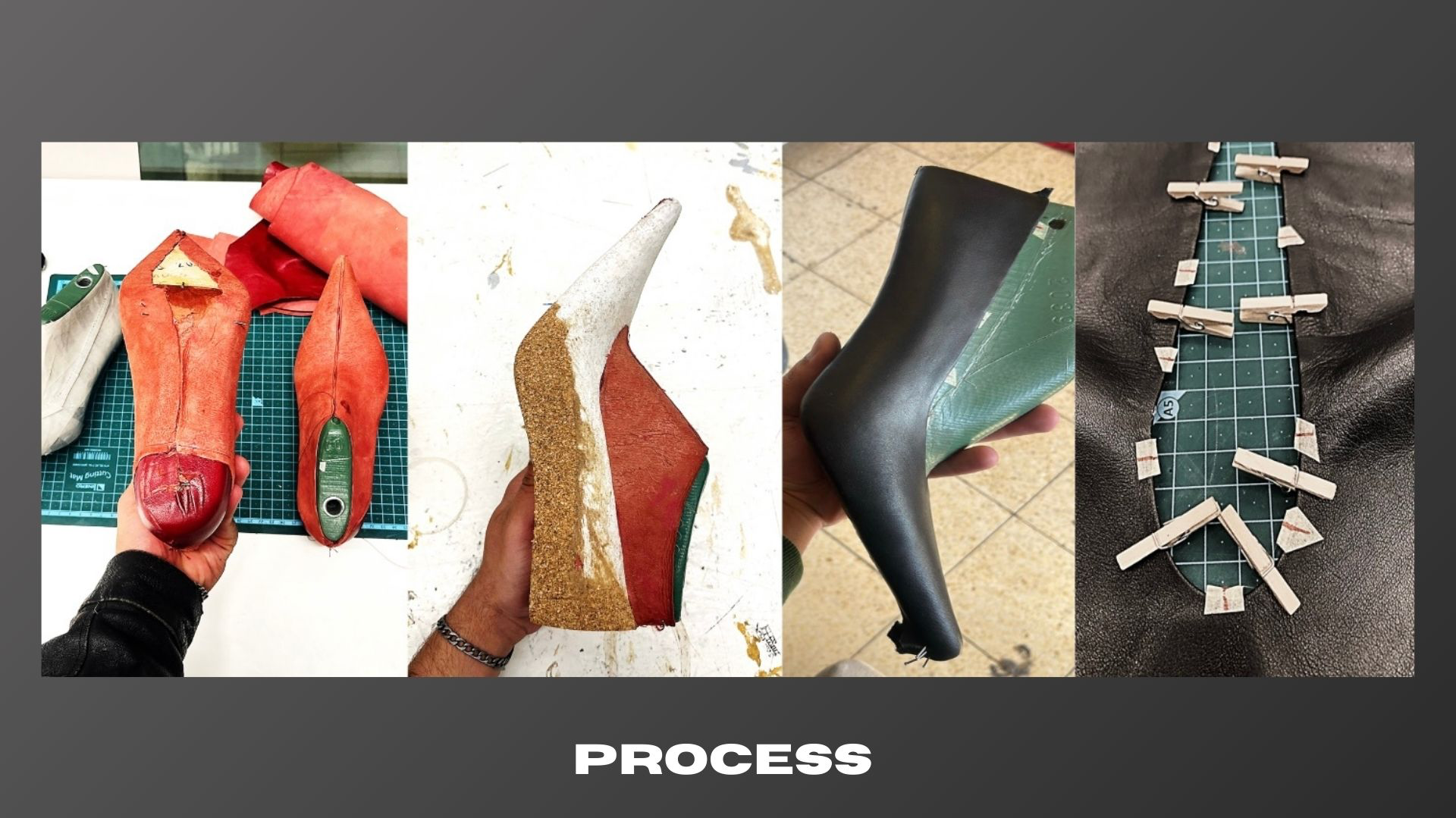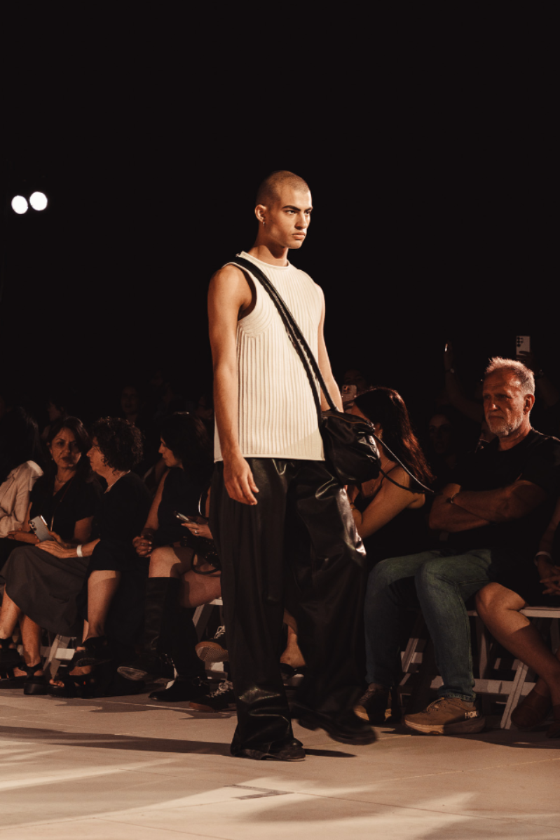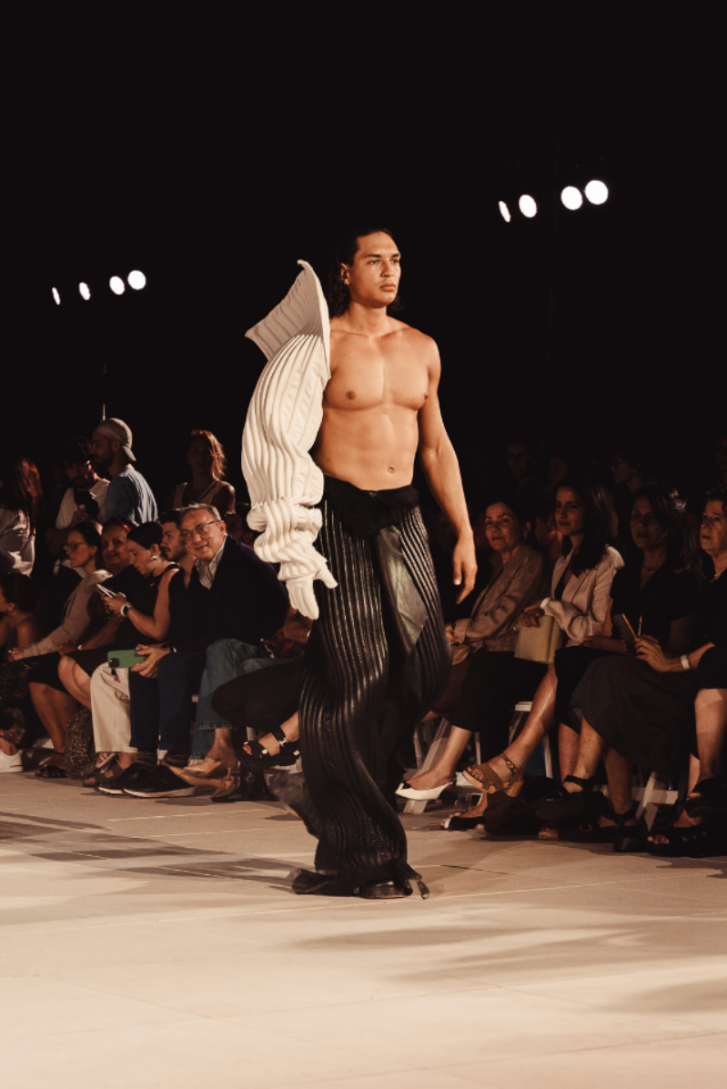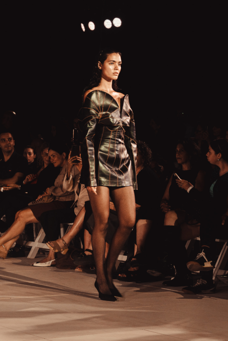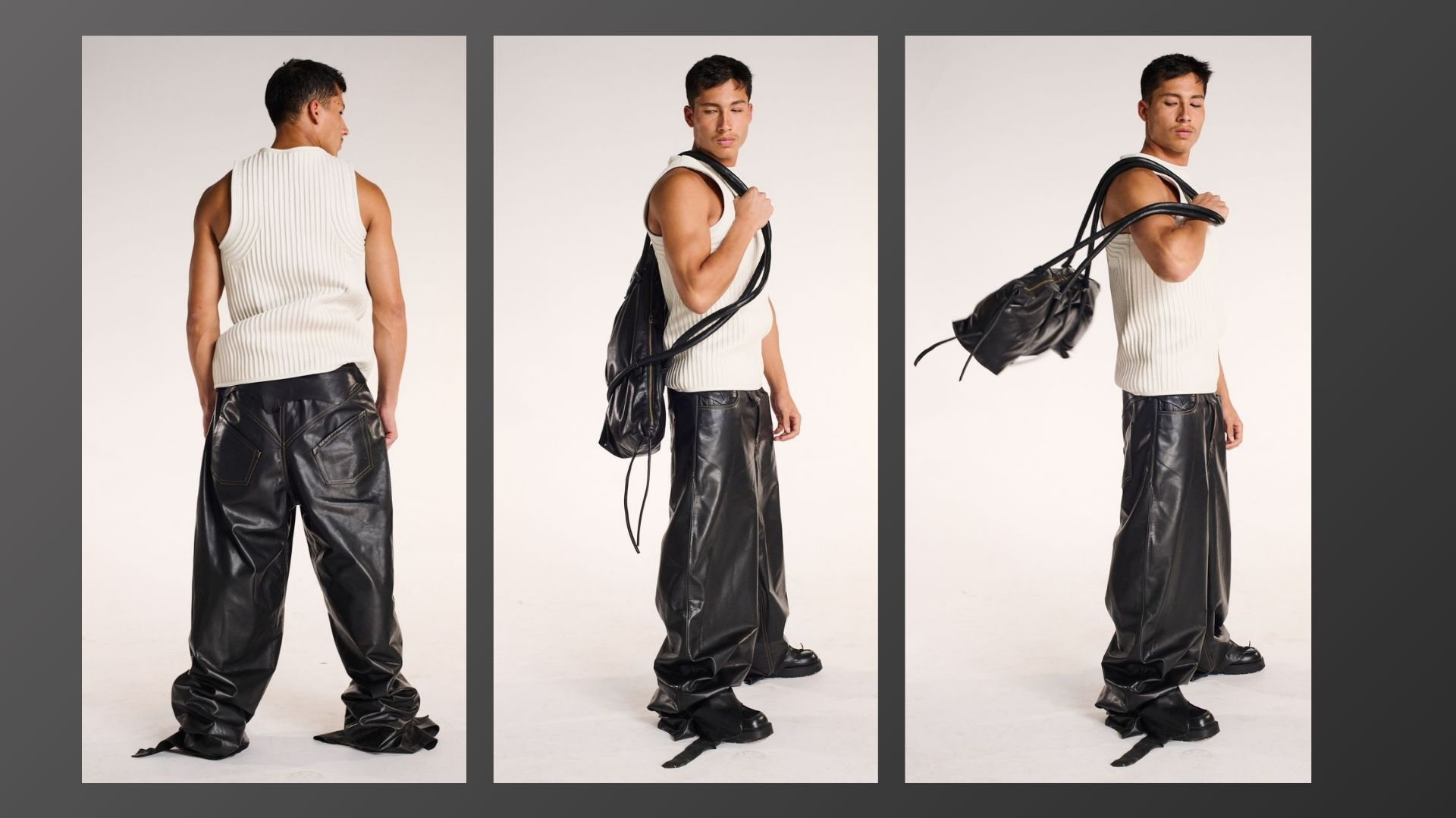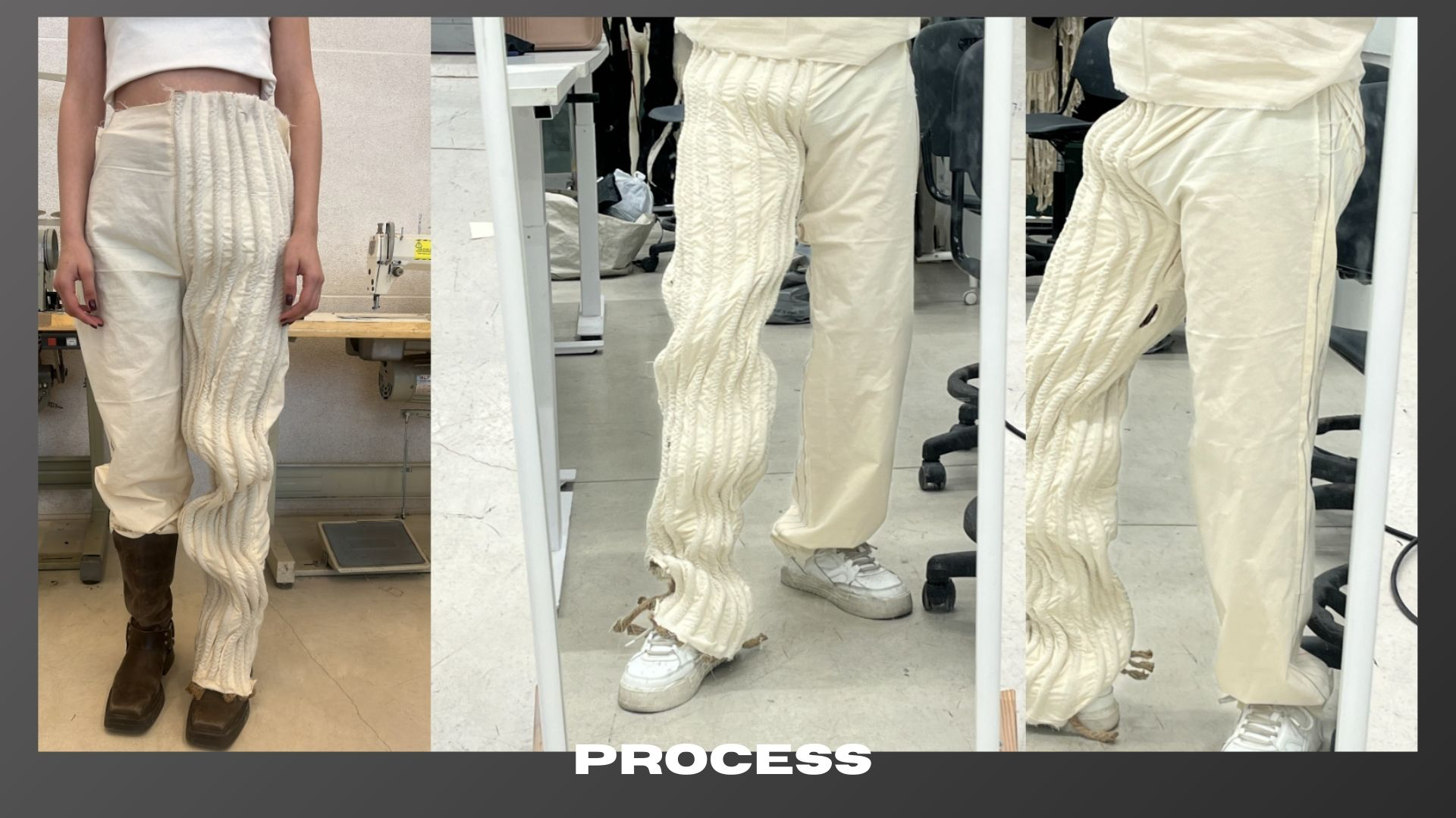 This collection explores the tension between the ego’s desire to protect, control, and impress, and the contrasting emotions of vulnerability, tenderness, and a deep yearning for love — all while seeking a renewed sense of inner harmony. The garments are designed with elements that resemble armor, evoking a modern-day warrior aesthetic. Leather was chosen as the primary material for its strength and adaptability, serving both as a durable fabric and a symbolic shield — much like skin, which safeguards the body’s fragility. The designs range from structured, tailored silhouettes that emphasize the body’s shape to looser, more fluid forms that incorporate supportive elements. A zigzag stitch is used as a functional technique for connecting multiple seams. The black-and-white palette reflects the interplay of opposing emotional forces. Ultimately, the look aims to project confidence — even in moments of inner doubt.