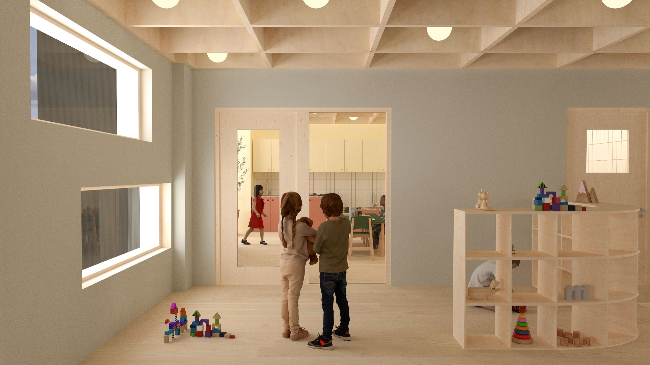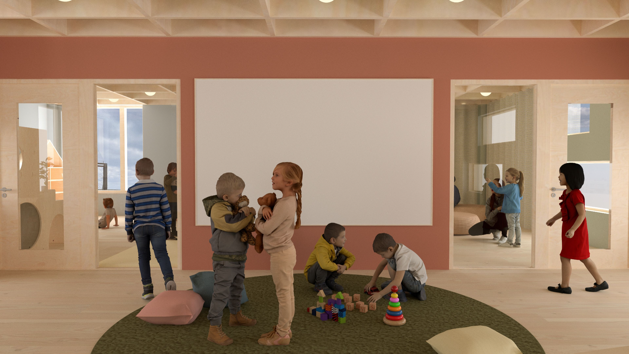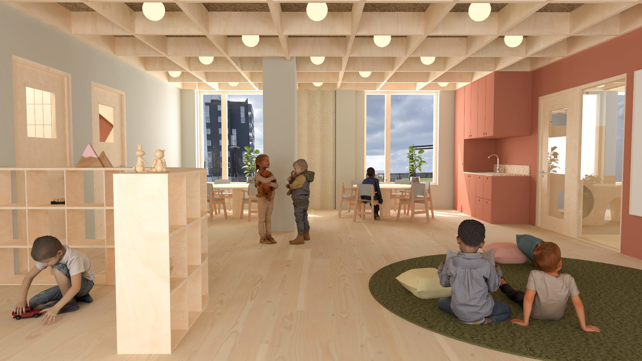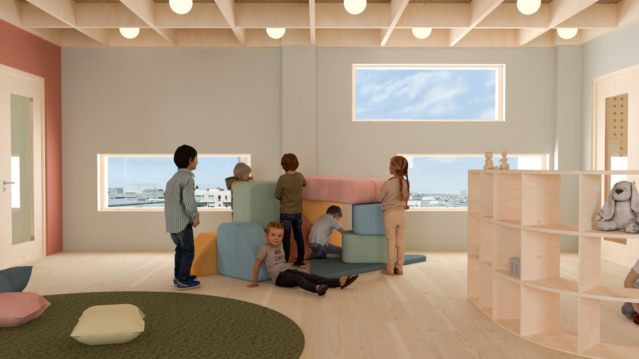 5-åringen i rummet (The 5-year old in the room) explores how the interior of a preschool environment can be designed to support cognitive, physical and emotional development of a five year old. The work is based on principles of neuro-architecture that focuses on how architecture and design influence the brain, focusing on the formative years. Through site visits, observation, and a workshop with the children in the preschool, data was collected to understand how the environment of the pre-school is perceived and experienced by its young users. The work resulted in a proposal for a renovation of the interior at the preschool unit Vågen, at Tärnans förskola, located in Malmo, Sweden. The design proposal, communicated mainly through renders, is developed using AutoCad, Rhinoceros and later V-ray. The results highlight the importance of including the child’s perspective in the design, showing how elements such as color, spatial layout, lighting and design can contribute to a feeling of safety, playfulness and cognitive stimulation and development. The project emphasizes implementing neuro-architectural studies in order to create child-friendly environments. It is also critical to how we often design pre-schools today and the adult norms dominating environments intended for children.