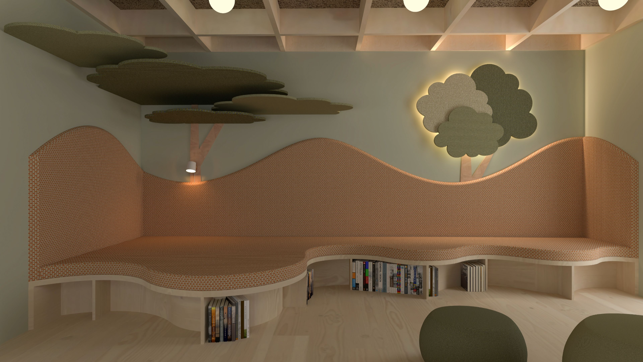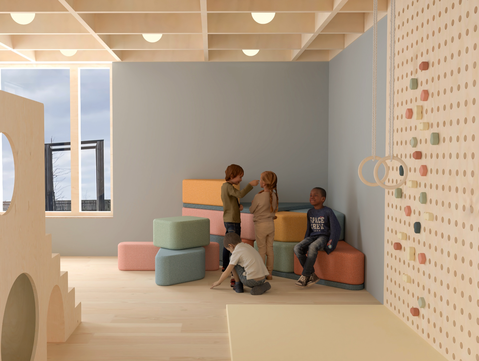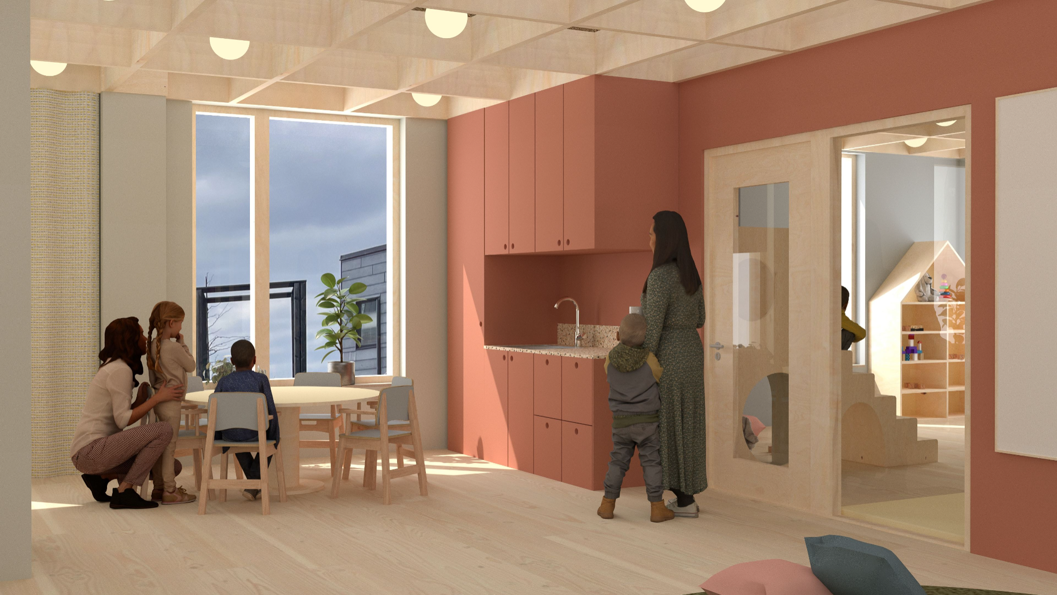 5-åringen i rummet (The 5-year old in the room) explores how the interior of a preschool environment can be designed to support cognitive, physical and emotional development of a five year old. The work is based on principles of neuro-architecture that focuses on how architecture and design influence the brain, focusing on the formative years. Through site visits, observation, and a workshop with the children in the preschool, data was collected to understand how the environment of the pre-school is perceived and experienced by its young users. The work resulted in a proposal for a renovation of the interior at the preschool unit Vågen, at Tärnans förskola, located in Malmo, Sweden. The design proposal, communicated mainly through renders, is developed using AutoCad, Rhinoceros and later V-ray. The results highlight the importance of including the child’s perspective in the design, showing how elements such as color, spatial layout, lighting and design can contribute to a feeling of safety, playfulness and cognitive stimulation and development. The project emphasizes implementing neuro-architectural studies in order to create child-friendly environments. It is also critical to how we often design pre-schools today and the adult norms dominating environments intended for children.