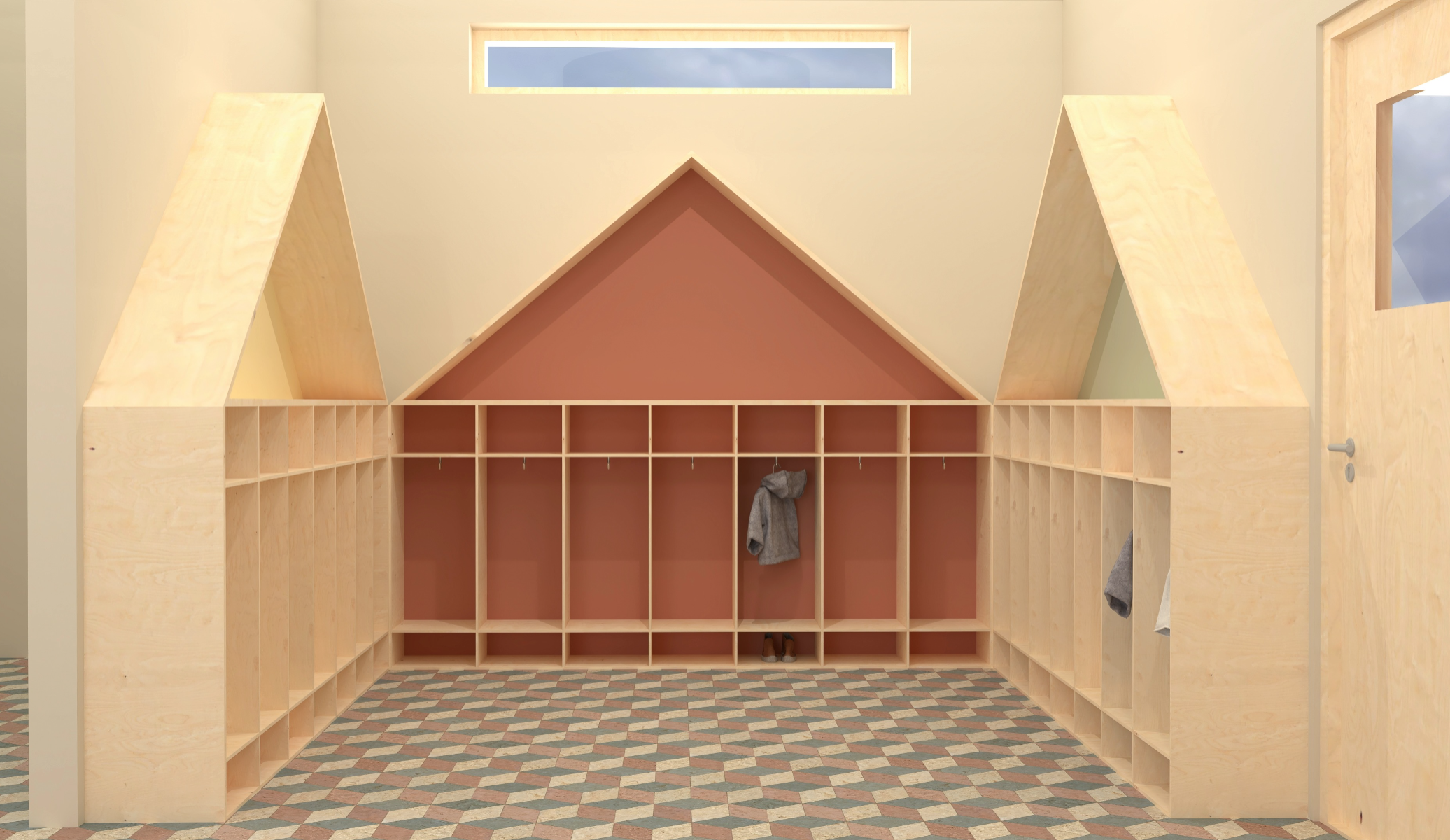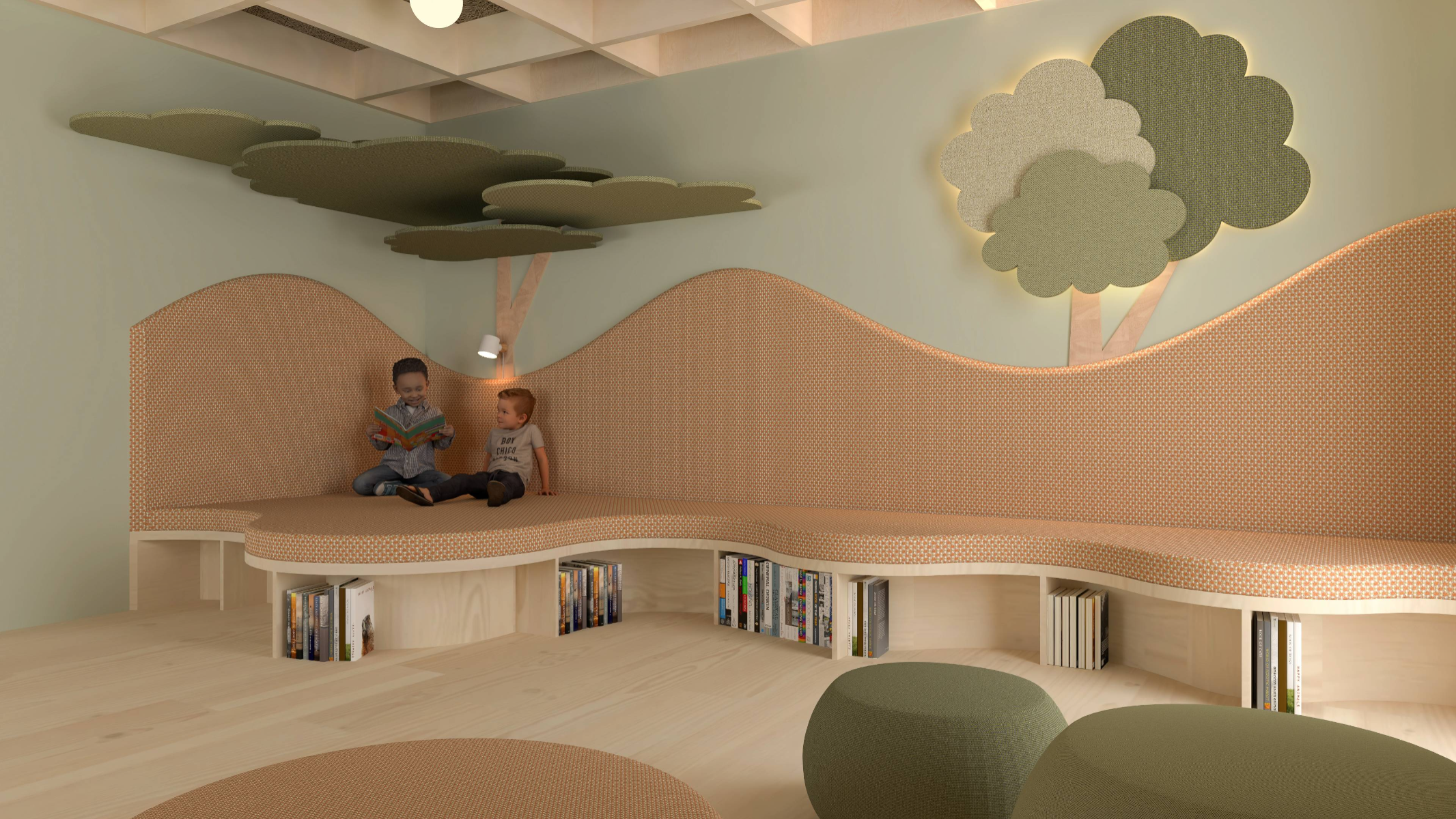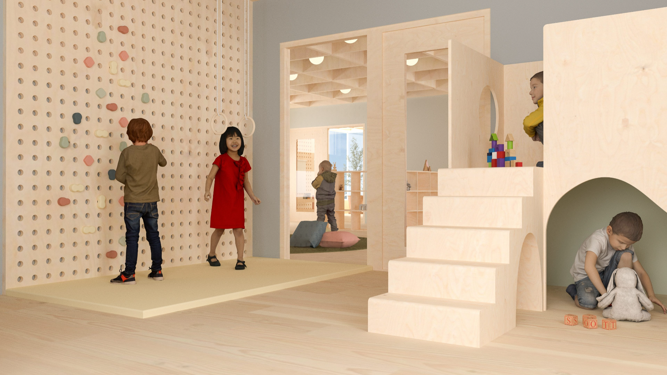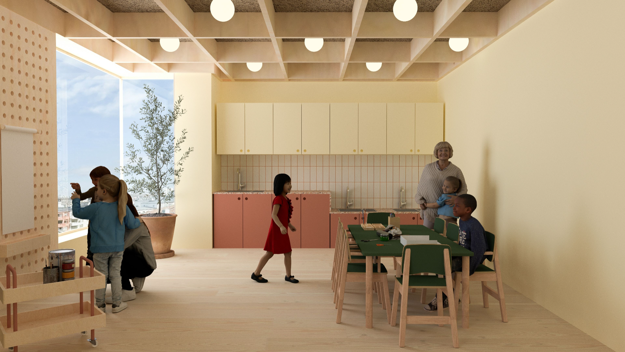 5-åringen i rummet (The 5-year old in the room) explores how the interior of a preschool environment can be designed to support cognitive, physical and emotional development of a five year old. The work is based on principles of neuro-architecture that focuses on how architecture and design influence the brain, focusing on the formative years. Through site visits, observation, and a workshop with the children in the preschool, data was collected to understand how the environment of the pre-school is perceived and experienced by its young users. The work resulted in a proposal for a renovation of the interior at the preschool unit Vågen, at Tärnans förskola, located in Malmo, Sweden. The design proposal, communicated mainly through renders, is developed using AutoCad, Rhinoceros and later V-ray. The results highlight the importance of including the child’s perspective in the design, showing how elements such as color, spatial layout, lighting and design can contribute to a feeling of safety, playfulness and cognitive stimulation and development. The project emphasizes implementing neuro-architectural studies in order to create child-friendly environments. It is also critical to how we often design pre-schools today and the adult norms dominating environments intended for children.