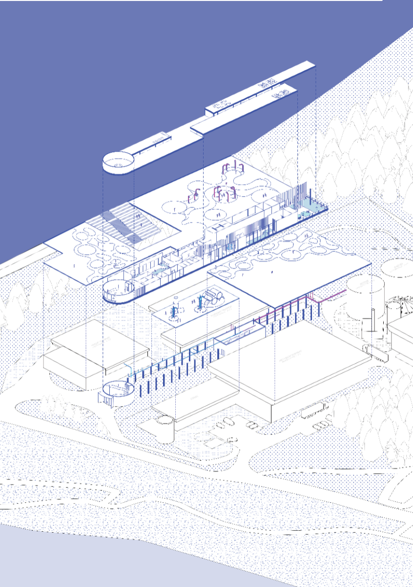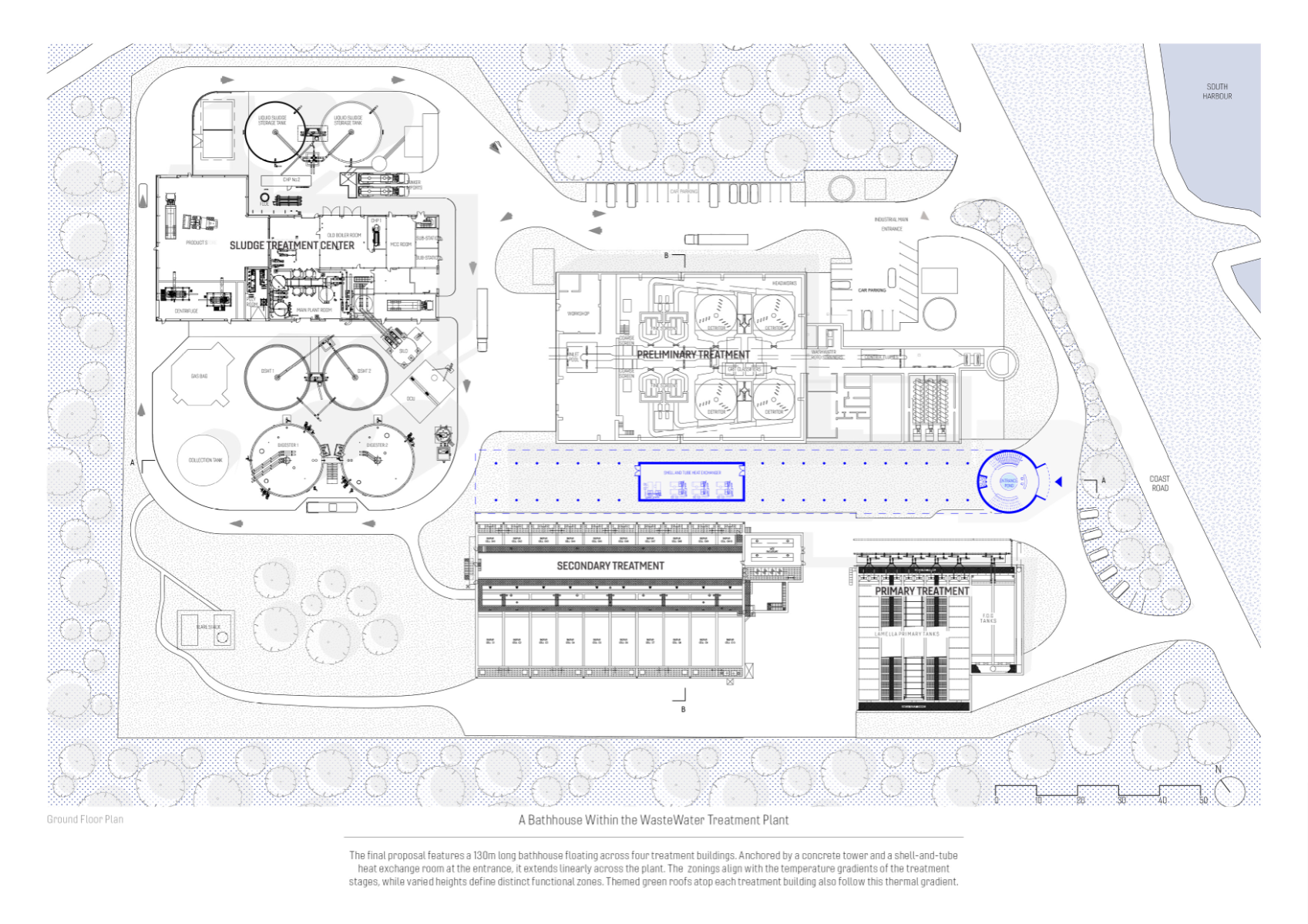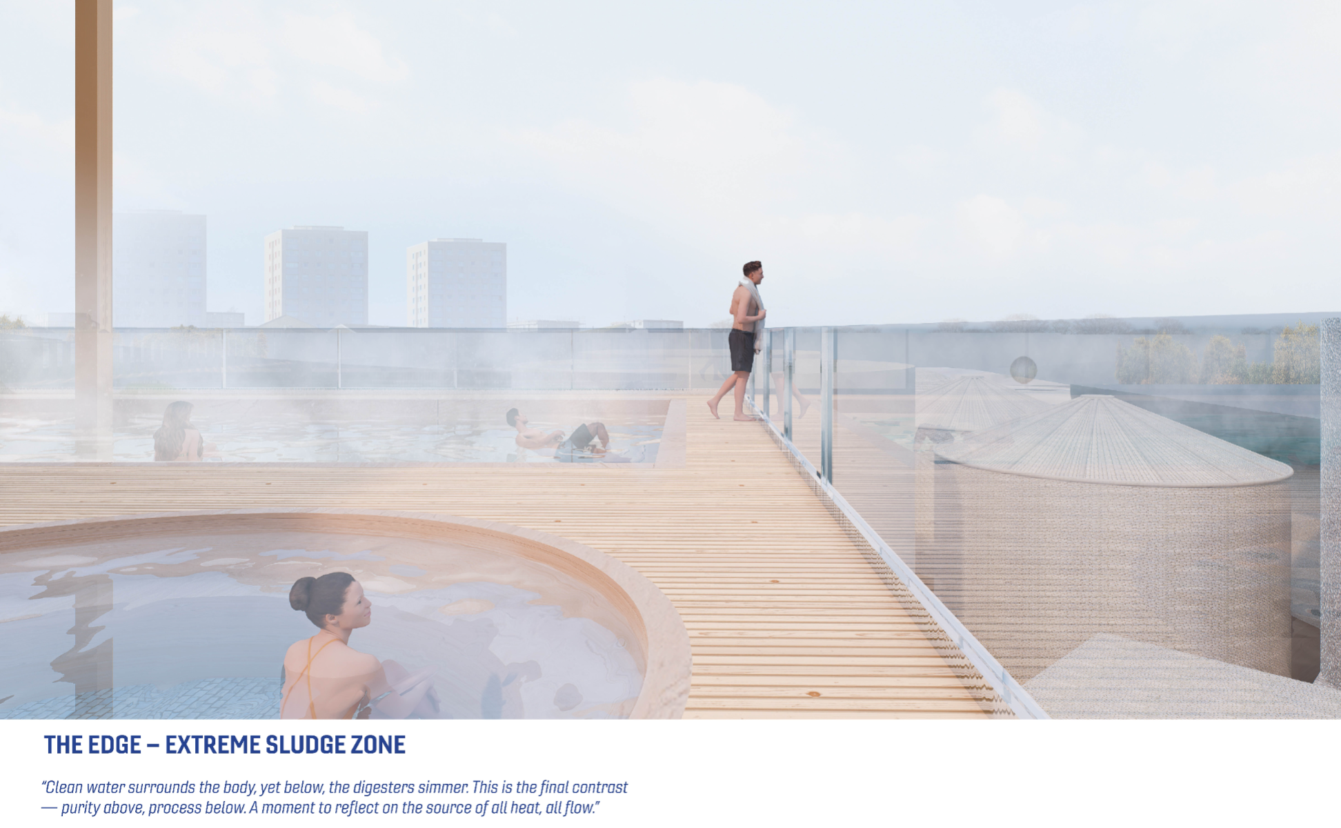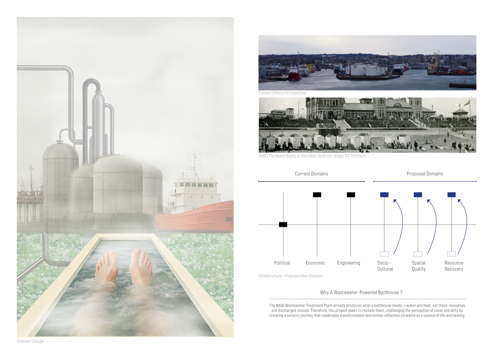 This project proposes the insertion of a new bathhouse into Aberdeen’s active wastewater treatment plant, re imagining industrial infrastructure as a regenerative system that gives back to the city. It utilizes the treated effluent water and recovers the waste heat from the plant, both typically discharged unused into the North Sea, and repurposes them as resources to power a civic leisure space and irrigate surrounding landscape and green roofs. Elevated above the working plant, the linear bathhouse bridges across the different wastewater treatment stages. The spatial sequence of pools from hot baths, steam rooms, warm pools, and cold plunges, corresponds to the temperature zones of the treatment process below, from the neutral primary treatment to the heat-intensive sludge digestion areas. Waste becomes wellness—The bathhouse becomes a public interface with hidden infrastructure: revealing, softening, and celebrating the unseen systems that sustain us. It is not merely an object inserted into the site, but an architectural bridge that links infrastructure with public life. A space that transforms taboo into resource and process into public life.