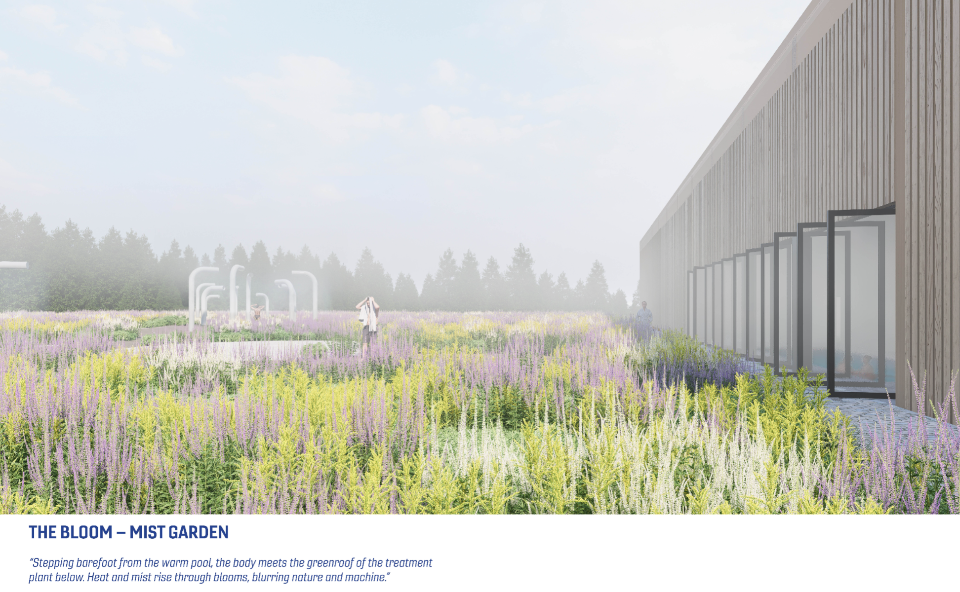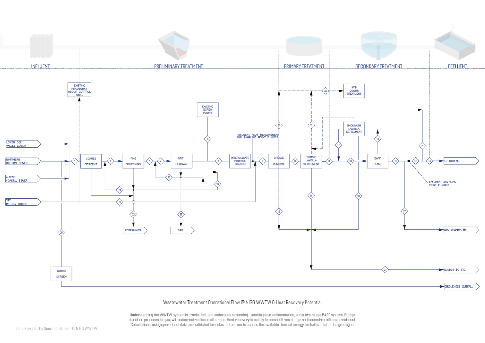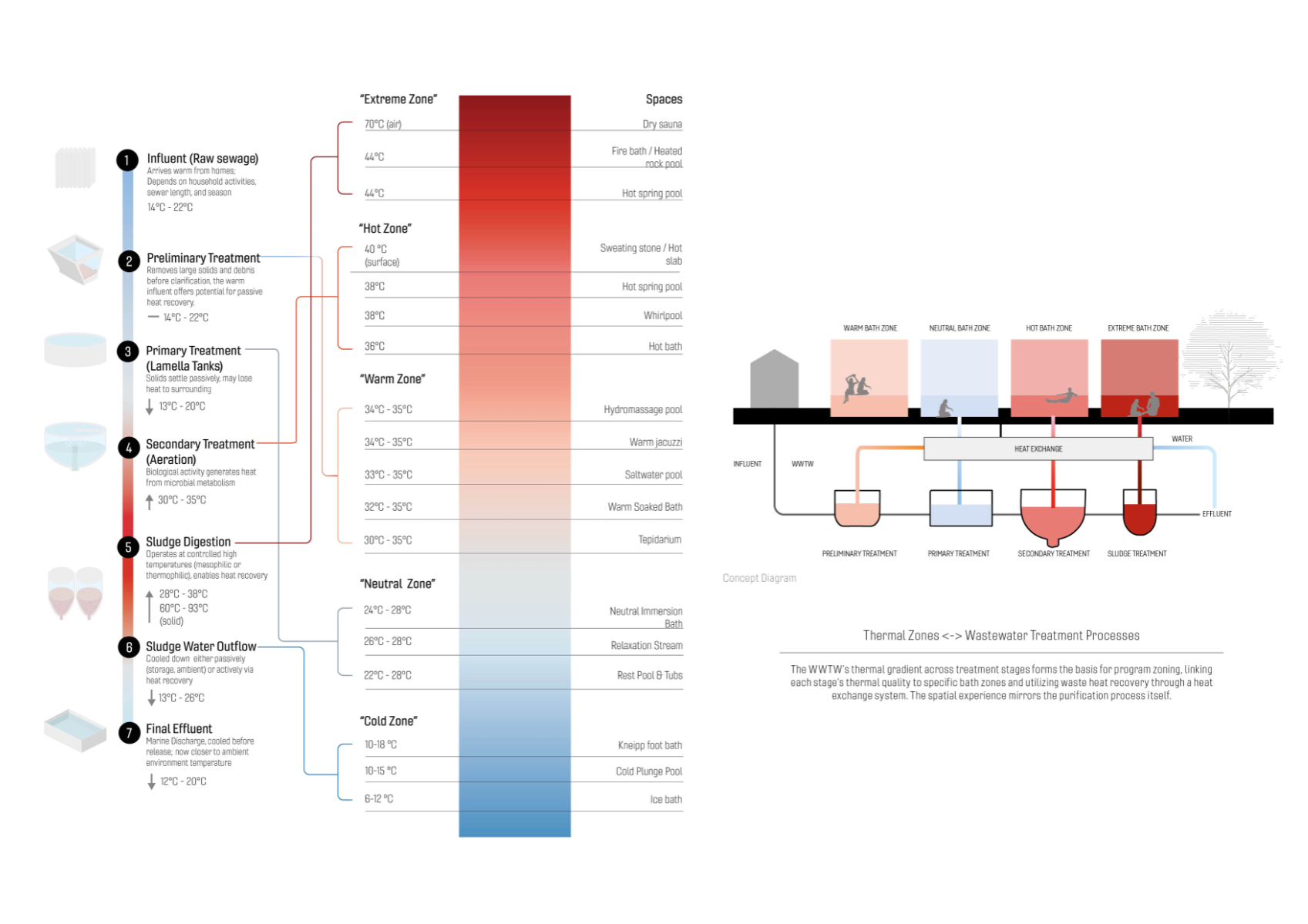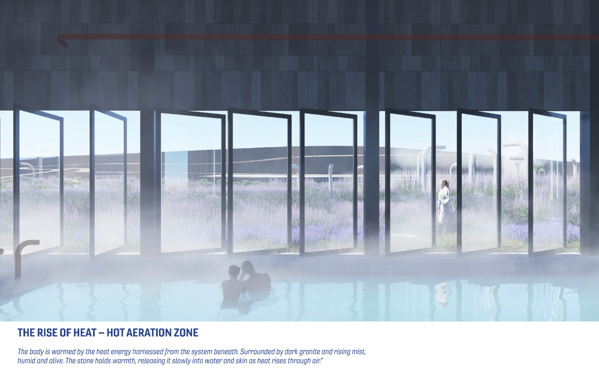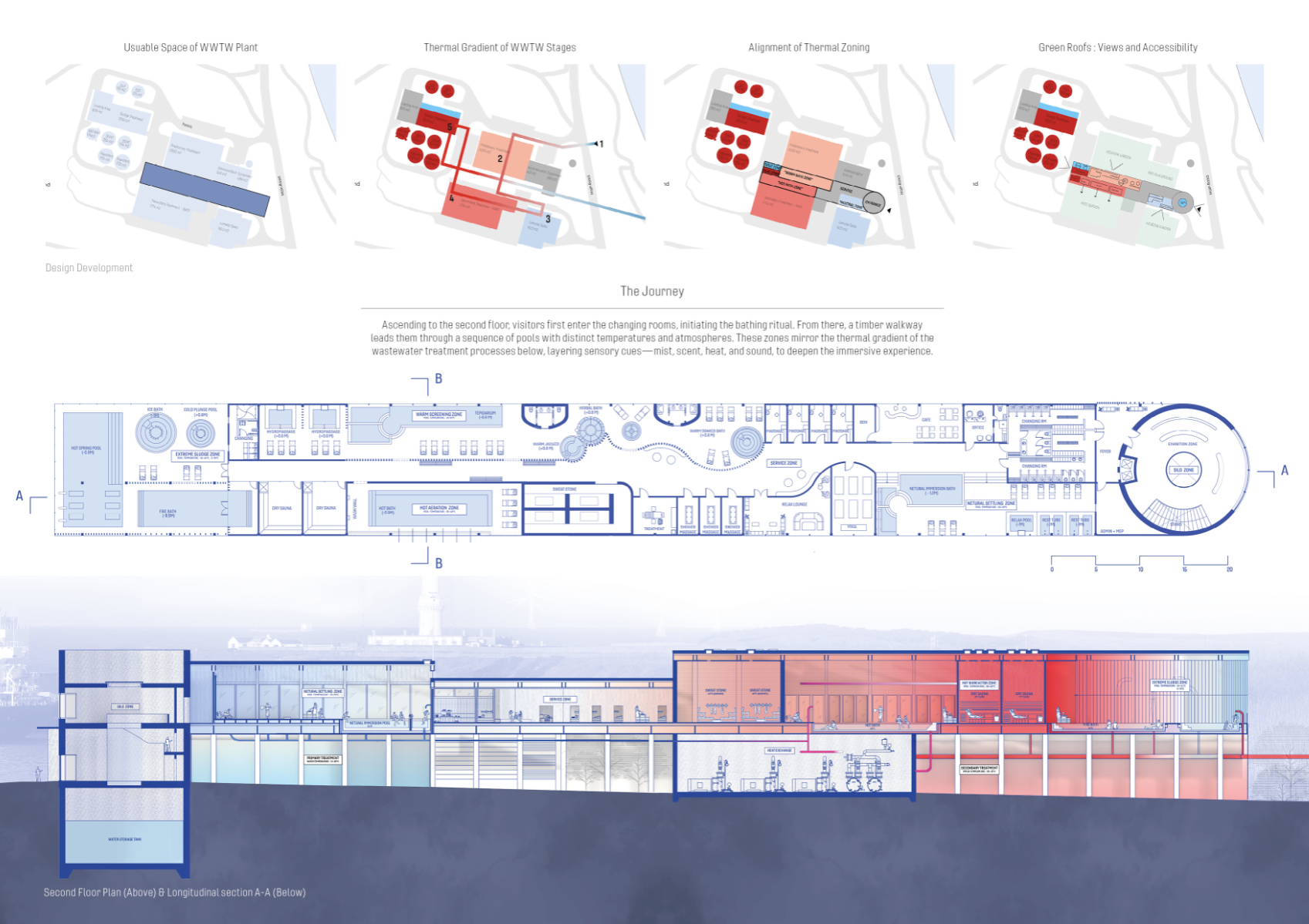 This project proposes the insertion of a new bathhouse into Aberdeen’s active wastewater treatment plant, re imagining industrial infrastructure as a regenerative system that gives back to the city. It utilizes the treated effluent water and recovers the waste heat from the plant, both typically discharged unused into the North Sea, and repurposes them as resources to power a civic leisure space and irrigate surrounding landscape and green roofs. Elevated above the working plant, the linear bathhouse bridges across the different wastewater treatment stages. The spatial sequence of pools from hot baths, steam rooms, warm pools, and cold plunges, corresponds to the temperature zones of the treatment process below, from the neutral primary treatment to the heat-intensive sludge digestion areas. Waste becomes wellness—The bathhouse becomes a public interface with hidden infrastructure: revealing, softening, and celebrating the unseen systems that sustain us. It is not merely an object inserted into the site, but an architectural bridge that links infrastructure with public life. A space that transforms taboo into resource and process into public life.