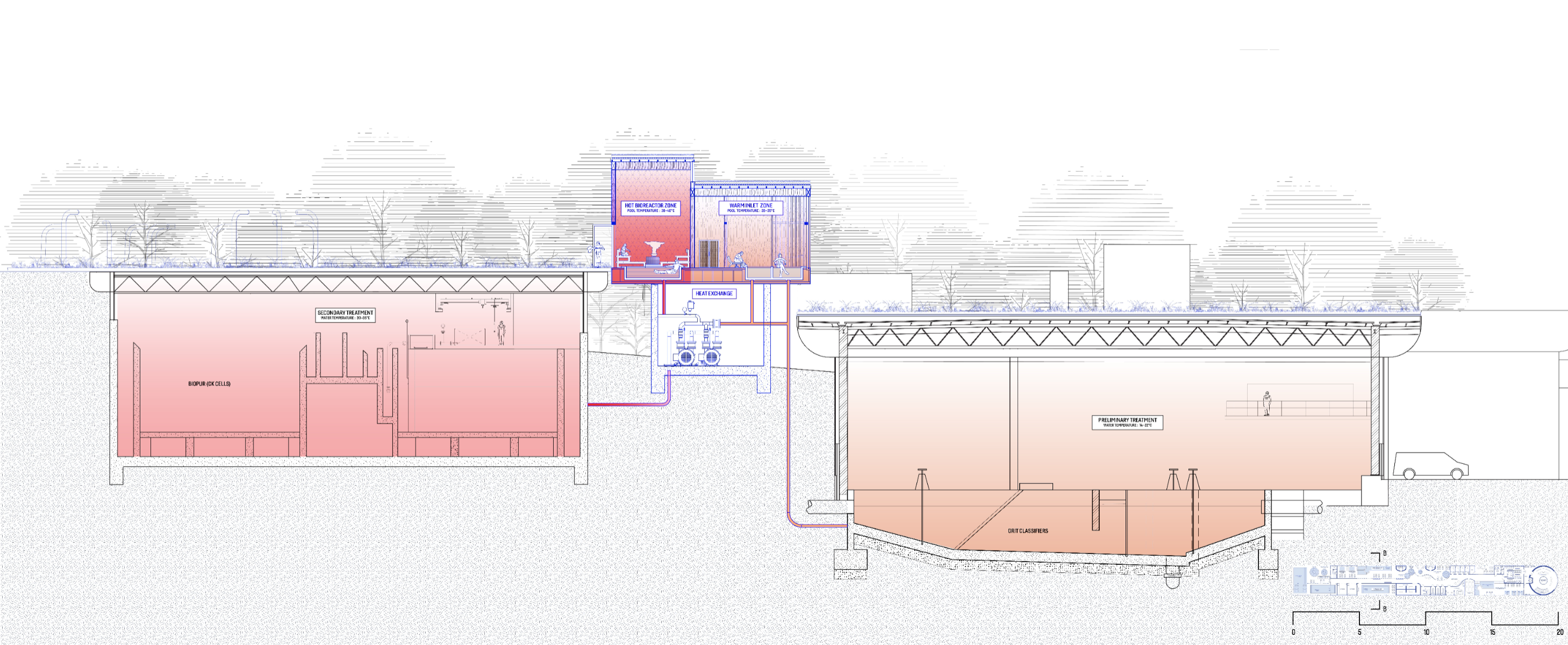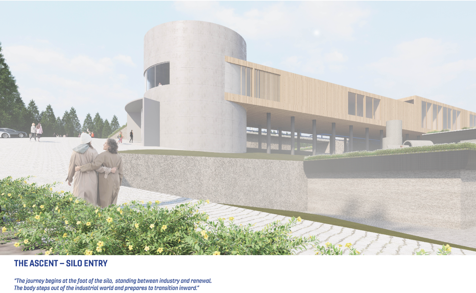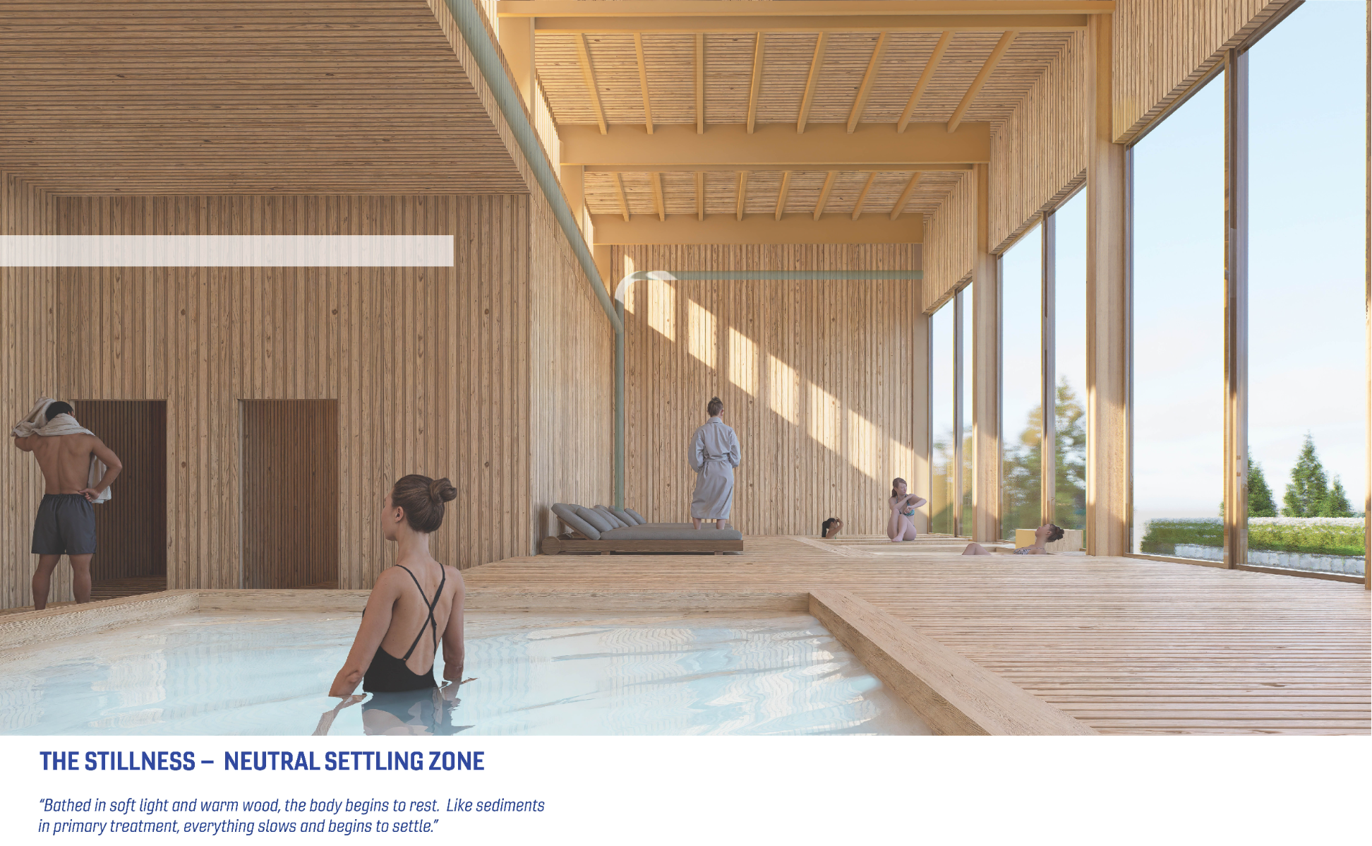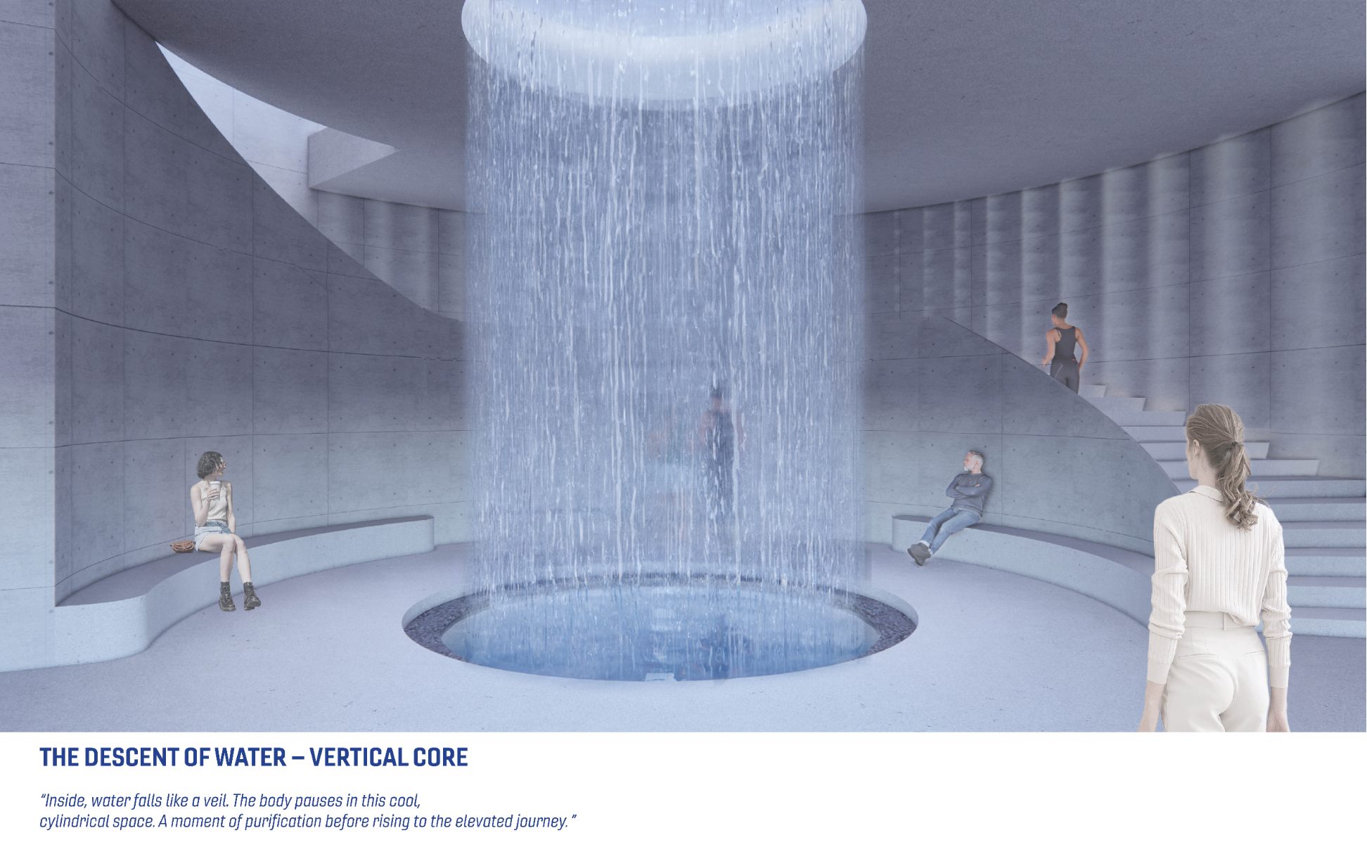 This project proposes the insertion of a new bathhouse into Aberdeen’s active wastewater treatment plant, re imagining industrial infrastructure as a regenerative system that gives back to the city. It utilizes the treated effluent water and recovers the waste heat from the plant, both typically discharged unused into the North Sea, and repurposes them as resources to power a civic leisure space and irrigate surrounding landscape and green roofs. Elevated above the working plant, the linear bathhouse bridges across the different wastewater treatment stages. The spatial sequence of pools from hot baths, steam rooms, warm pools, and cold plunges, corresponds to the temperature zones of the treatment process below, from the neutral primary treatment to the heat-intensive sludge digestion areas. Waste becomes wellness—The bathhouse becomes a public interface with hidden infrastructure: revealing, softening, and celebrating the unseen systems that sustain us. It is not merely an object inserted into the site, but an architectural bridge that links infrastructure with public life. A space that transforms taboo into resource and process into public life.