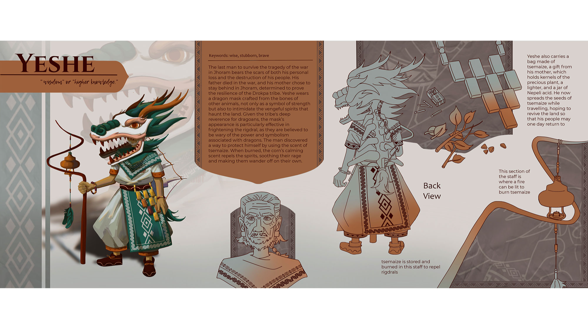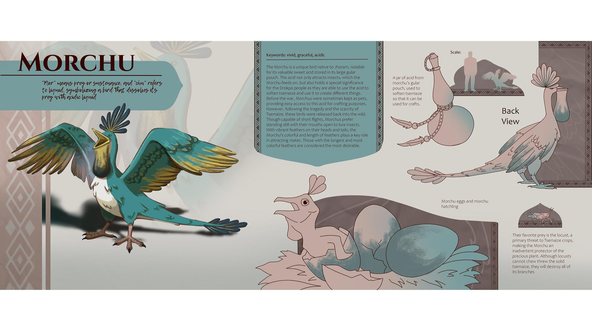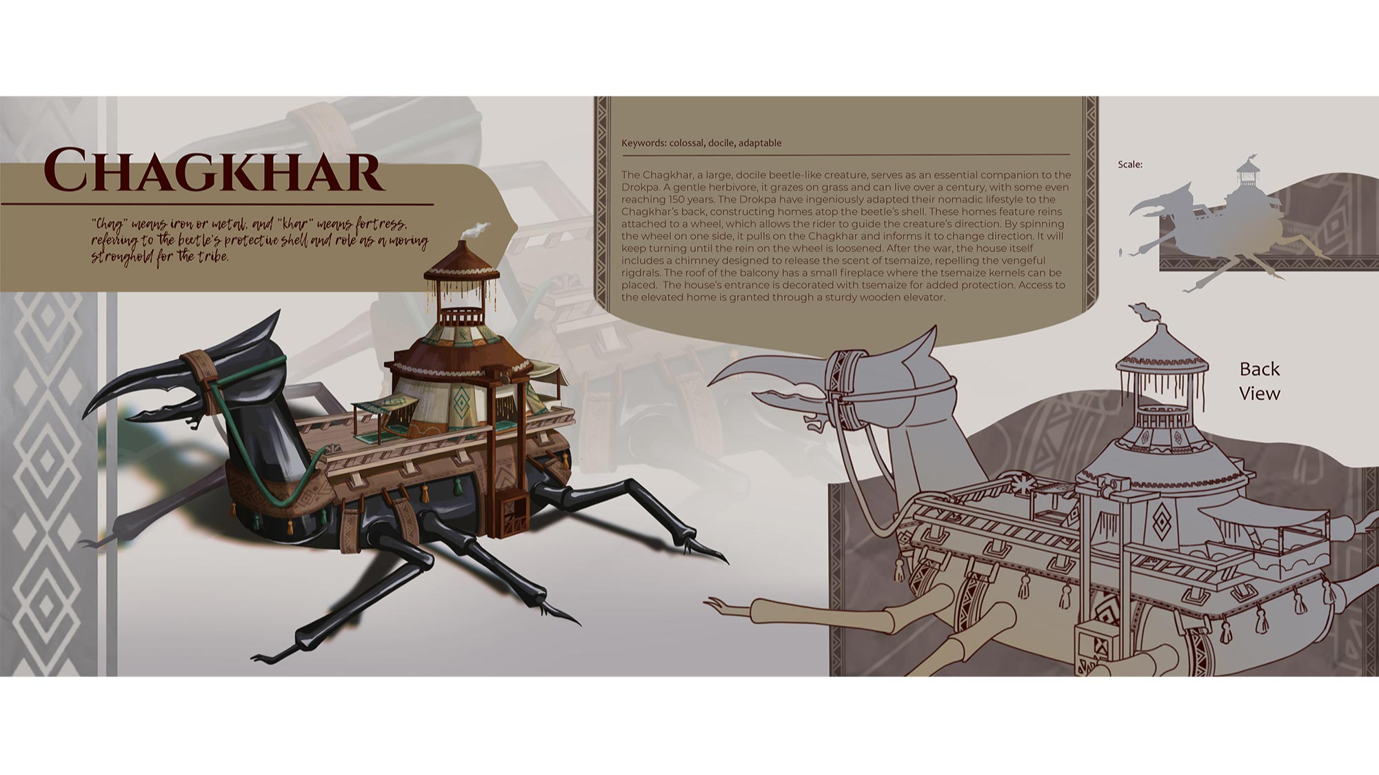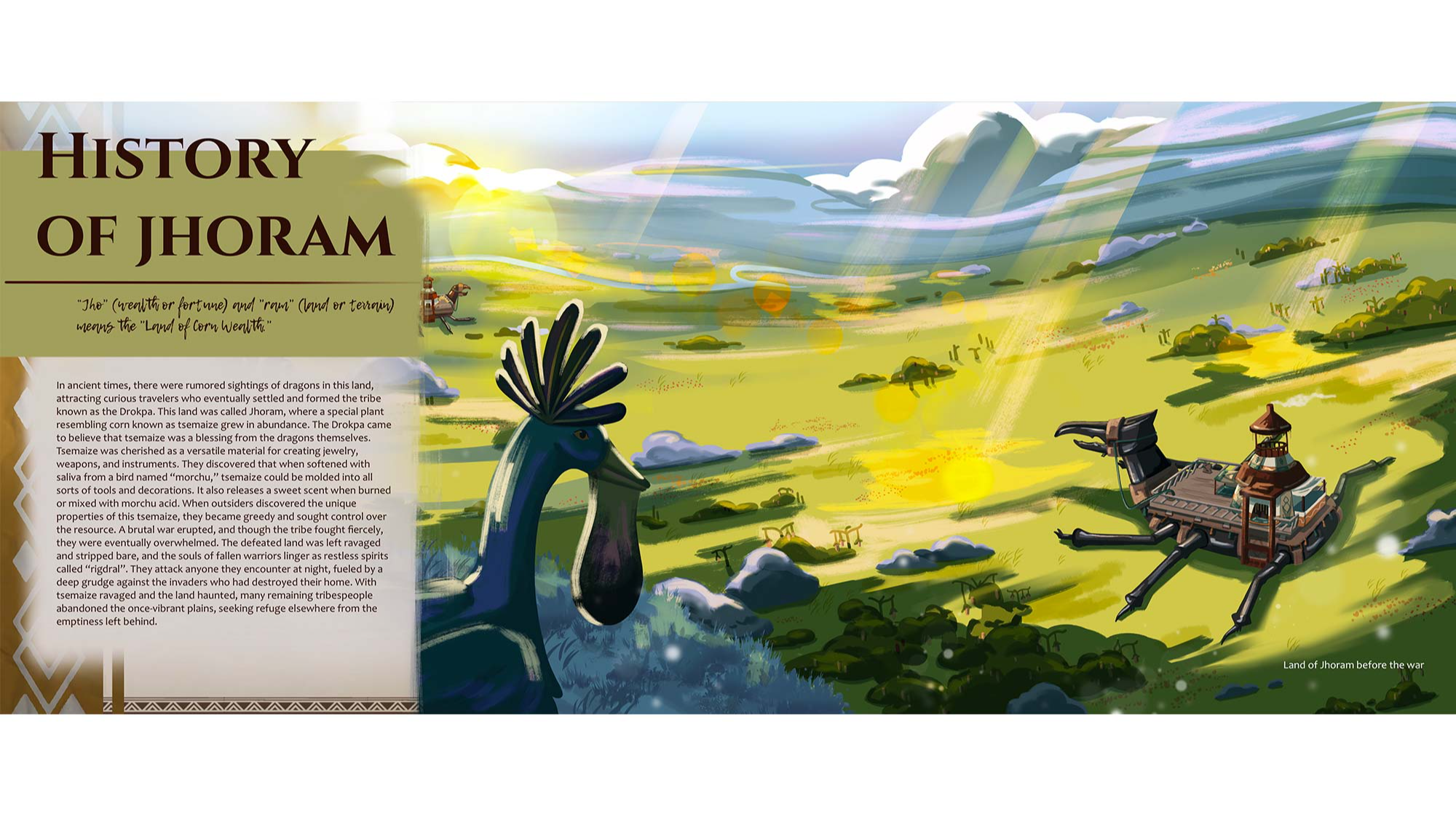 Jhoram was a fertile flatland in Asia where the Drokpa tribe thrived, cultivating a dragon-blessed plant called tsemaize, which they used for food, tools, and art. When outsiders discovered its unique properties, a war broke out over the resource, ultimately leaving the land devastated and the Drokpa defeated. The souls of fallen warriors became vengeful spirits known as rigdral, haunting the land at night. With tsemaize nearly extinct and their homeland cursed, most of the surviving Drokpa fled in search of safety. Tsemaize: Tsemaize is a corn-like plant native to Jhoram, now scarce and once vibrant with many colors lost to war. The Drokpa cherish ancient crafts made from it as symbols of their heritage. Mixed with morchu acid, tsemaize forms a clay that hardens like metal, with rarer colors creating the toughest items. Yeshe: Yeshe carries the scars of his family’s loss and his tribe’s destruction. He wears a dragon mask made from animal bones to frighten rigdrals, spirits that fear the dragon’s presence. To protect himself further, he burns tsemaize in a special section of his staff, using its calming scent to repel the spirits. He also carries a tsemaize bag from his mother. Chagkhar: The Chagkhar is a large, gentle, beetle-like creature vital to the Drokpa, living over a century and grazing peacefully on grass. The Drokpa build homes on its back, guiding it with reins connected to a wheel. These mobile houses use chimneys and balcony fireplaces to burn tsemaize, whose scent wards off rigdrals, while entrances are adorned with tsemaize for extra protection. A sturdy wooden elevator provides access to these elevated, moving dwellings. Morchu: The Morchu is a unique bird native to Jhoram, known for its valuable sweet acid stored in its large gular pouch. This acid attracts insects like locusts—which threaten Tsemaize crops—and helps the Drokpa soften tsemaize for crafting. Once kept as pets for easy access to the acid, Morchus were released into the wild after the war. With vibrant feathers used to attract mates, Morchus play an important role as natural protectors of Tsemaize. Rigdral: The Rigdral are vengeful spirits of warriors who died defending Jhoram and its precious Tsemaize, now blinded by rage and attacking indiscriminately after dark—even their own kin. Their armor, forged from Tsemaize, varies by rank, with generals wearing rare, vibrant types. The calming scent of Tsemaize can soothe some Rigdral, allowing them to release their grudges and move on to a peaceful existence between the mortal and divine realms.