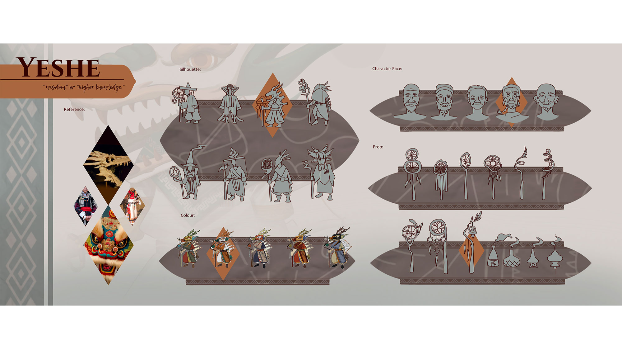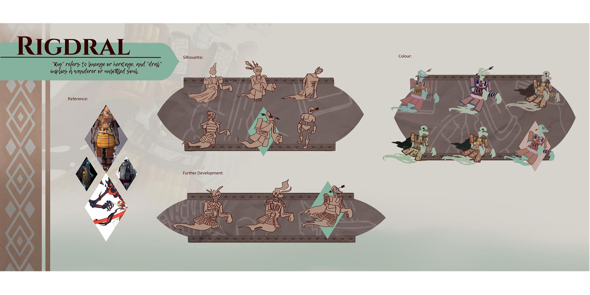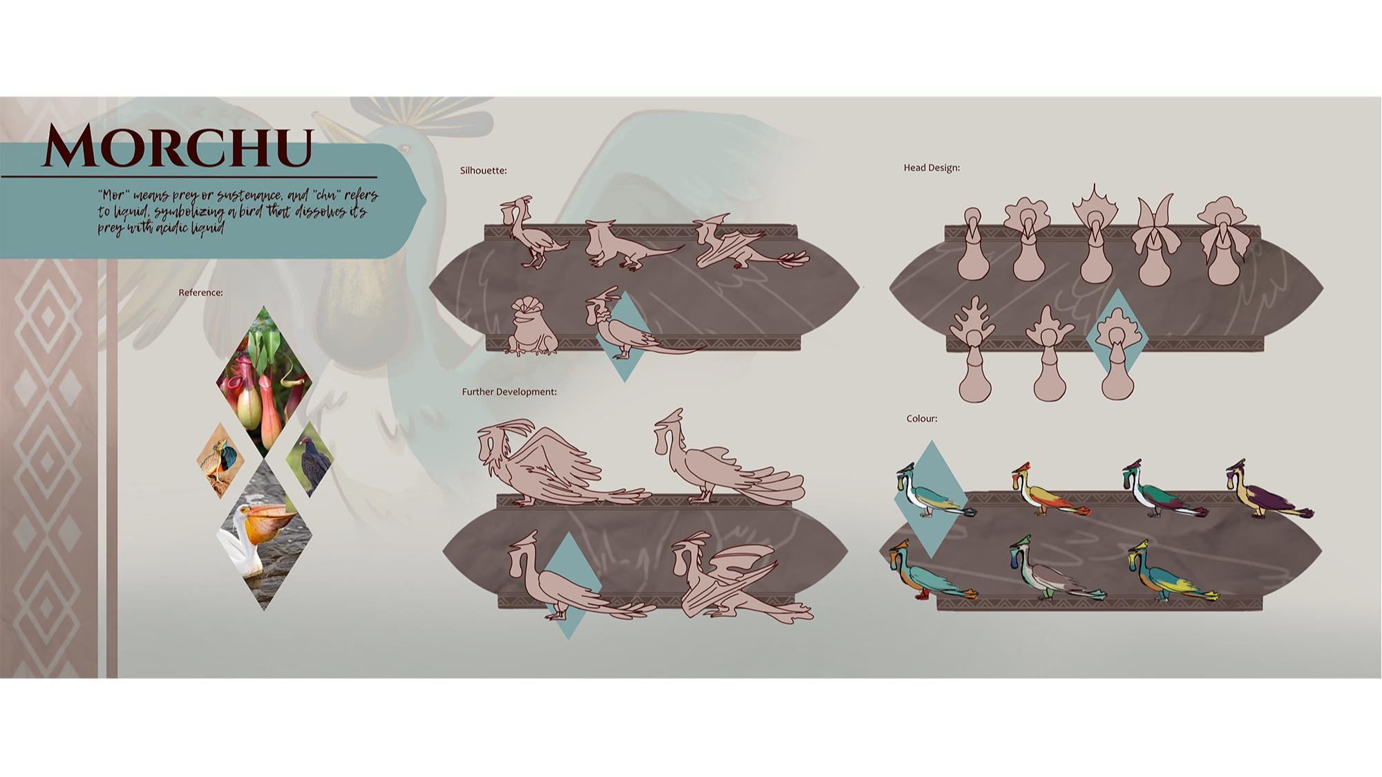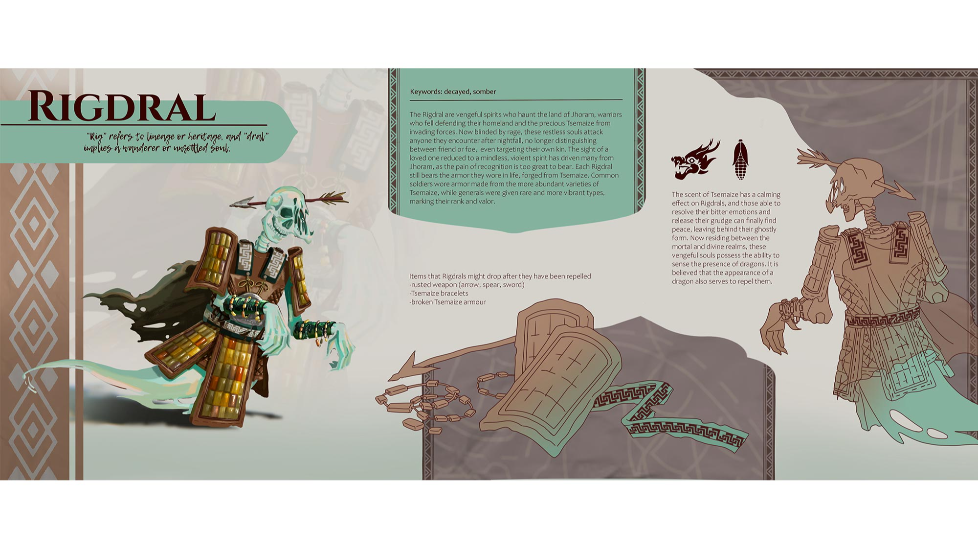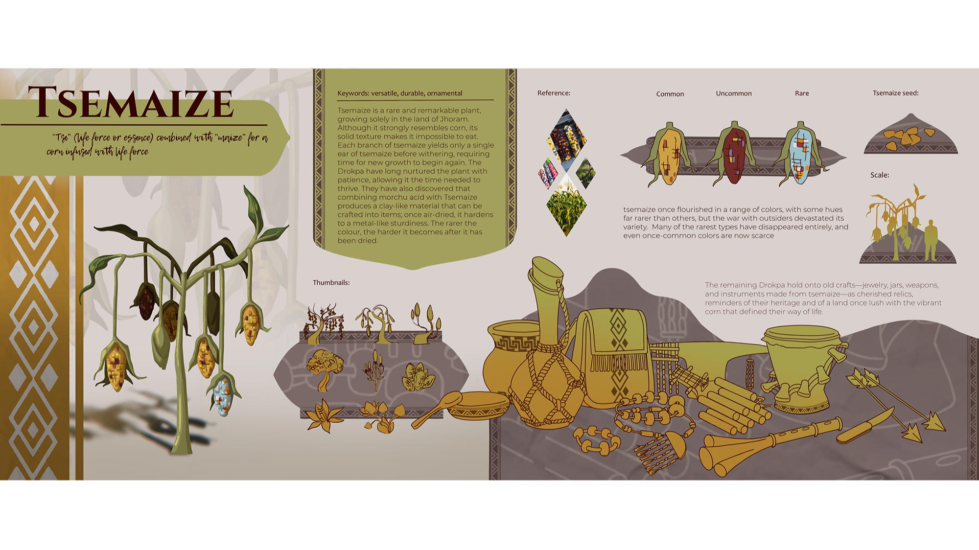 Jhoram was a fertile flatland in Asia where the Drokpa tribe thrived, cultivating a dragon-blessed plant called tsemaize, which they used for food, tools, and art. When outsiders discovered its unique properties, a war broke out over the resource, ultimately leaving the land devastated and the Drokpa defeated. The souls of fallen warriors became vengeful spirits known as rigdral, haunting the land at night. With tsemaize nearly extinct and their homeland cursed, most of the surviving Drokpa fled in search of safety. Tsemaize: Tsemaize is a corn-like plant native to Jhoram, now scarce and once vibrant with many colors lost to war. The Drokpa cherish ancient crafts made from it as symbols of their heritage. Mixed with morchu acid, tsemaize forms a clay that hardens like metal, with rarer colors creating the toughest items. Yeshe: Yeshe carries the scars of his family’s loss and his tribe’s destruction. He wears a dragon mask made from animal bones to frighten rigdrals, spirits that fear the dragon’s presence. To protect himself further, he burns tsemaize in a special section of his staff, using its calming scent to repel the spirits. He also carries a tsemaize bag from his mother. Chagkhar: The Chagkhar is a large, gentle, beetle-like creature vital to the Drokpa, living over a century and grazing peacefully on grass. The Drokpa build homes on its back, guiding it with reins connected to a wheel. These mobile houses use chimneys and balcony fireplaces to burn tsemaize, whose scent wards off rigdrals, while entrances are adorned with tsemaize for extra protection. A sturdy wooden elevator provides access to these elevated, moving dwellings. Morchu: The Morchu is a unique bird native to Jhoram, known for its valuable sweet acid stored in its large gular pouch. This acid attracts insects like locusts—which threaten Tsemaize crops—and helps the Drokpa soften tsemaize for crafting. Once kept as pets for easy access to the acid, Morchus were released into the wild after the war. With vibrant feathers used to attract mates, Morchus play an important role as natural protectors of Tsemaize. Rigdral: The Rigdral are vengeful spirits of warriors who died defending Jhoram and its precious Tsemaize, now blinded by rage and attacking indiscriminately after dark—even their own kin. Their armor, forged from Tsemaize, varies by rank, with generals wearing rare, vibrant types. The calming scent of Tsemaize can soothe some Rigdral, allowing them to release their grudges and move on to a peaceful existence between the mortal and divine realms.