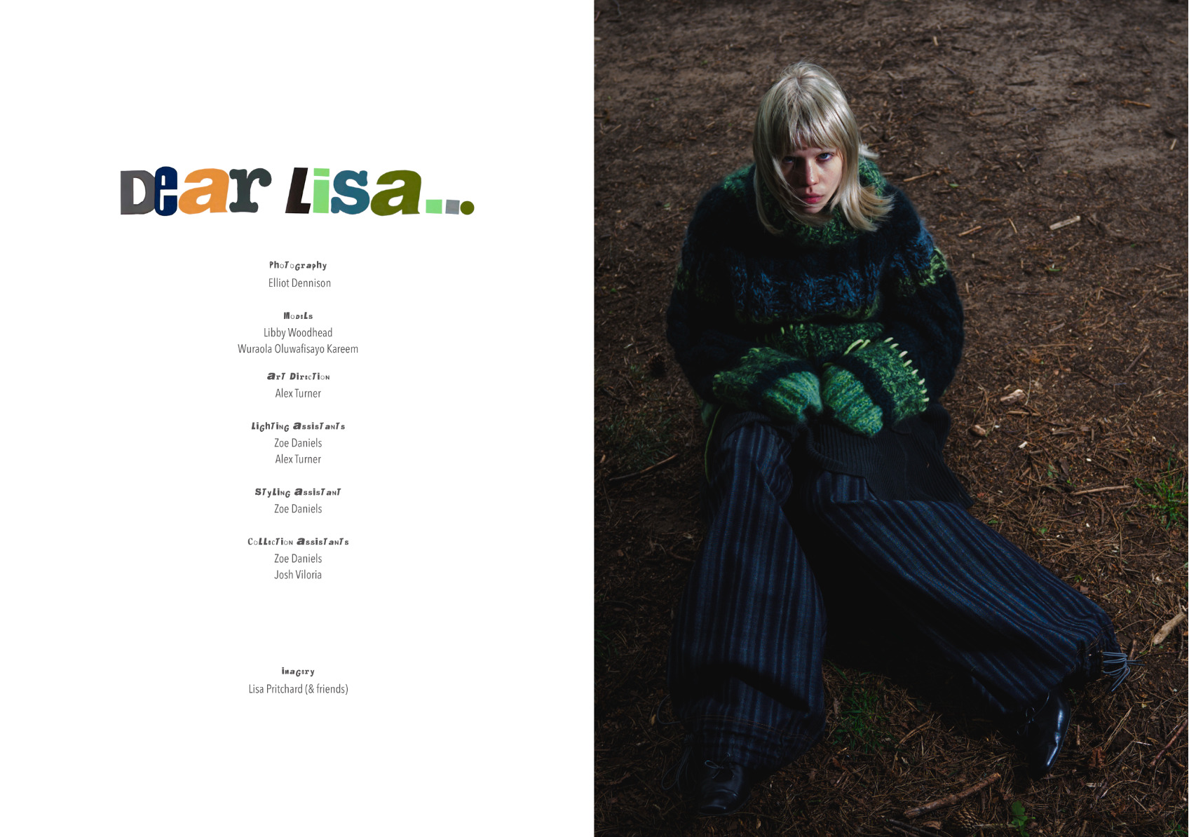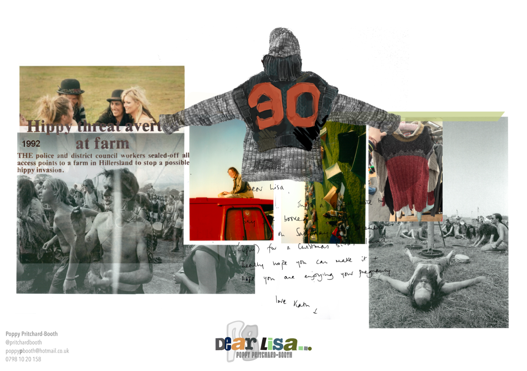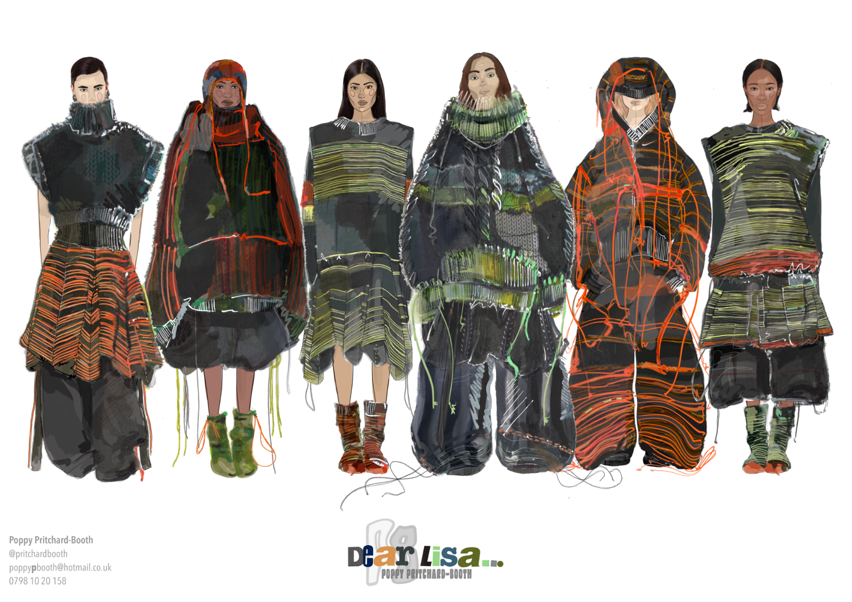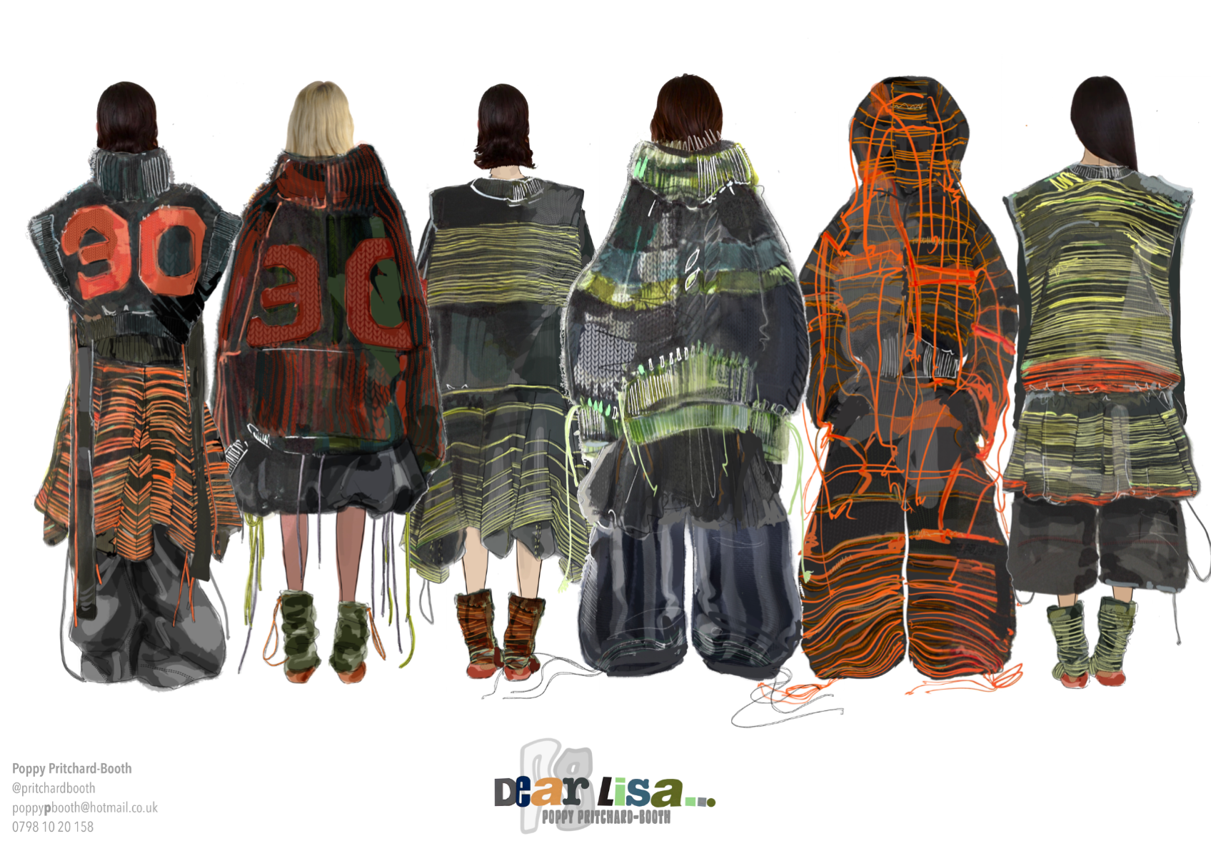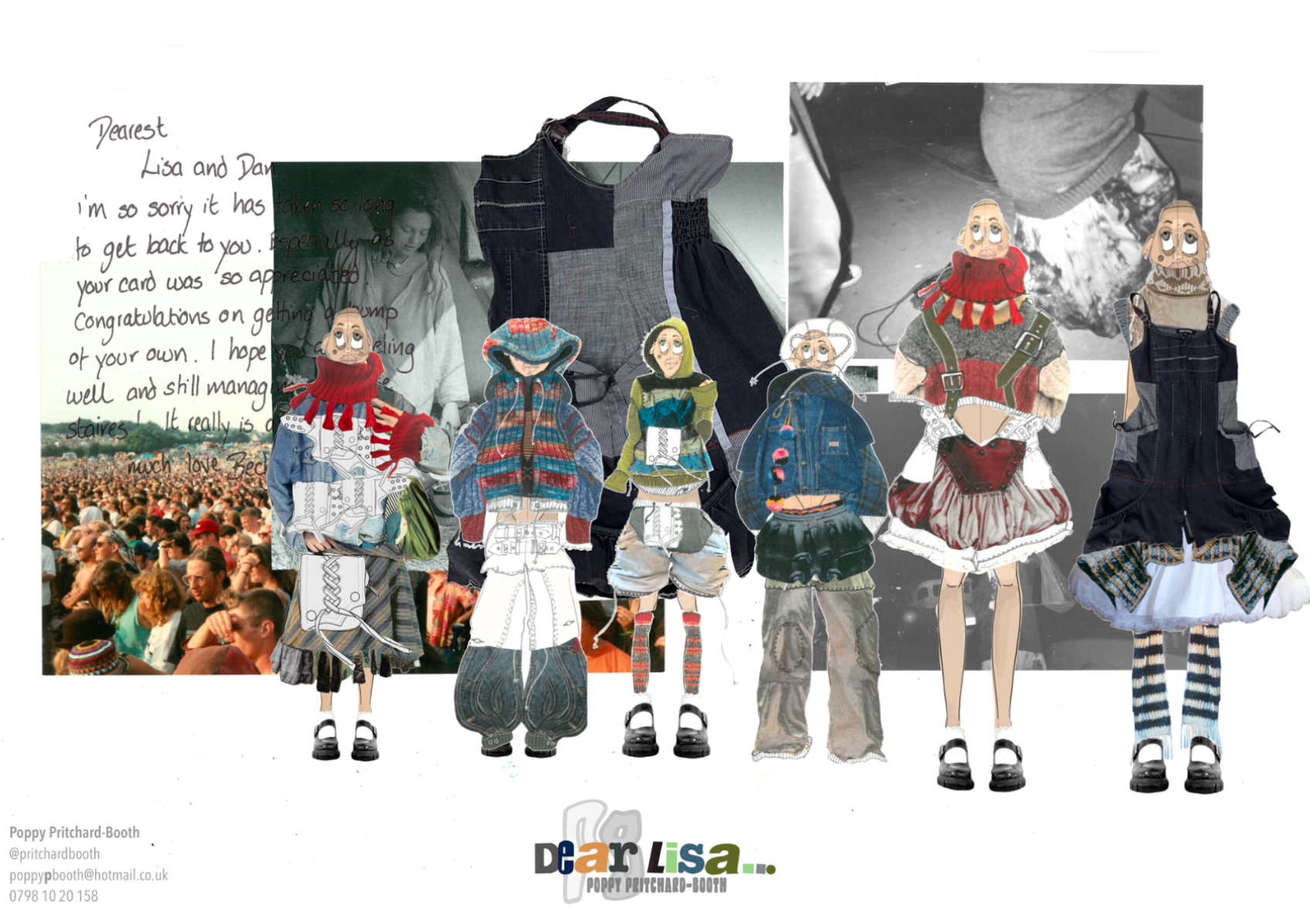 “Dear Lisa” draws on personal memory and the aesthetic of 90s and early 2000s New Age Travellers. Inspired by my mother's film photographs, keepsakes and the photography of Iain McKell and Wayne Jibbetts, the collection captures a raw, lived-in energy, layered clothing, firesides and festival moments. Earthy yet bold, the palette mixes multi-tonal, dirty but bold shades across oversized silhouettes and textured knits. Mohair contrasts with rounded matte yarns, paired with enlarged denims, creating pieces that feel worn-in, cherished and shaped by time rather than trend. A quiet tribute to my mother, “Dear Lisa” reflects her strength, her spirit and the world she passed on to me.