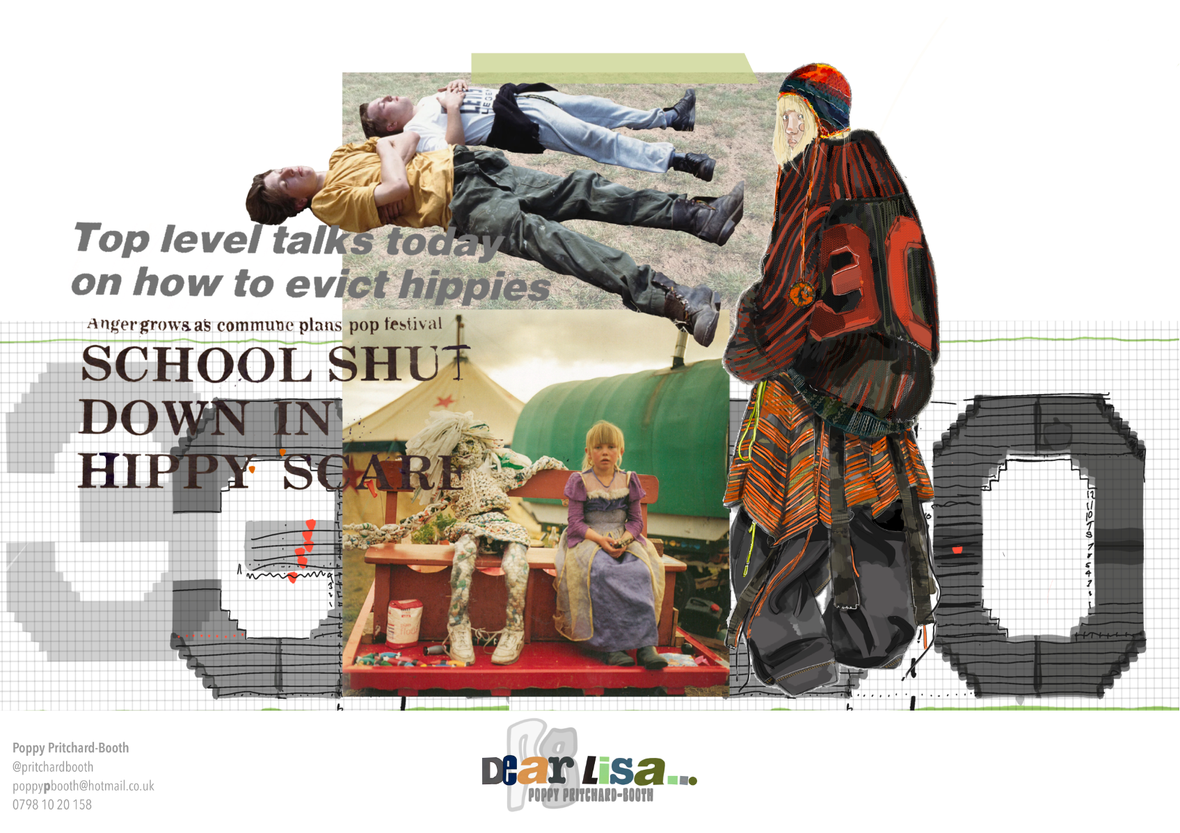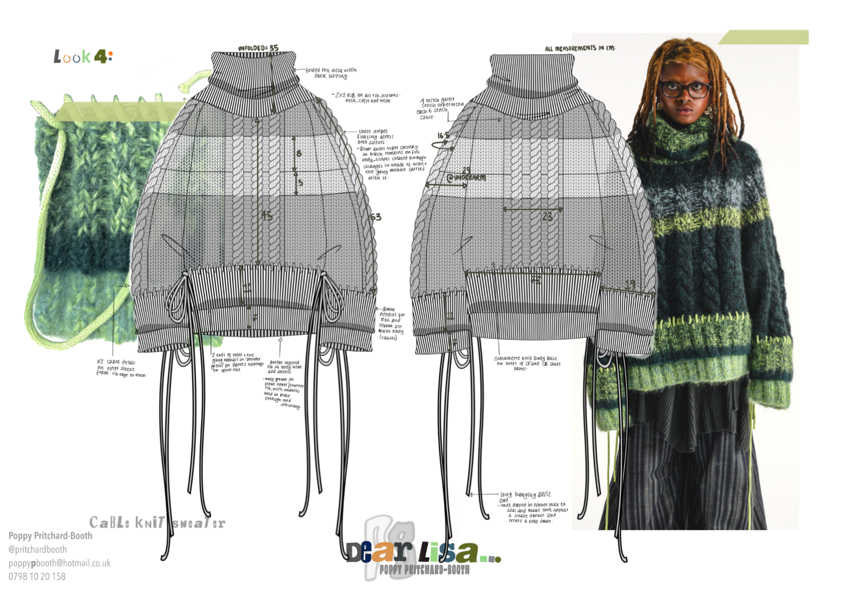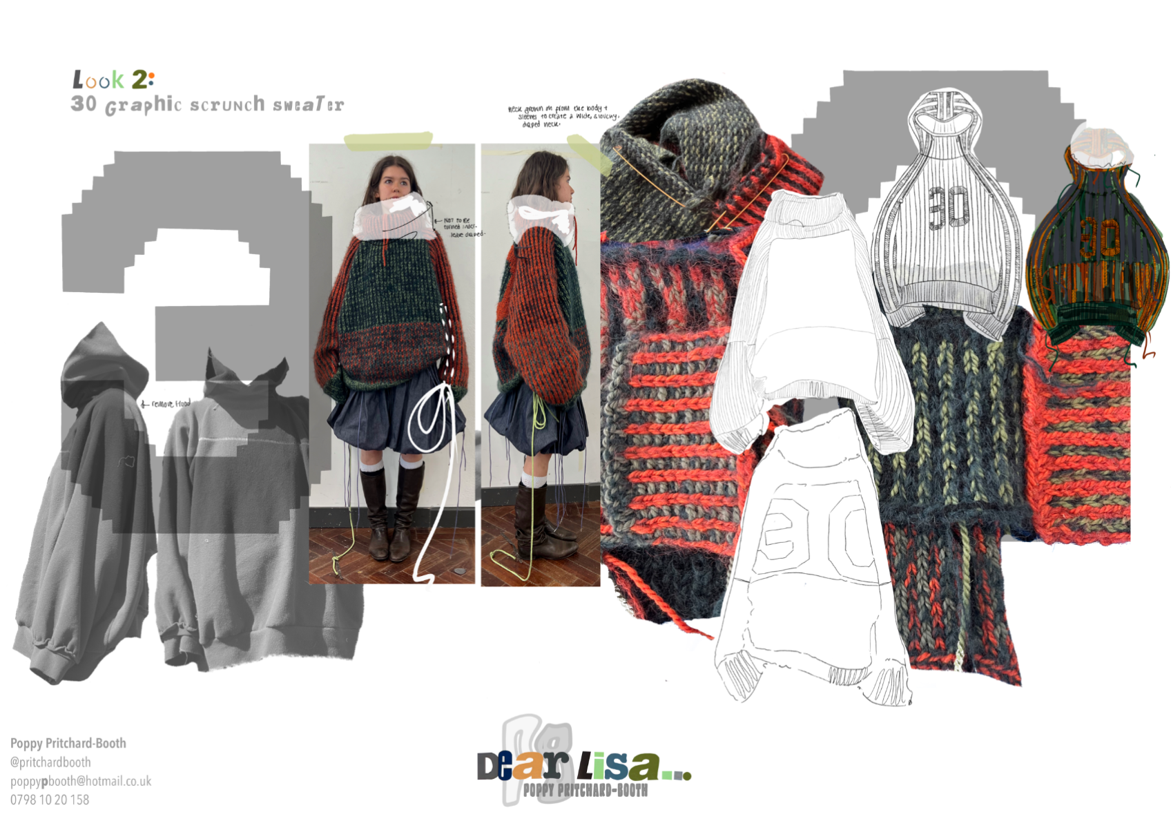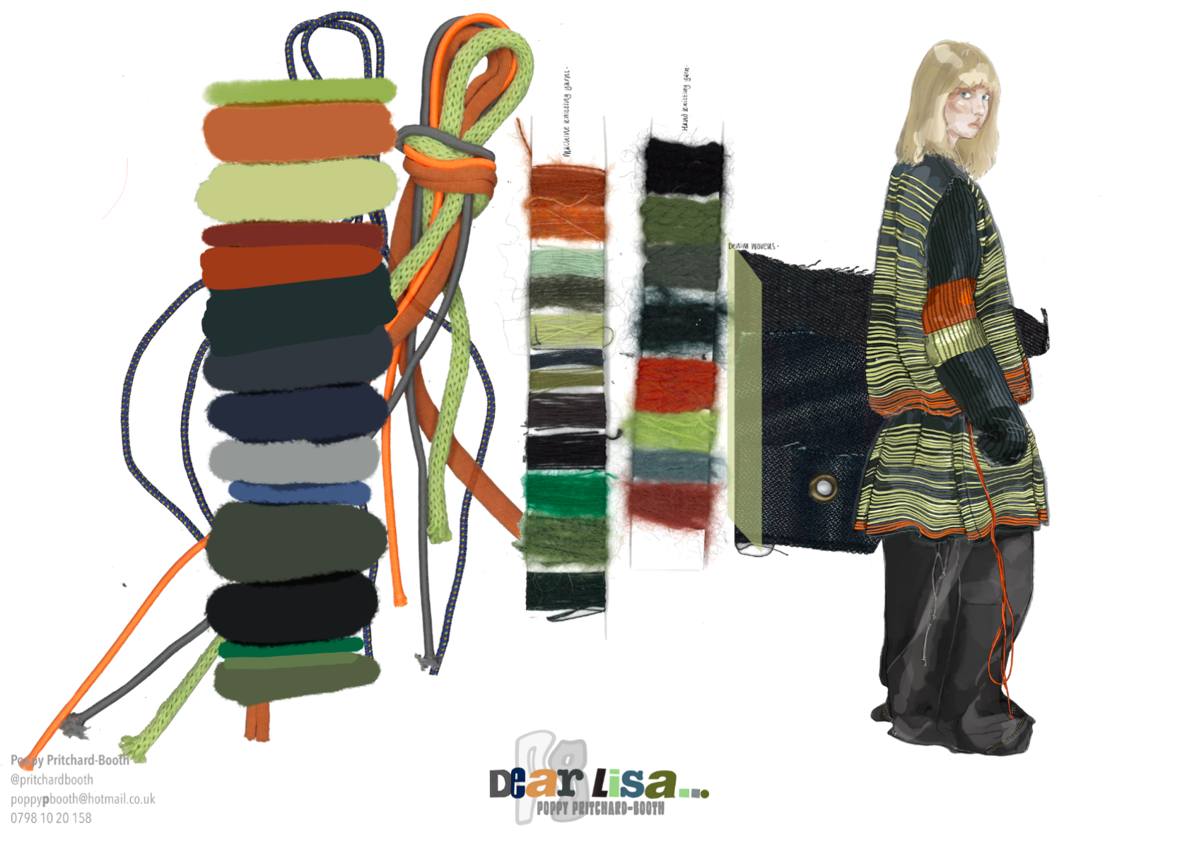 “Dear Lisa” draws on personal memory and the aesthetic of 90s and early 2000s New Age Travellers. Inspired by my mother's film photographs, keepsakes and the photography of Iain McKell and Wayne Jibbetts, the collection captures a raw, lived-in energy, layered clothing, firesides and festival moments. Earthy yet bold, the palette mixes multi-tonal, dirty but bold shades across oversized silhouettes and textured knits. Mohair contrasts with rounded matte yarns, paired with enlarged denims, creating pieces that feel worn-in, cherished and shaped by time rather than trend. A quiet tribute to my mother, “Dear Lisa” reflects her strength, her spirit and the world she passed on to me.