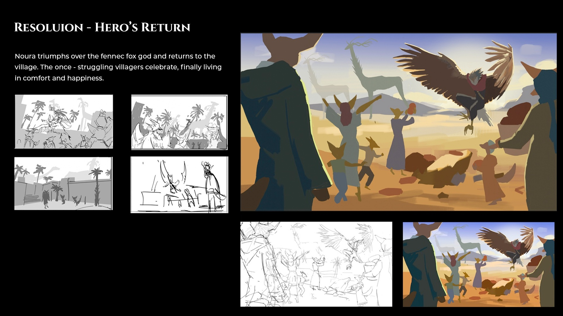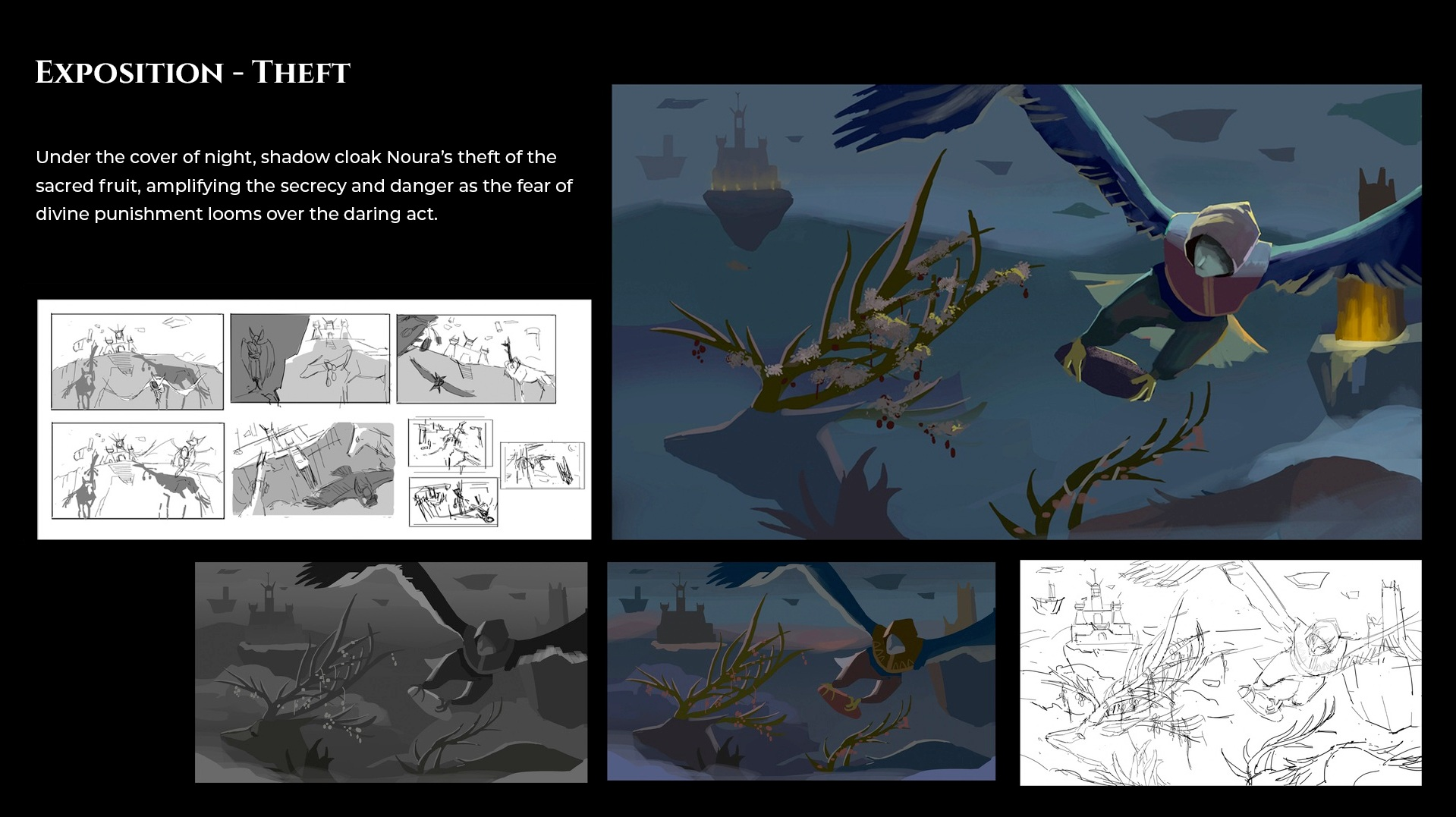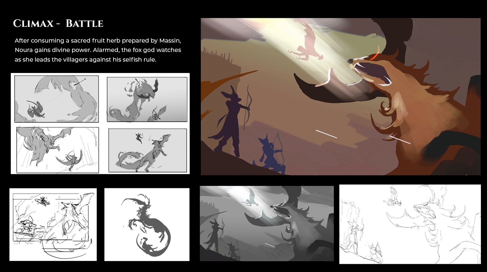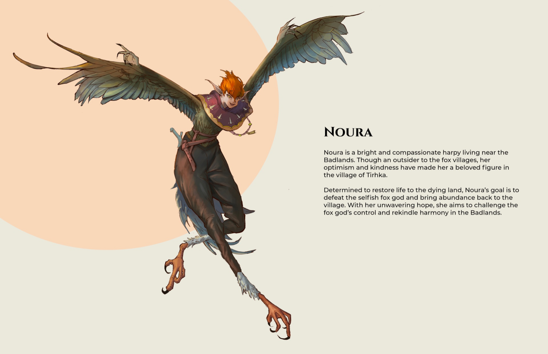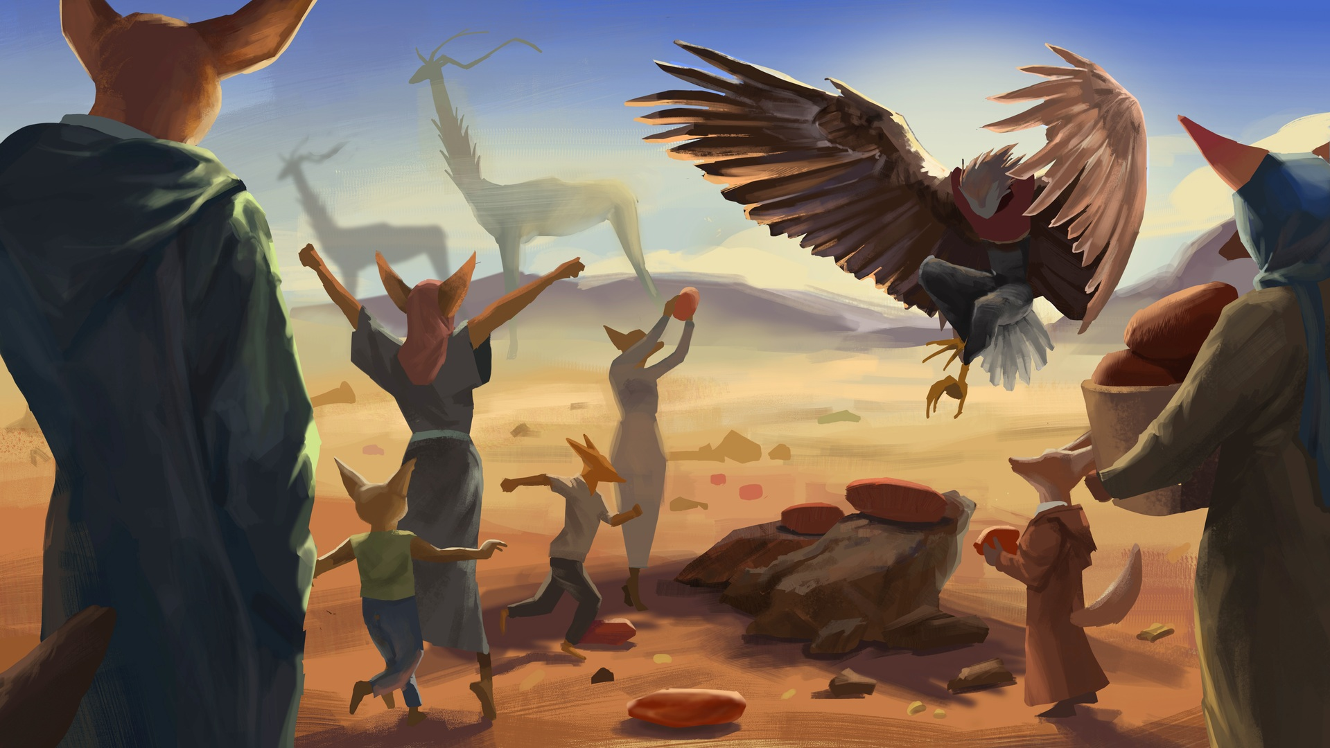 Fallen Sky is a visual development project set in the canyons divided by betrayal and survival. Long ago, the fennec fox elites sided with their god in a great war, abandoning the poor foxes to the scorched badlands while they ascended to floating islands of luxury. The story begins when a young rebel steals a sacred fruit, awakening the wrath of the god. To bring life back to the dying desert, she must face the consequences of that act and challenge the history that tore her people apart.