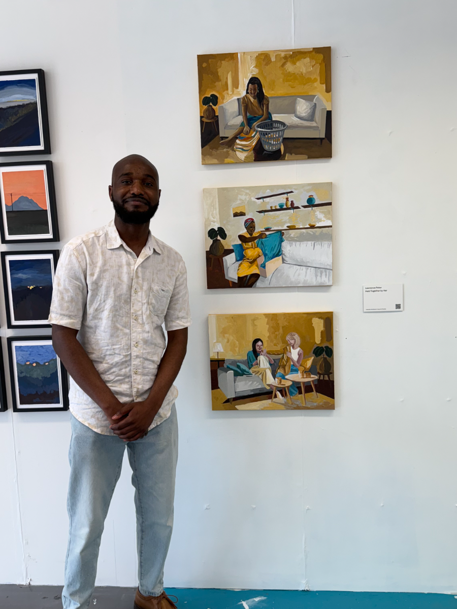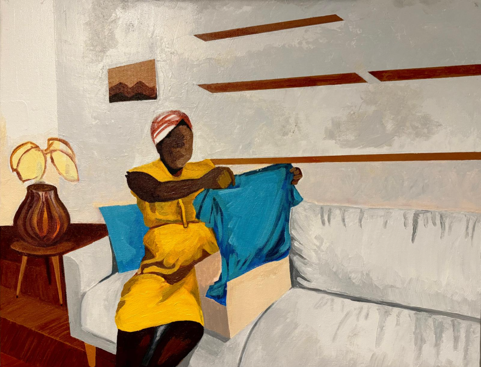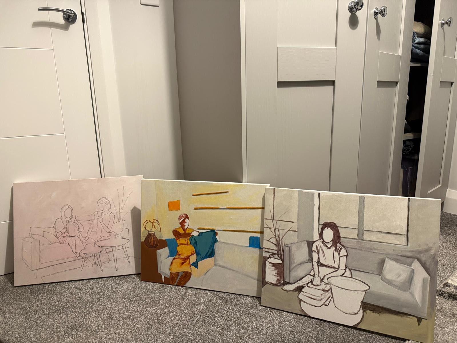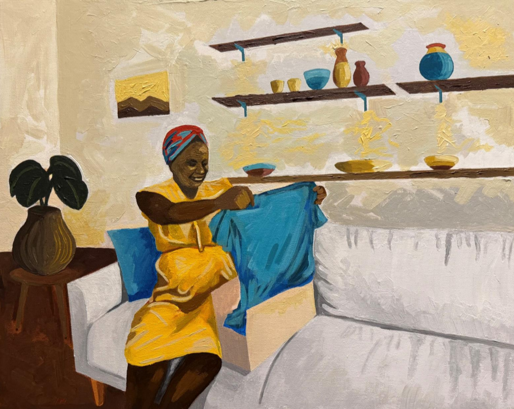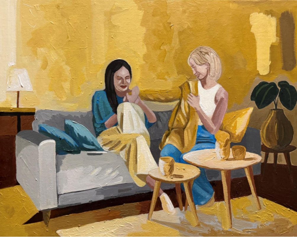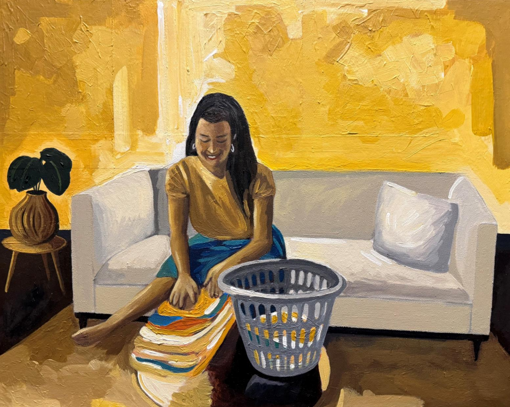 Held Together By Her is an exploration of women, within intimate, often overlooked sanctuaries of domestic life, and their significance in our lives. Through the medium of oil, I seek to capture the poetry of ordinary moments - their interaction with each other and surrounding personal belongings within domestic settings. This fascination is deeply rooted in my family's story. My mother taught herself to sew long before I was born. One evening, she proudly presented a handmade pair of shorts for my brother - an act of love carefully stitched into fabric. When my father, a cook at the time, returned home and saw her creation, he took it as a challenge. Before long, the rhythm of sewing became part of our family’s legacy. What began as a simple stitch of curiosity became my father’s craft, later passed down to my brother. It is this thread - of care, of creation, of quiet power - that has inspired this project. Women bring life in the spaces they inhabit. This project is an invitation to step inside these private worlds, to witness the unspoken strength, tenderness, and beauty that reside in the everyday. Throughout the series, recurring motifs such as a vase with a plant, a sofa, and women holding or folding clothes serve as symbols of comfort, beauty, and the quiet rituals that shape everyday life.
