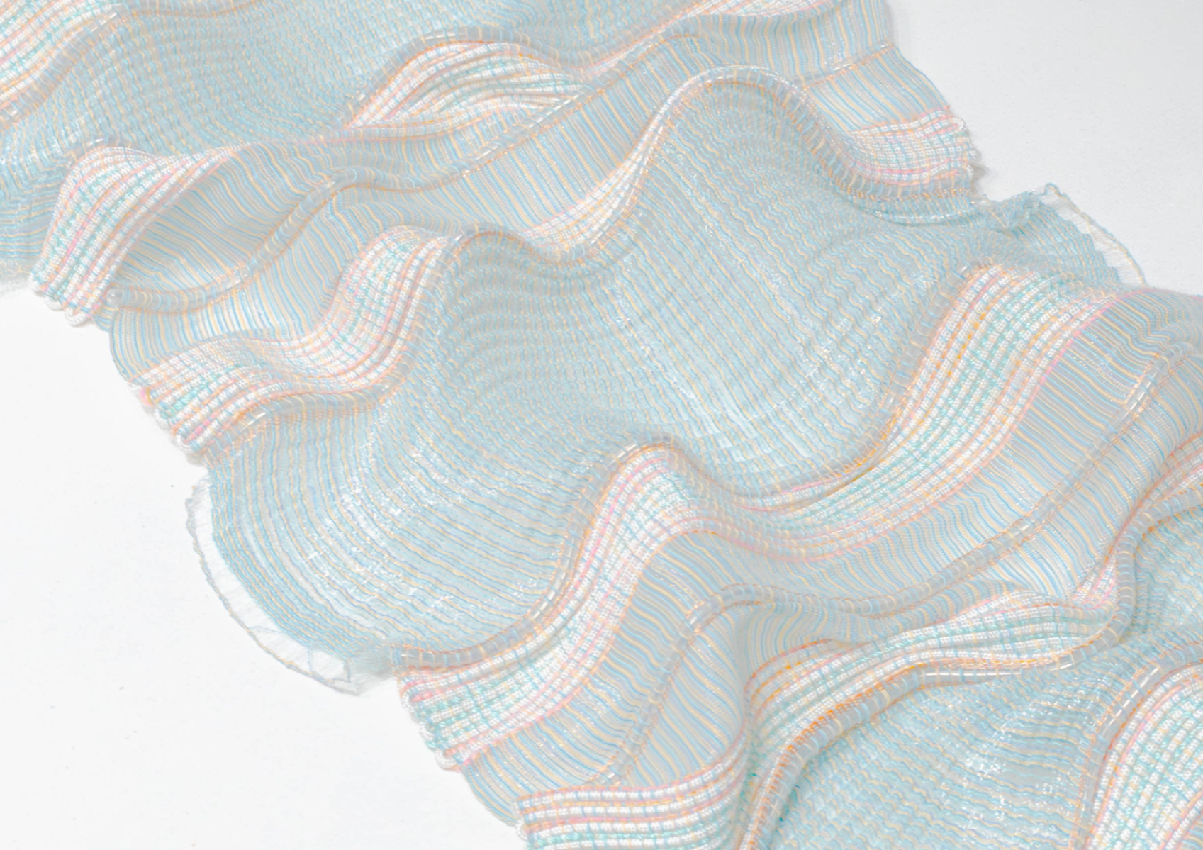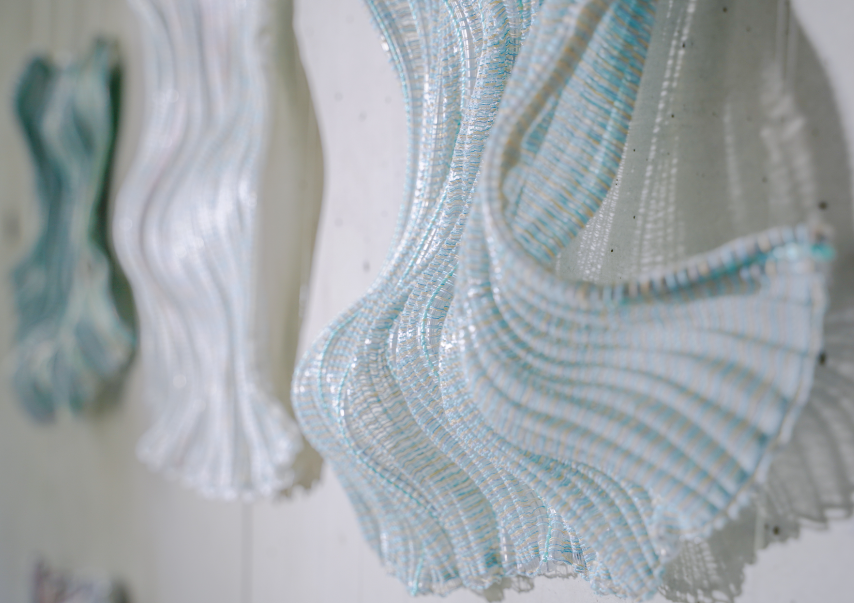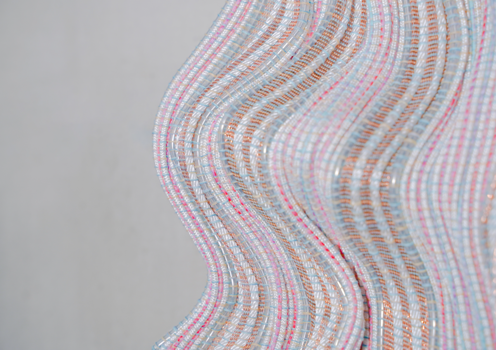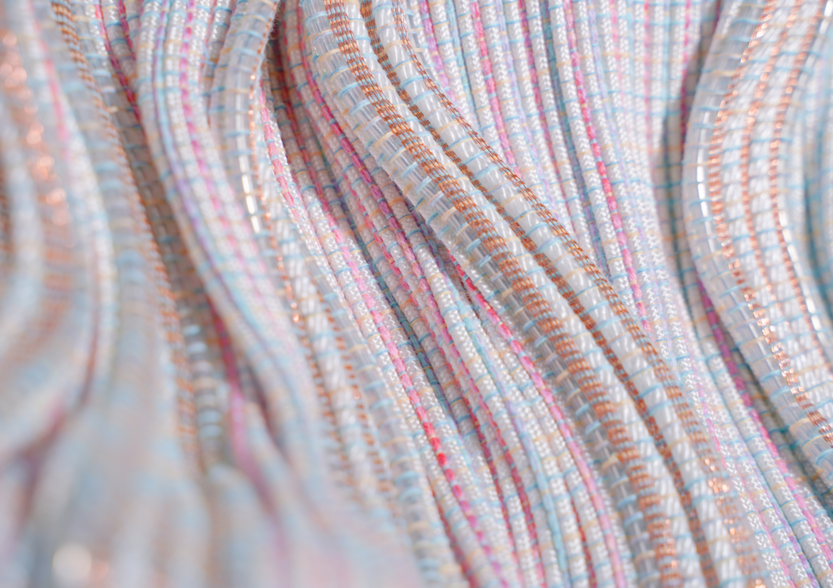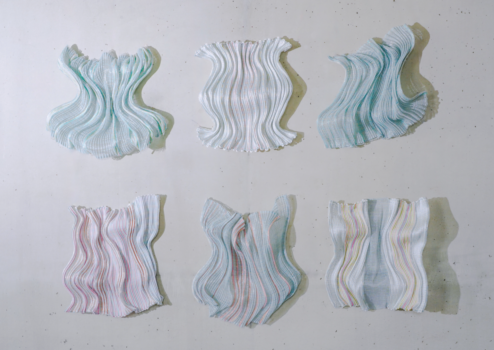 The Island of Movements textile collection explores the subtle dramaturgy of the interaction between body and woven material. Textile serves as a medium of movement: through weaving, it becomes the visual imprint of the hand’s gestures and – responding to the movements of the human body – it flows, folds, disperses or comes back together. In the design process, I drew inspiration from dancer and choreographer Pina Bausch’s iconic performance Café Müller. First, I transformed a selected movement sequence from the chosen piece into an emotional-rhythmic score, which I then translated into woven stripe patterns. These rhythms evoke the moments of contact and separation between two people through converging and diverging stripes. Through material experiments, I created softly floating, spatially shapeable woven structures by incorporating alternative elements — metal threads, wire, fishing line and silicone tubes. It is important to me to shape the three-dimensional forms intuitively: after the fabric is woven, I bend and sculpt each piece by hand. In this way, every object becomes a unique, gesture-like expression of movement. Each element of the collection expresses the motifs of detachment, entanglement, release and dependence, while emerging from the dialogue between material and form. The collection invites the viewer to experience stillness within the fleeting moments of constant change.