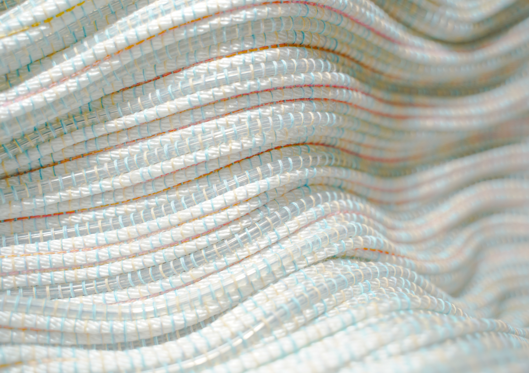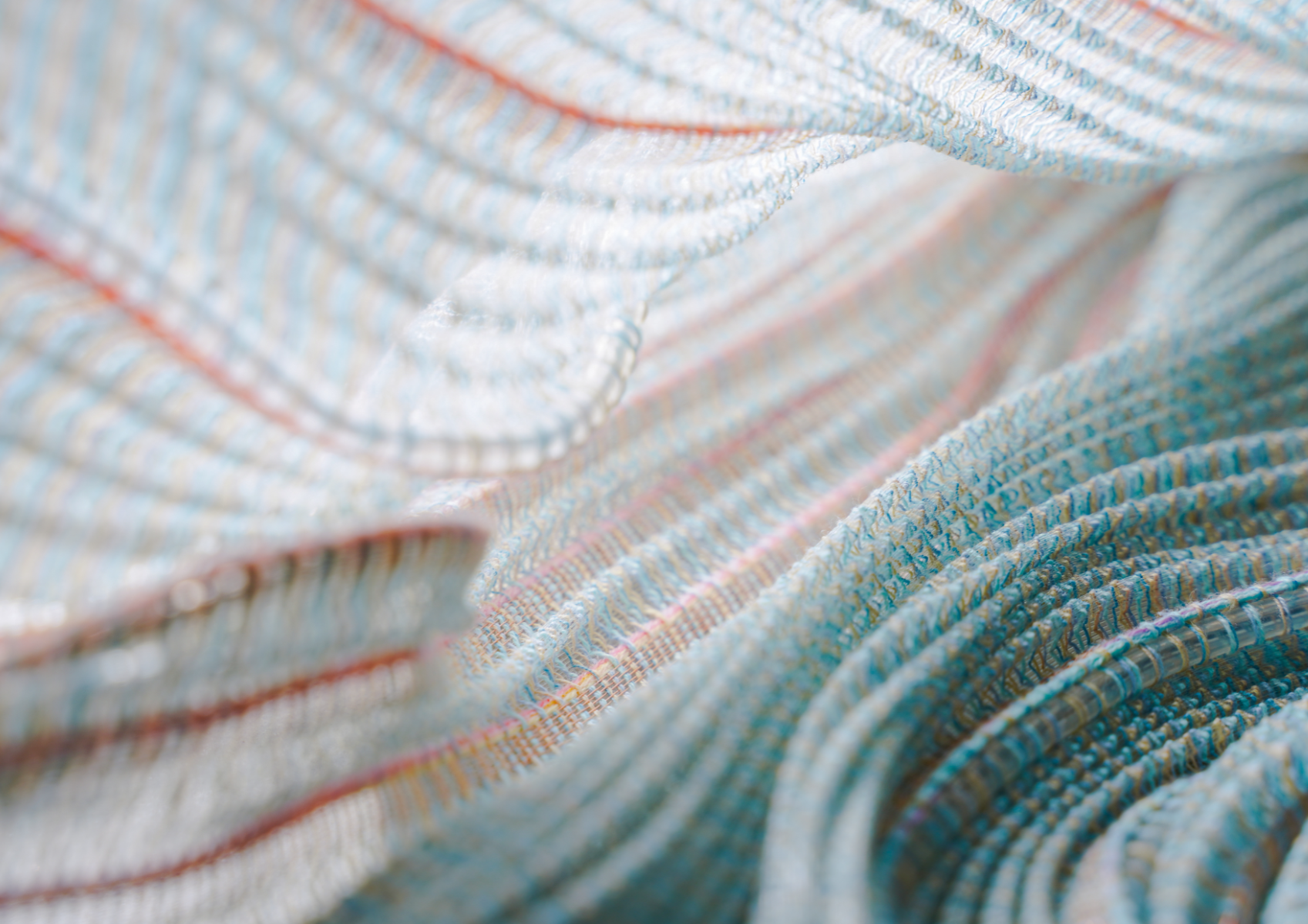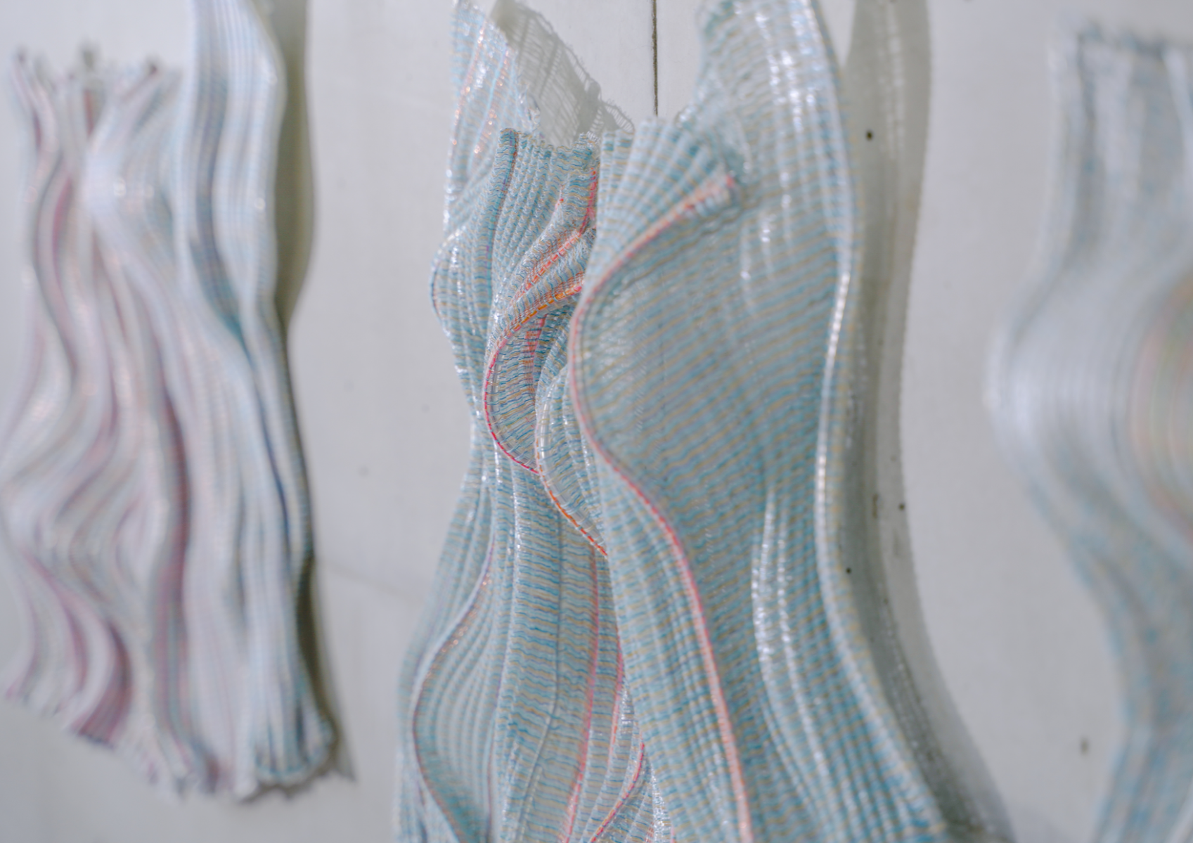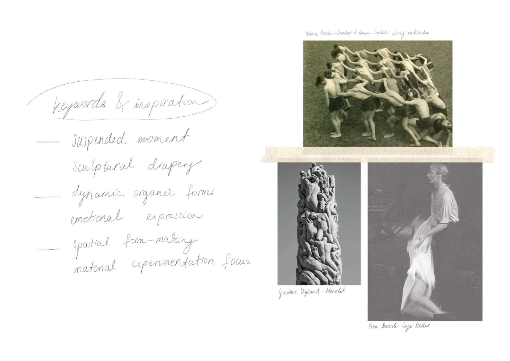The Island of Movements textile collection explores the subtle dramaturgy of the interaction between body and woven material. Textile serves as a medium of movement: through weaving, it becomes the visual imprint of the hand’s gestures and – responding to the movements of the human body – it flows, folds, disperses or comes back together. In the design process, I drew inspiration from dancer and choreographer Pina Bausch’s iconic performance Café Müller. First, I transformed a selected movement sequence from the chosen piece into an emotional-rhythmic score, which I then translated into woven stripe patterns. These rhythms evoke the moments of contact and separation between two people through converging and diverging stripes. Through material experiments, I created softly floating, spatially shapeable woven structures by incorporating alternative elements — metal threads, wire, fishing line and silicone tubes. It is important to me to shape the three-dimensional forms intuitively: after the fabric is woven, I bend and sculpt each piece by hand. In this way, every object becomes a unique, gesture-like expression of movement. Each element of the collection expresses the motifs of detachment, entanglement, release and dependence, while emerging from the dialogue between material and form. The collection invites the viewer to experience stillness within the fleeting moments of constant change.