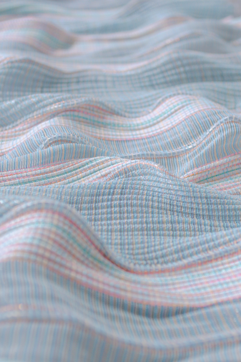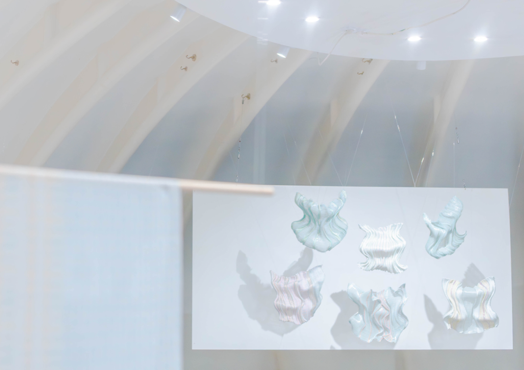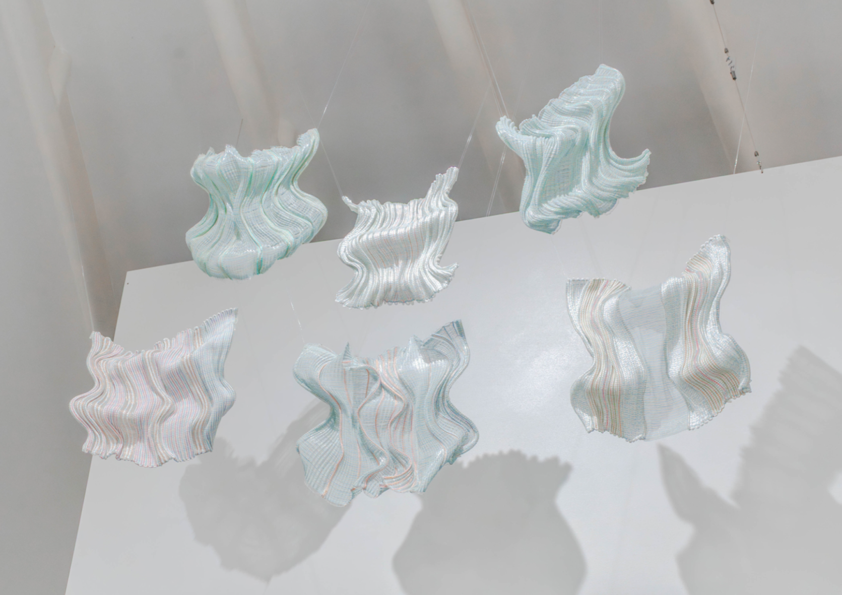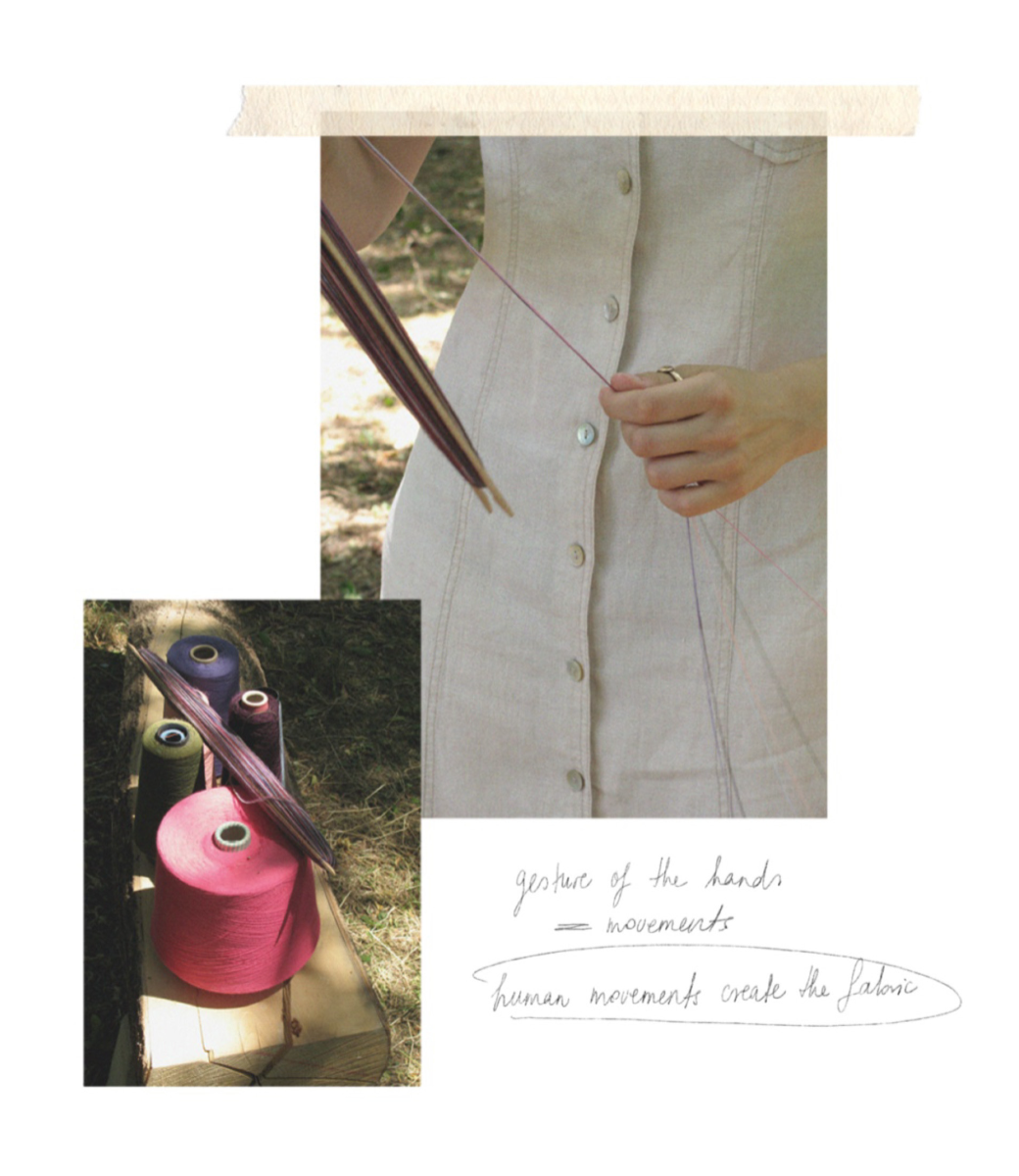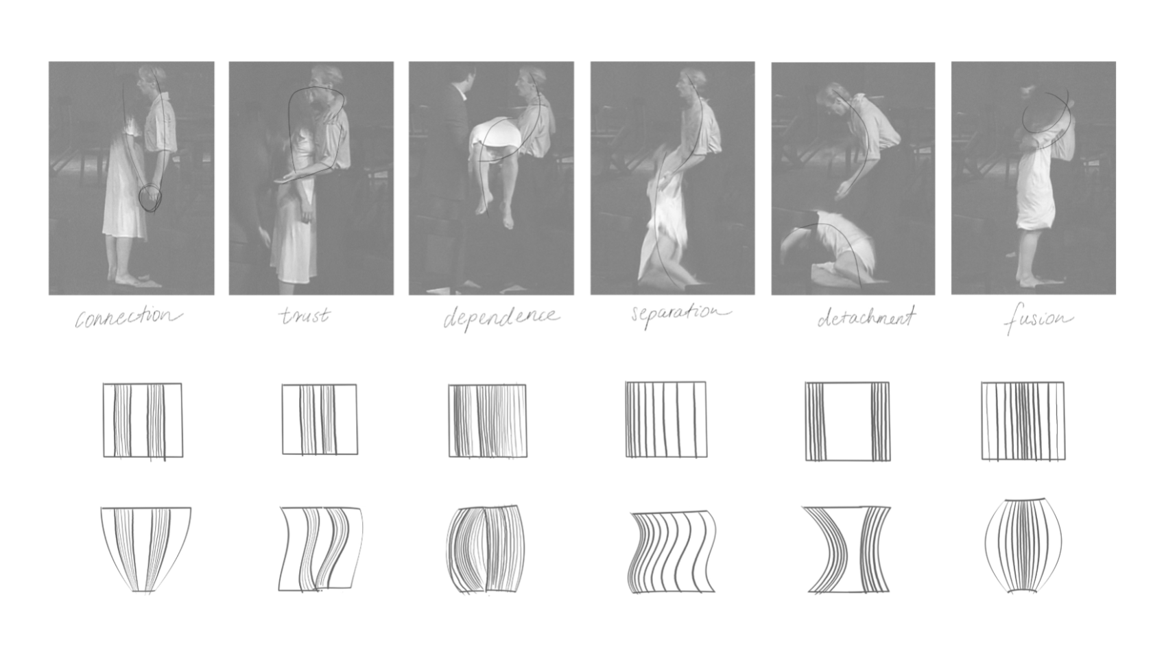 The Island of Movements textile collection explores the subtle dramaturgy of the interaction between body and woven material. Textile serves as a medium of movement: through weaving, it becomes the visual imprint of the hand’s gestures and – responding to the movements of the human body – it flows, folds, disperses or comes back together. In the design process, I drew inspiration from dancer and choreographer Pina Bausch’s iconic performance Café Müller. First, I transformed a selected movement sequence from the chosen piece into an emotional-rhythmic score, which I then translated into woven stripe patterns. These rhythms evoke the moments of contact and separation between two people through converging and diverging stripes. Through material experiments, I created softly floating, spatially shapeable woven structures by incorporating alternative elements — metal threads, wire, fishing line and silicone tubes. It is important to me to shape the three-dimensional forms intuitively: after the fabric is woven, I bend and sculpt each piece by hand. In this way, every object becomes a unique, gesture-like expression of movement. Each element of the collection expresses the motifs of detachment, entanglement, release and dependence, while emerging from the dialogue between material and form. The collection invites the viewer to experience stillness within the fleeting moments of constant change.