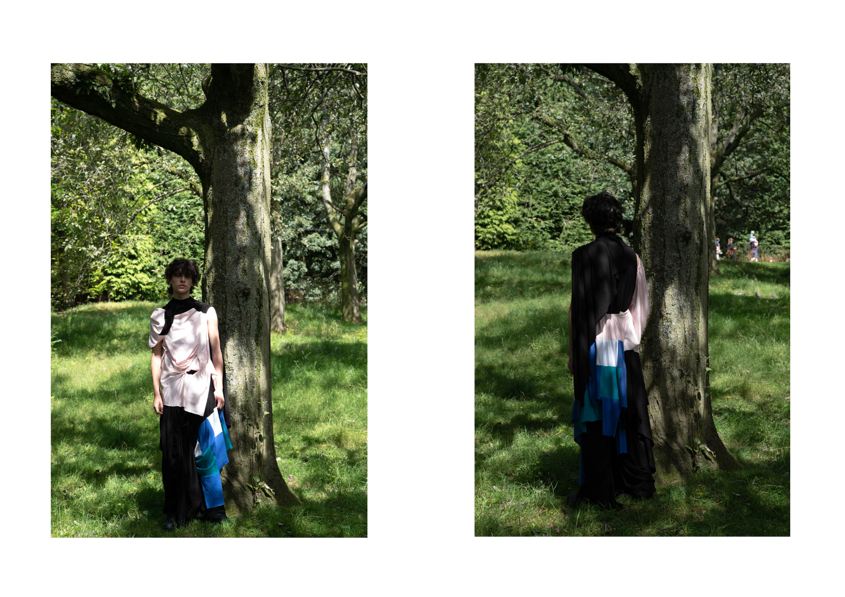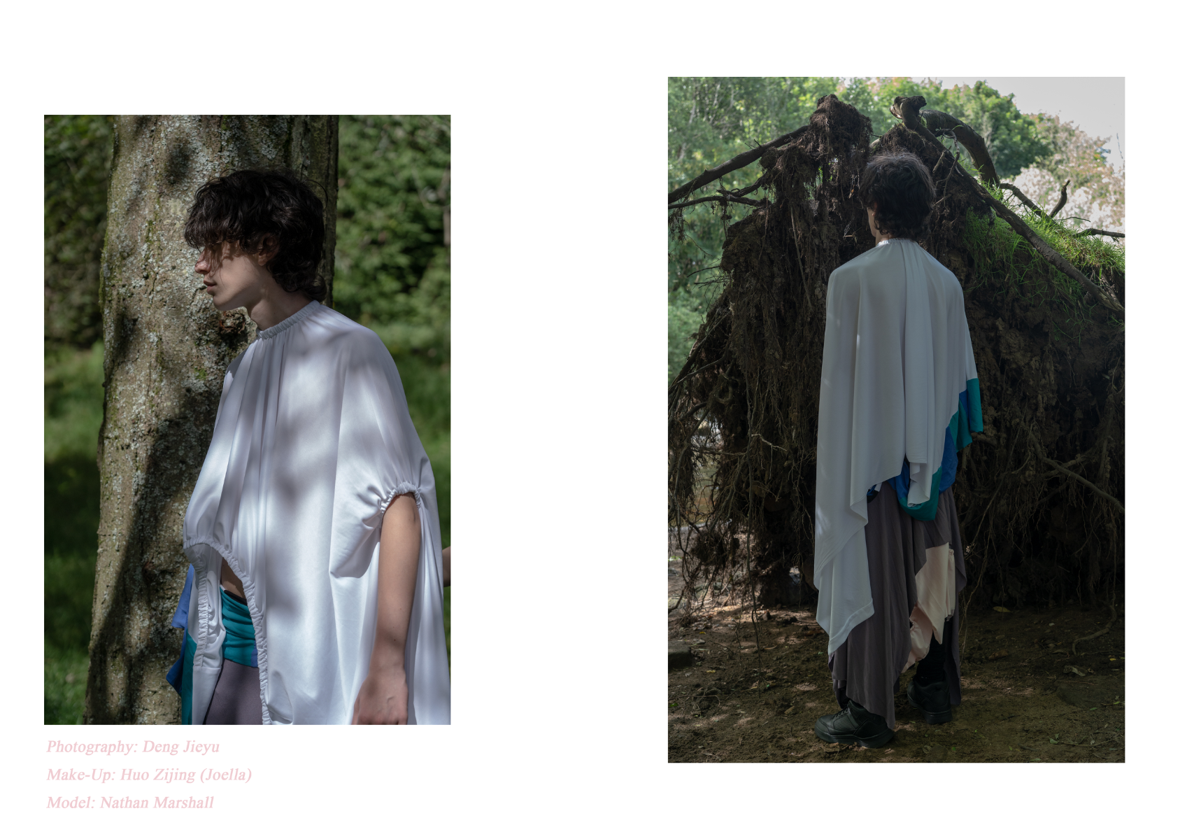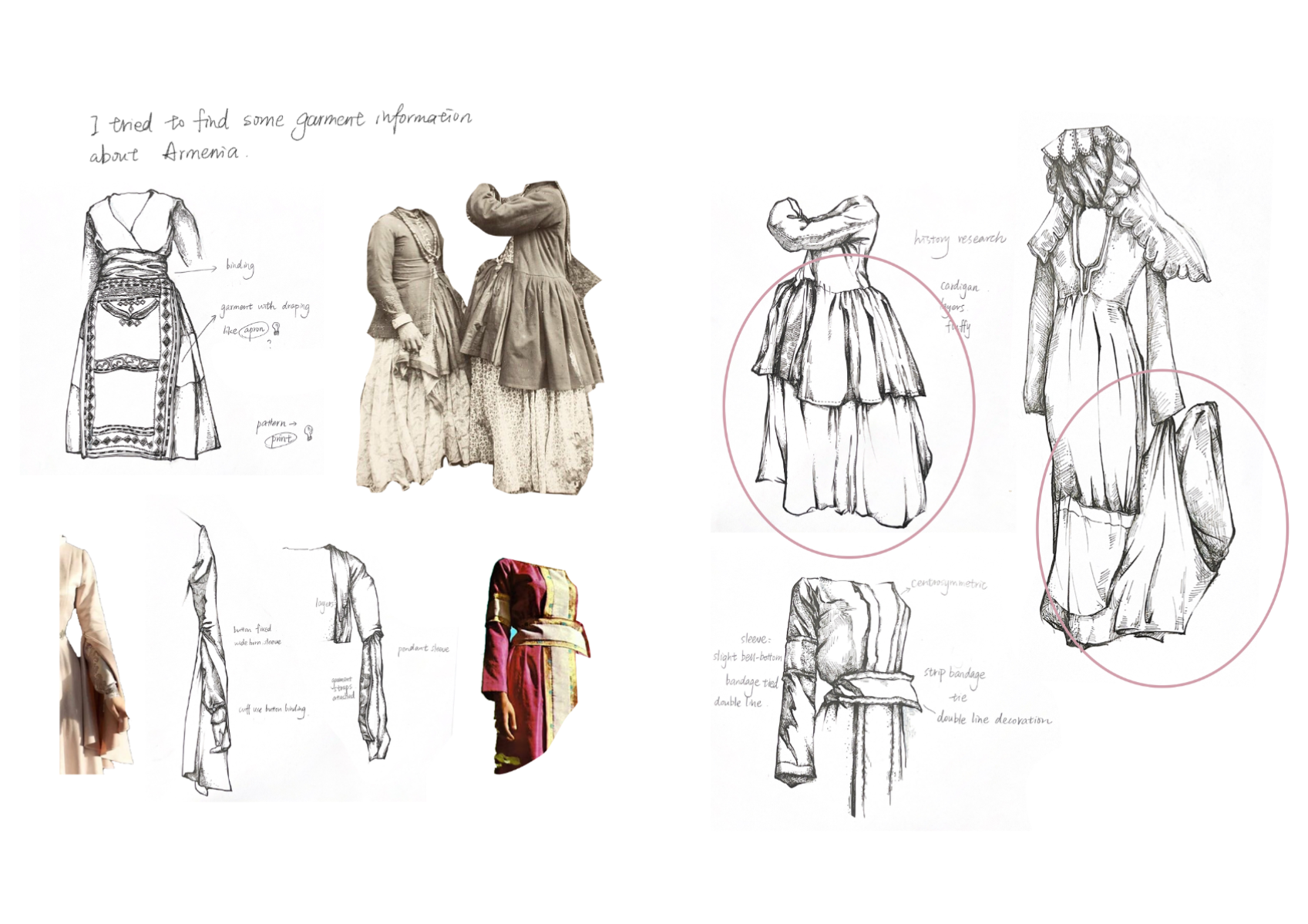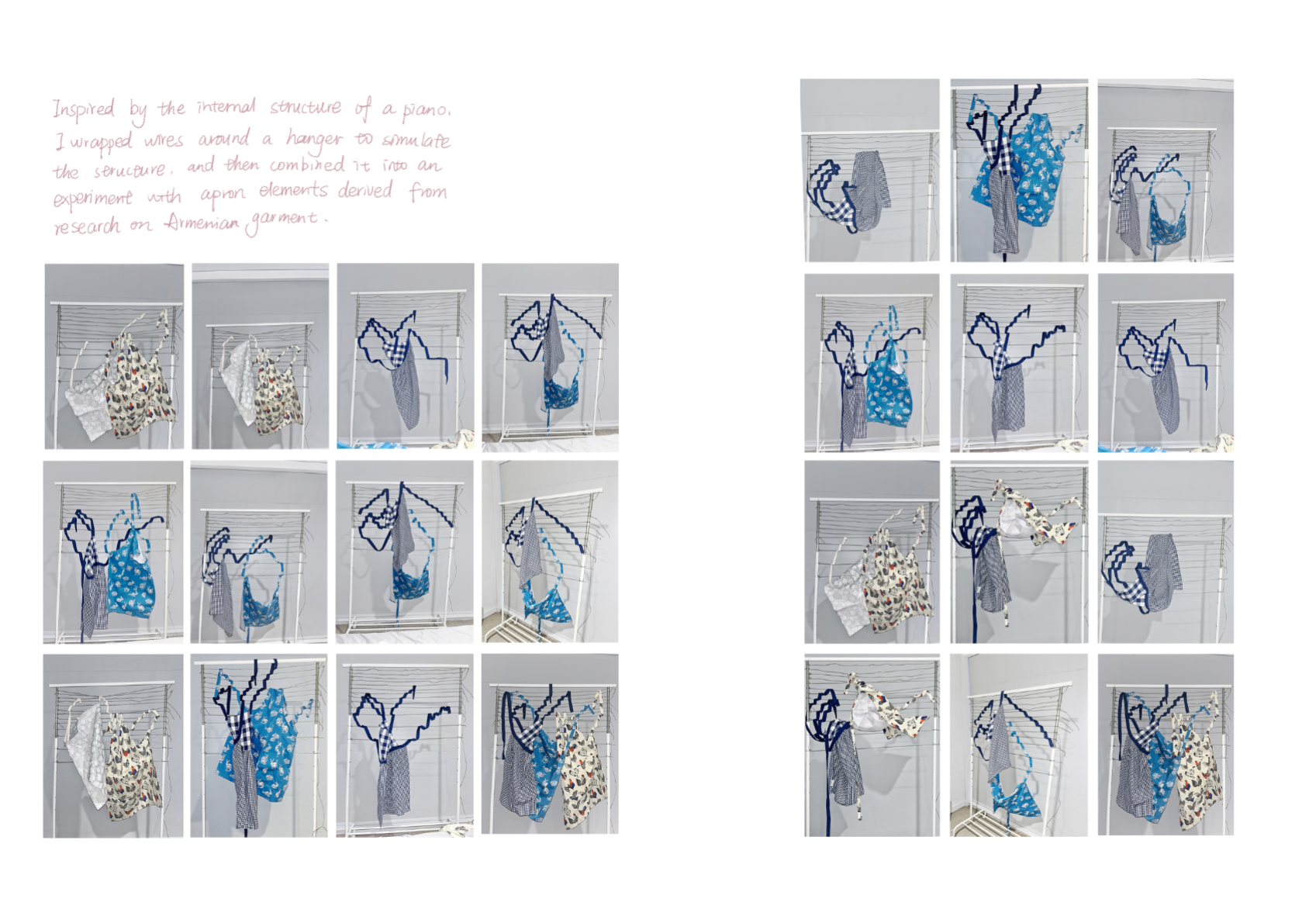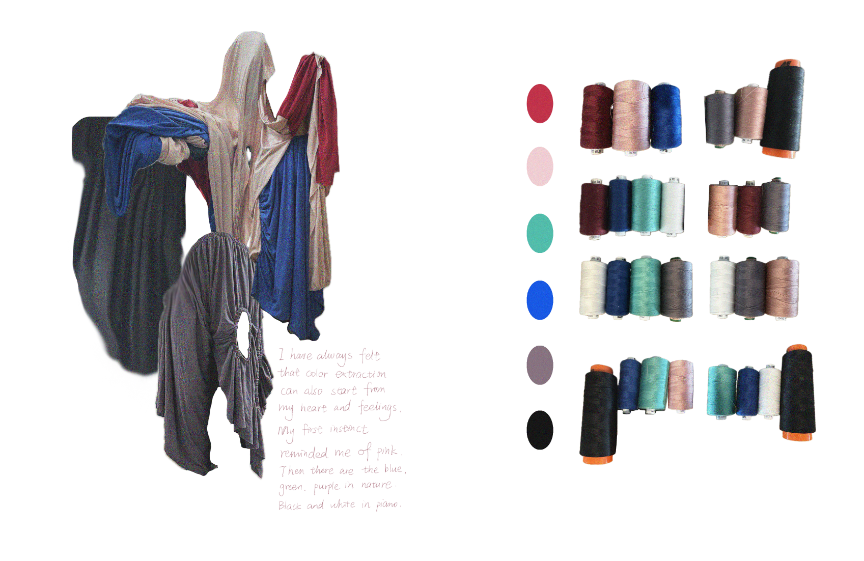 The seed of this collection grew while listening to the melancholic purity of Armenian music. It made me think of the documentary 'Coda' by Ryuichi Sakamoto where he plays ambient and soothing music on a broken piano which had been submerged under water after the Japanese tsunami of 2011 and had, in his words, been "re-tuned by nature". My research compared the inner workings of a damaged piano with that of a dented soul which I contrasted with elements of Armenian costume. Through my fabric choices and cutting techniques, I hope to have achieved clothing that has an emotional connection with the wearer and is similarly atmospheric, gentle and relaxing.