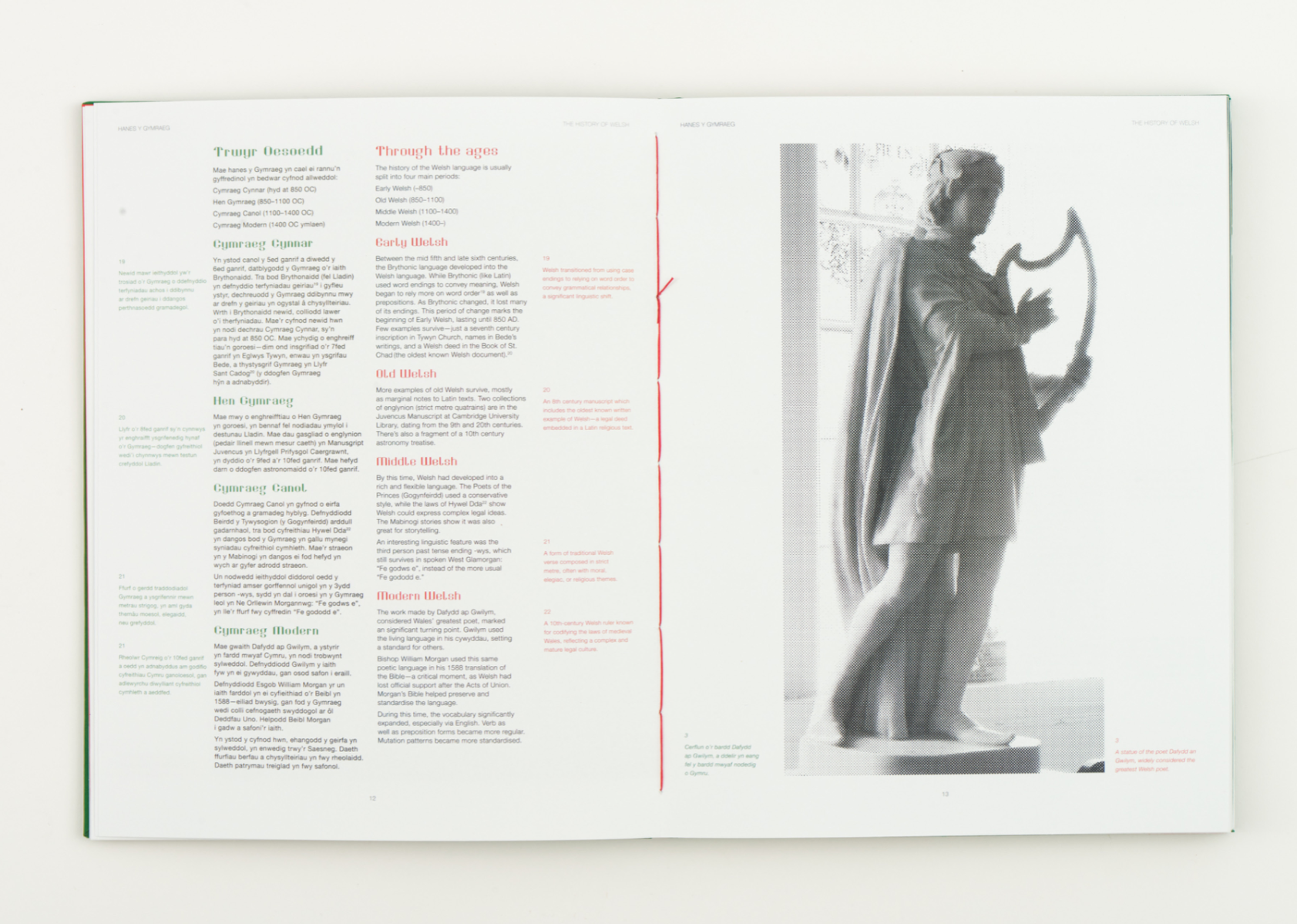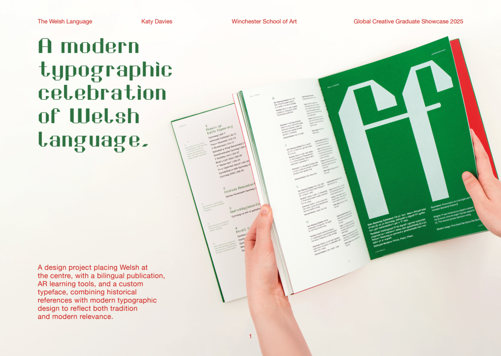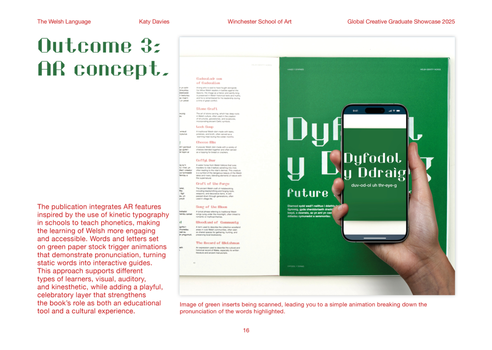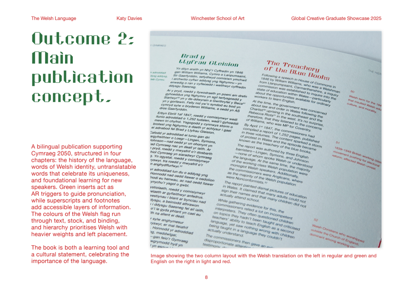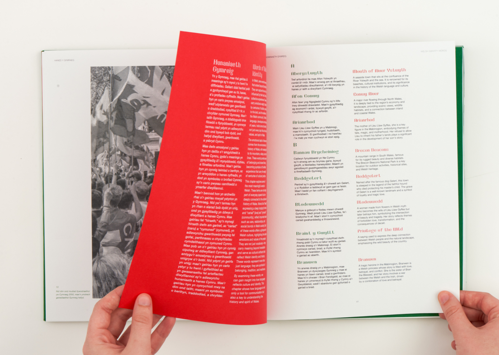 Created in response to Cymraeg 2050, aiming for more Welsh speakers, my project celebrates the Welsh language as a vital part of cultural identity, whilst functioning as learning resources. The bilingual publication challenges the dominance of English by placing Welsh at the centre of its design and structure. AR features support learning and pronunciation, while my custom typeface, Hanes Modern, inspired by early Welsh manuscripts and designed to bring the heritage of Welsh identity into a modern context. This is shown in a type specimen alongside the main publication.