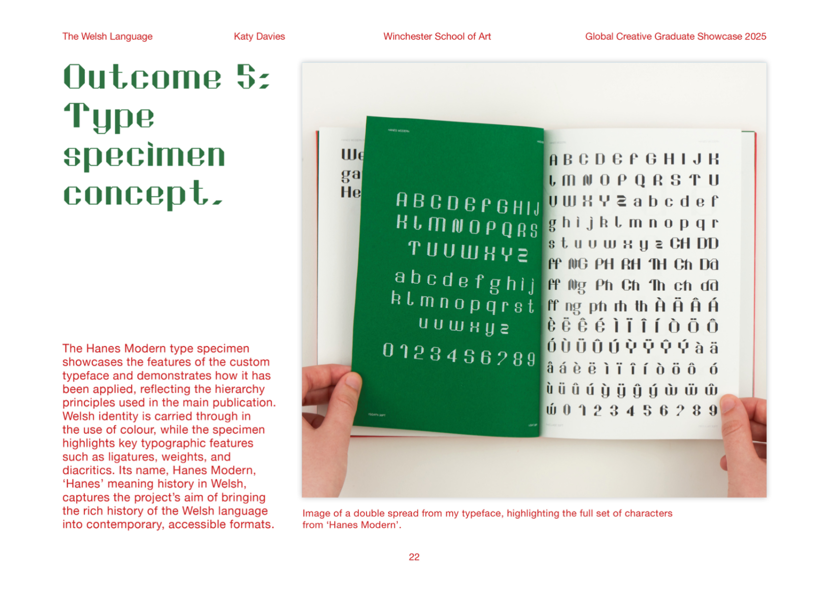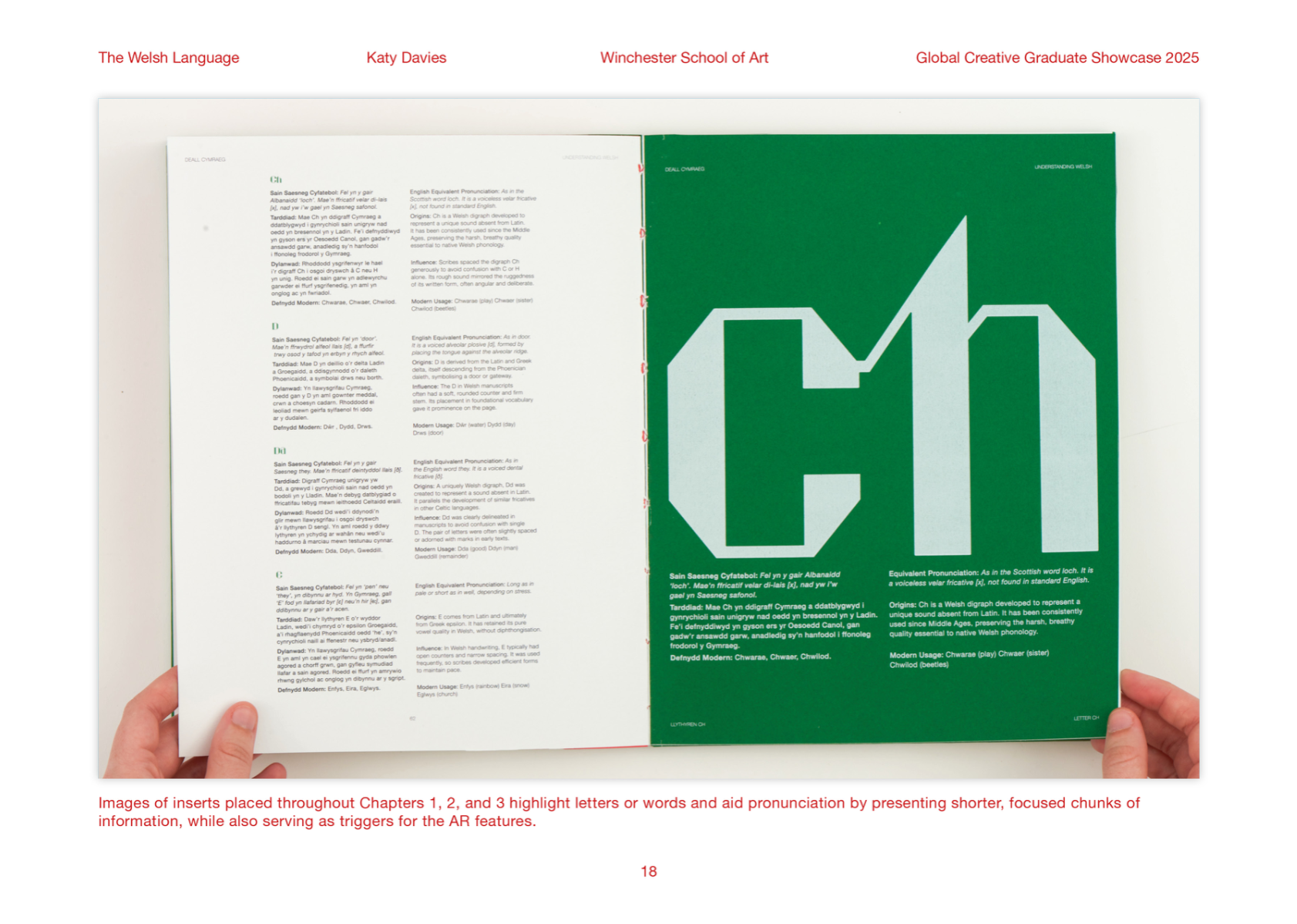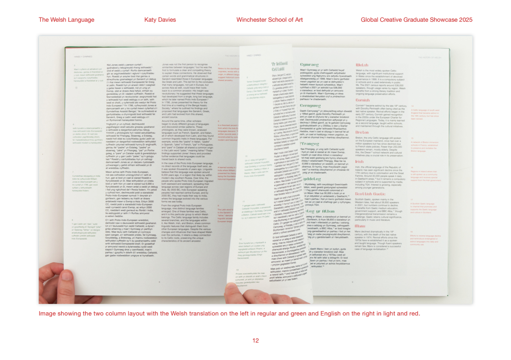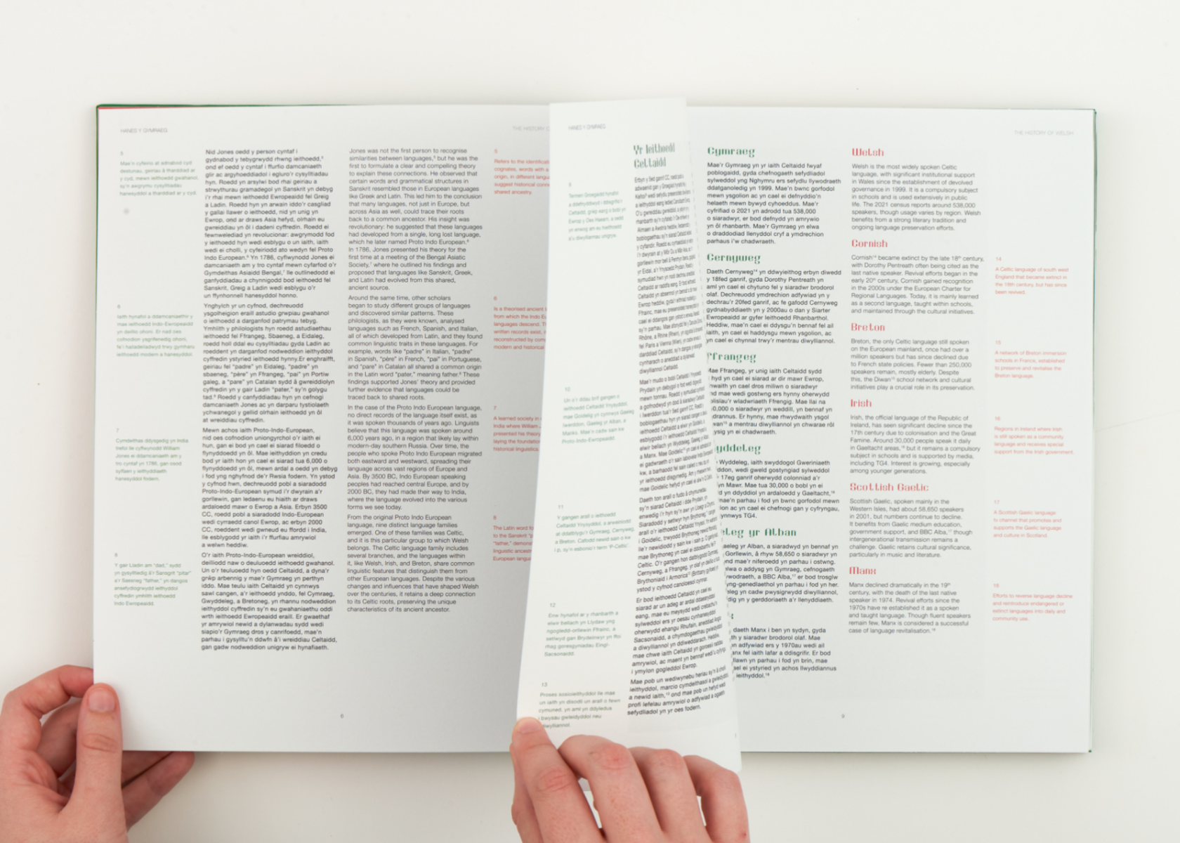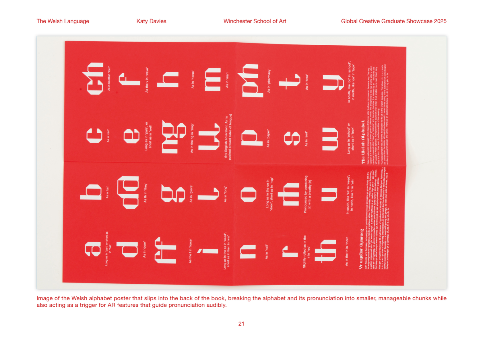 Created in response to Cymraeg 2050, aiming for more Welsh speakers, my project celebrates the Welsh language as a vital part of cultural identity, whilst functioning as learning resources. The bilingual publication challenges the dominance of English by placing Welsh at the centre of its design and structure. AR features support learning and pronunciation, while my custom typeface, Hanes Modern, inspired by early Welsh manuscripts and designed to bring the heritage of Welsh identity into a modern context. This is shown in a type specimen alongside the main publication.