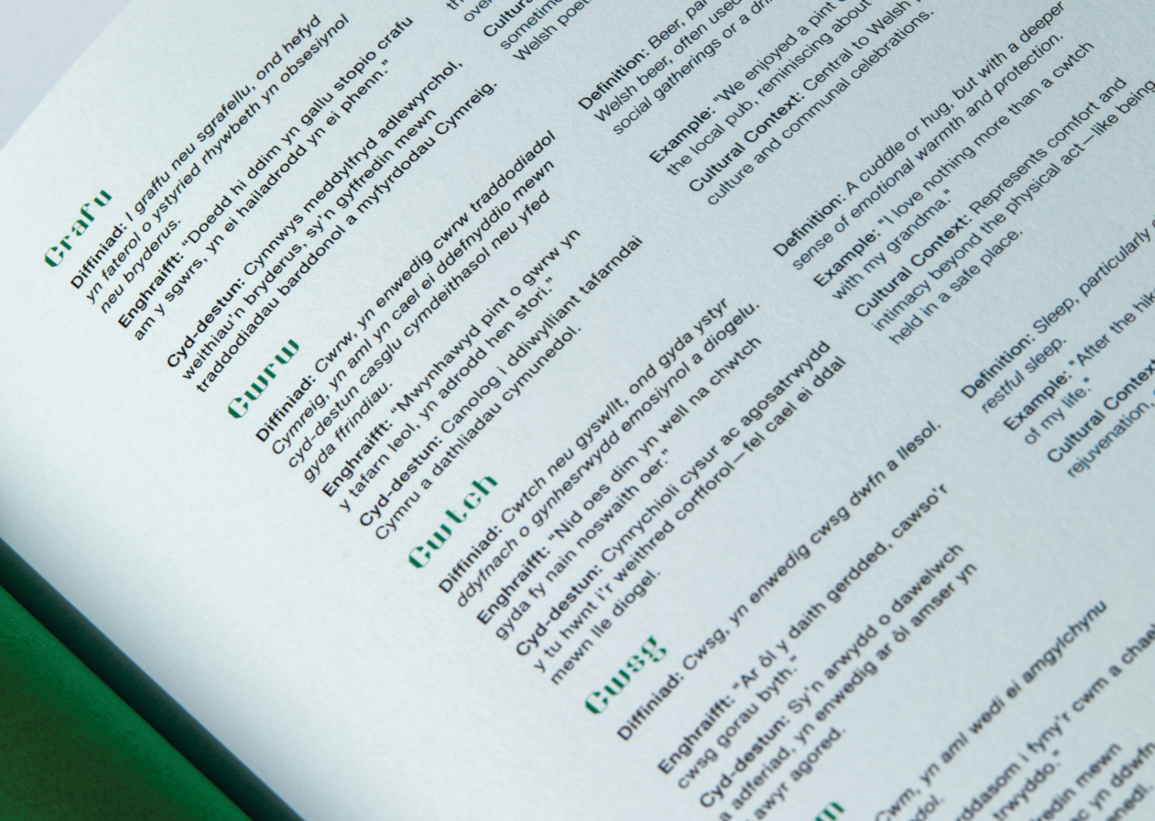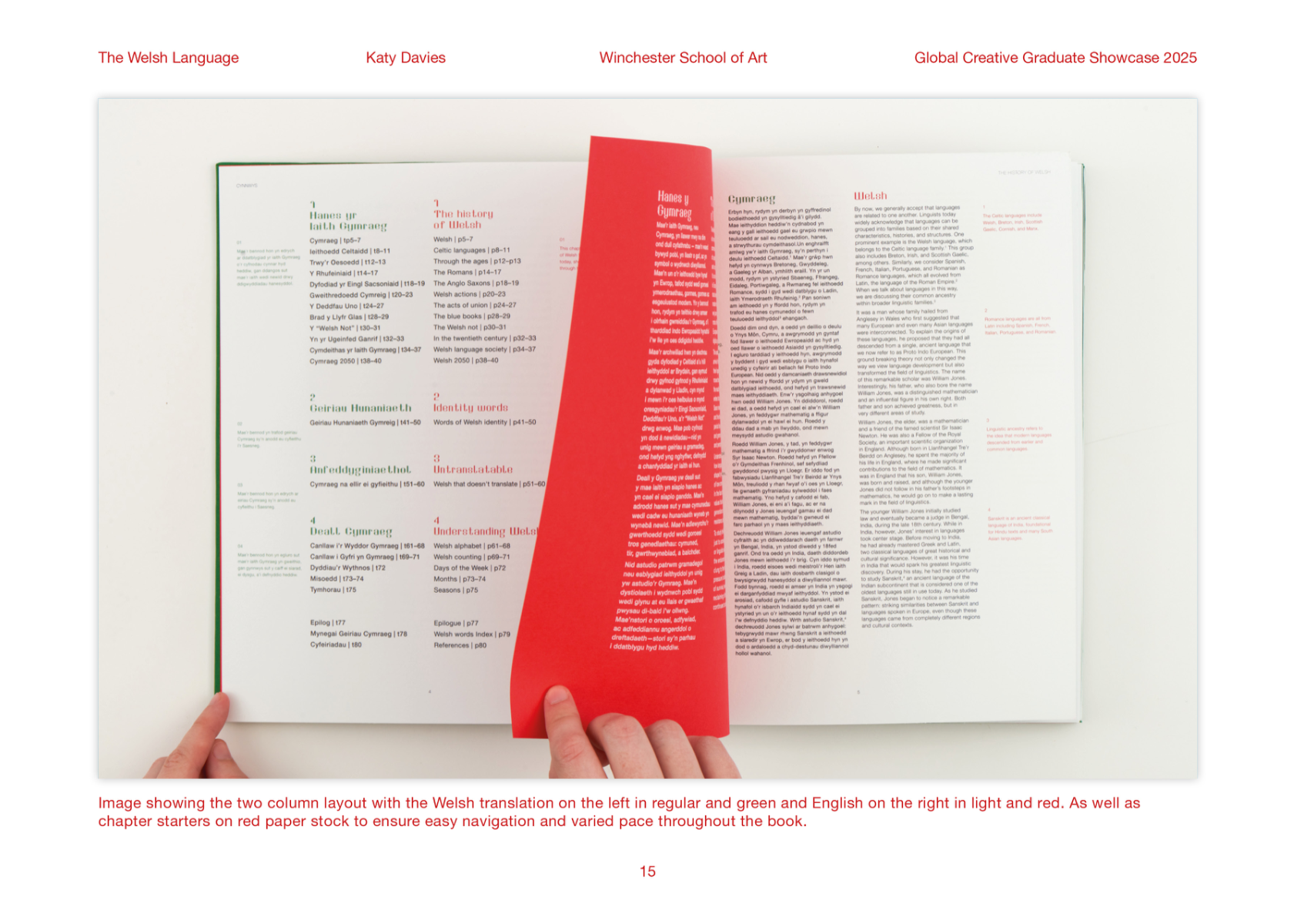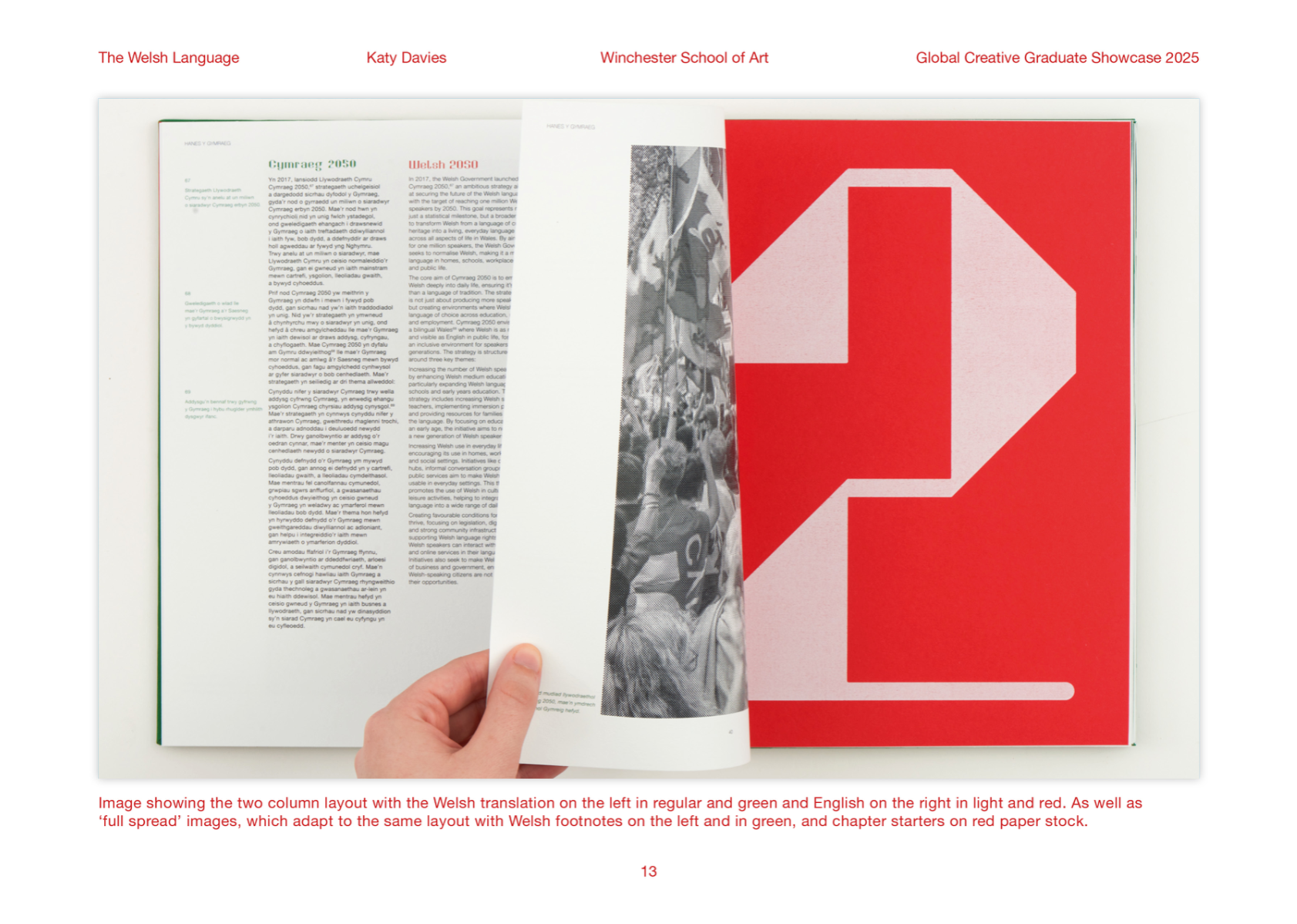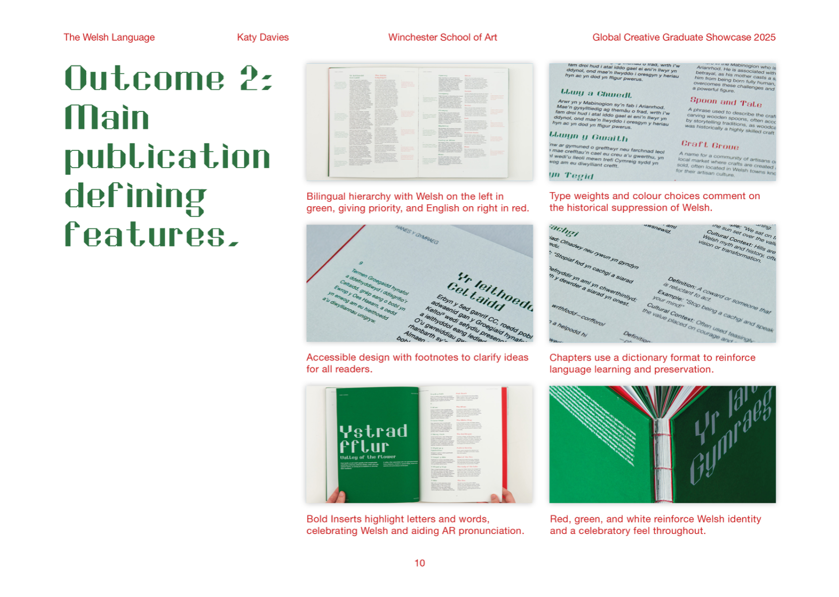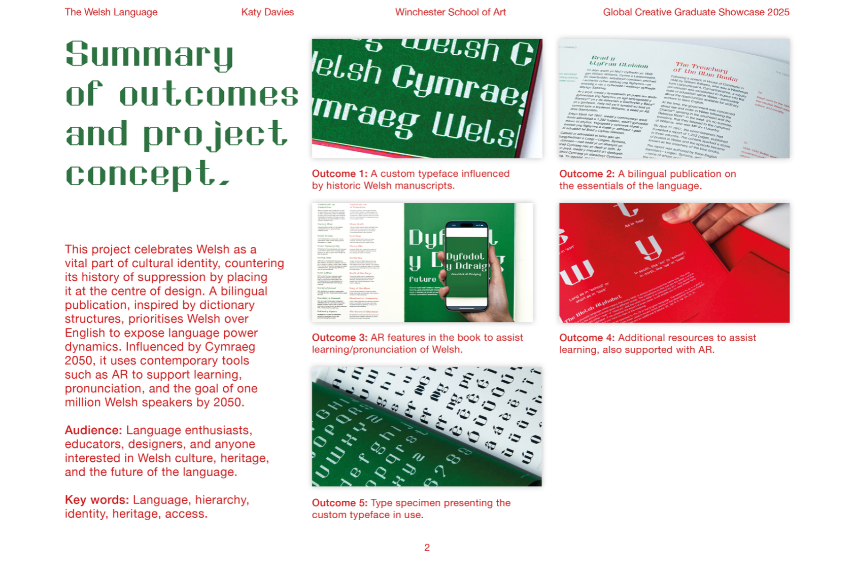 Created in response to Cymraeg 2050, aiming for more Welsh speakers, my project celebrates the Welsh language as a vital part of cultural identity, whilst functioning as learning resources. The bilingual publication challenges the dominance of English by placing Welsh at the centre of its design and structure. AR features support learning and pronunciation, while my custom typeface, Hanes Modern, inspired by early Welsh manuscripts and designed to bring the heritage of Welsh identity into a modern context. This is shown in a type specimen alongside the main publication.