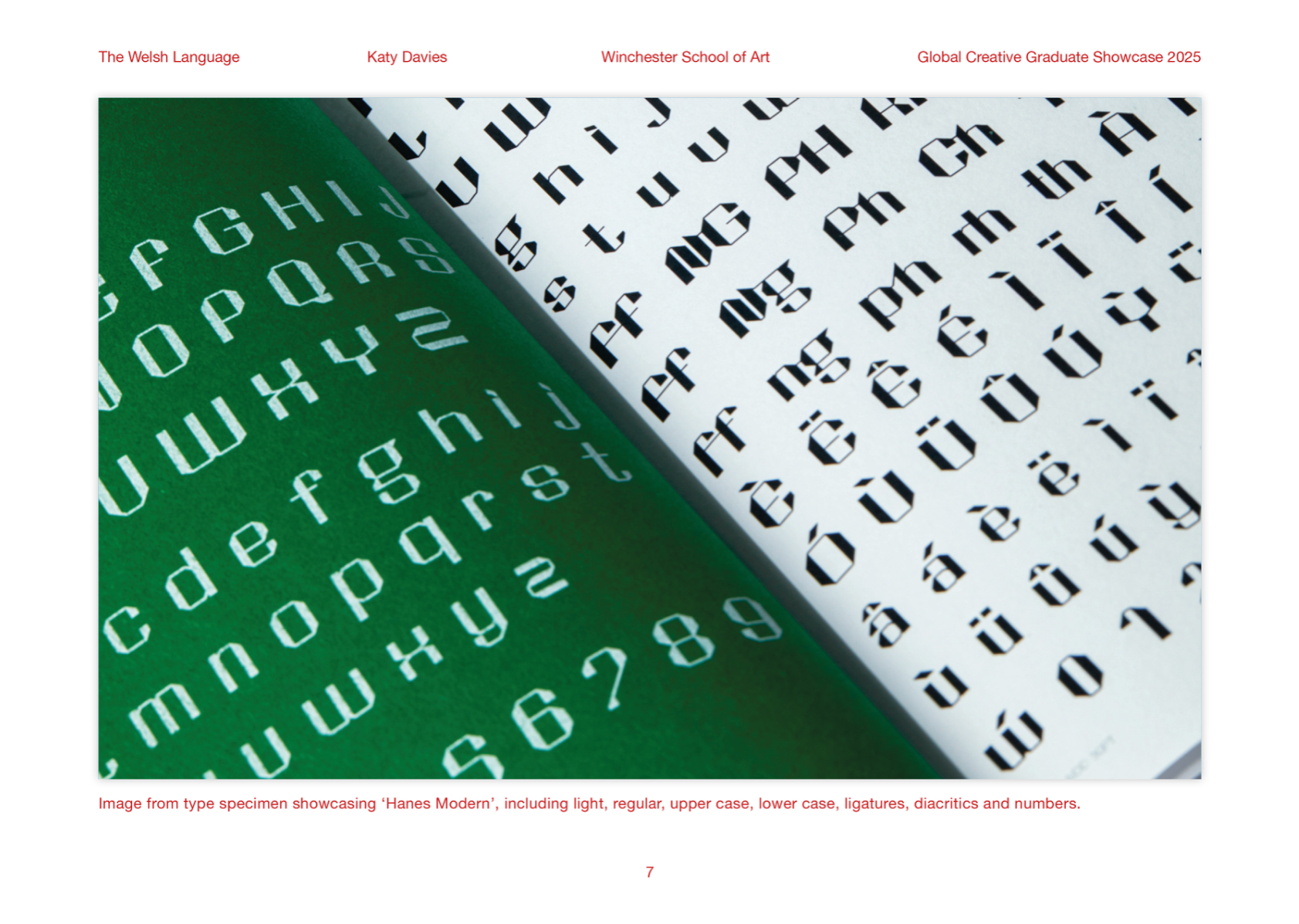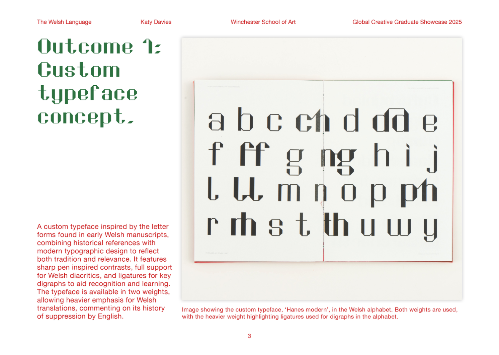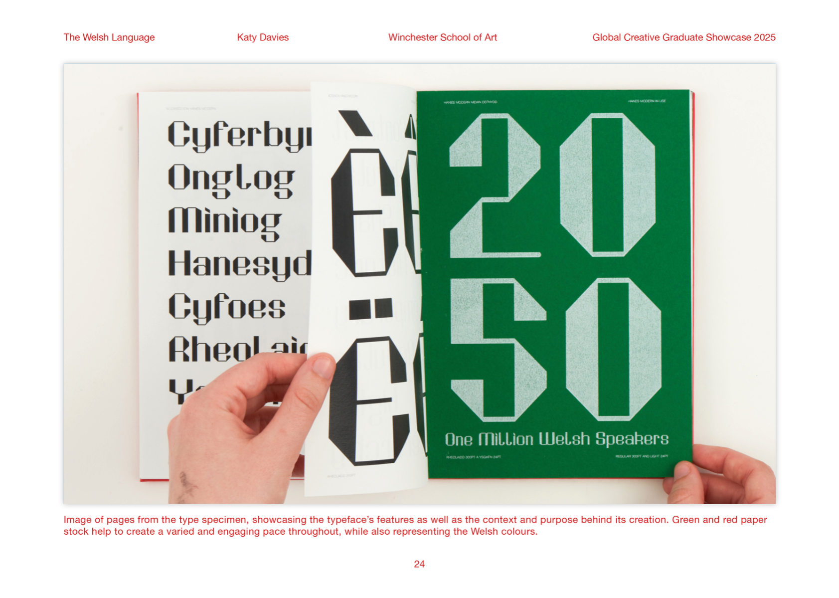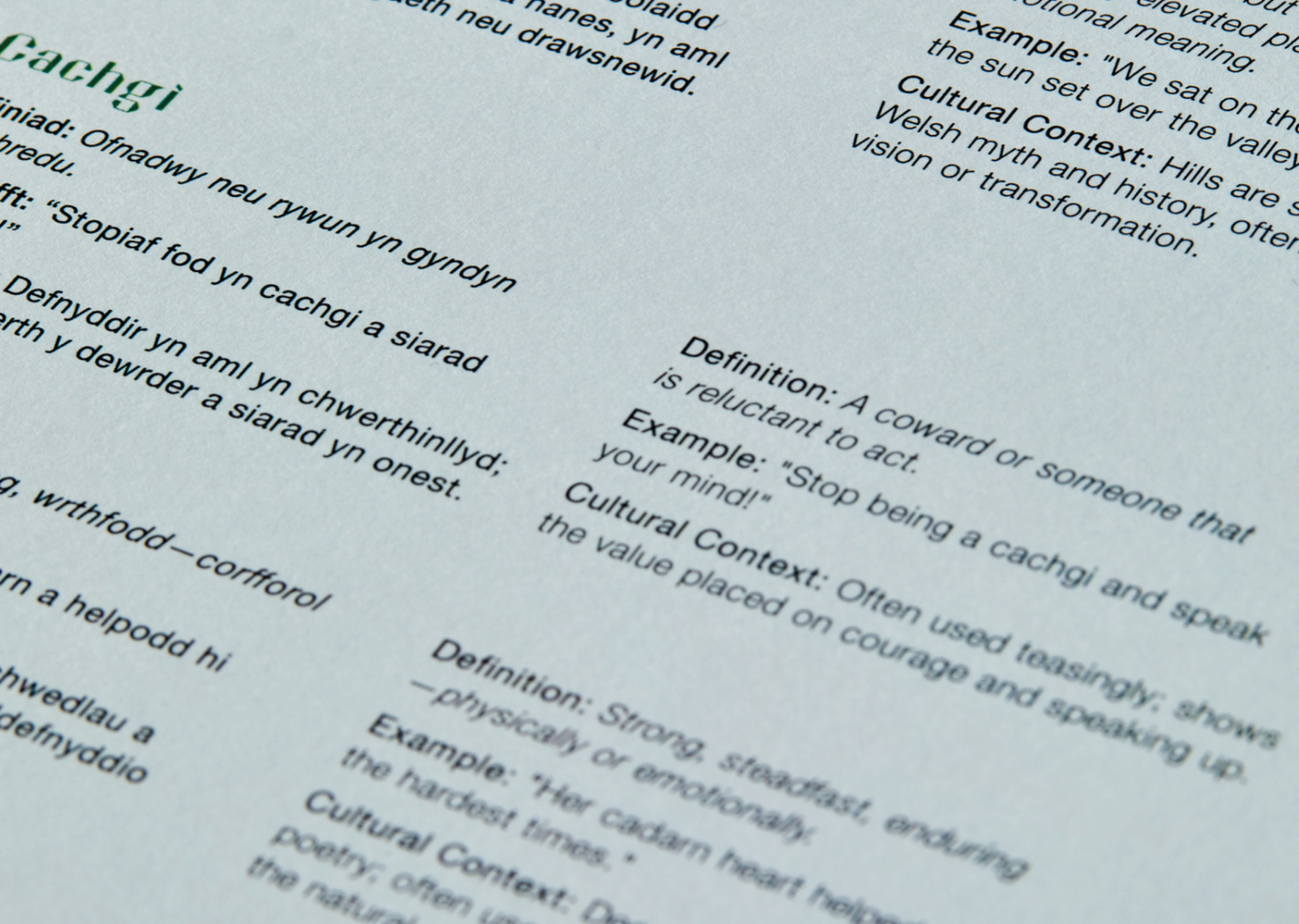 Created in response to Cymraeg 2050, aiming for more Welsh speakers, my project celebrates the Welsh language as a vital part of cultural identity, whilst functioning as learning resources. The bilingual publication challenges the dominance of English by placing Welsh at the centre of its design and structure. AR features support learning and pronunciation, while my custom typeface, Hanes Modern, inspired by early Welsh manuscripts and designed to bring the heritage of Welsh identity into a modern context. This is shown in a type specimen alongside the main publication.