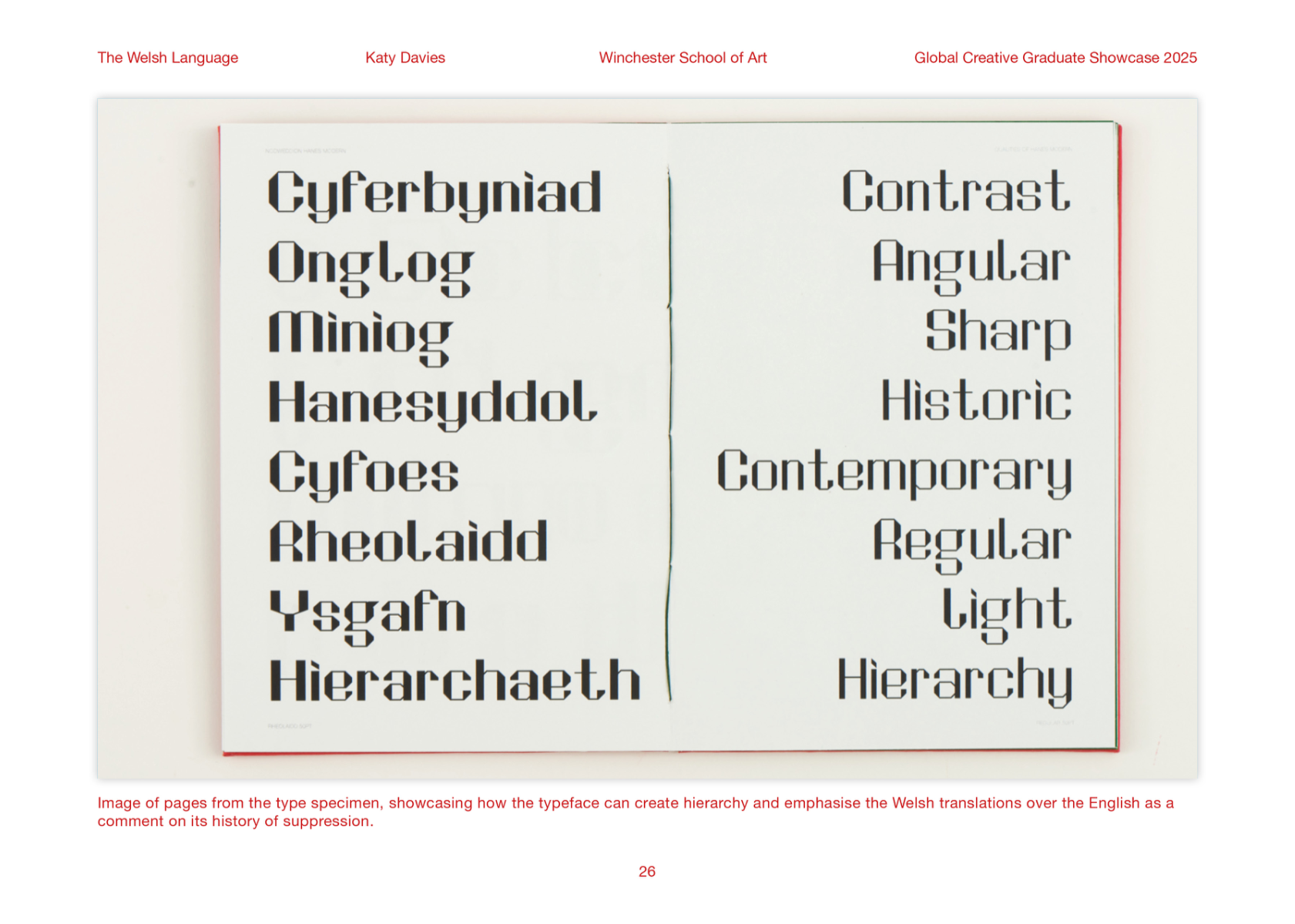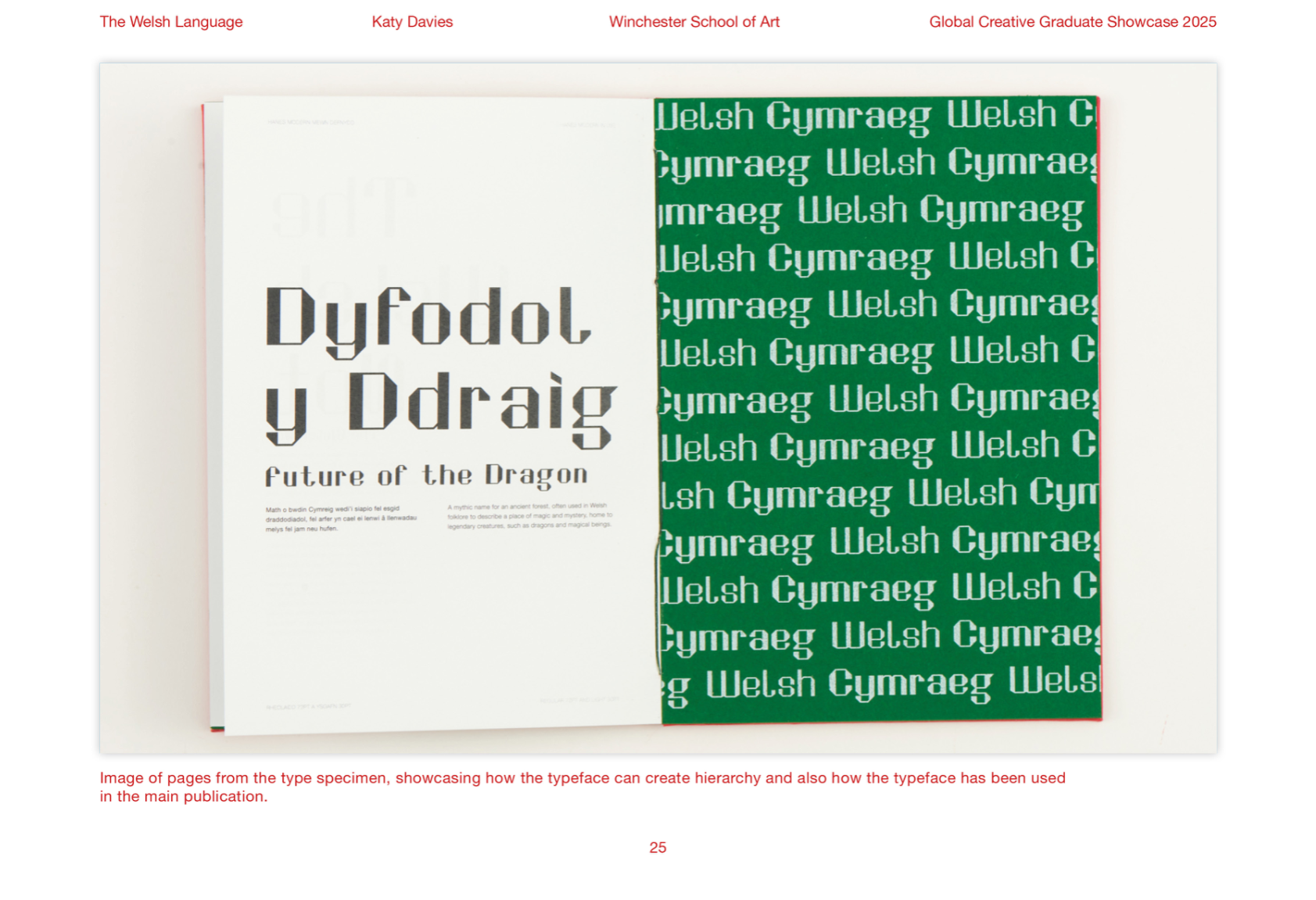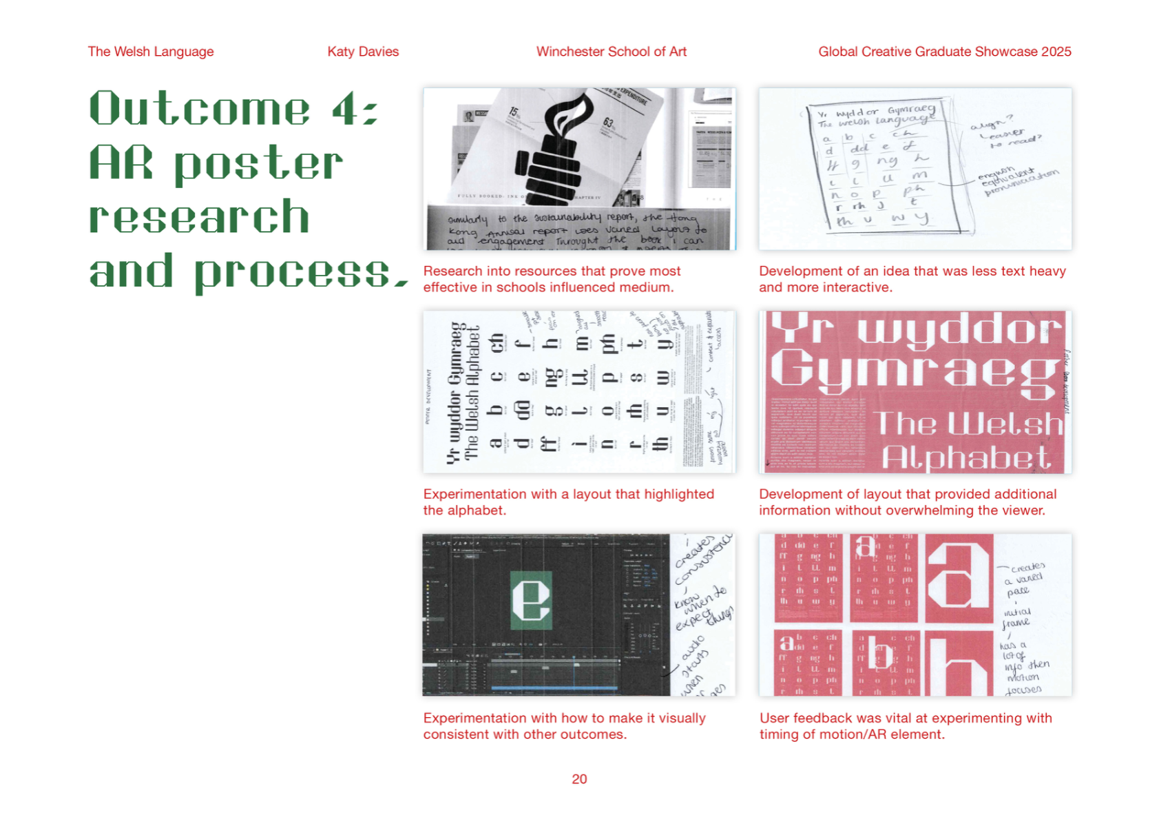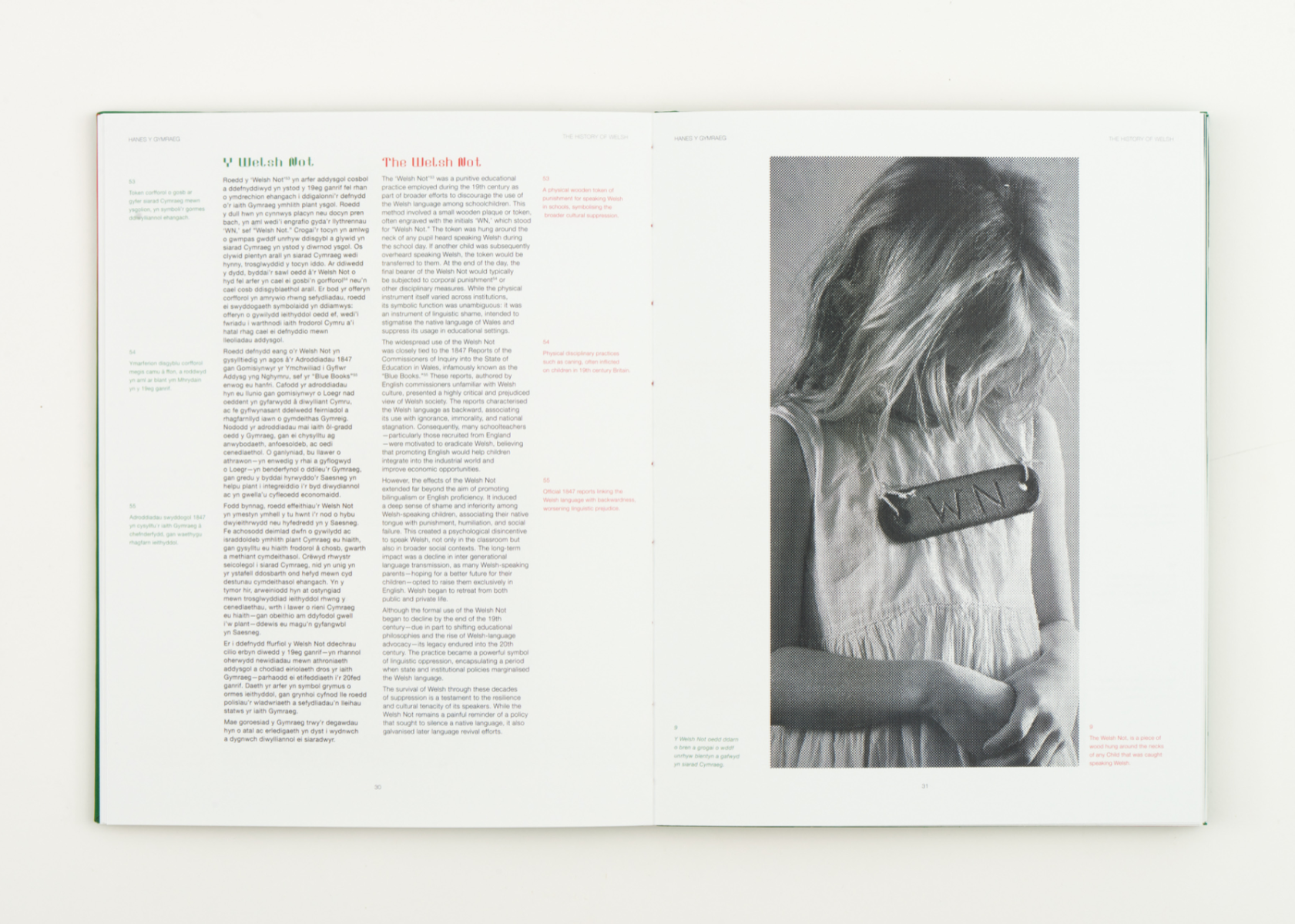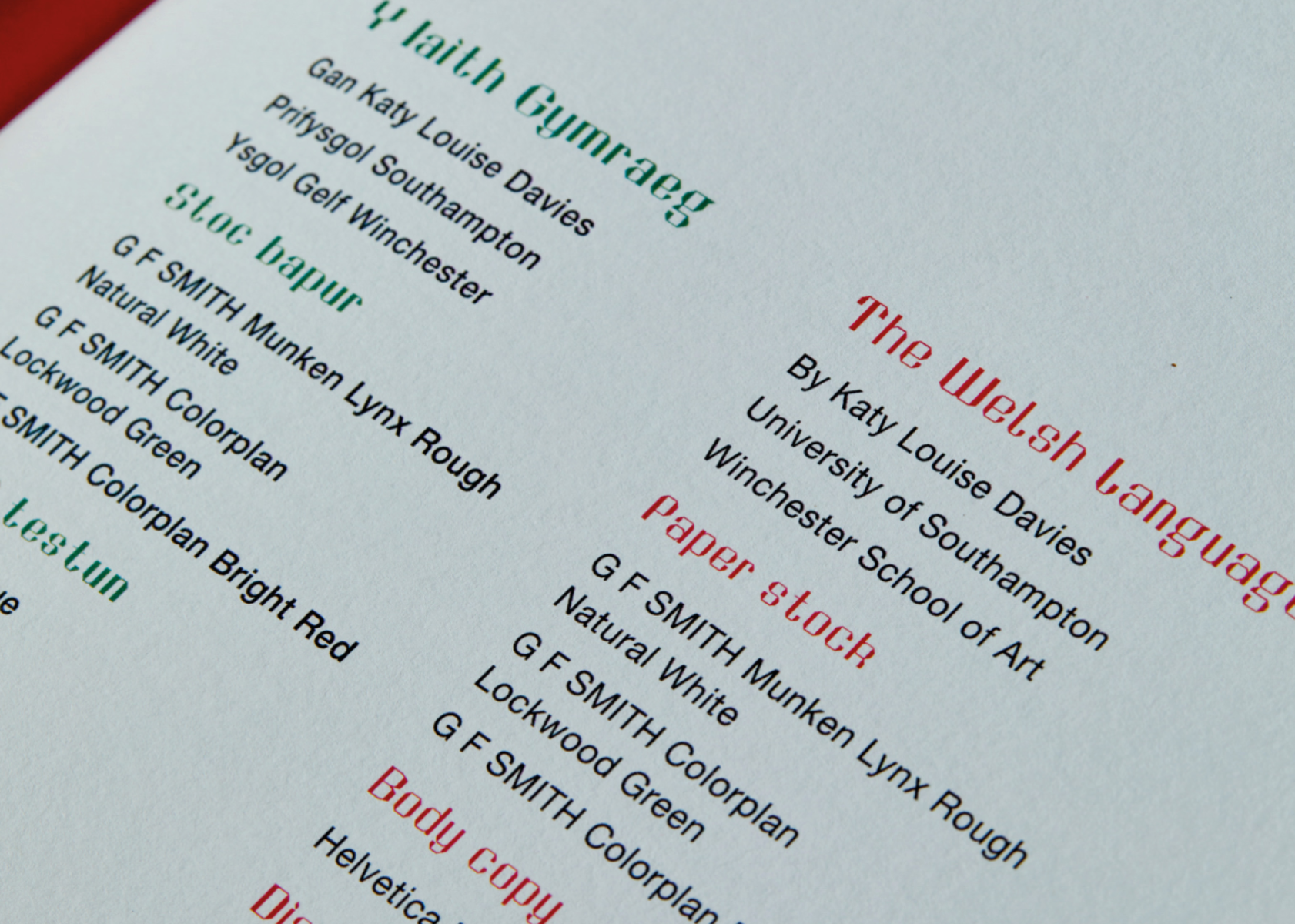 Created in response to Cymraeg 2050, aiming for more Welsh speakers, my project celebrates the Welsh language as a vital part of cultural identity, whilst functioning as learning resources. The bilingual publication challenges the dominance of English by placing Welsh at the centre of its design and structure. AR features support learning and pronunciation, while my custom typeface, Hanes Modern, inspired by early Welsh manuscripts and designed to bring the heritage of Welsh identity into a modern context. This is shown in a type specimen alongside the main publication.