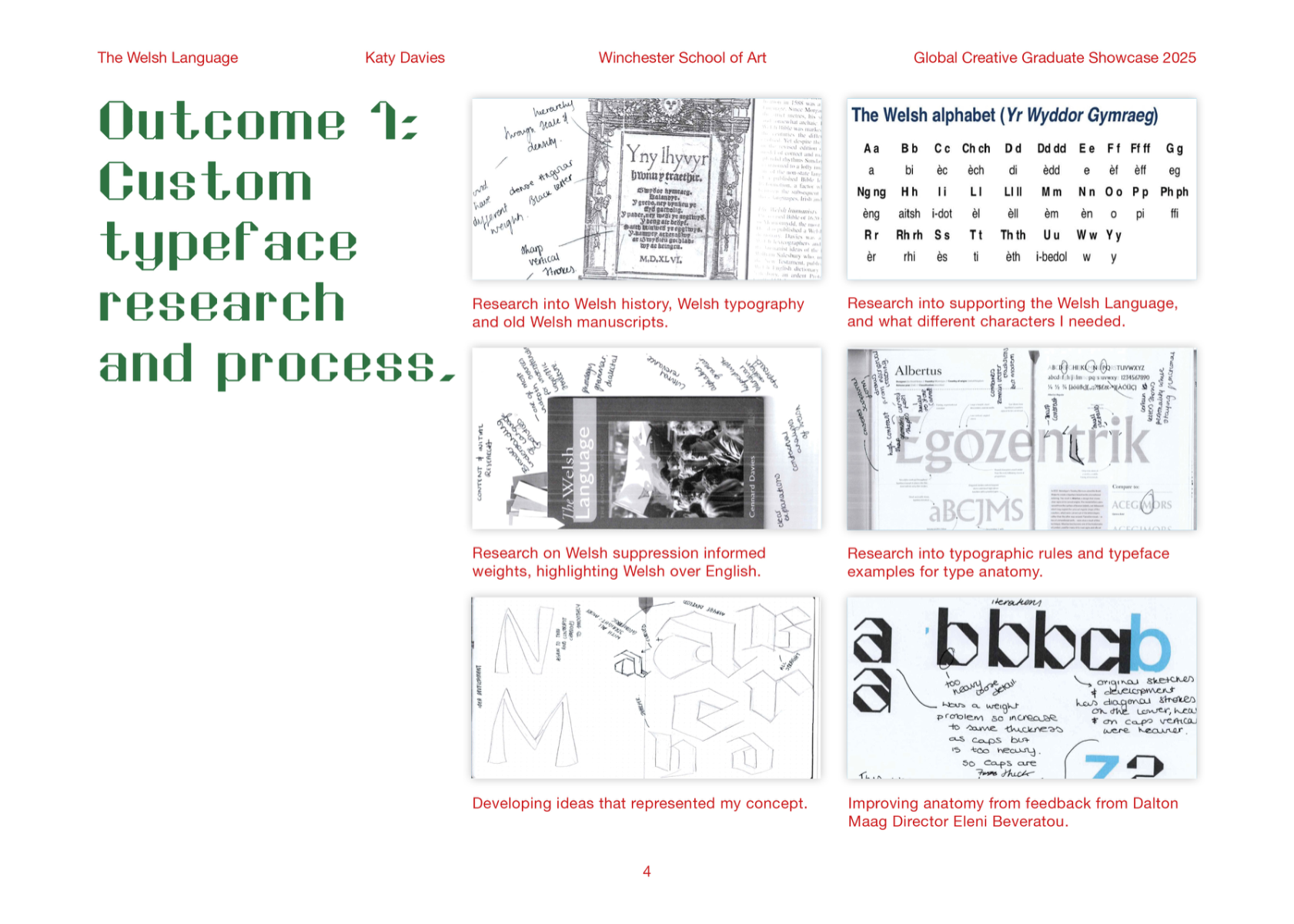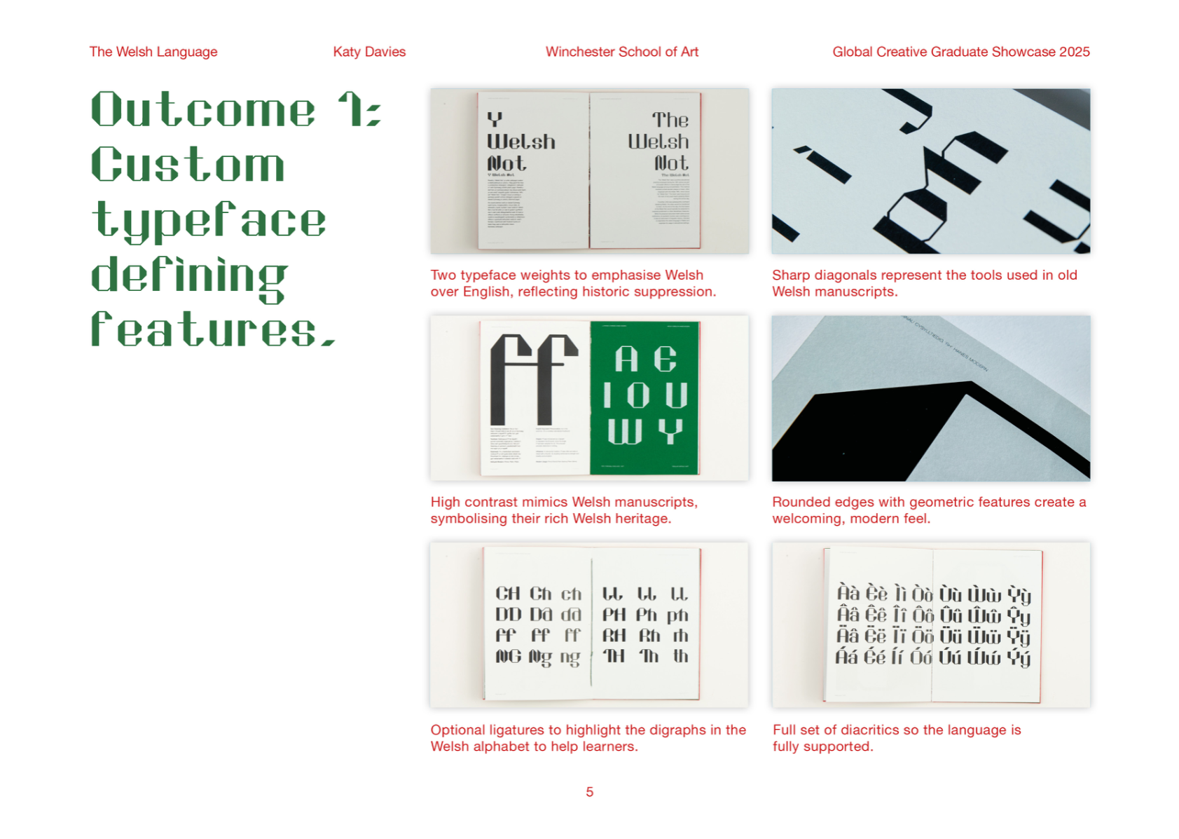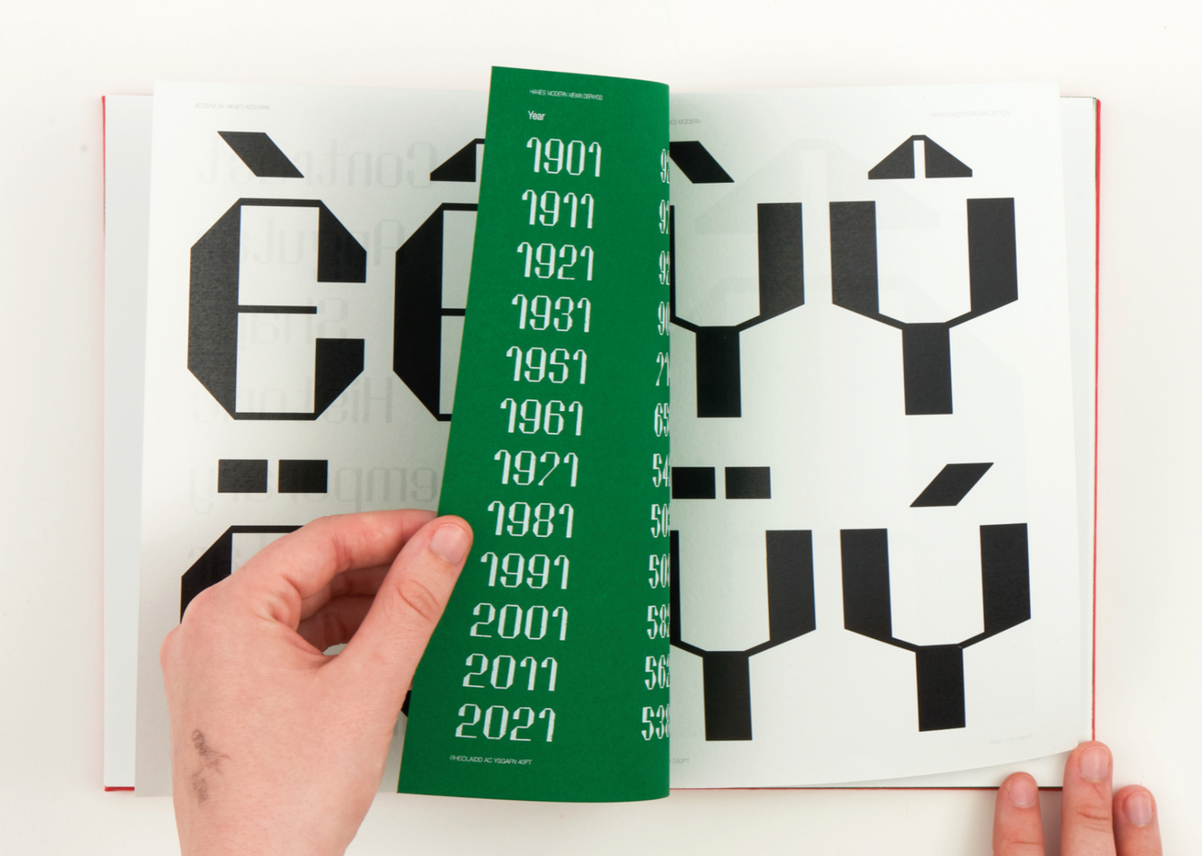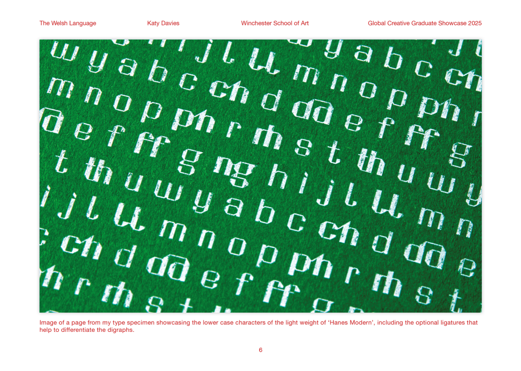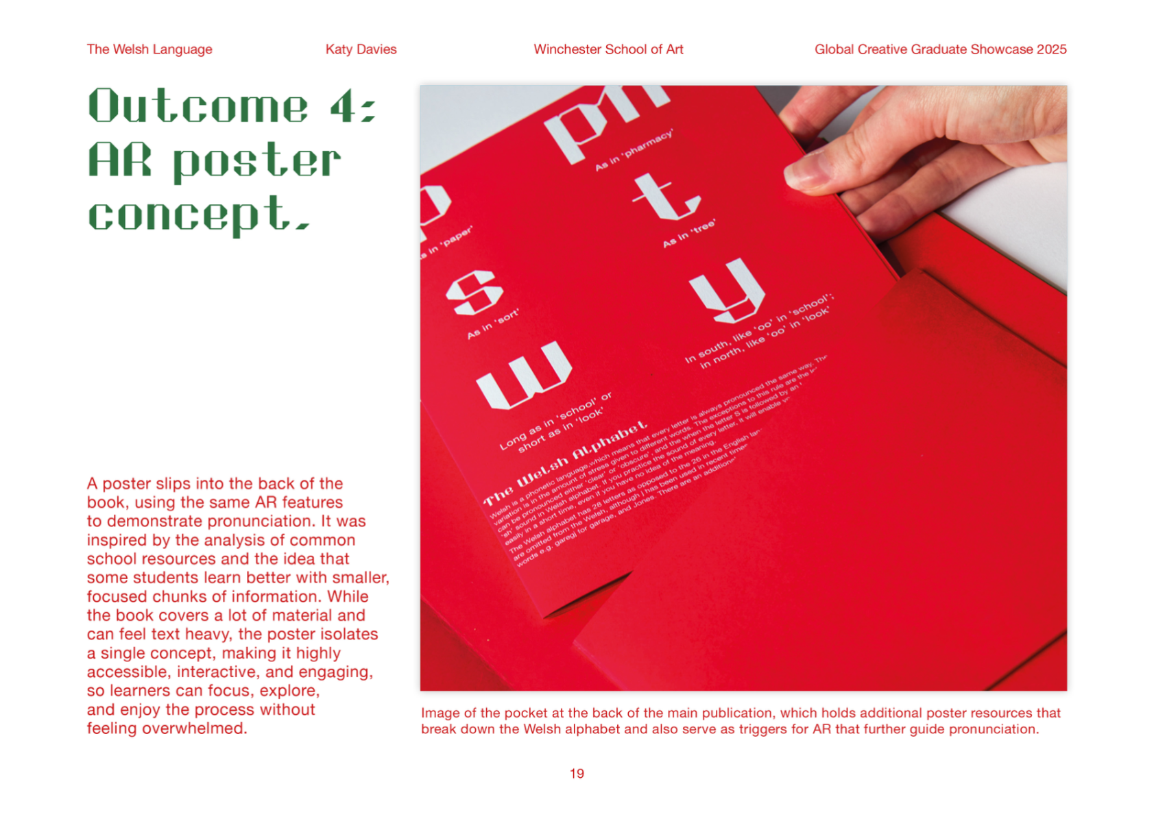 Created in response to Cymraeg 2050, aiming for more Welsh speakers, my project celebrates the Welsh language as a vital part of cultural identity, whilst functioning as learning resources. The bilingual publication challenges the dominance of English by placing Welsh at the centre of its design and structure. AR features support learning and pronunciation, while my custom typeface, Hanes Modern, inspired by early Welsh manuscripts and designed to bring the heritage of Welsh identity into a modern context. This is shown in a type specimen alongside the main publication.