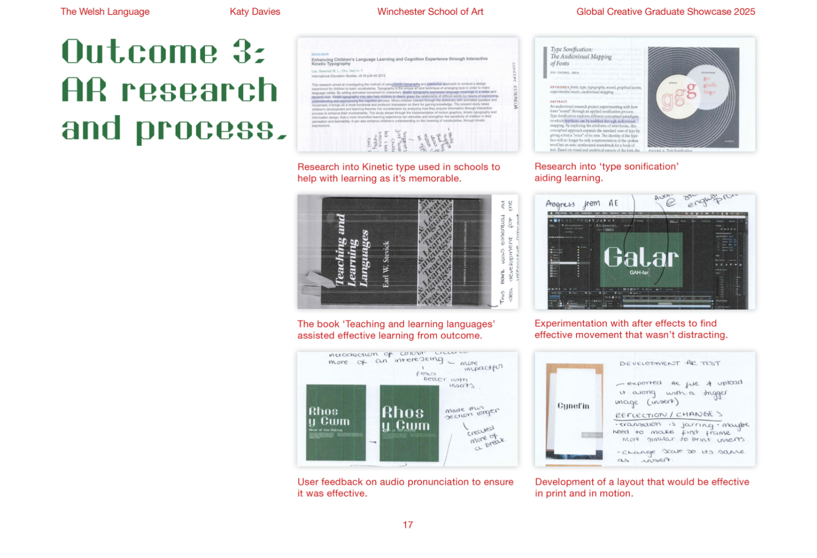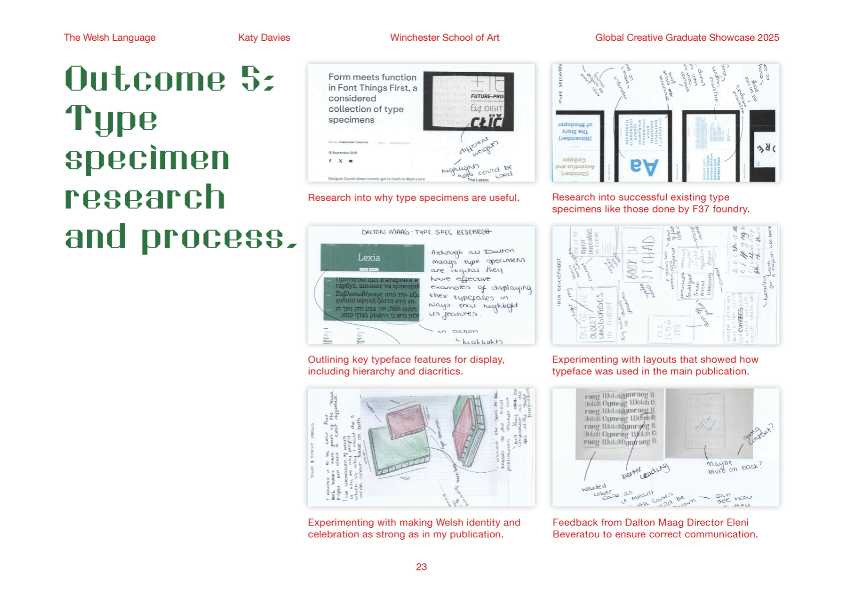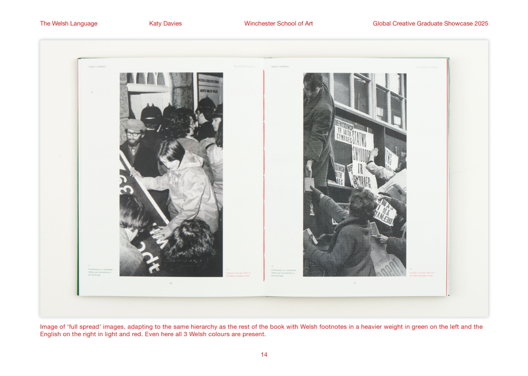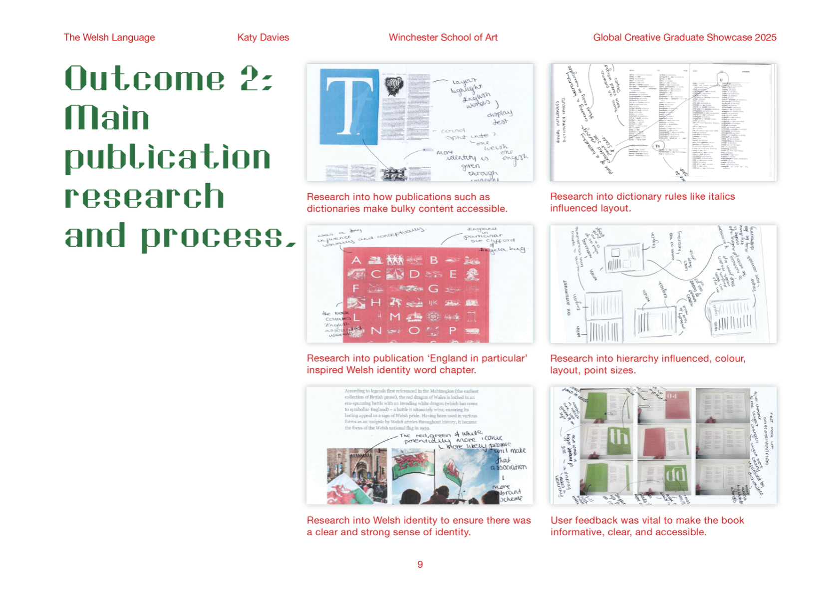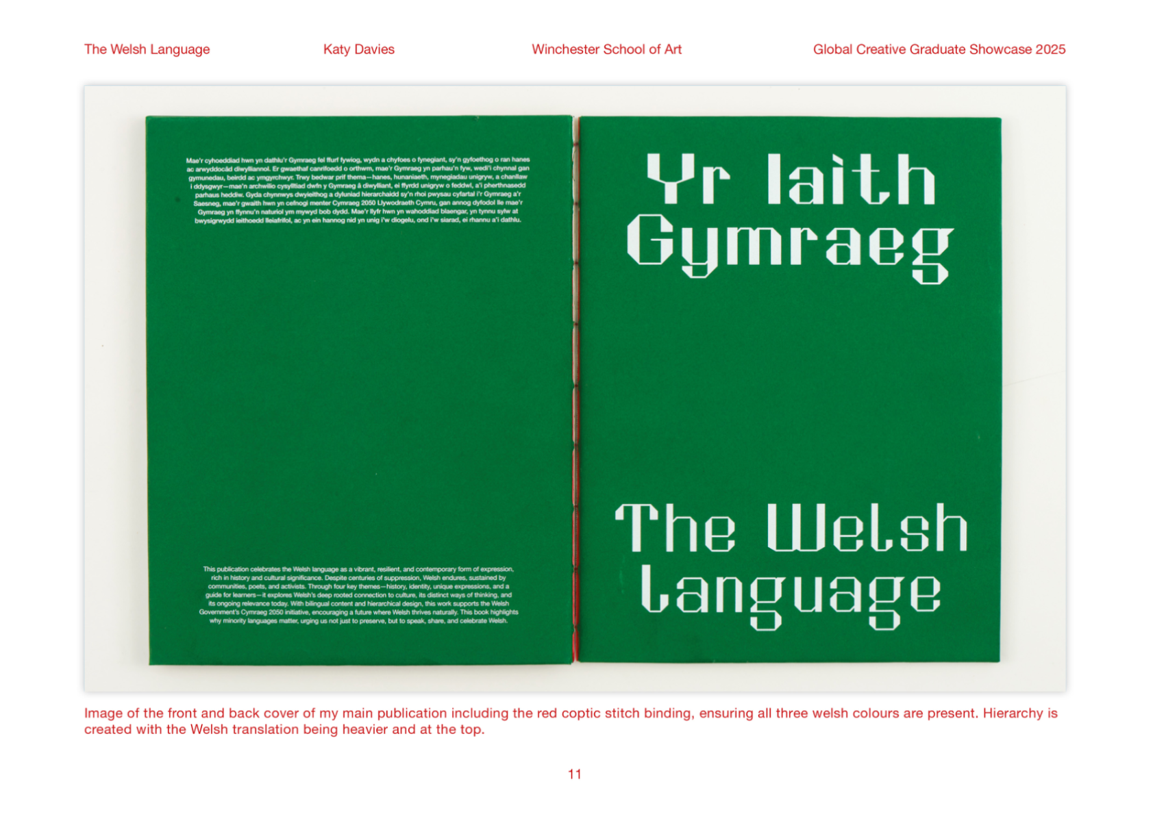 Created in response to Cymraeg 2050, aiming for more Welsh speakers, my project celebrates the Welsh language as a vital part of cultural identity, whilst functioning as learning resources. The bilingual publication challenges the dominance of English by placing Welsh at the centre of its design and structure. AR features support learning and pronunciation, while my custom typeface, Hanes Modern, inspired by early Welsh manuscripts and designed to bring the heritage of Welsh identity into a modern context. This is shown in a type specimen alongside the main publication.