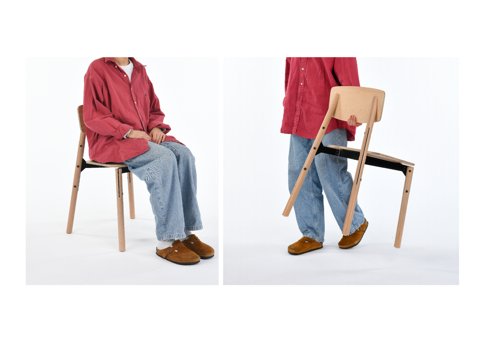 A domestic side chair that is able to fit easily within a box. The chair is constructed from parts that can be dismantled into it's component parts, fitting into a box that is hand-held. Making it easy to transport from warehouse, to shop, to home. This project transformed into an investigation into stability from disassembling component parts. Refining the chair's form through its function as a disassembling product. Working within the constraints of disassembly, the chair's design process explored structural and manufacturing possibilities evolving from welded frames to a bolted frame celebrating the satisfaction and accomplishment of self-assembly.