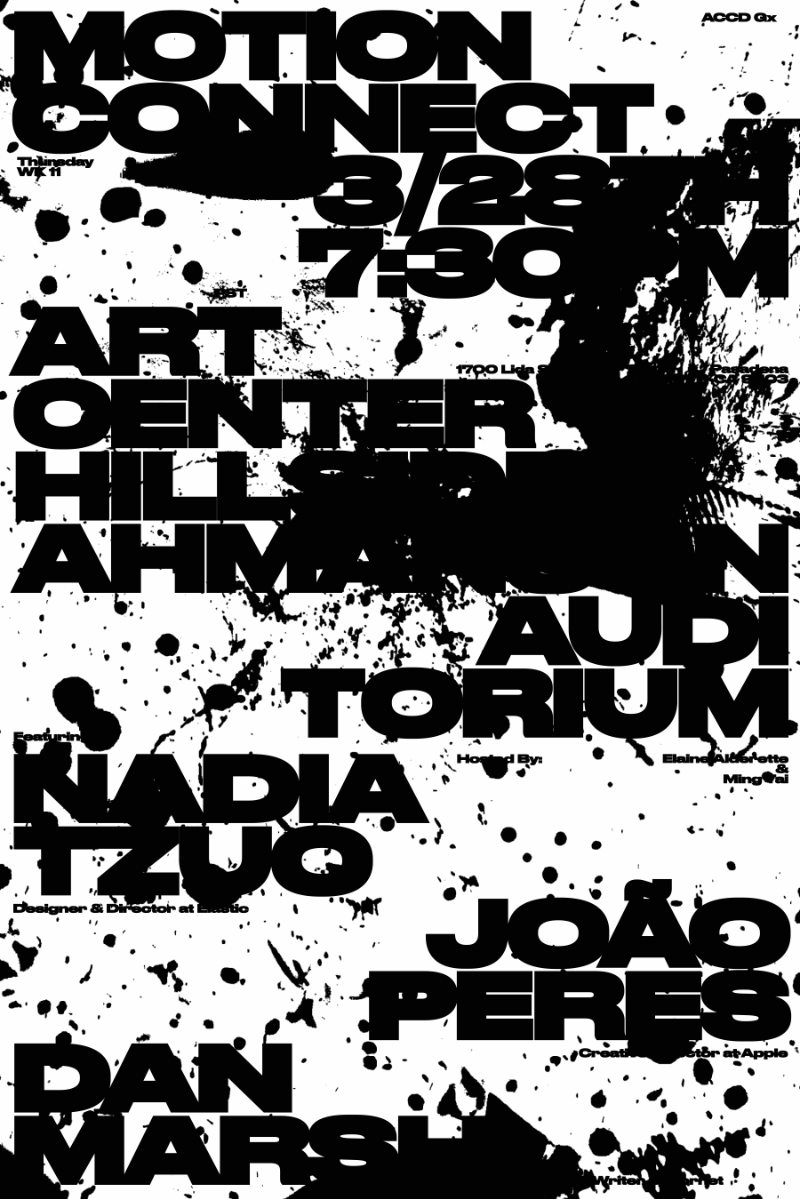 By pushing fundamental design components—color, composition, typography, and imagery—to their extremes, this approach creates a visually striking and complex identity for ArtCenter’s Spring 2024 Motion Connect event, capturing attention and redefining the capabilities of simplicity.
