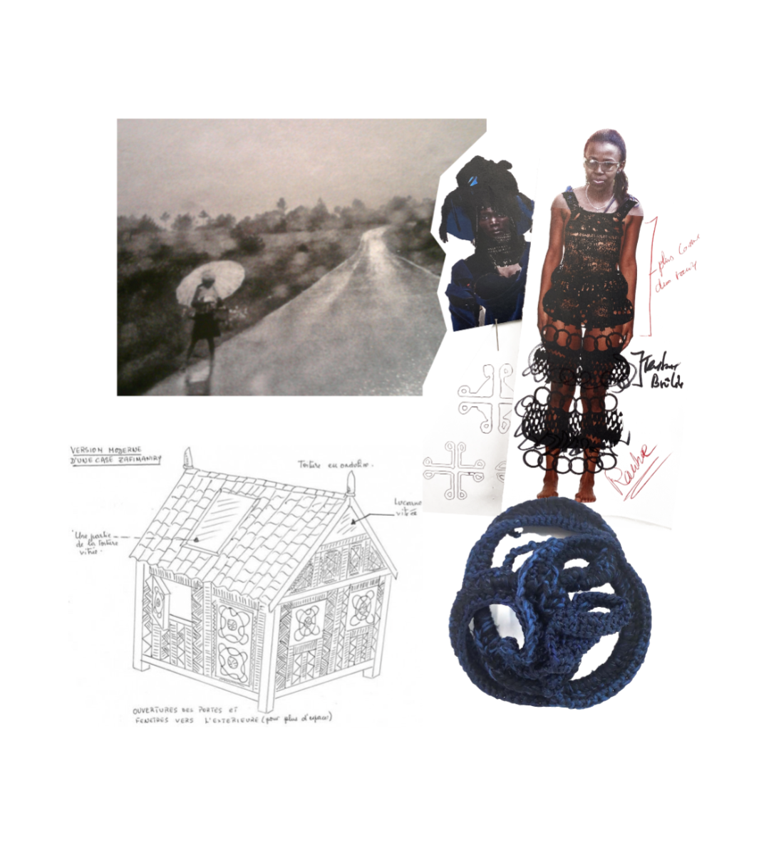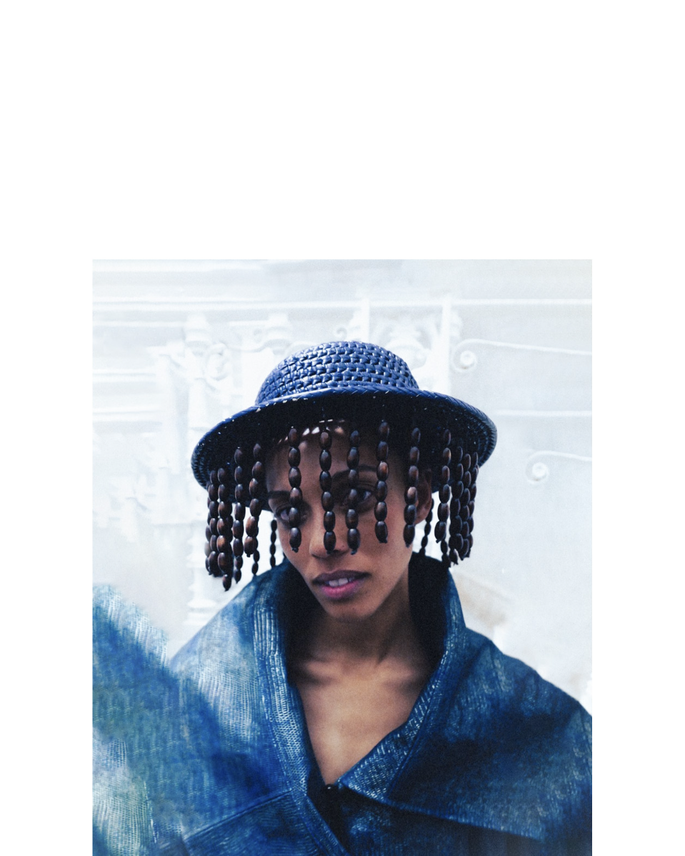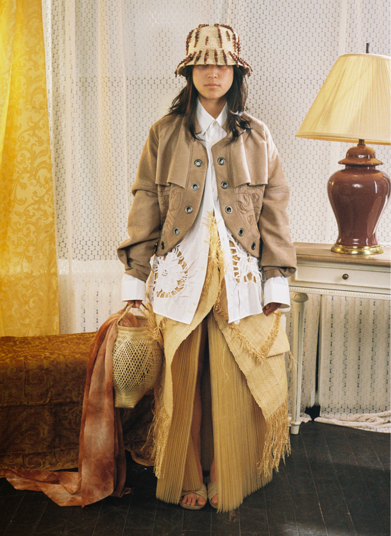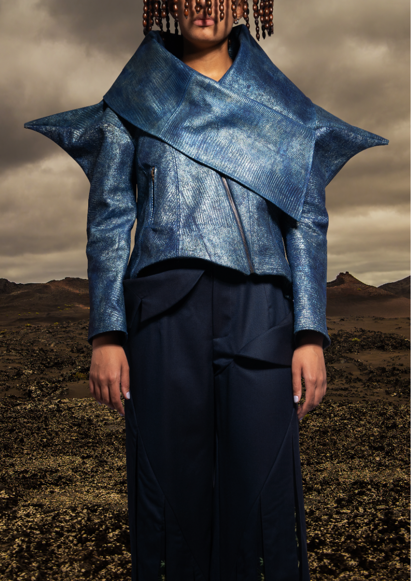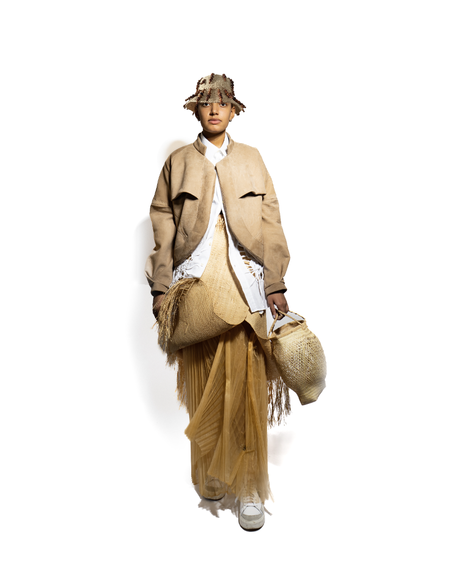 Influenced by her Swiss-Malagasy background, she merges minimalism from Swiss culture with the historical and natural essence of Malagasy heritage. Science fiction guides her exploration of this duality, while her designs reflect how colonial history and African roots shape body perceptions. Her collection harmonizes deadstock leather, raffia fibers, and intricate silhouettes, interweaving identity in expansive and snug forms.