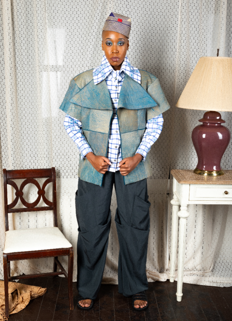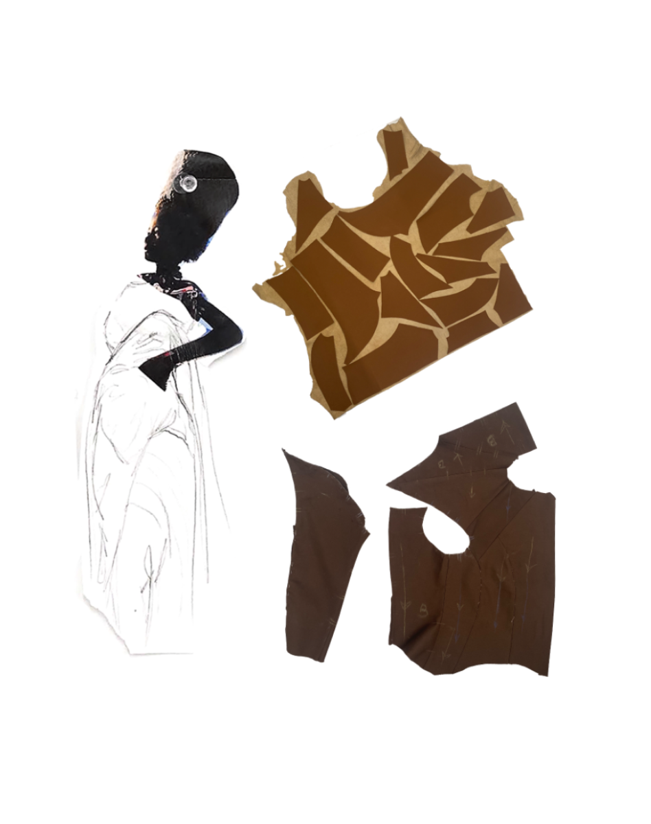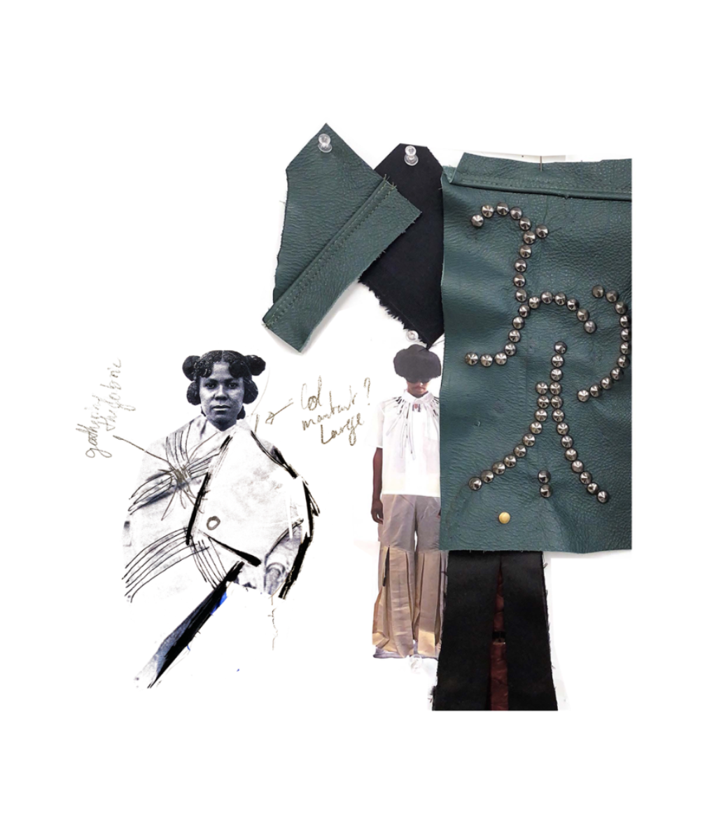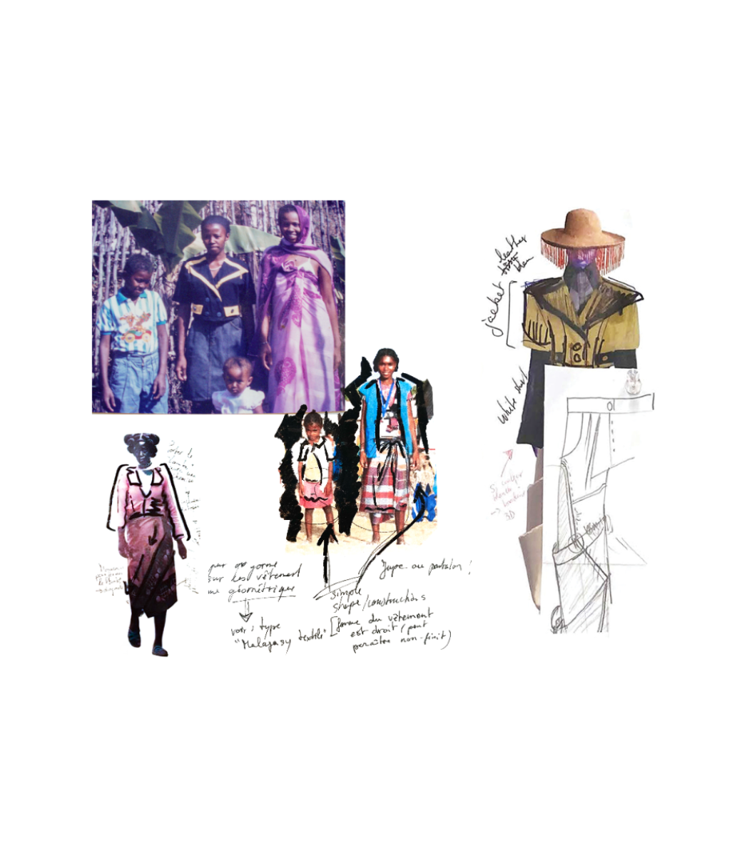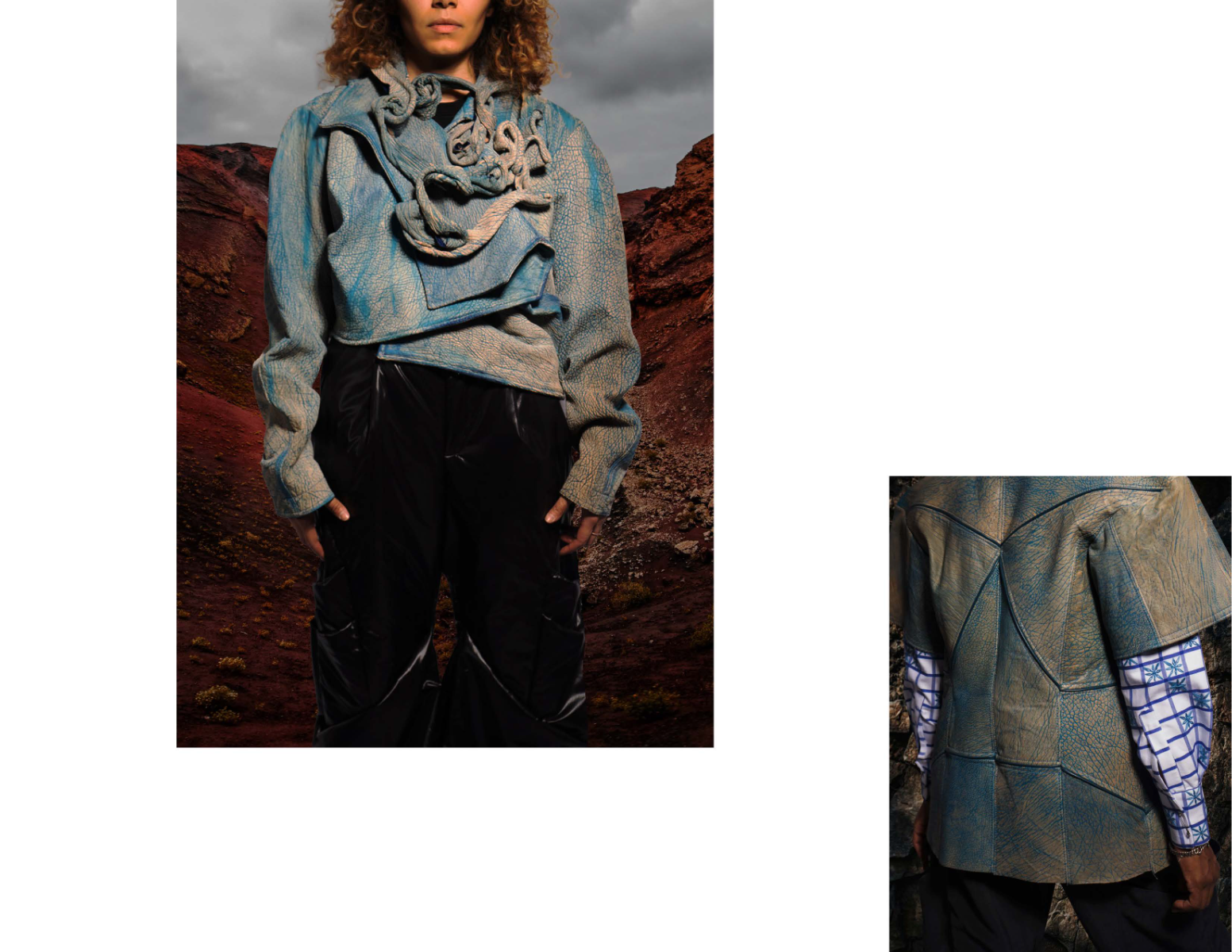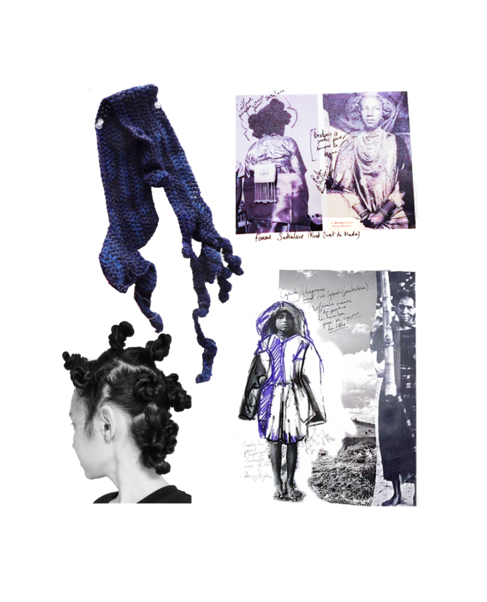 Influenced by her Swiss-Malagasy background, she merges minimalism from Swiss culture with the historical and natural essence of Malagasy heritage. Science fiction guides her exploration of this duality, while her designs reflect how colonial history and African roots shape body perceptions. Her collection harmonizes deadstock leather, raffia fibers, and intricate silhouettes, interweaving identity in expansive and snug forms.