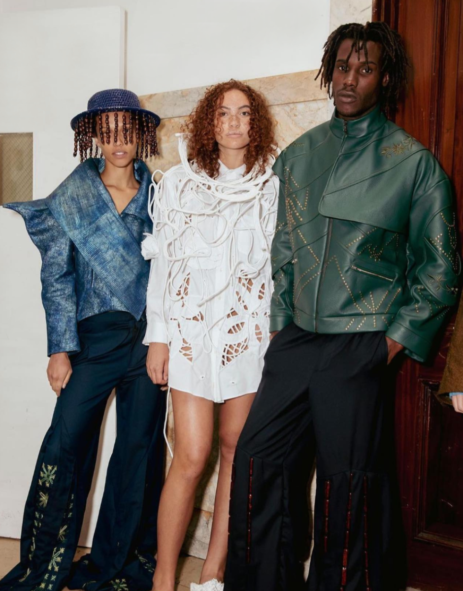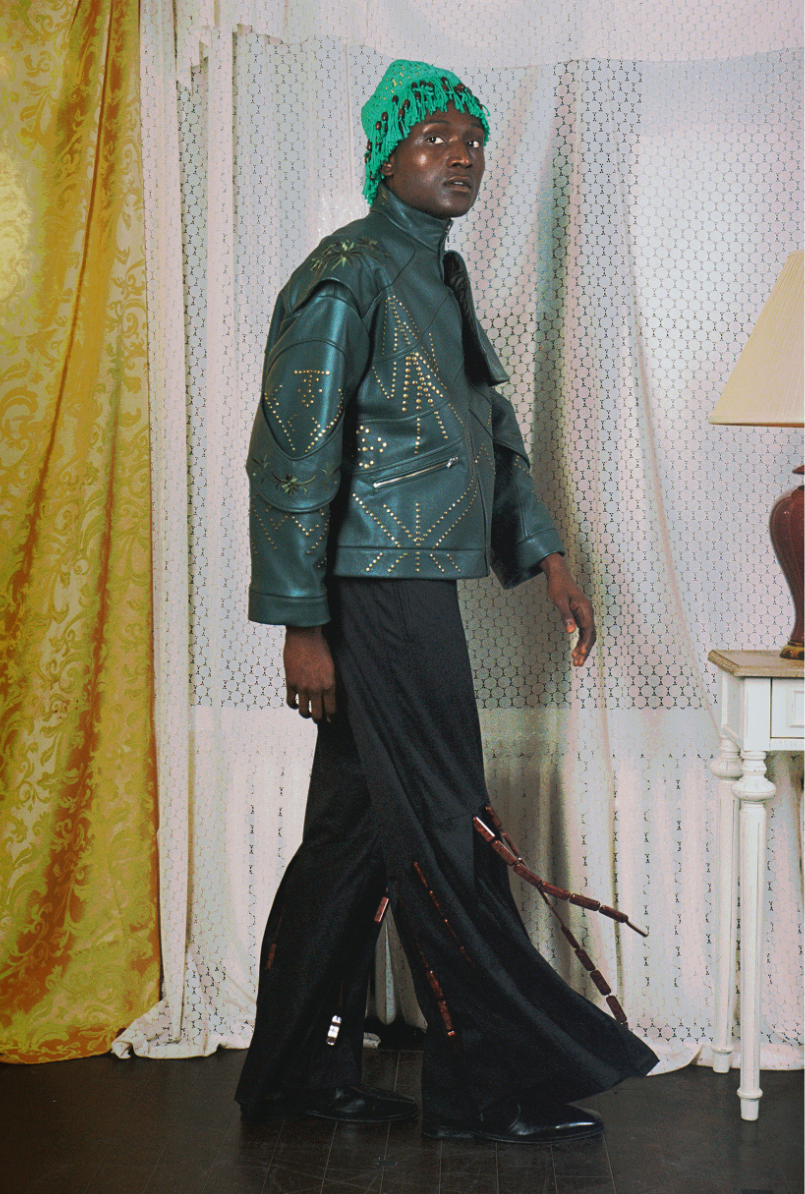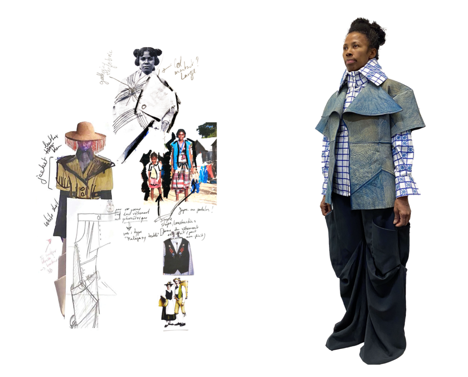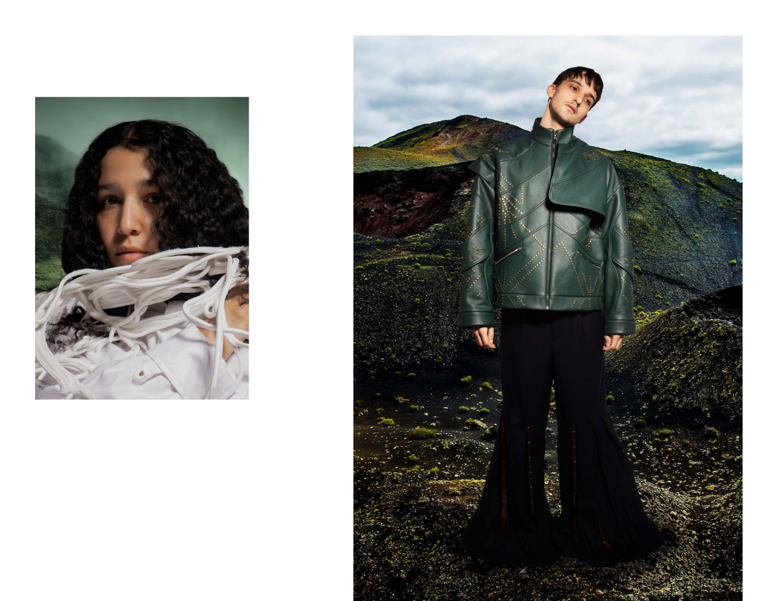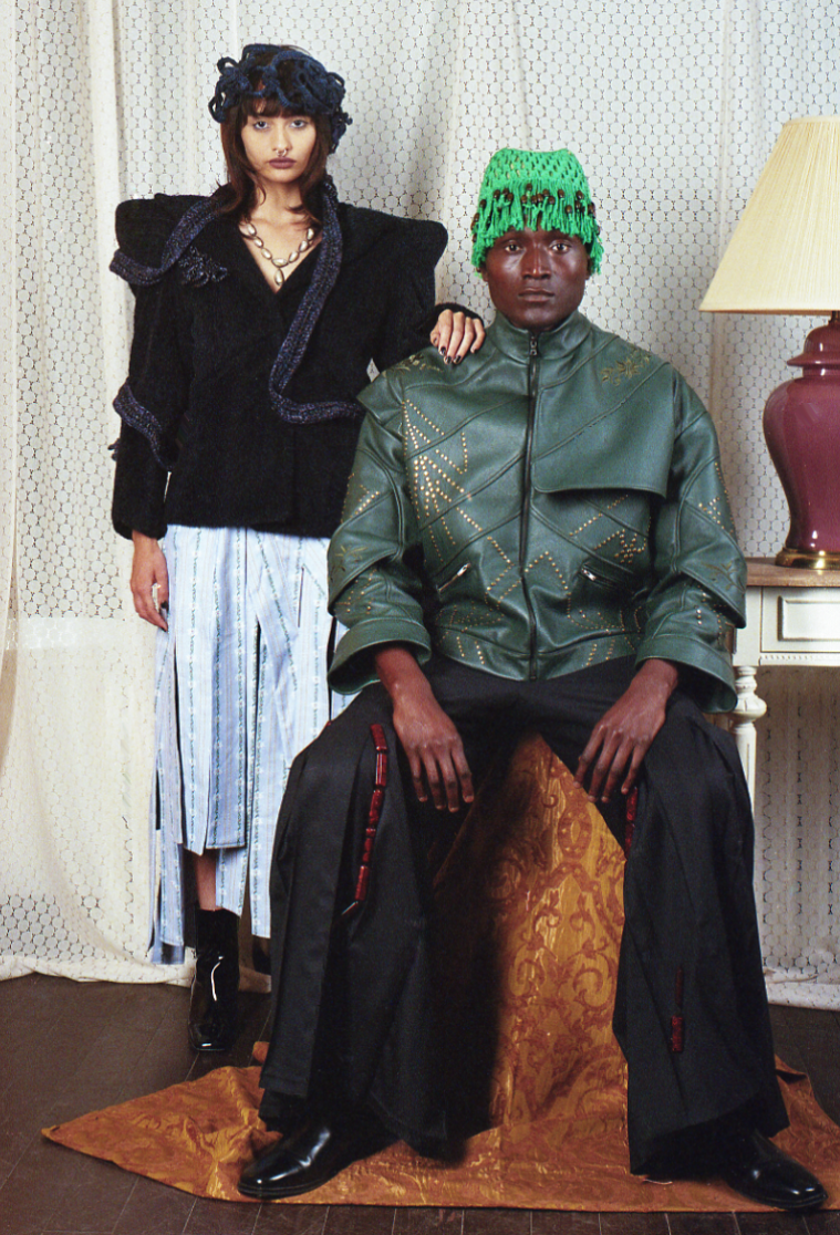 Influenced by her Swiss-Malagasy background, she merges minimalism from Swiss culture with the historical and natural essence of Malagasy heritage. Science fiction guides her exploration of this duality, while her designs reflect how colonial history and African roots shape body perceptions. Her collection harmonizes deadstock leather, raffia fibers, and intricate silhouettes, interweaving identity in expansive and snug forms.