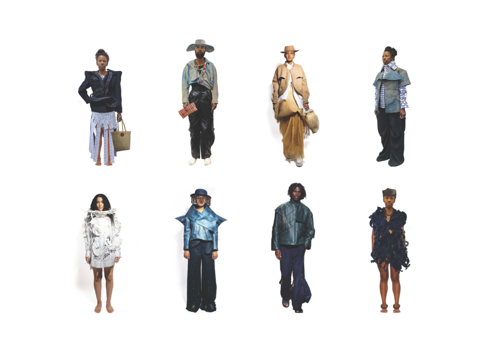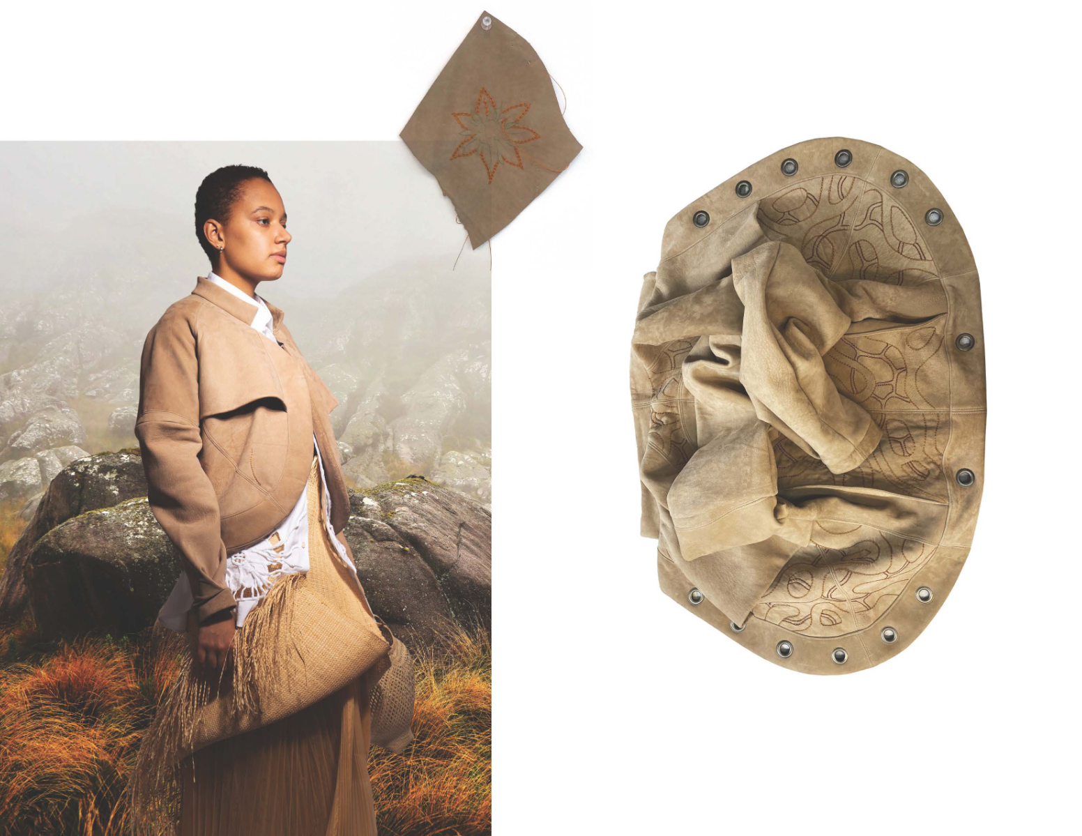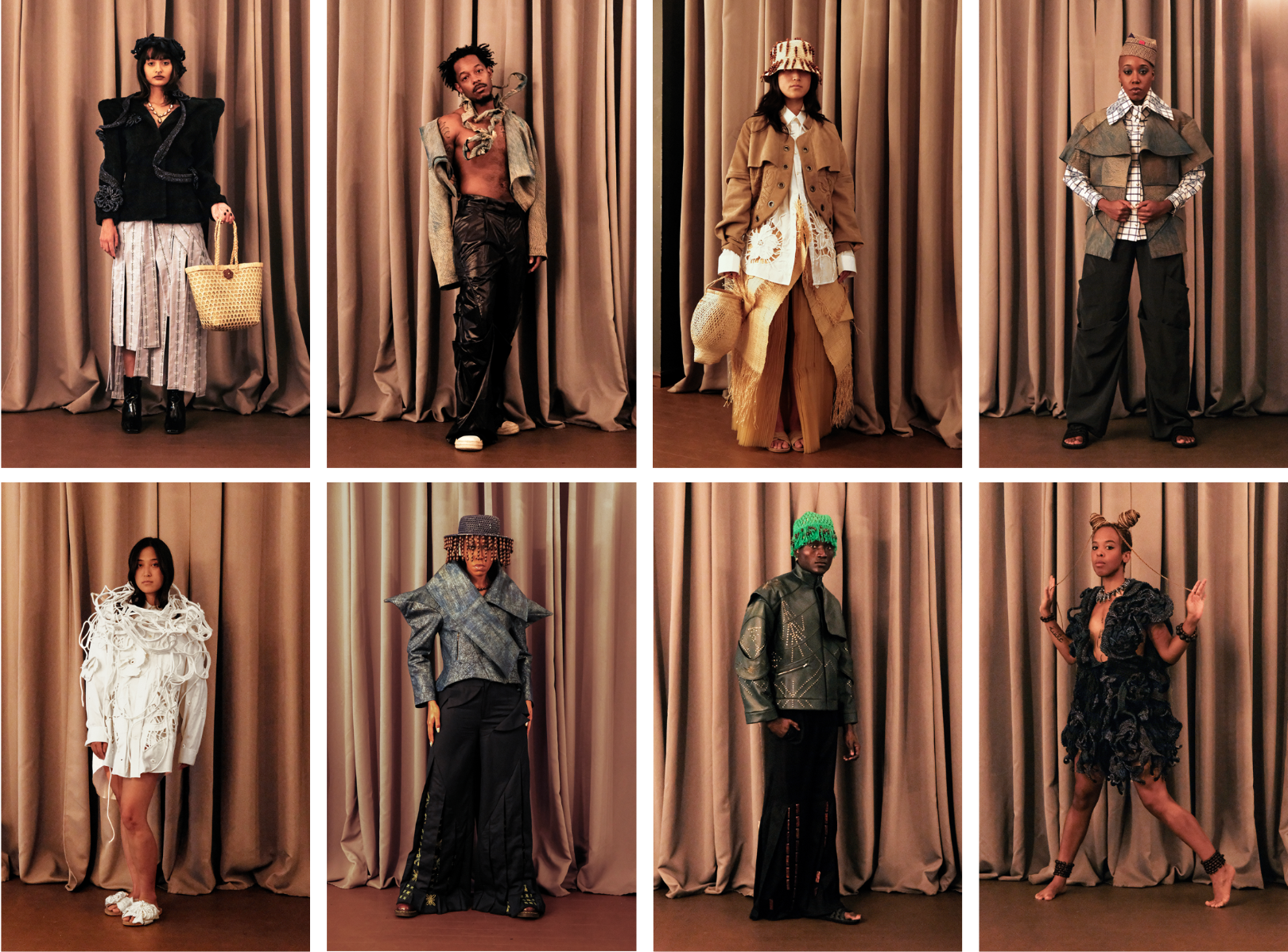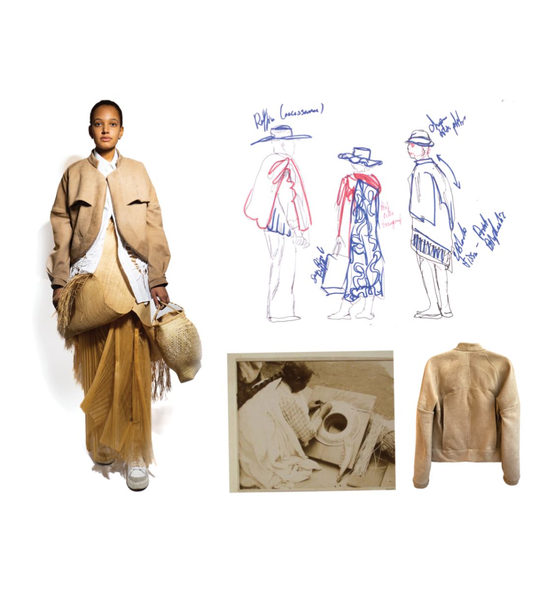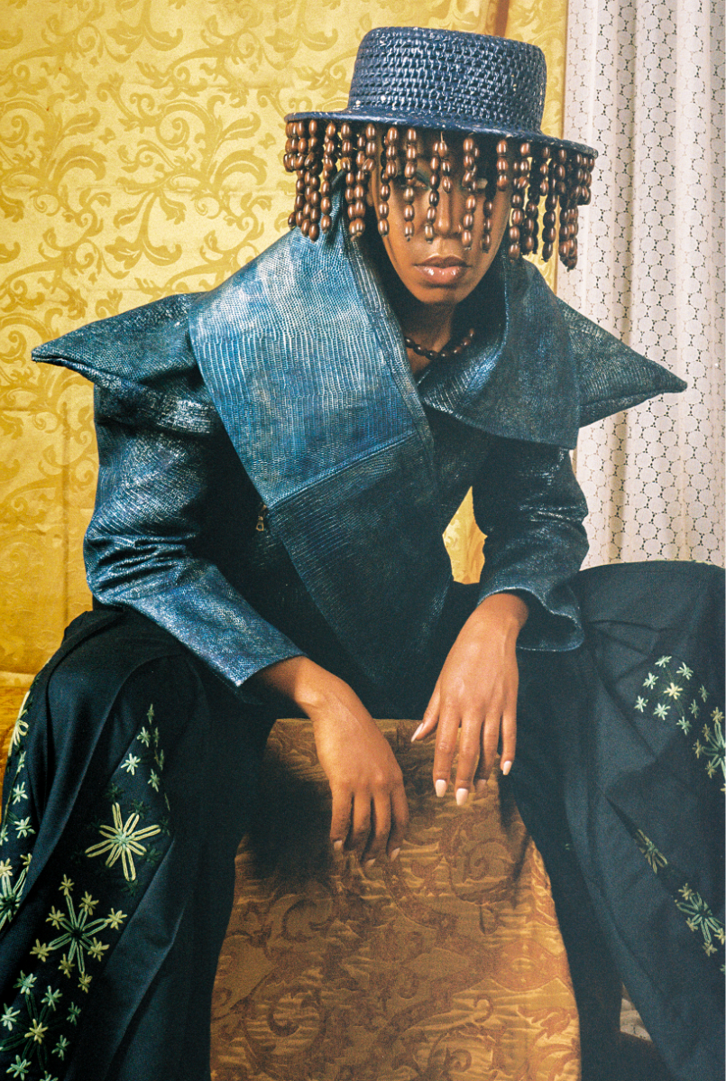 Influenced by her Swiss-Malagasy background, she merges minimalism from Swiss culture with the historical and natural essence of Malagasy heritage. Science fiction guides her exploration of this duality, while her designs reflect how colonial history and African roots shape body perceptions. Her collection harmonizes deadstock leather, raffia fibers, and intricate silhouettes, interweaving identity in expansive and snug forms.