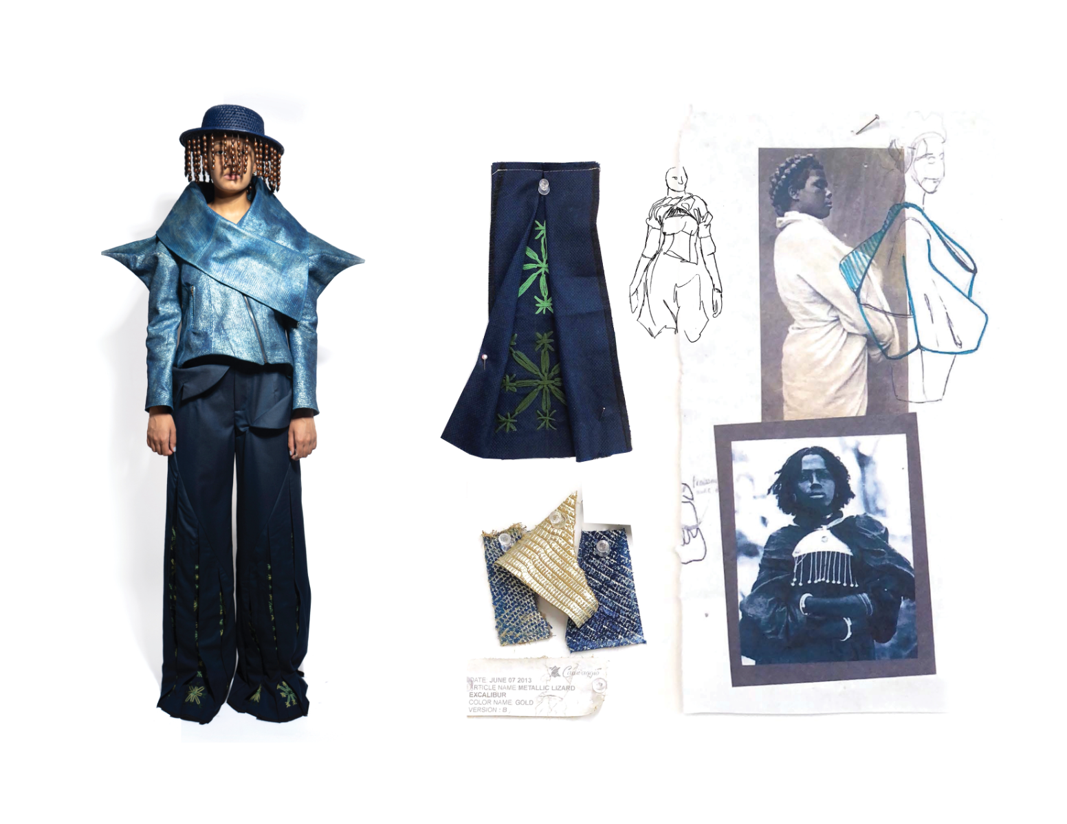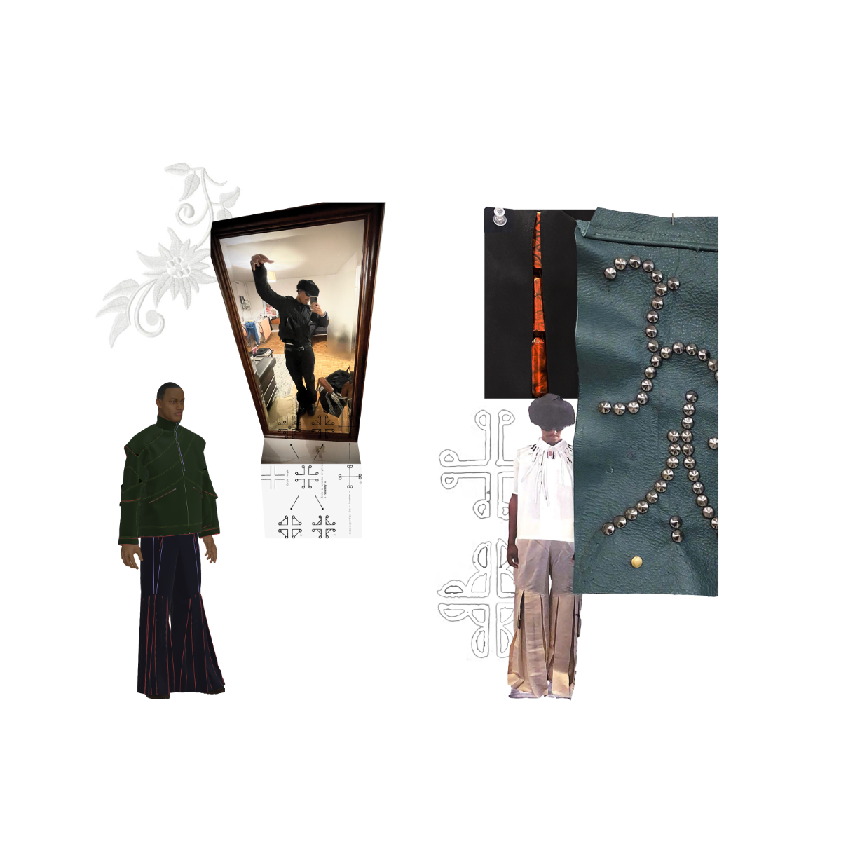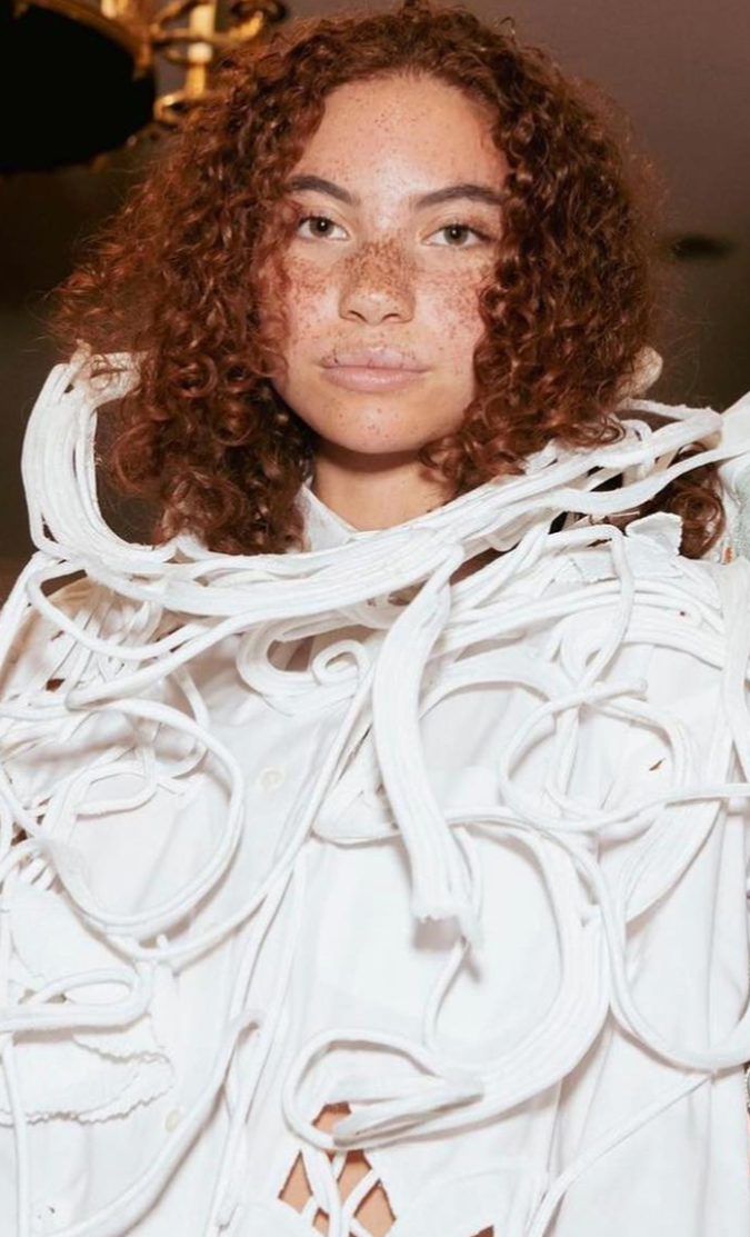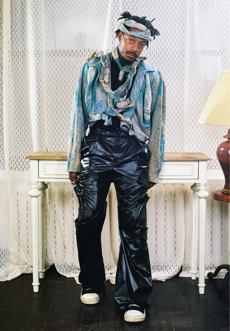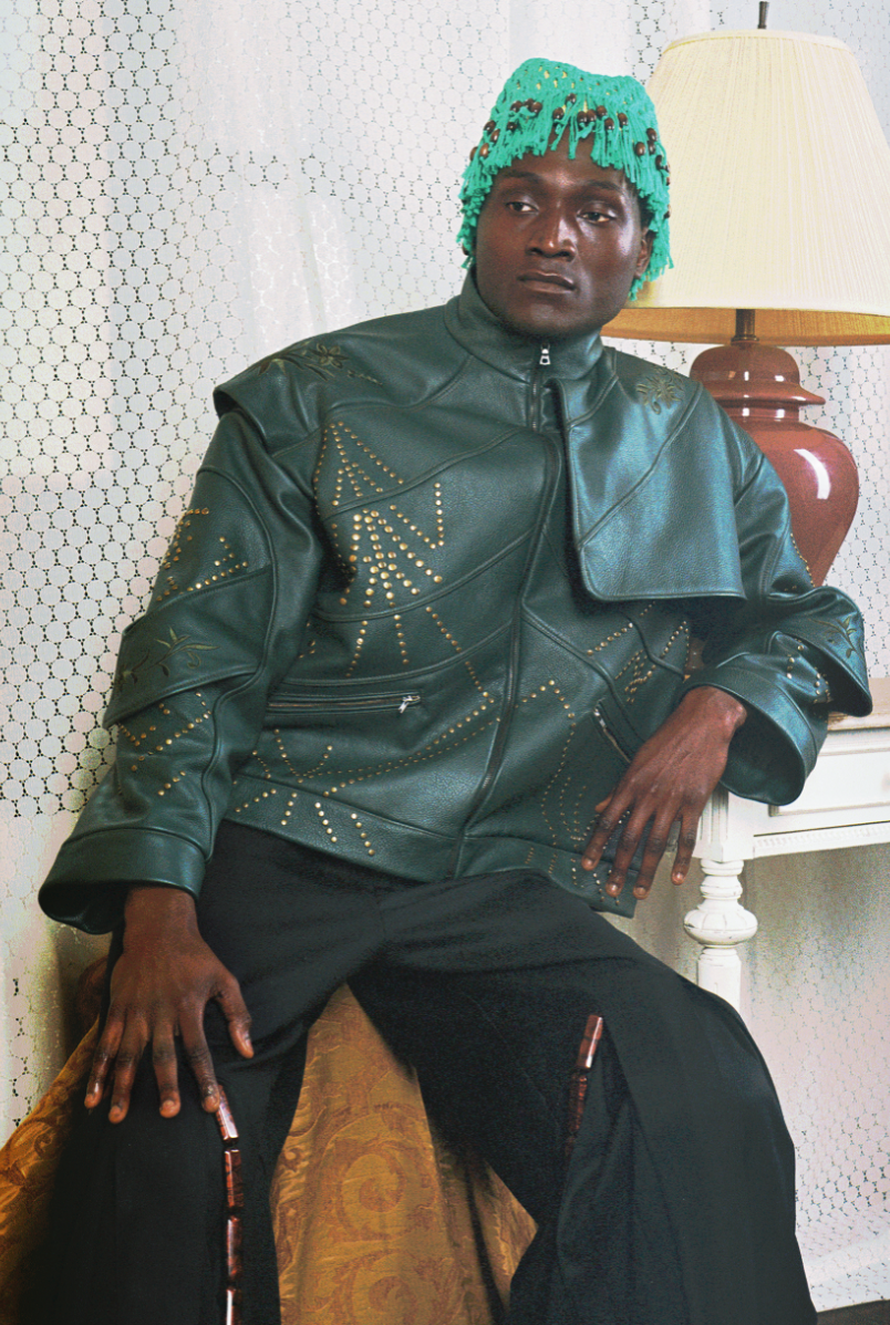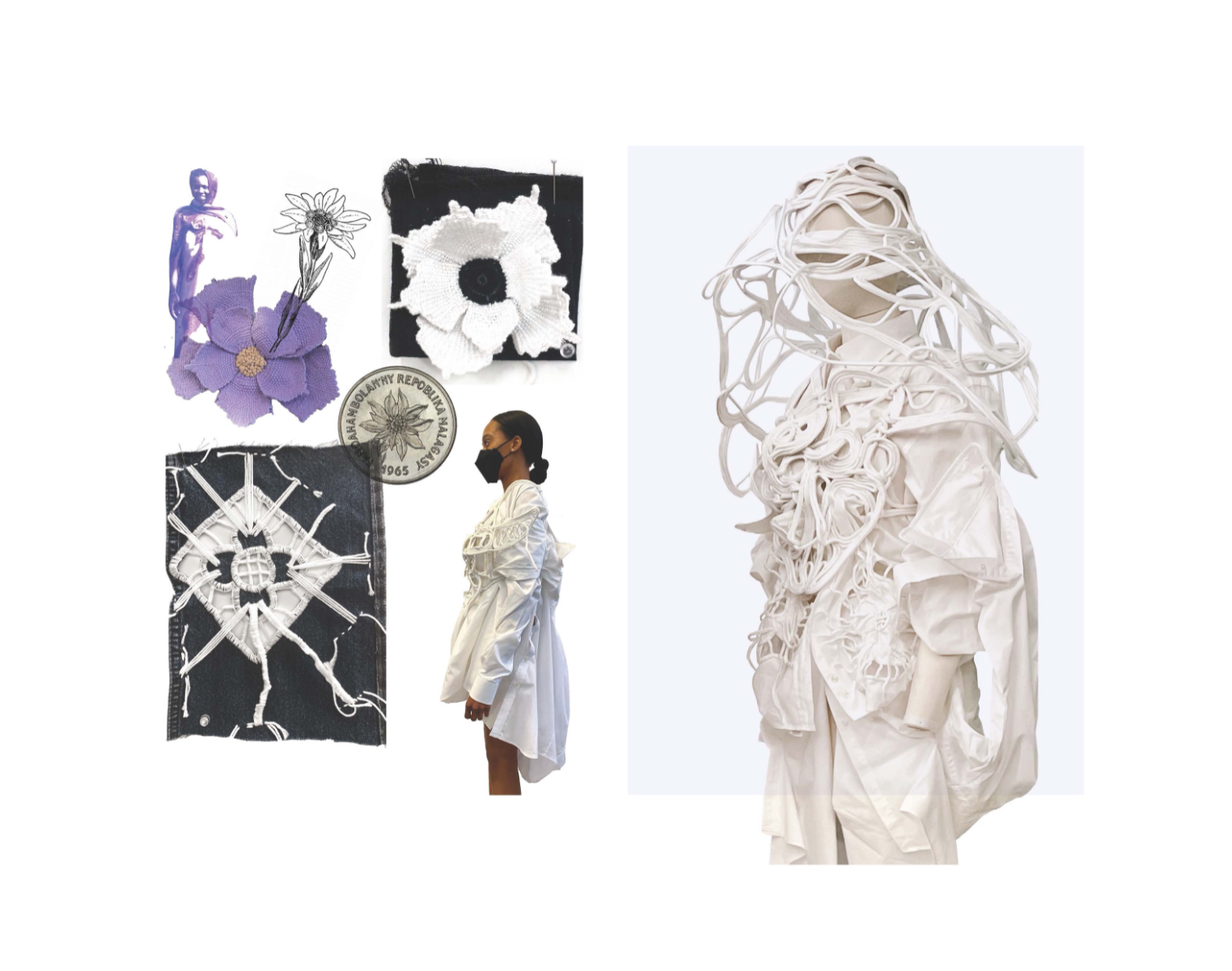 Influenced by her Swiss-Malagasy background, she merges minimalism from Swiss culture with the historical and natural essence of Malagasy heritage. Science fiction guides her exploration of this duality, while her designs reflect how colonial history and African roots shape body perceptions. Her collection harmonizes deadstock leather, raffia fibers, and intricate silhouettes, interweaving identity in expansive and snug forms.