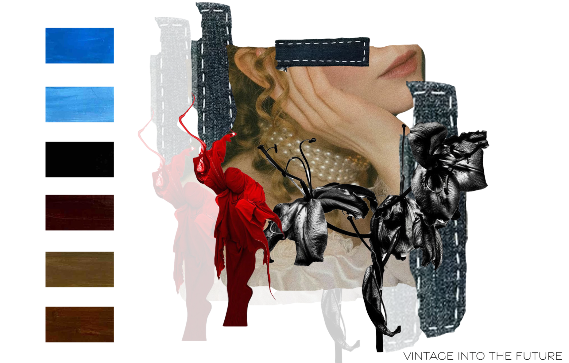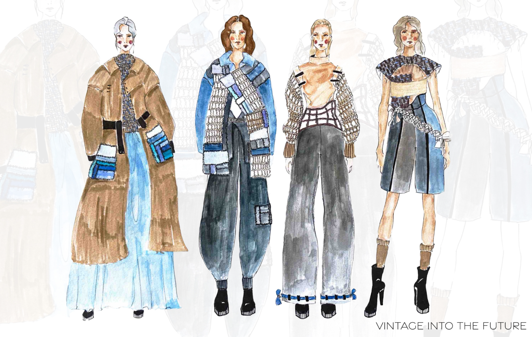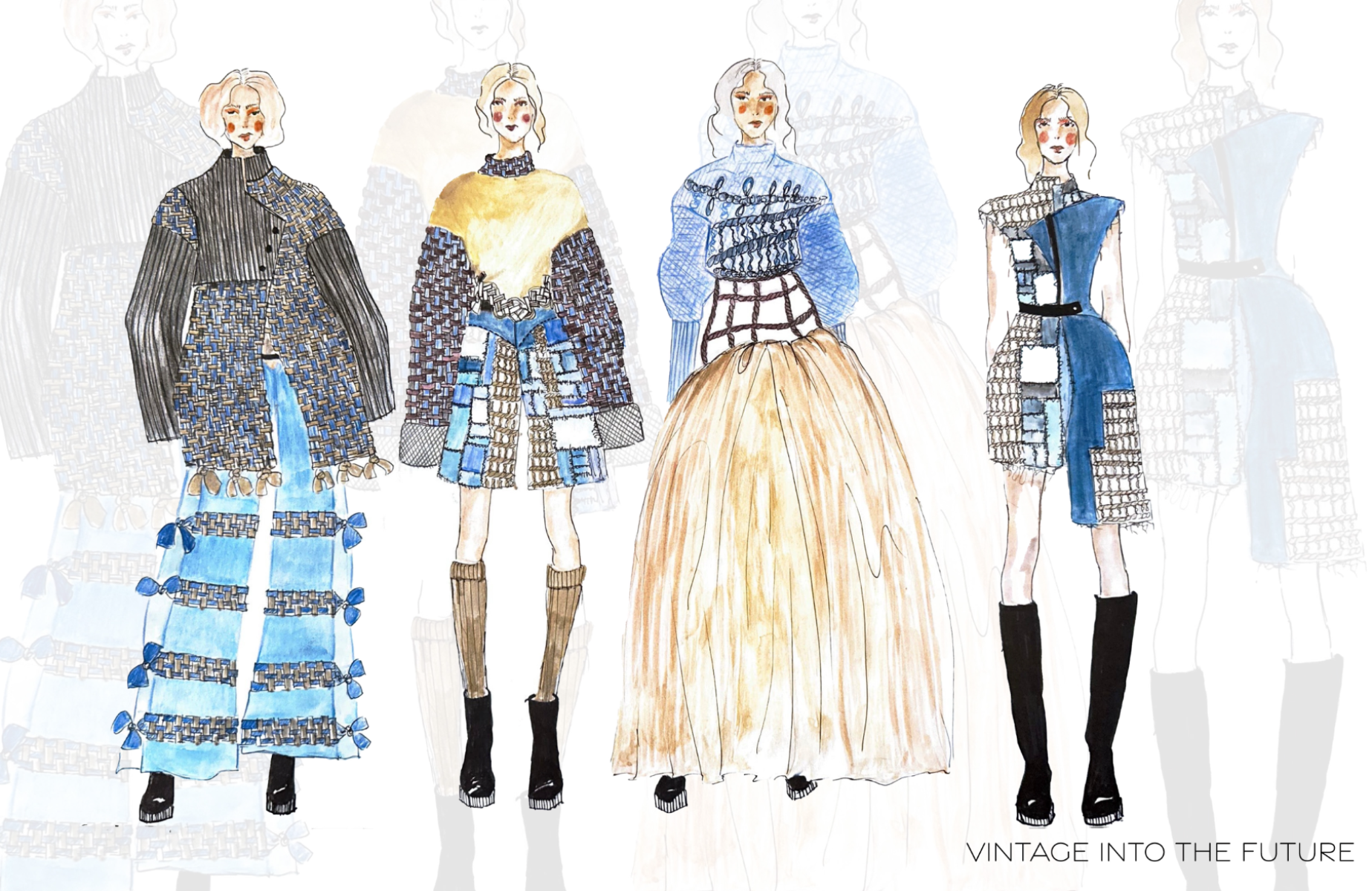 Vintage into the future collection is for Spring/Summer. The collection was inspired by an issue we face in the fashion industry, which is the waste and pollution of materials—the ability to repurpose these materials to create new, unique pieces for individuals. The collection targets individuals who enjoy unique, fun, and confident sustainable pieces. The collection embodies various sustainable and repurposed materials that incorporate yarn, denim, woven, and tulle. These are hand-woven to create a beautiful one-of-a-kind garment. The majority of the collection includes hues of blues, dark red, and beige to represent that spring feeling. It also brings comfort to those who enjoy sustainable fashion.
