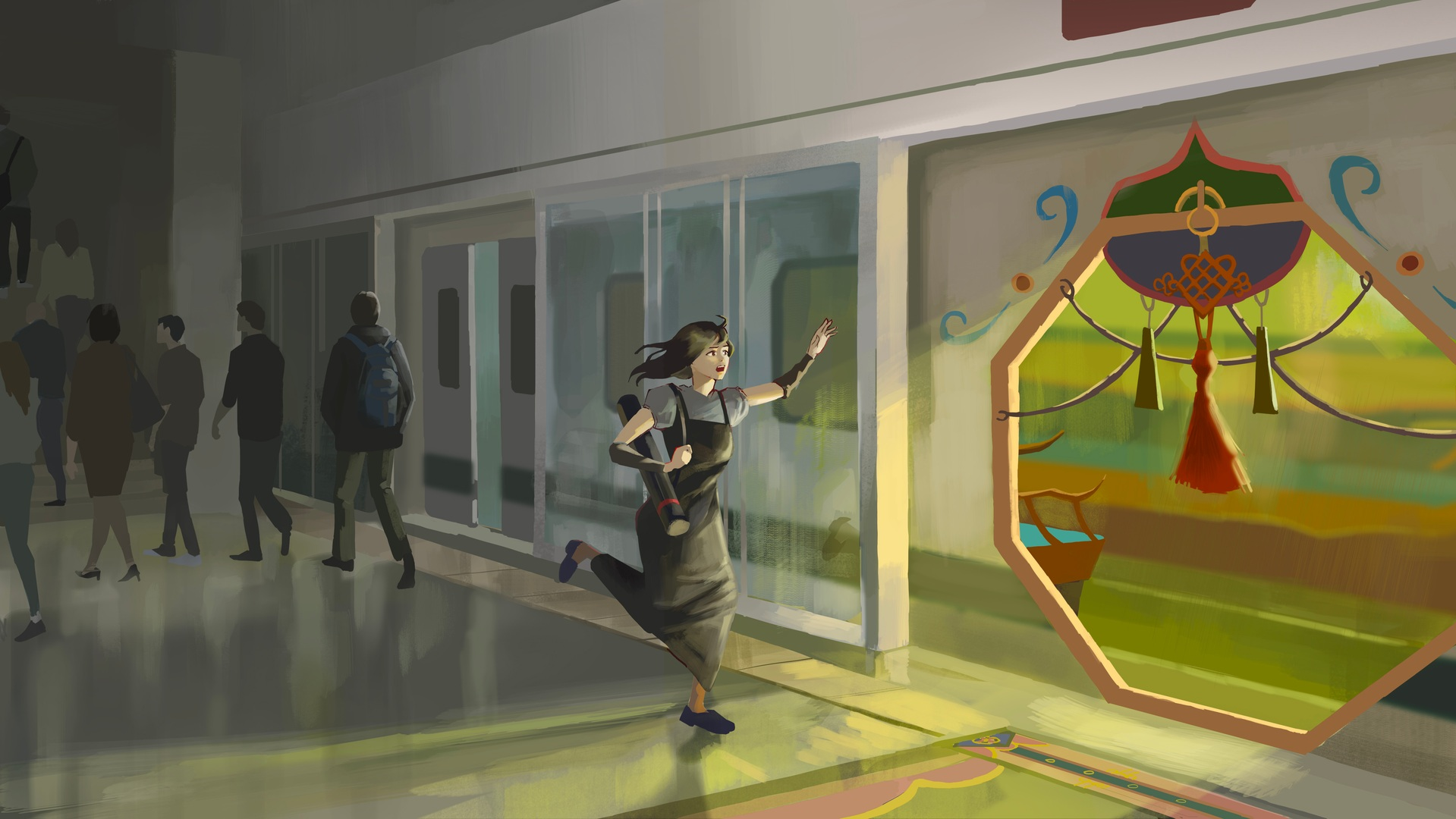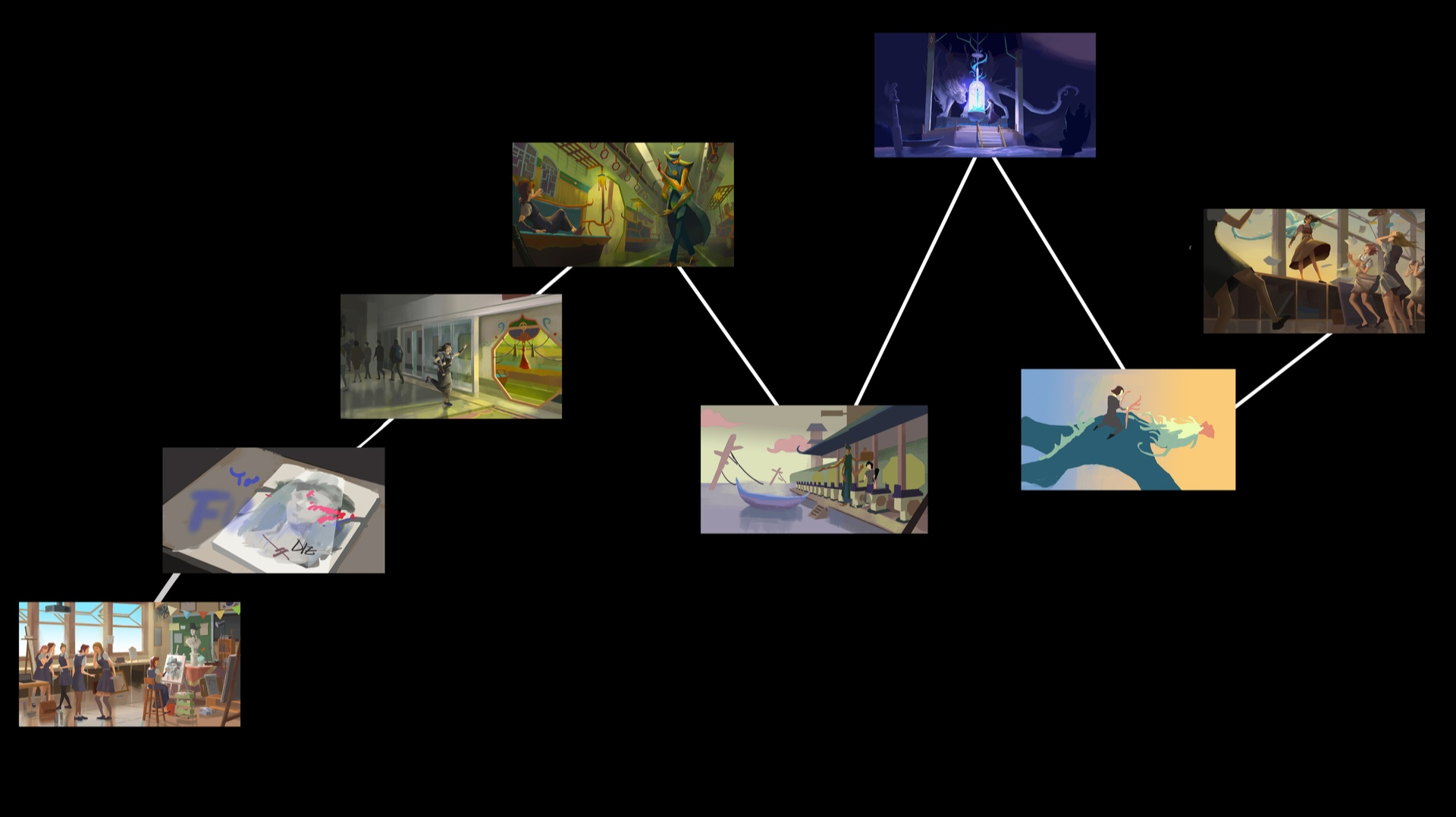Beyond the Tracks is a visual development project by Sumin Joo. It charts the emotional journey of the story through a visual intensity chart, moving from exposition to inciting incident, encounter, conflict, and resolution. The narrative follows a bullied girl who boards a subway bound for purgatory. There, she must face judgment and confront her inner trials in order to earn her way back to the real world.